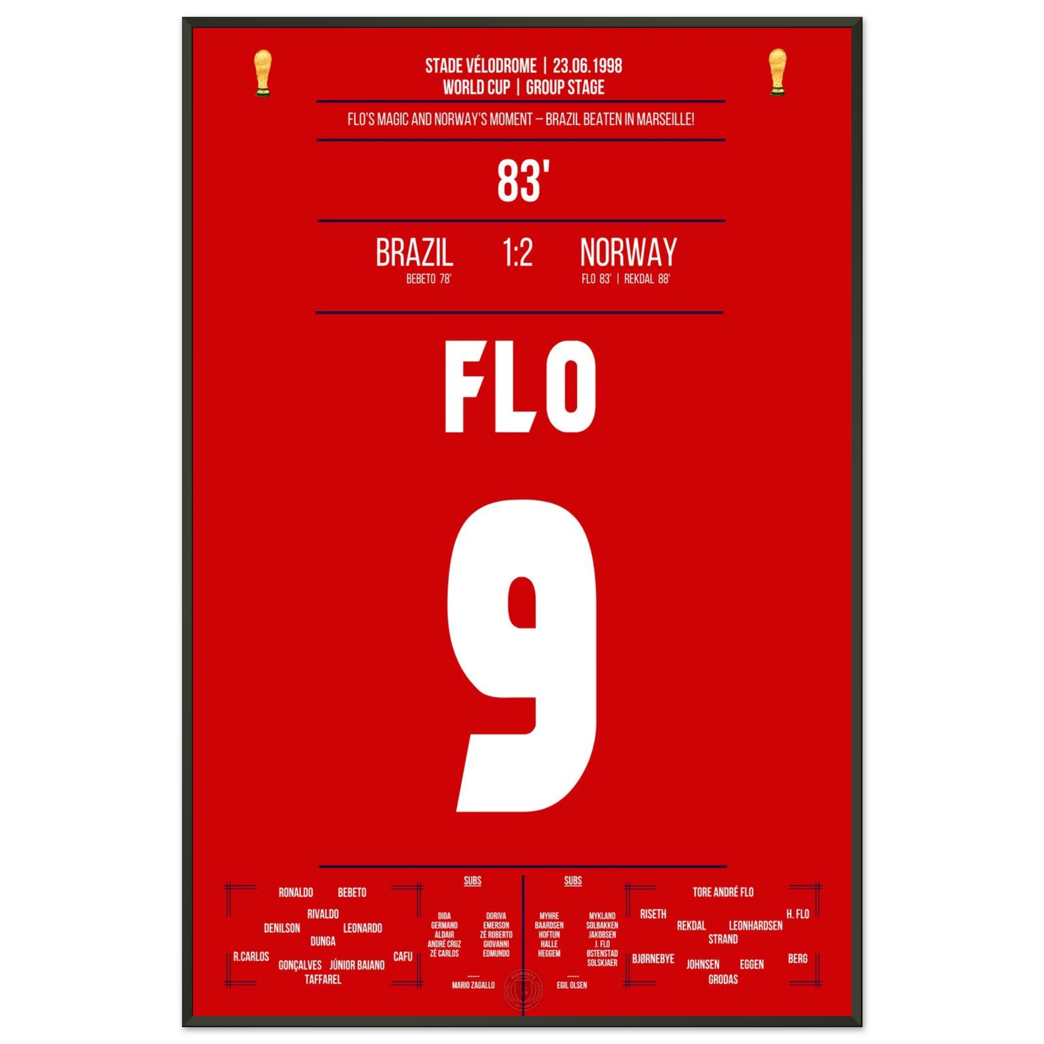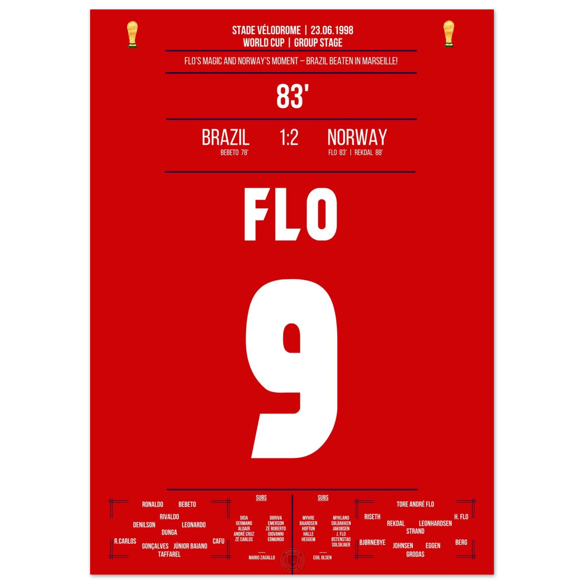 Eine der größten Überraschungen der WM-Geschichte! Norwegen dreht das Spiel gegen den amtierenden Weltmeister Brasilien in den letzten Minuten. Tore von Tore André Flo und Rekdal per Elfmeter bescheren den Nordmännern den historischen Sieg – ihr erstes Weiterkommen bei einer Weltmeisterschaft.