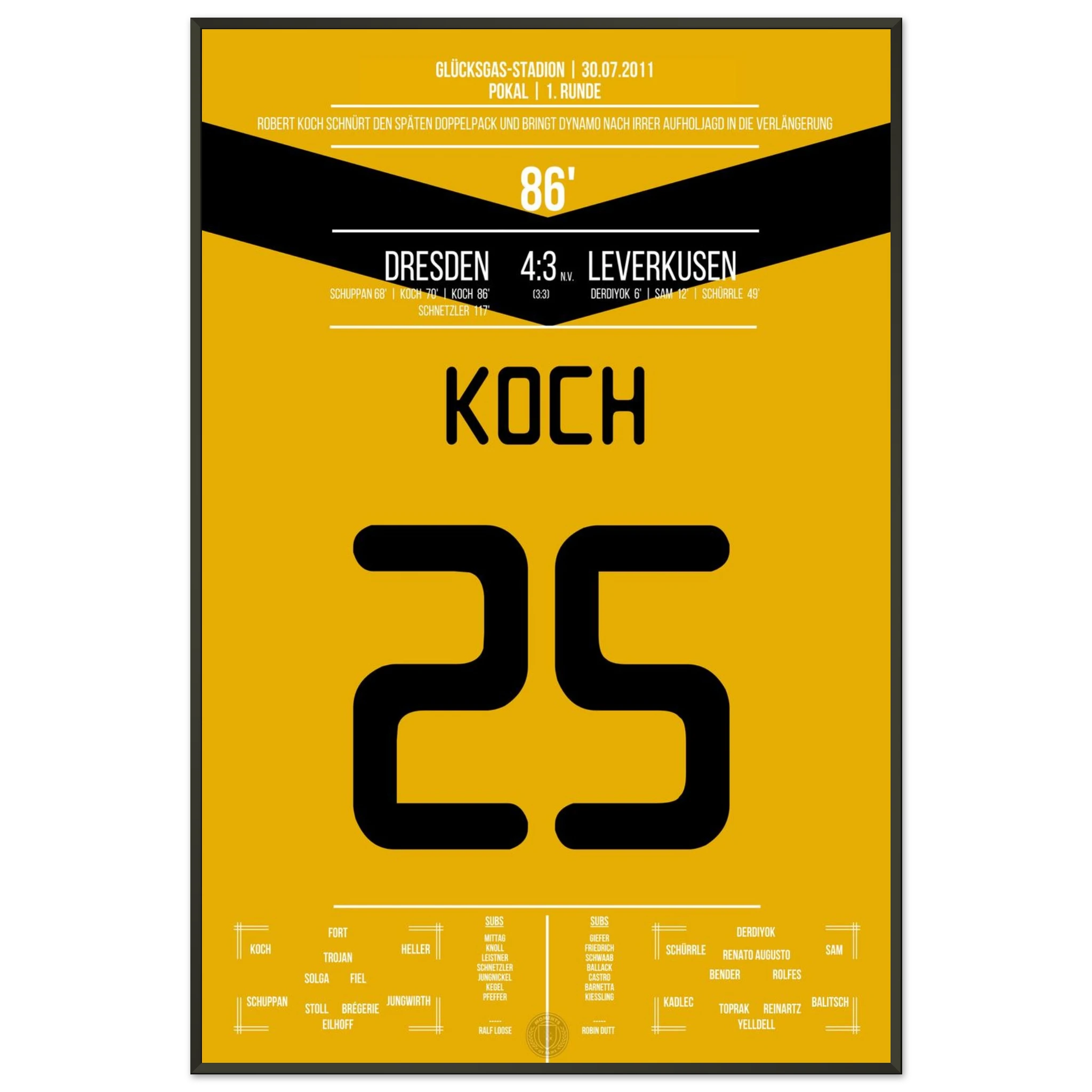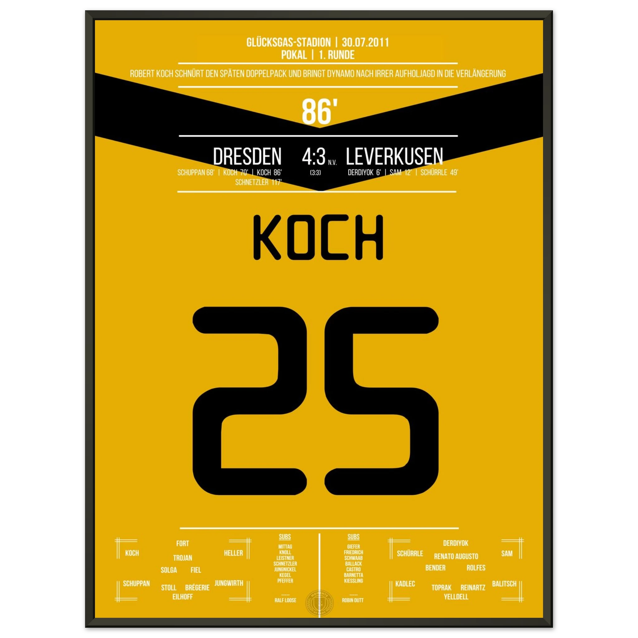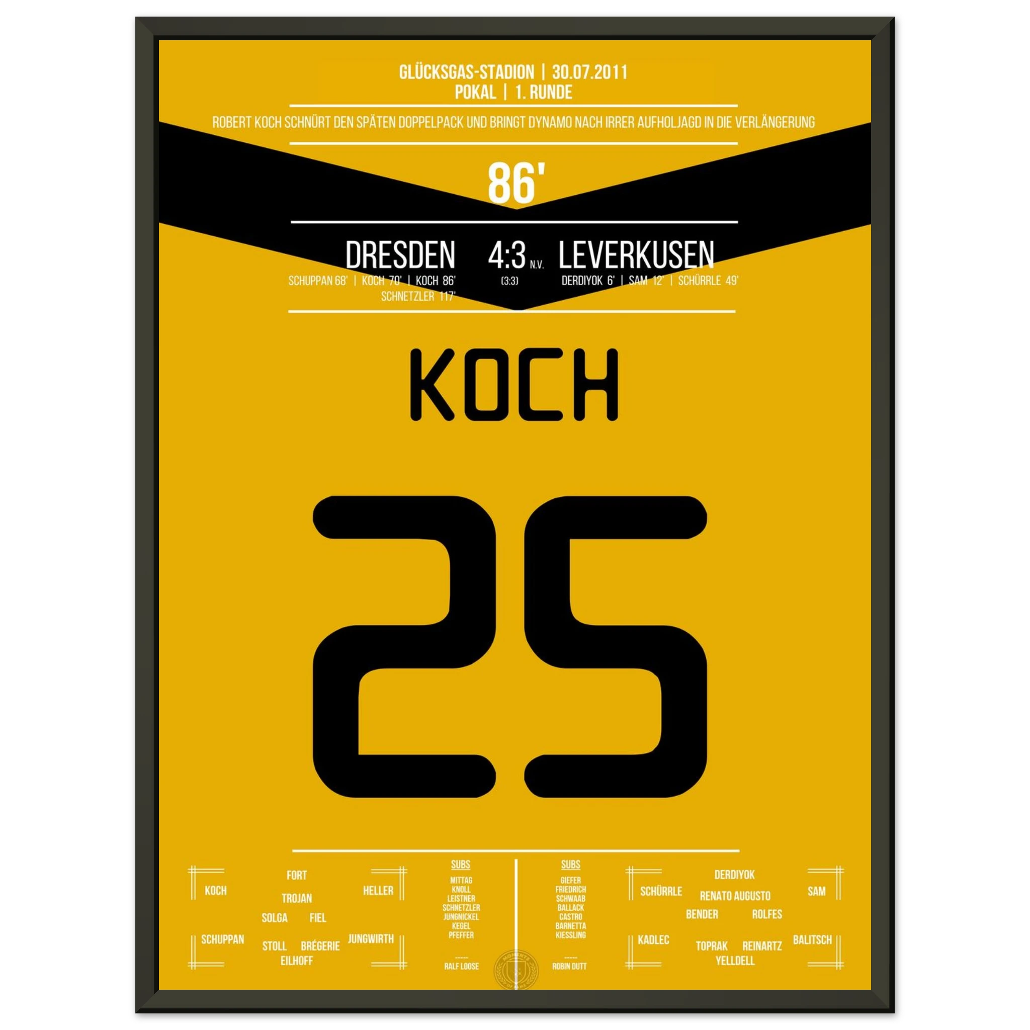 29. Juli 2011 – Dresden vs. Leverkusen 4:3 n. V.: In einem der spektakulärsten Pokalspiele überhaupt trifft Robert Koch zum 3:3-Ausgleich und bringt Dynamo in die Verlängerung. Seine Treffer leiten die sensationelle Aufholjagd nach 0:3-Rückstand gegen den Bundesligisten ein. Unser Poster hält diesen magischen Pokalmoment für die Ewigkeit fest.