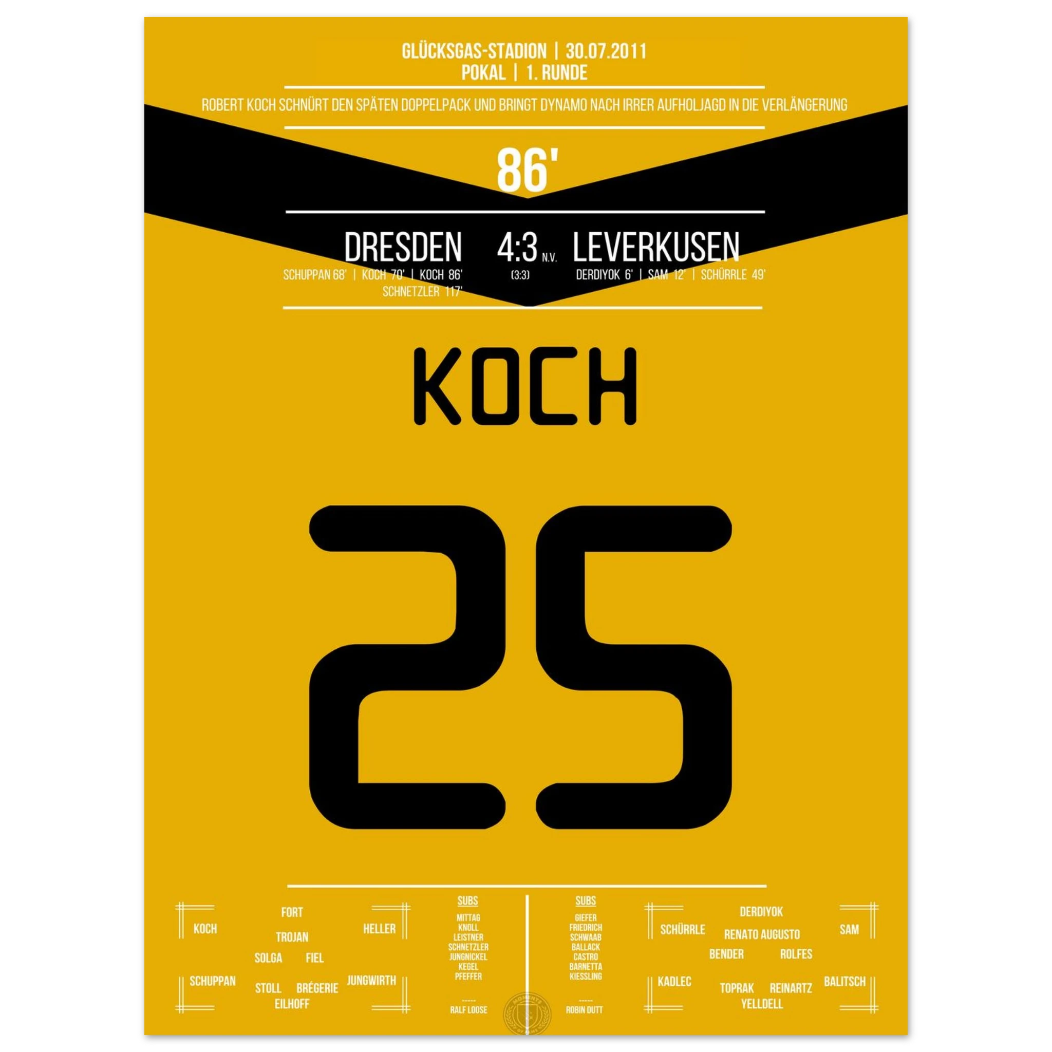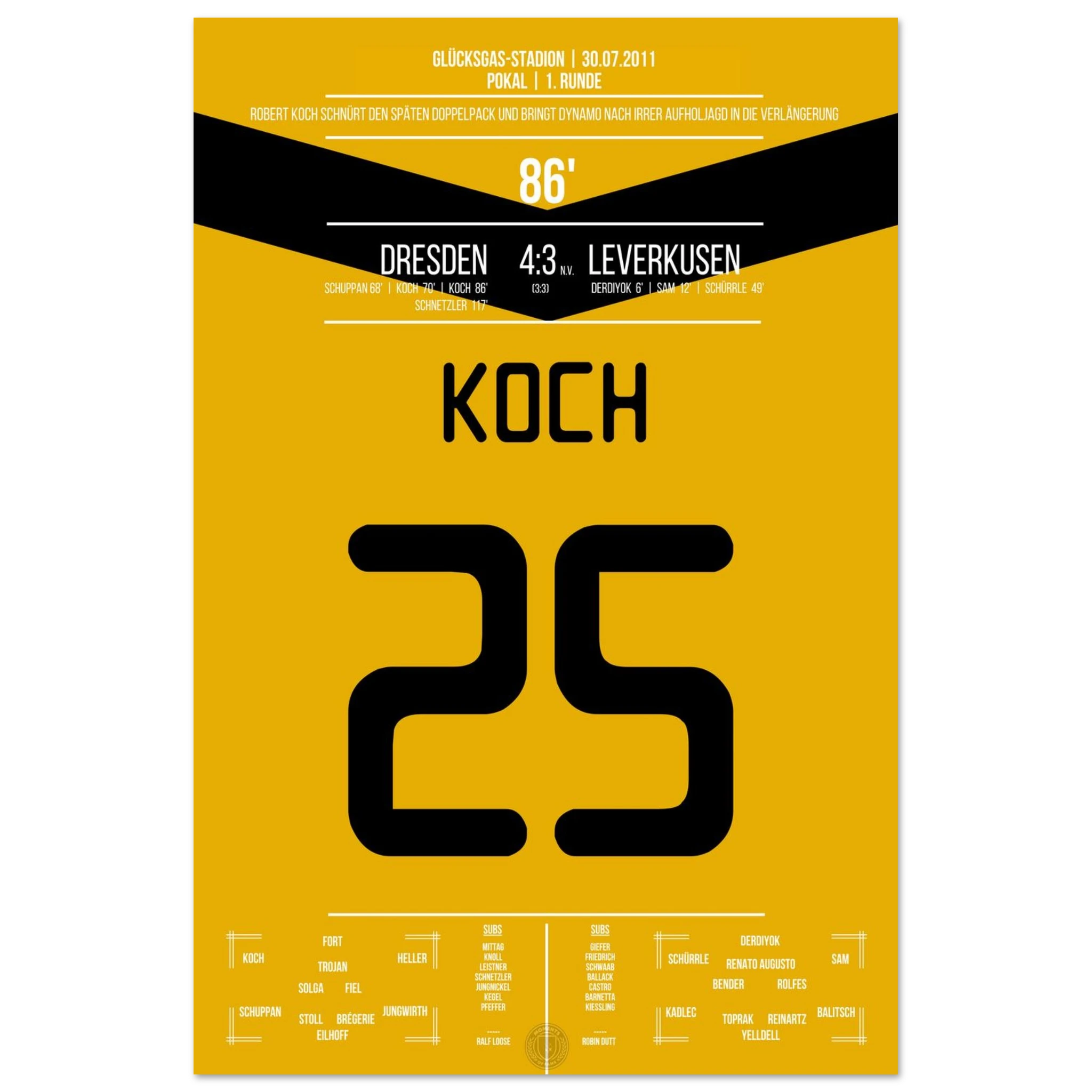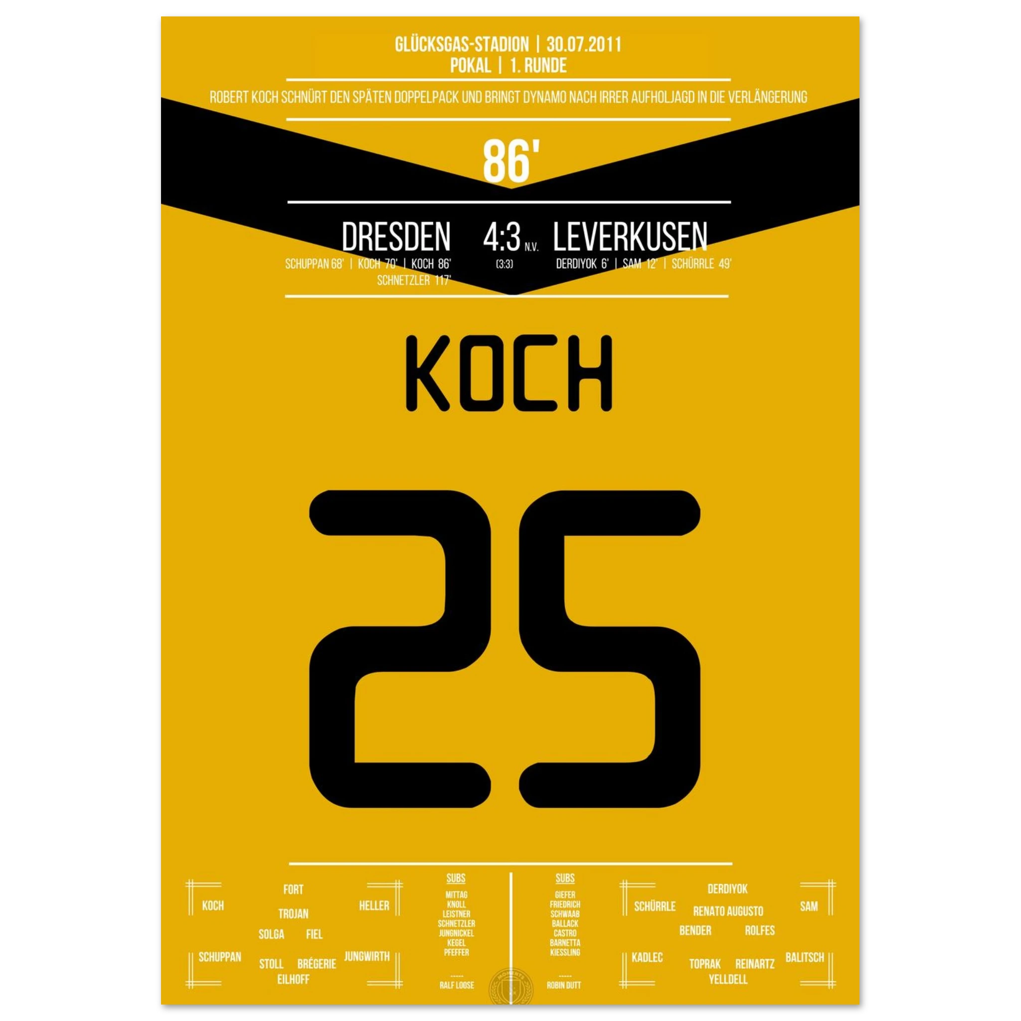 29. Juli 2011 – Dresden vs. Leverkusen 4:3 n. V.: In einem der spektakulärsten Pokalspiele überhaupt trifft Robert Koch zum 3:3-Ausgleich und bringt Dynamo in die Verlängerung. Seine Treffer leiten die sensationelle Aufholjagd nach 0:3-Rückstand gegen den Bundesligisten ein. Unser Poster hält diesen magischen Pokalmoment für die Ewigkeit fest.