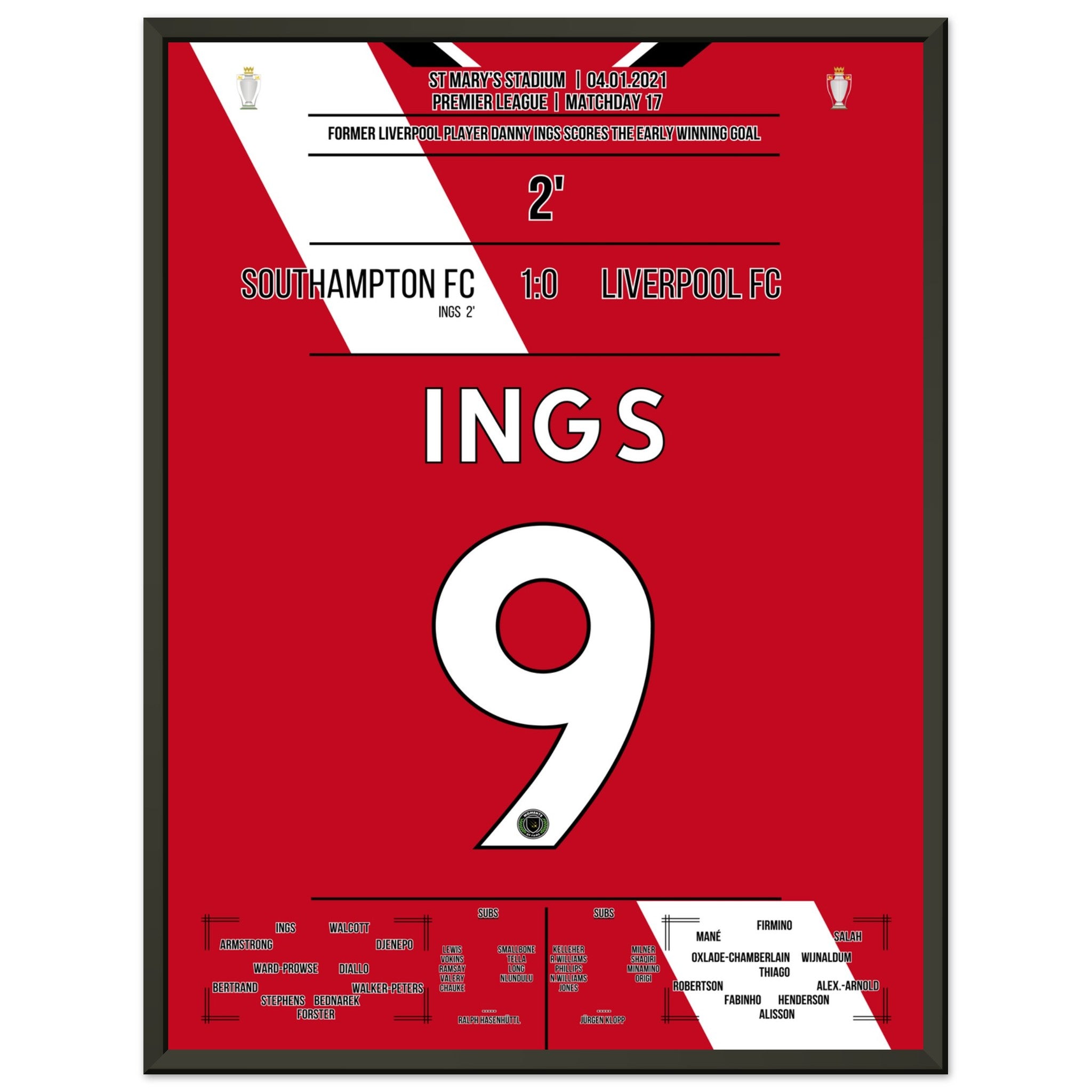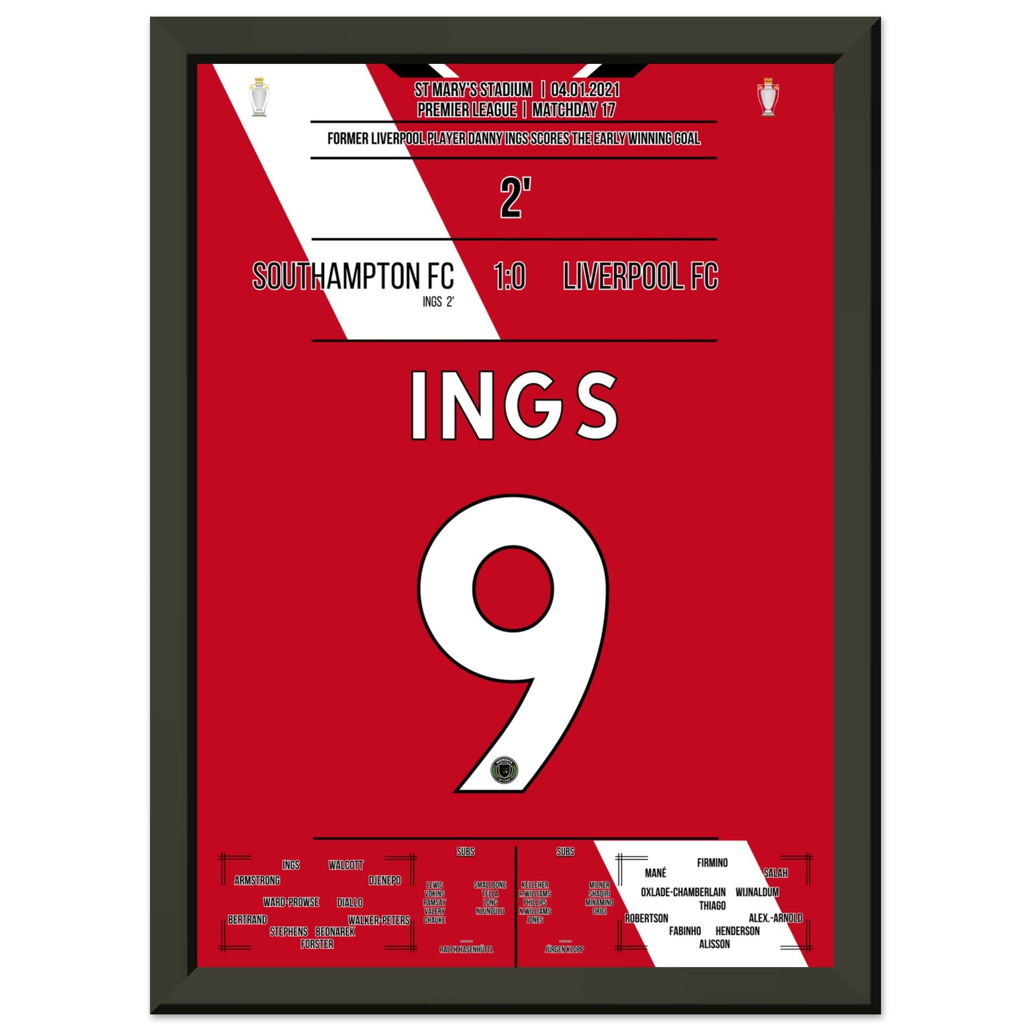 Sie können sicher sein, dass jedes Poster und jeder Rahmen in einer robusten Verpackung versandt wird, damit es in tadellosem Zustand ankommt. Es ist die perfekte Ergänzung für die Sammlung eines jeden Fußballfans oder das perfekte Geschenk für den eingefleischten Fußball-Fan ihres Freundes- oder Familienkreises.