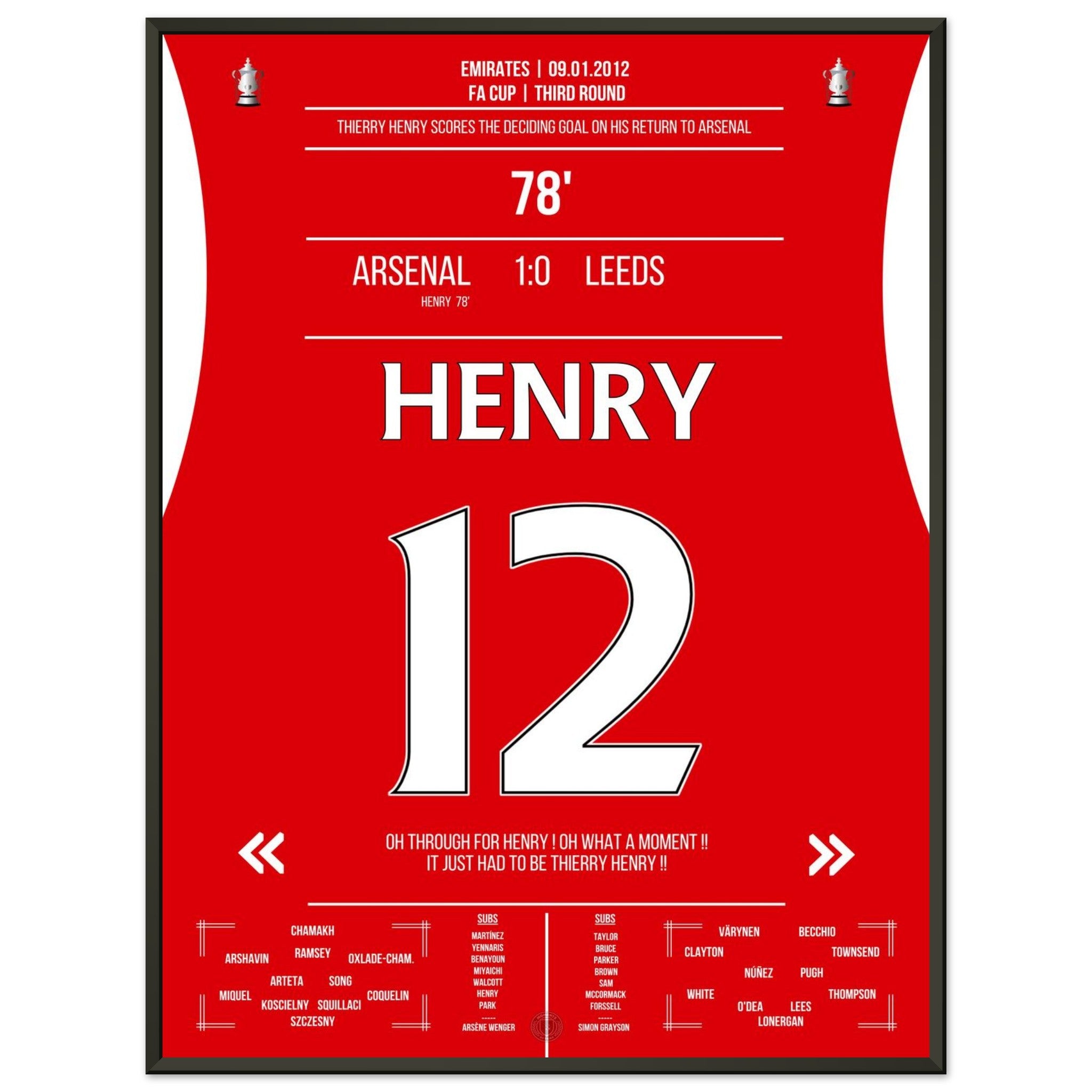 Ein Gänsehautmoment im Emirates: Nach fast sechs Jahren kehrt Thierry Henry im Pokal gegen Leeds zurück – und schreibt sofort wieder Geschichte. Nur zehn Minuten nach seiner Einwechslung trifft er mit seinem typischen, geschmeidigen Abschluss ins lange Eck zum 1:0-Sieg.