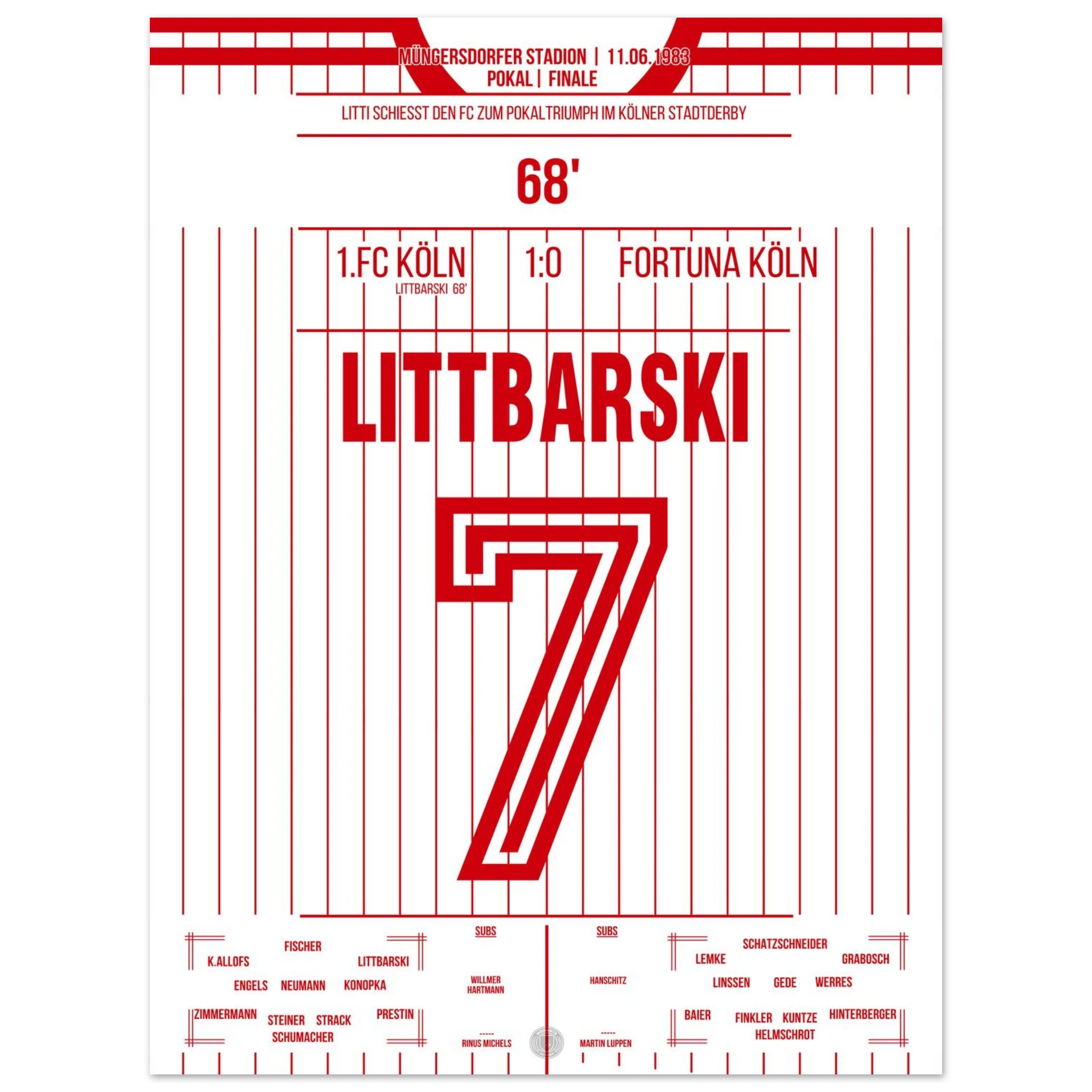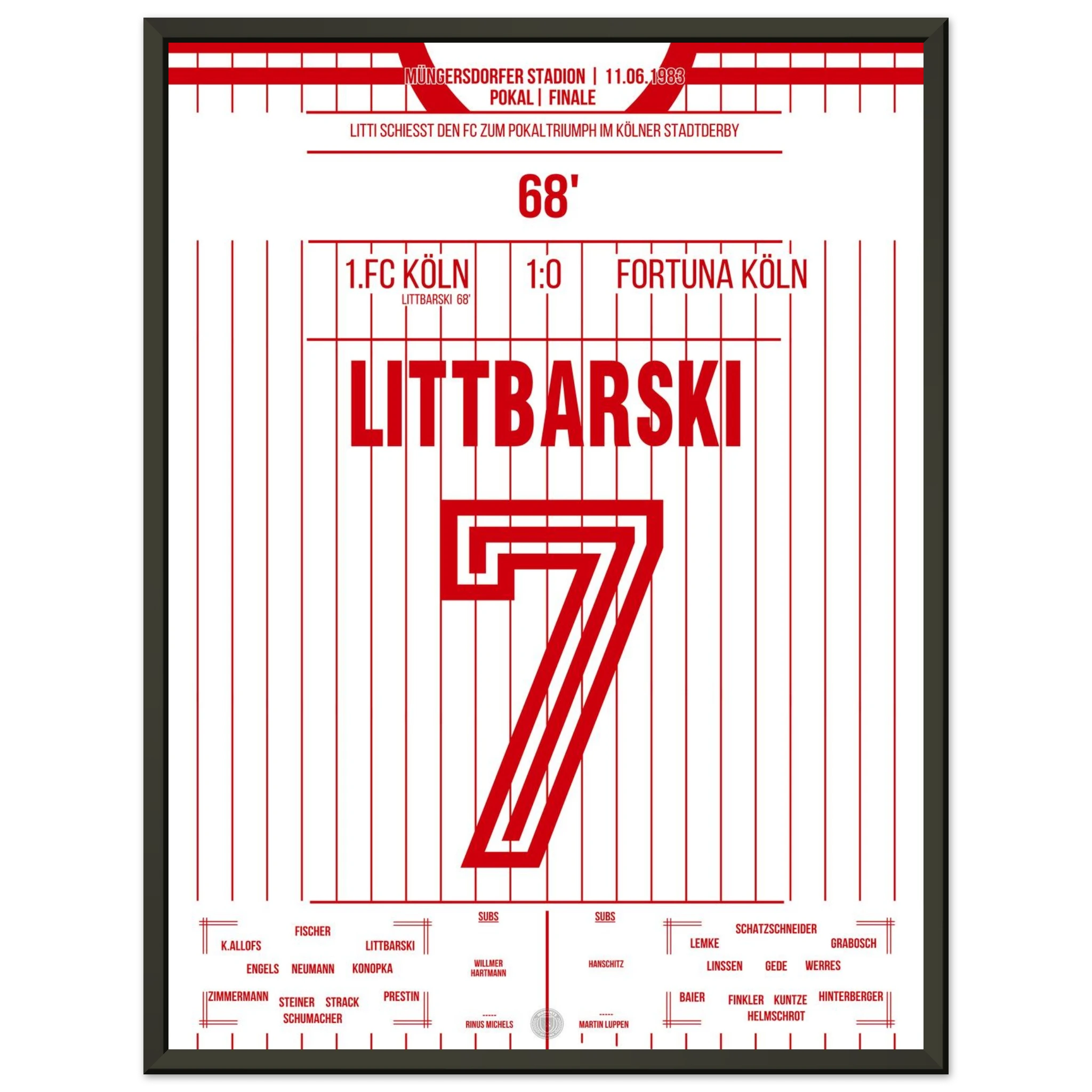 Im Pokalfinale zwischen den beiden Kölner Clubs wird Pierre Littbarski zum Matchwinner. Mit seinem Treffer sorgt er für den entscheidenden Moment in einem umkämpften Derby und führt den FC zum Titel.