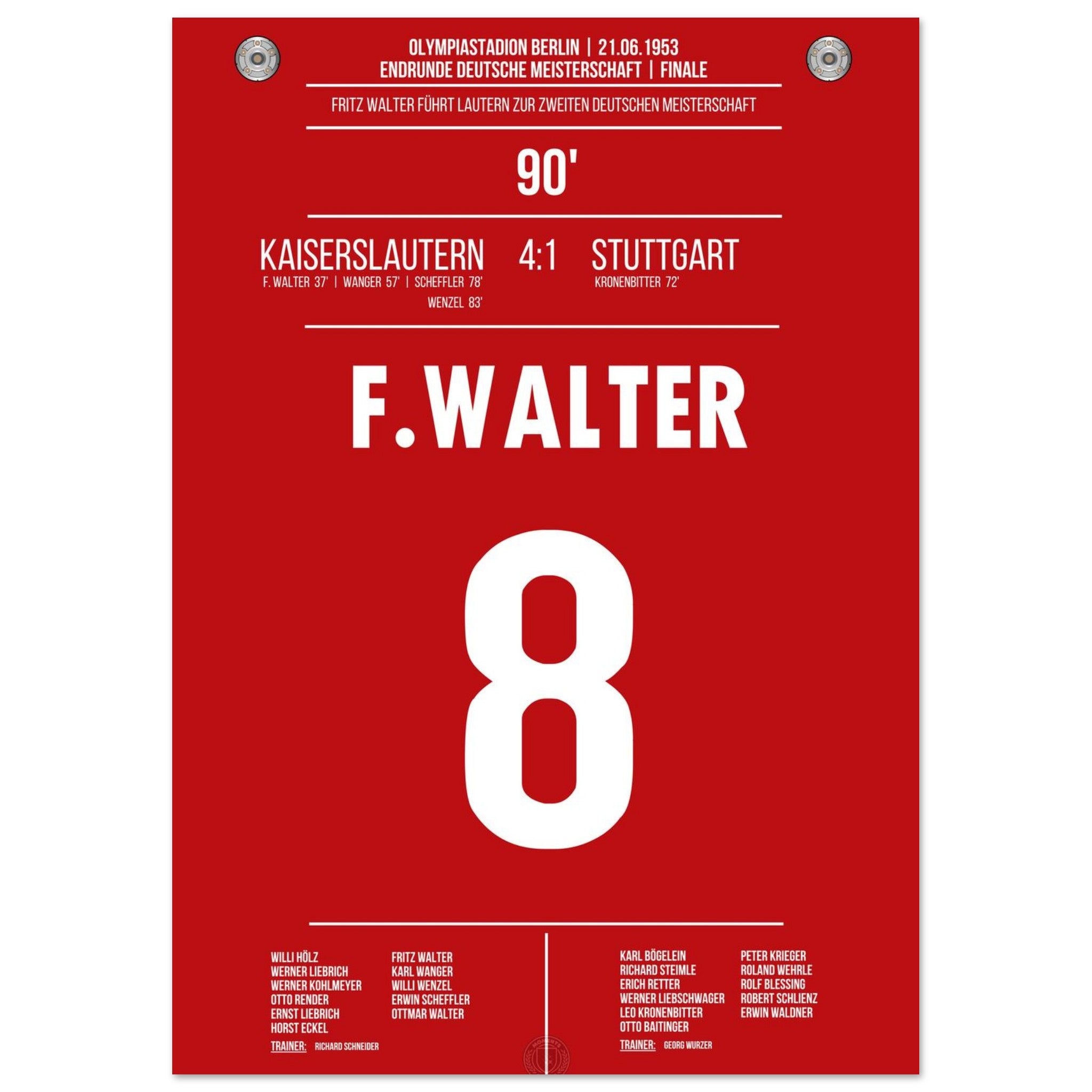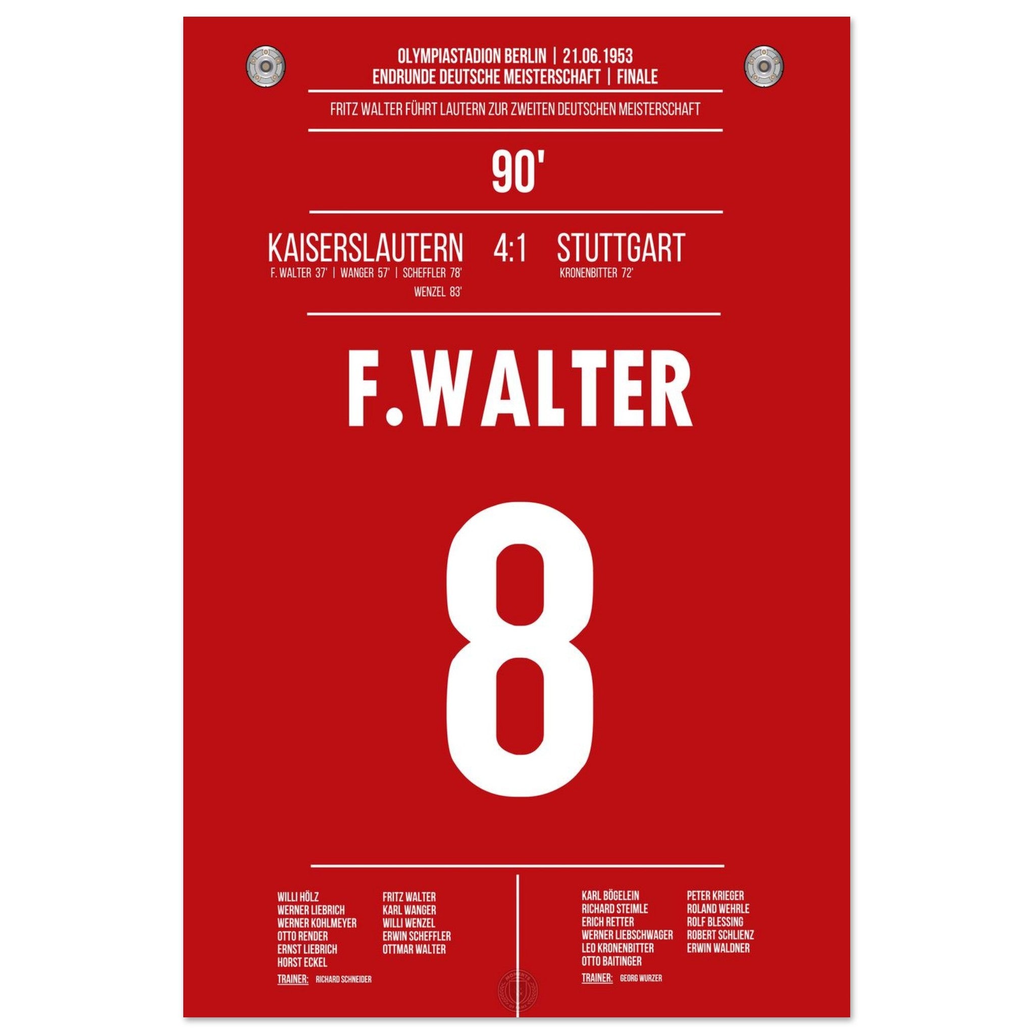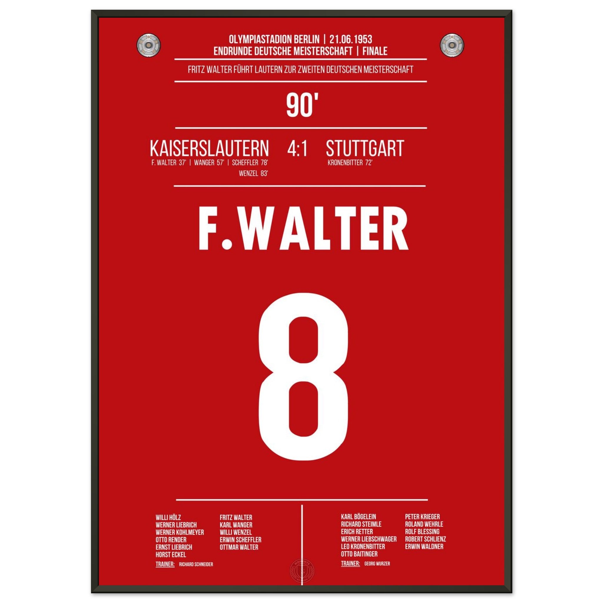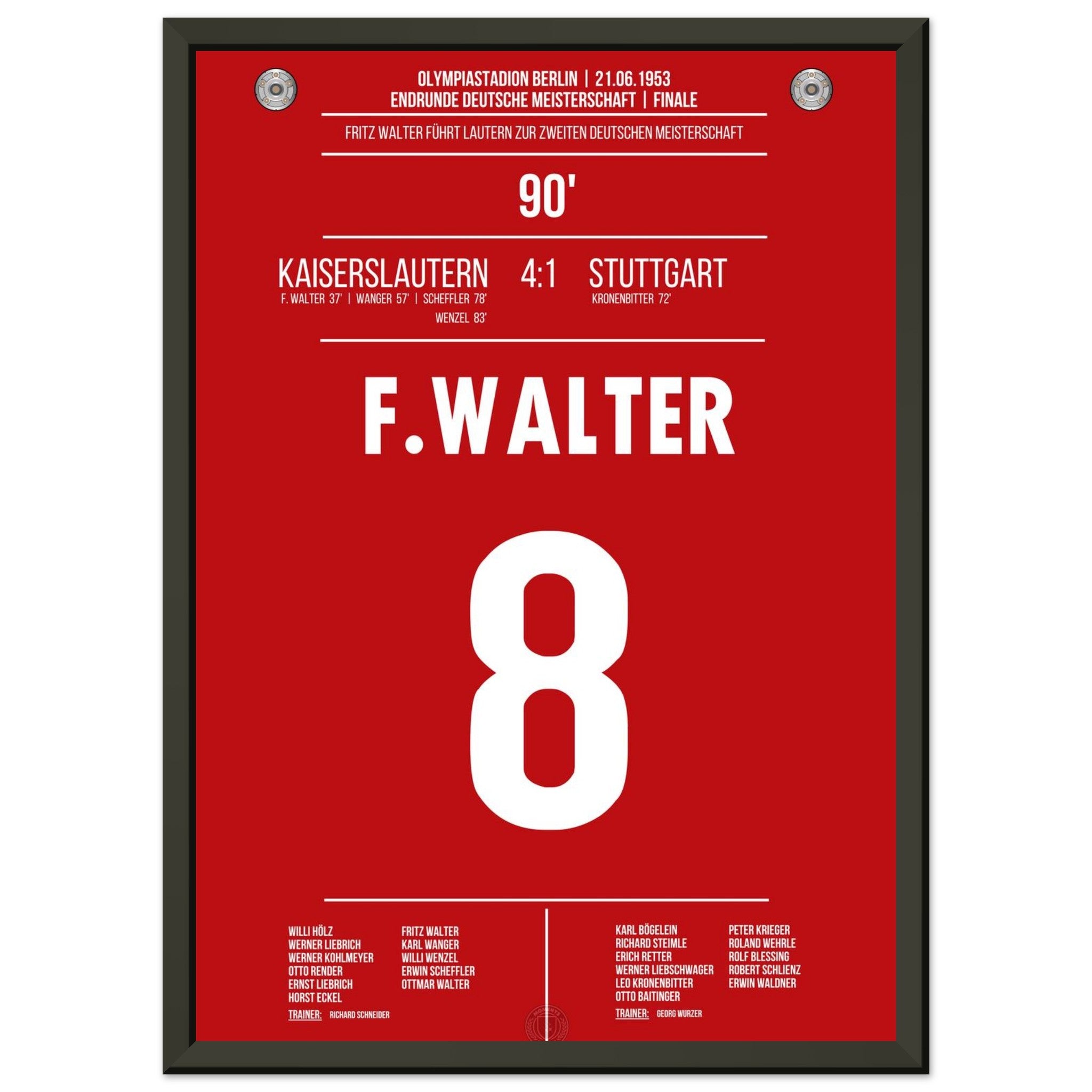 21. Juni 1953 – Kaiserslautern vs. Stuttgart 4:1: Fritz Walter führt Kaiserslautern mit einem überragenden Auftritt zur Deutschen Meisterschaft – beim 4:1 im Endspiel gegen Stuttgart glänzt er als Taktgeber, Vorbereiter und Torschütze. Ein historischer Tag für Lautern und das deutsche Fußballmärchen. Unser Poster hält diesen legendären Moment im Trikot der Roten Teufel fest.