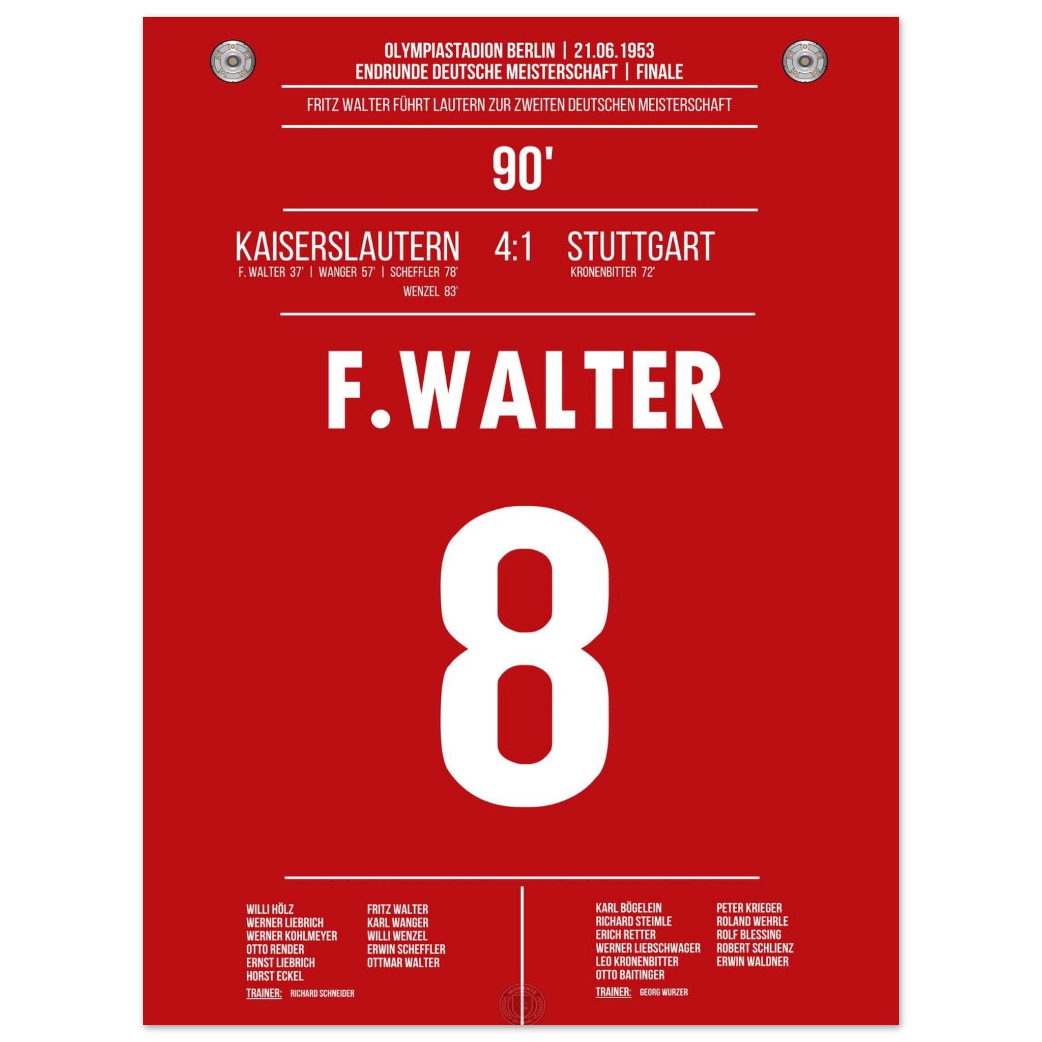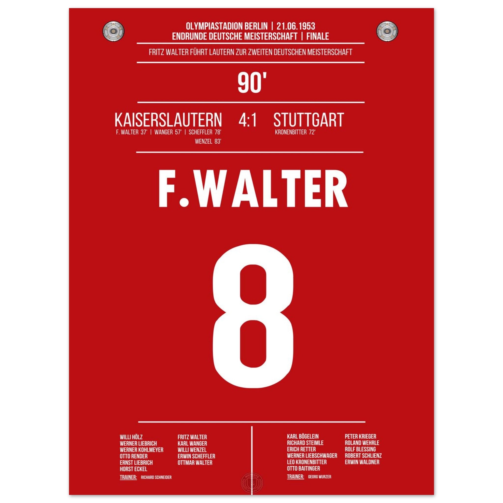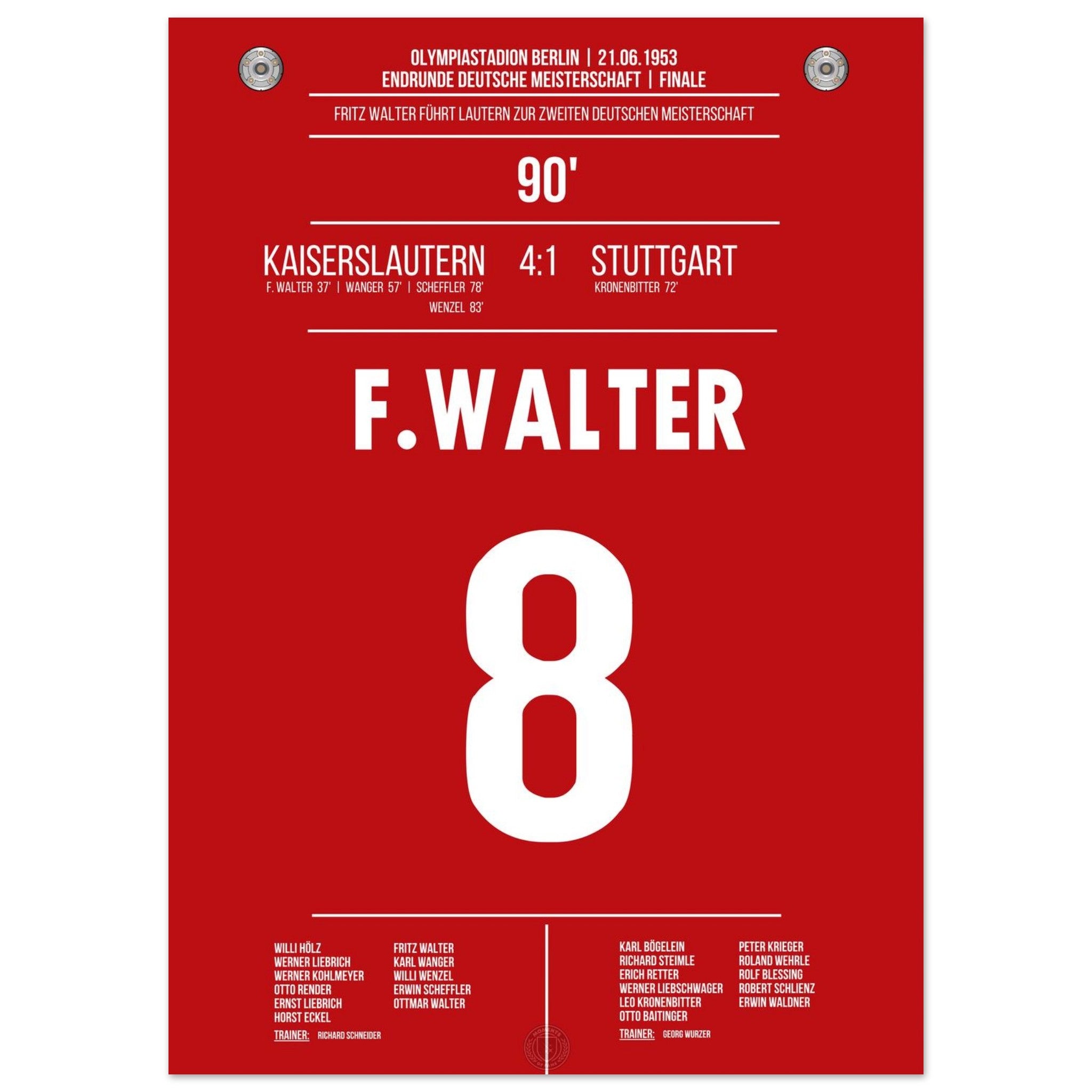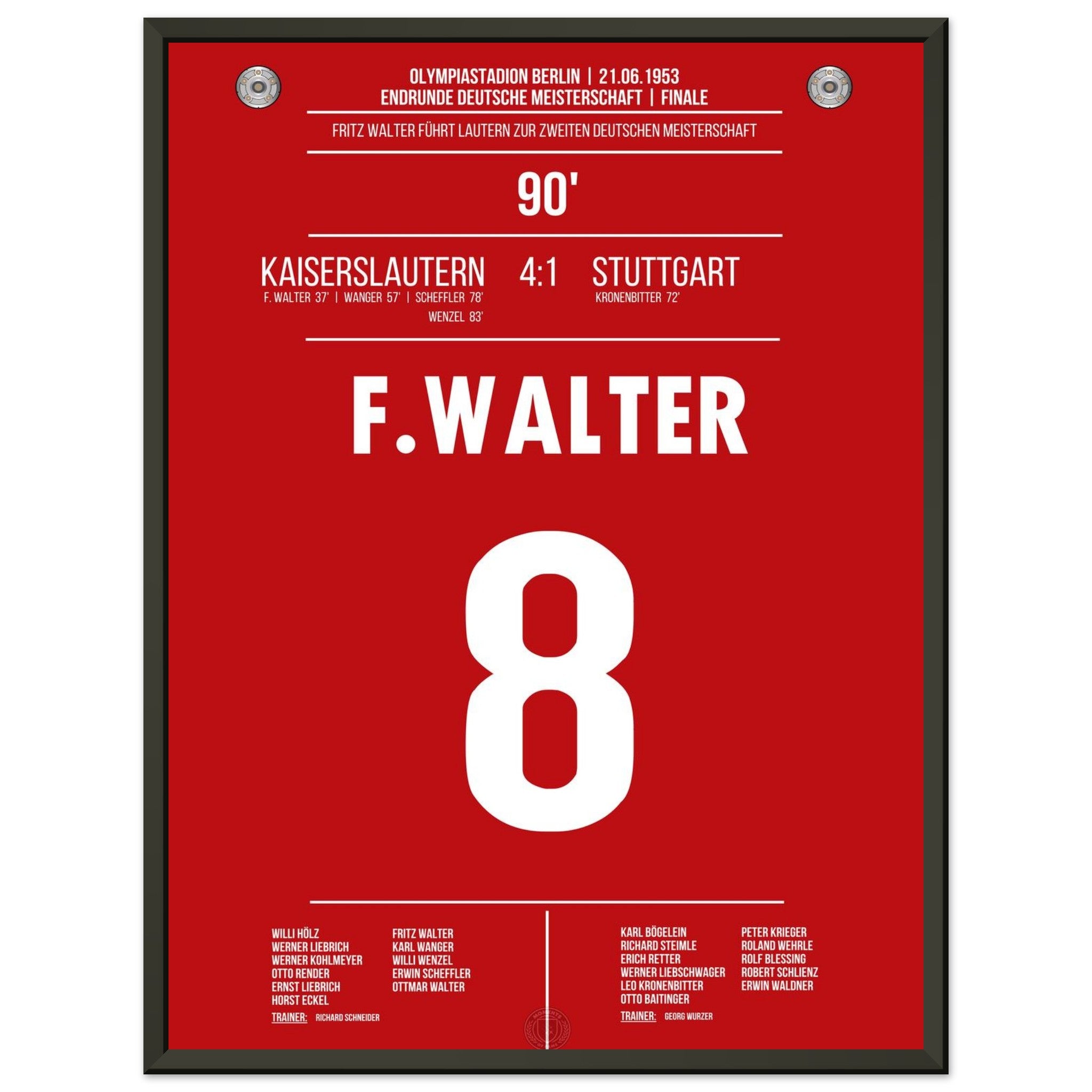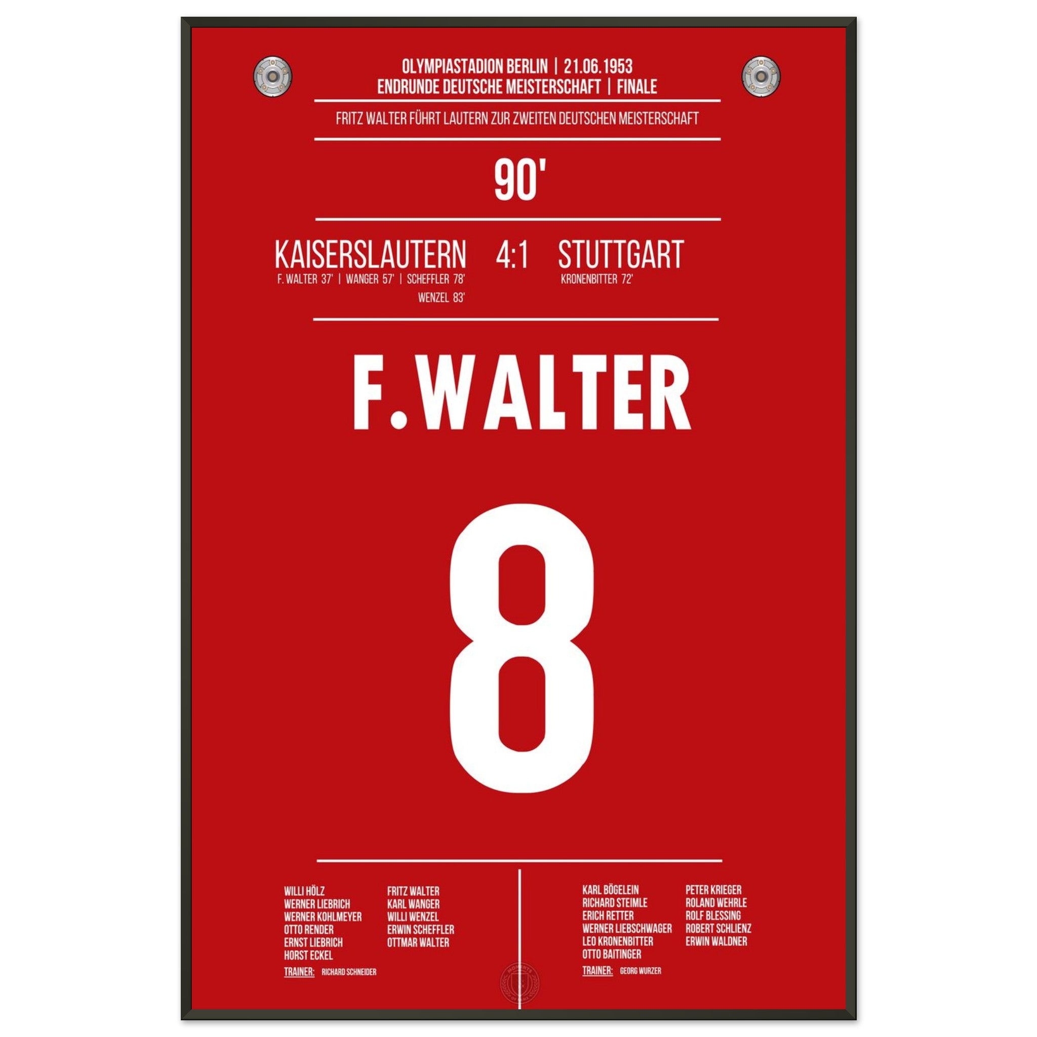 21. Juni 1953 – Kaiserslautern vs. Stuttgart 4:1: Fritz Walter führt Kaiserslautern mit einem überragenden Auftritt zur Deutschen Meisterschaft – beim 4:1 im Endspiel gegen Stuttgart glänzt er als Taktgeber, Vorbereiter und Torschütze. Ein historischer Tag für Lautern und das deutsche Fußballmärchen. Unser Poster hält diesen legendären Moment im Trikot der Roten Teufel fest.