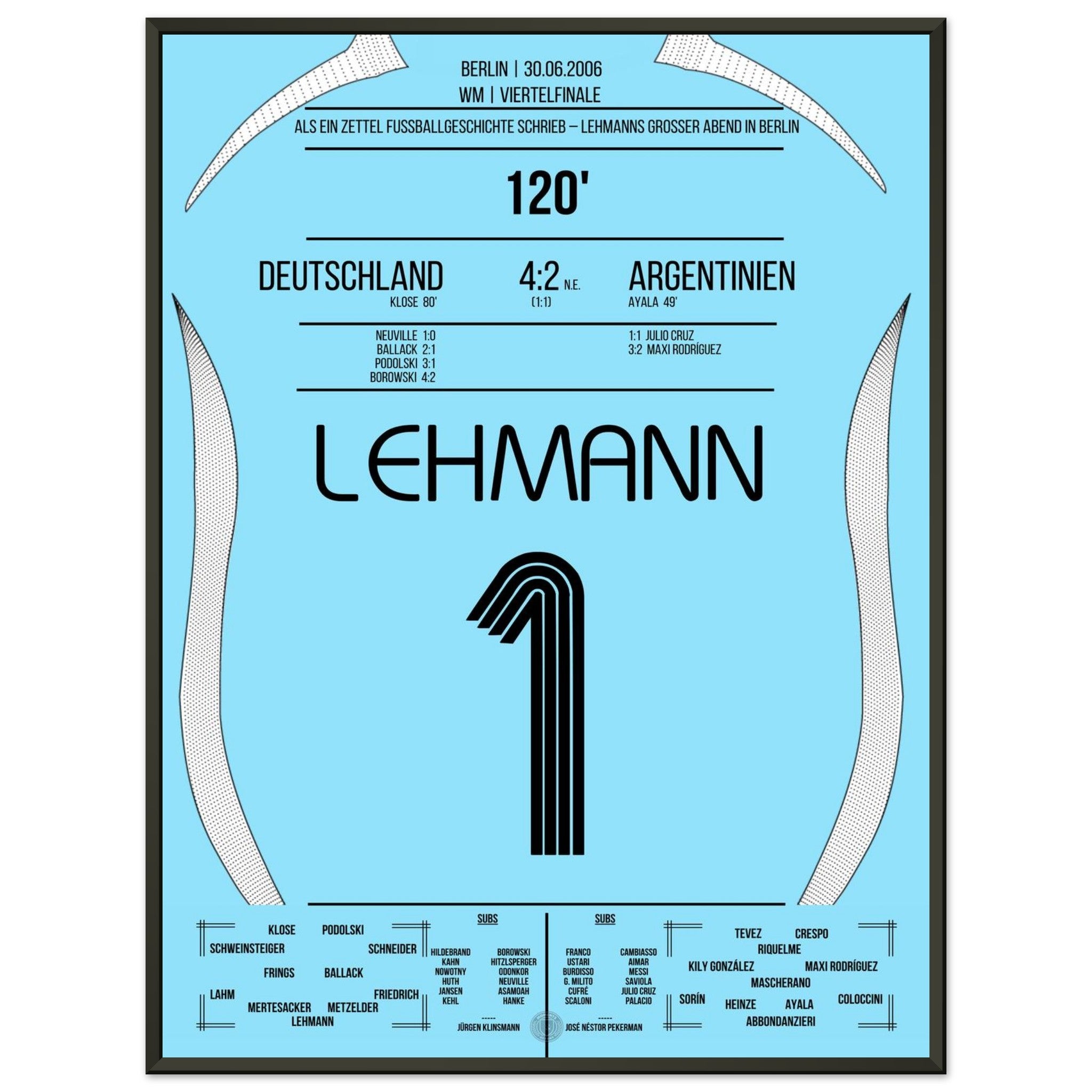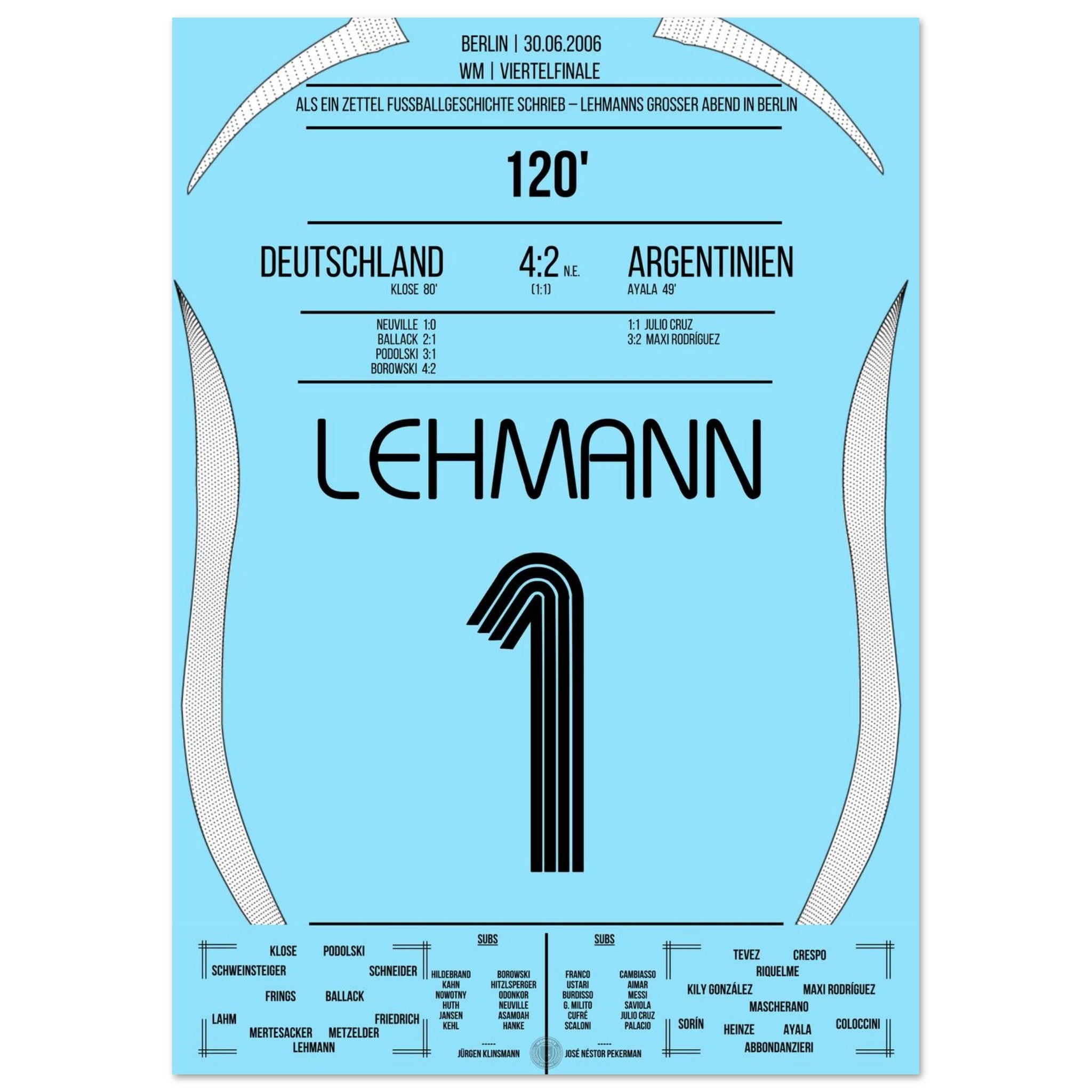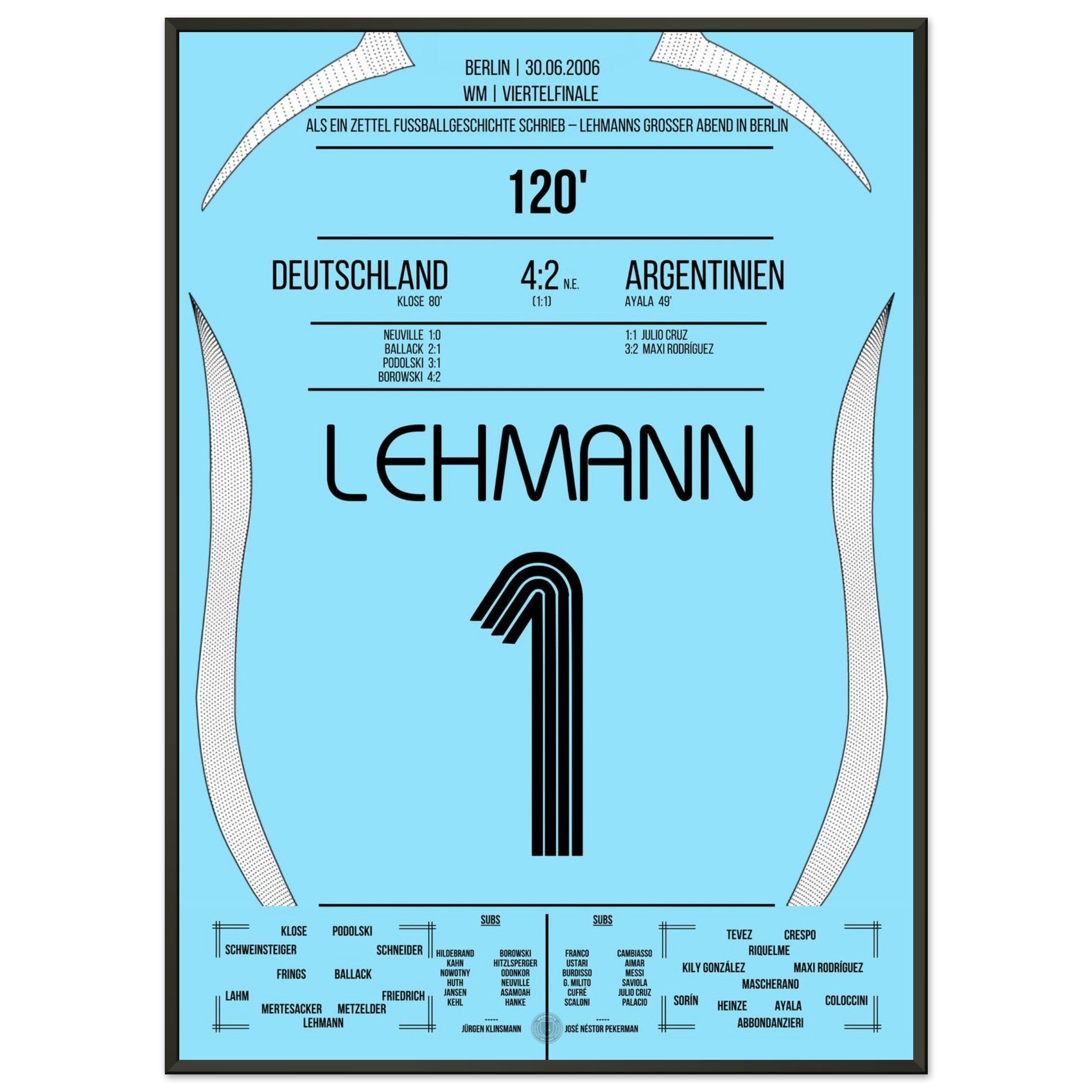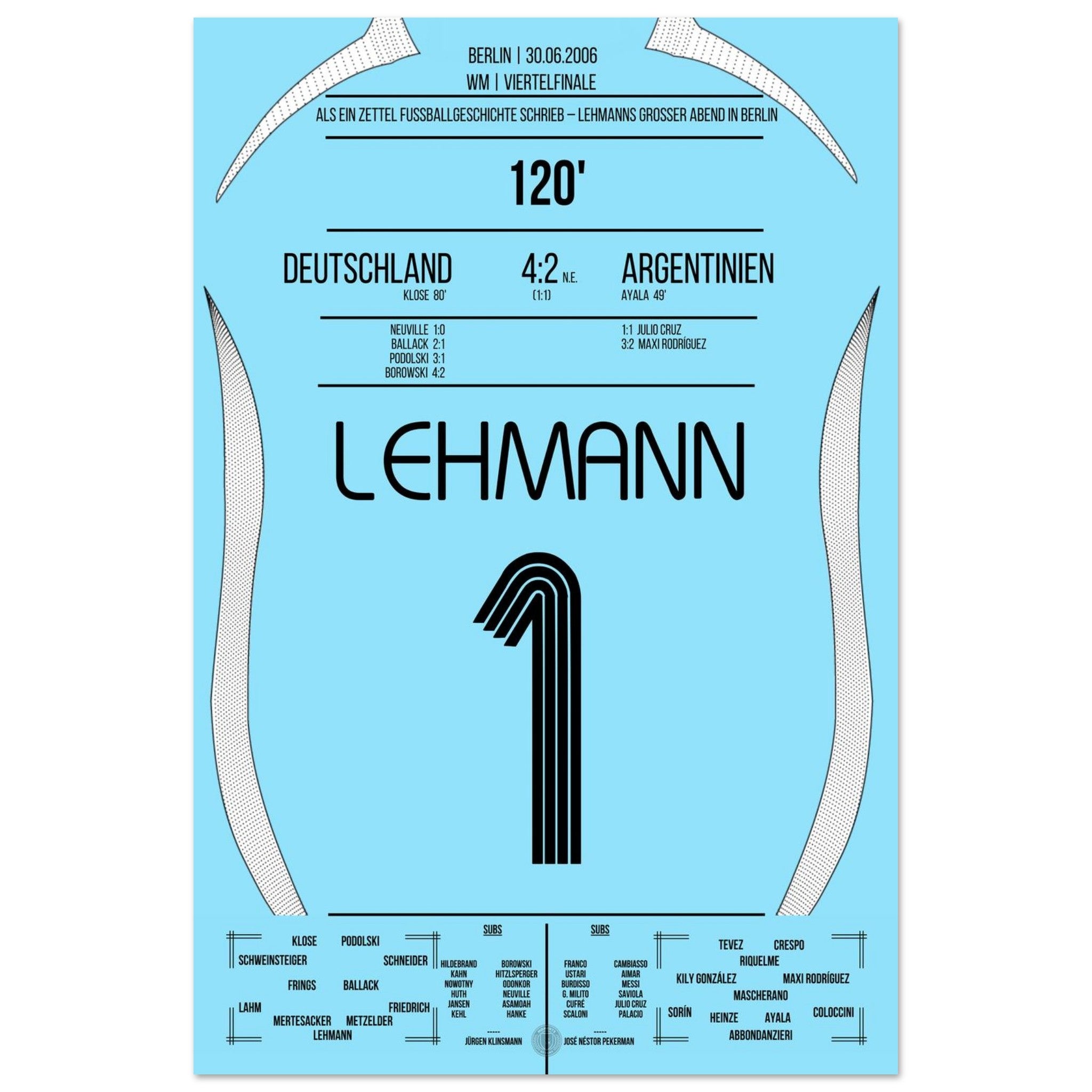 30. Juni 2006 – Deutschland vs. Argentinien (5:3 i. E.): Jens Lehmann wird im Berliner Olympiastadion zum Helden des Elfmeterschießens – mit einem geheimen Zettel im Stutzen und zwei gehaltenen Strafstößen sichert er Deutschland den Halbfinaleinzug. Unser Poster hält den Nervenkitzel und den Mythos des „Elfer-Zettels“ fest.