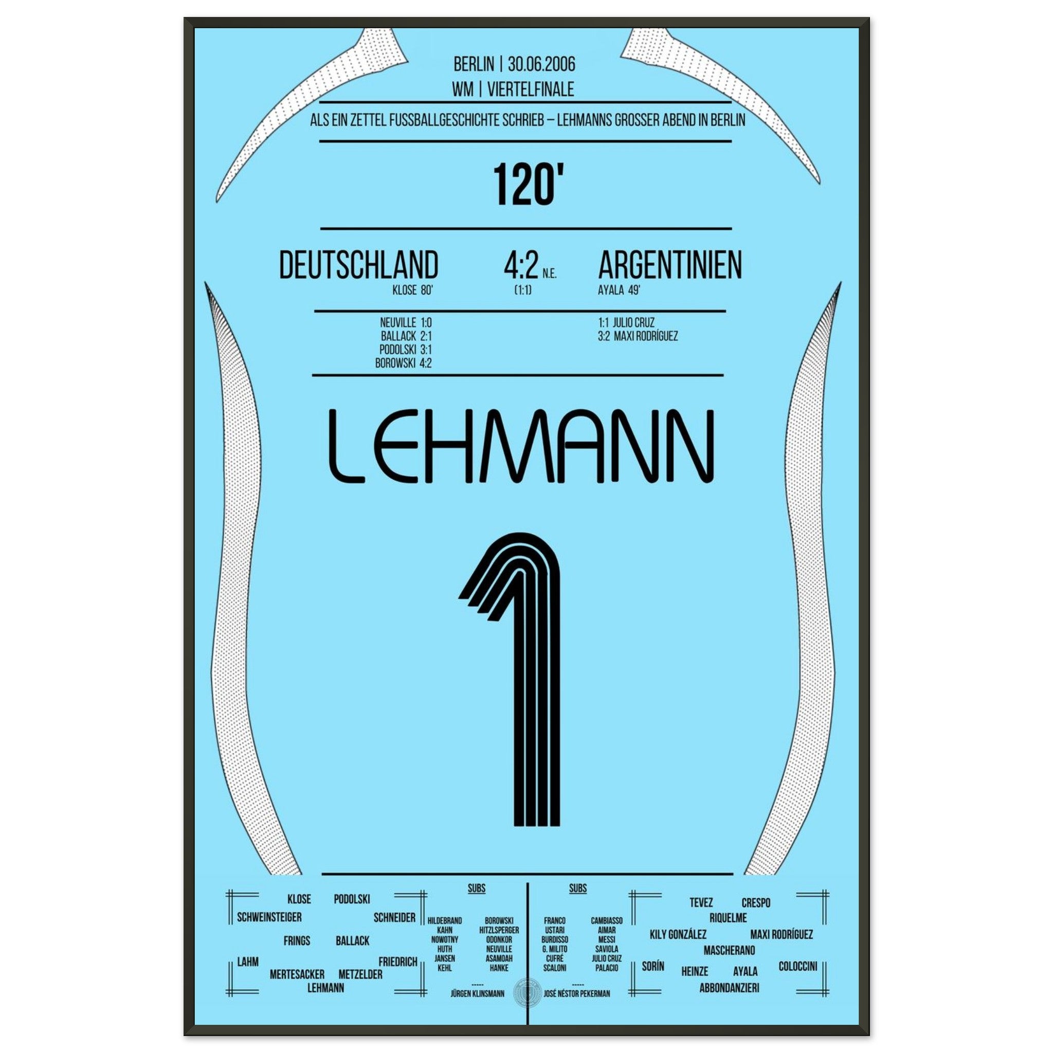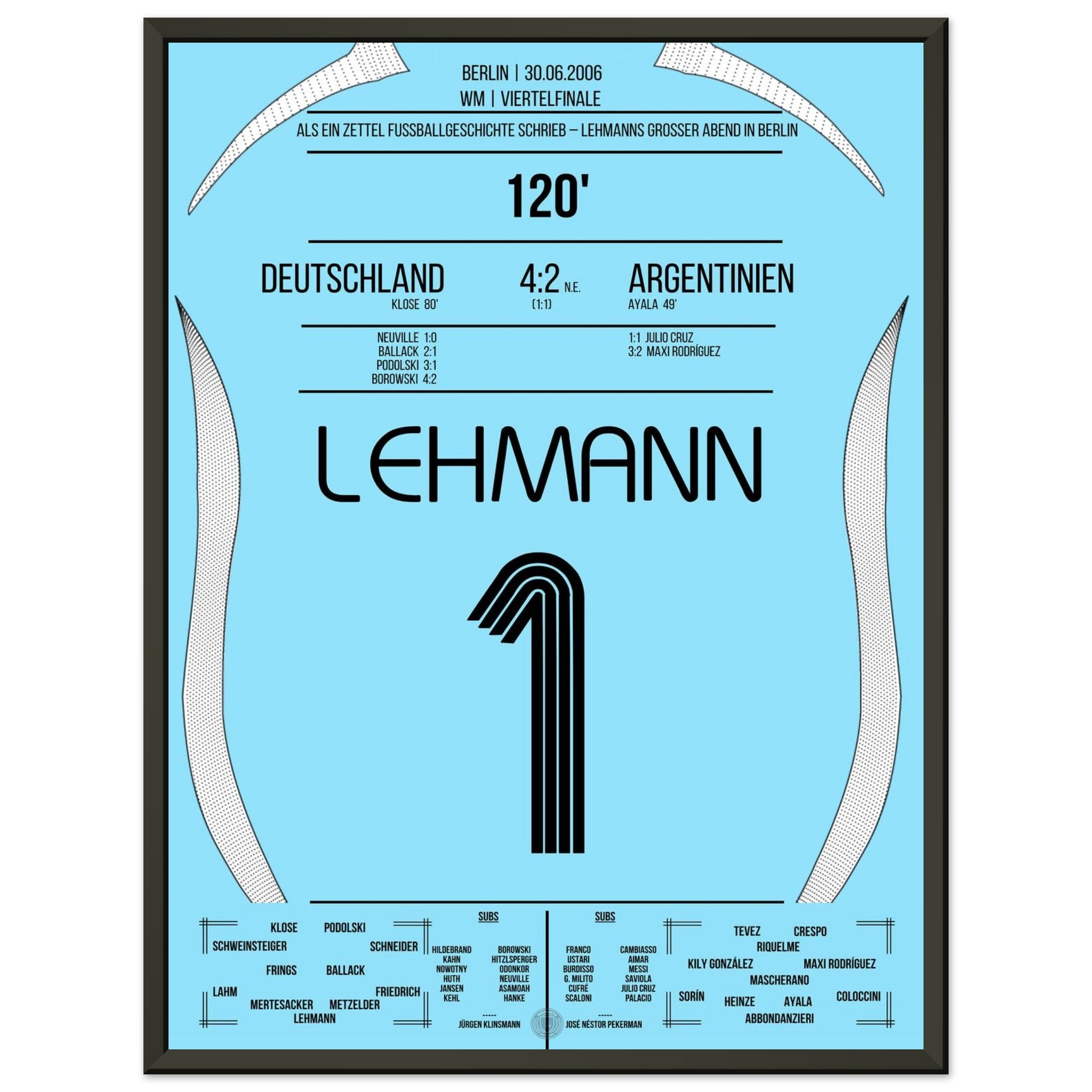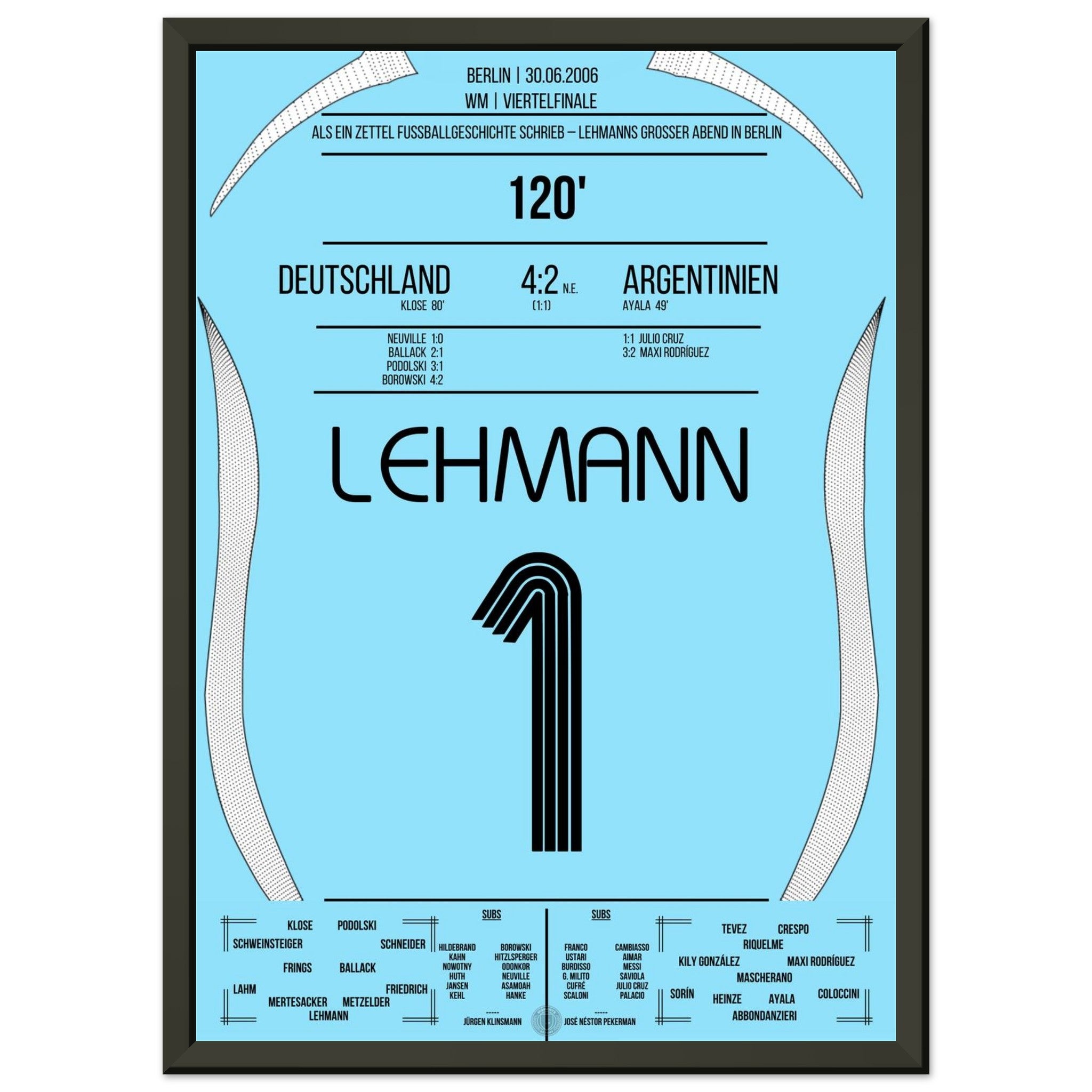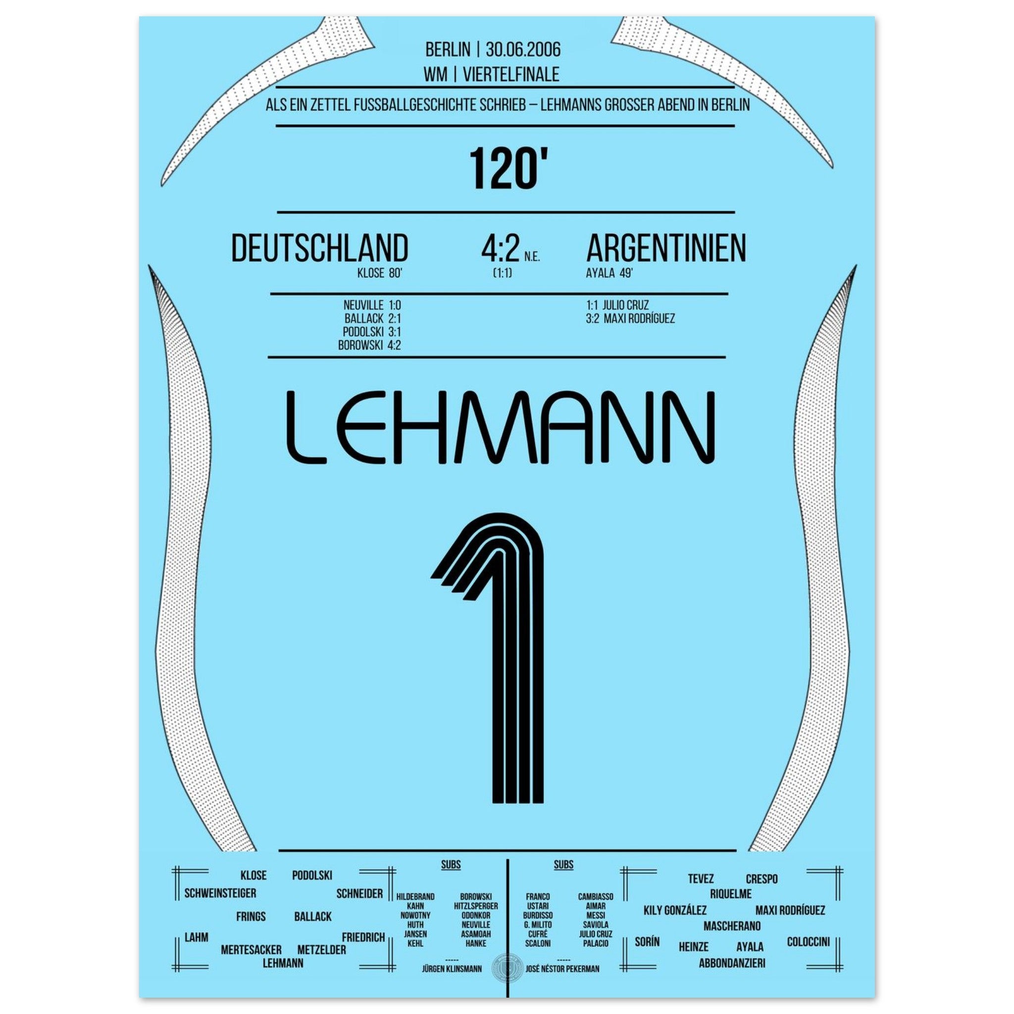 30. Juni 2006 – Deutschland vs. Argentinien (5:3 i. E.): Jens Lehmann wird im Berliner Olympiastadion zum Helden des Elfmeterschießens – mit einem geheimen Zettel im Stutzen und zwei gehaltenen Strafstößen sichert er Deutschland den Halbfinaleinzug. Unser Poster hält den Nervenkitzel und den Mythos des „Elfer-Zettels“ fest.