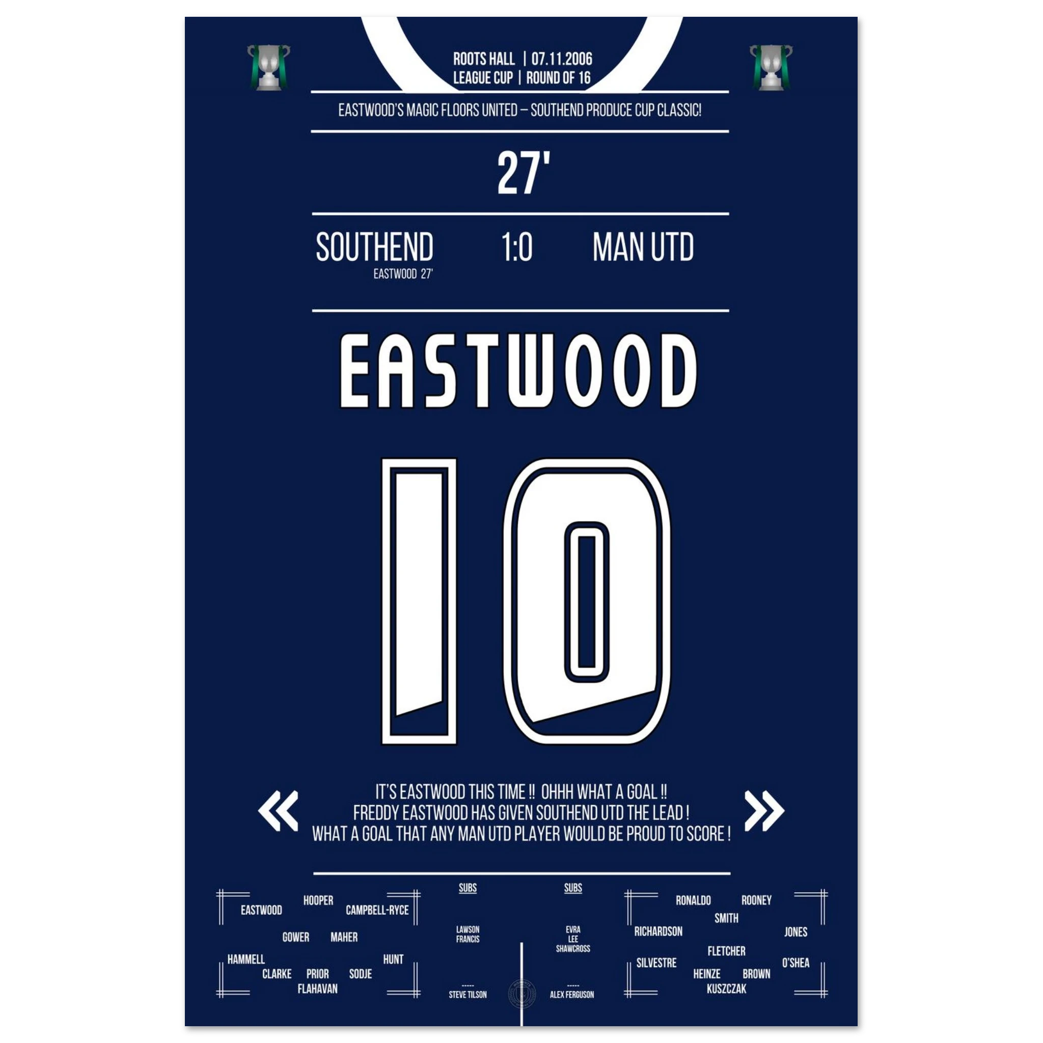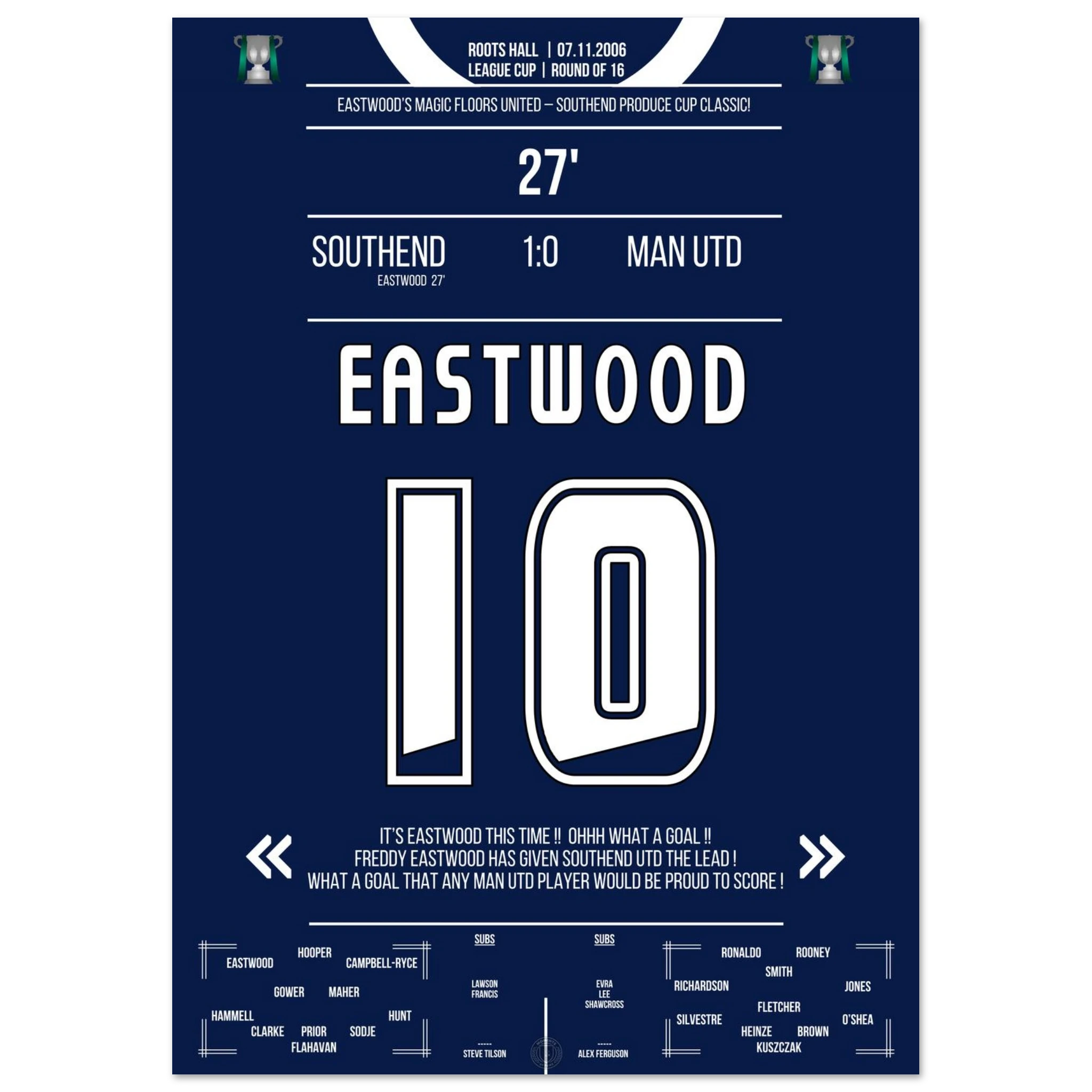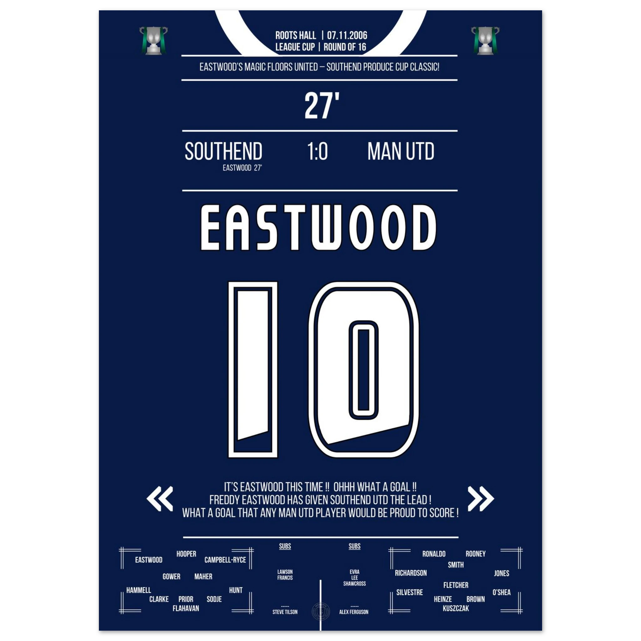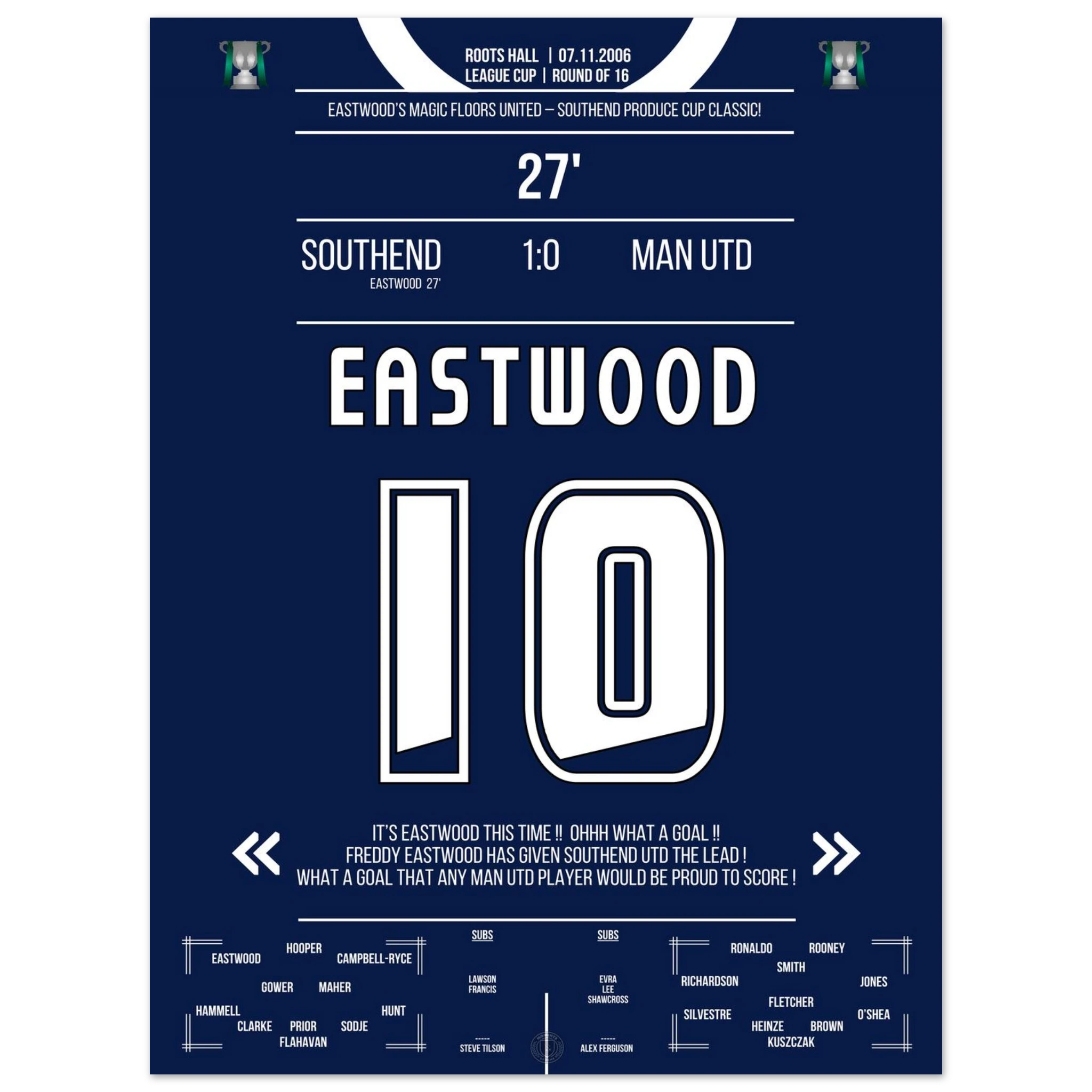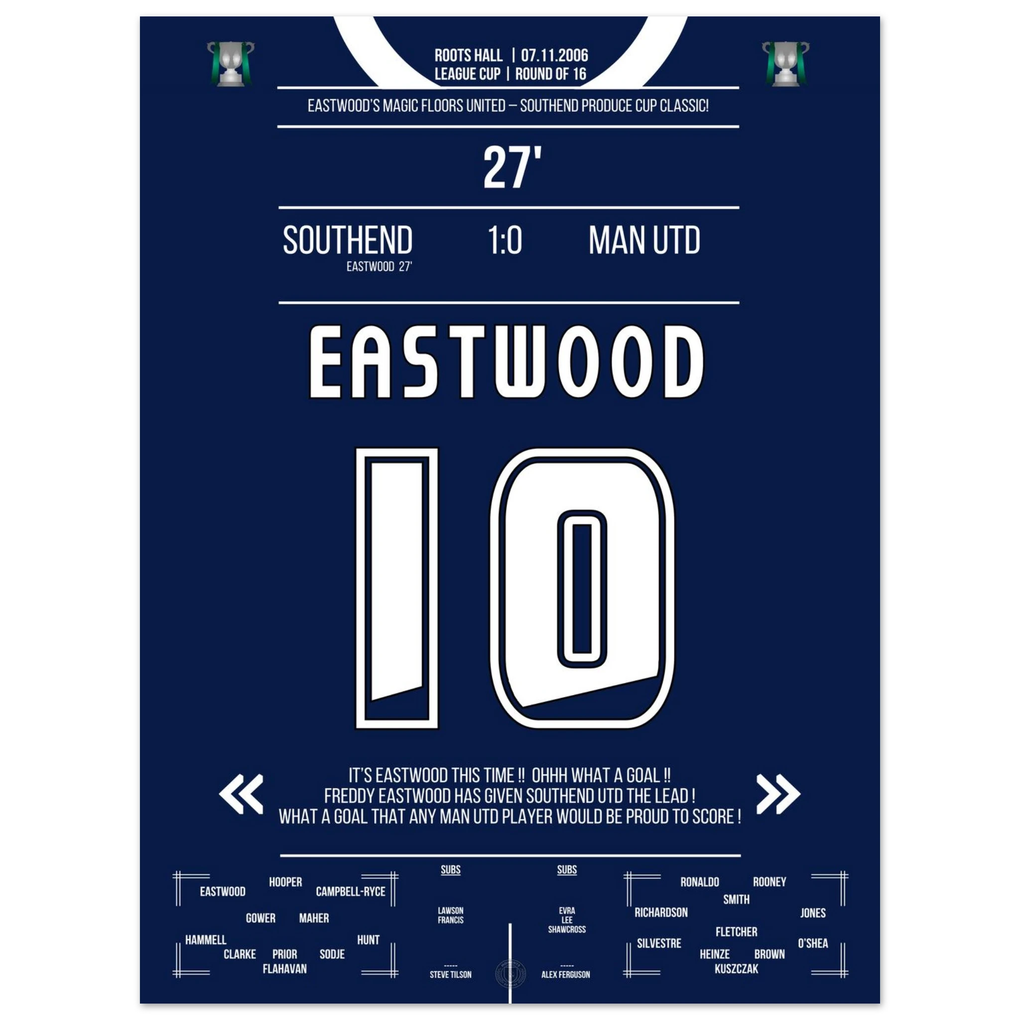 Ein magischer Pokalabend in Essex! Außenseiter Southend trotzt den Giganten aus Manchester – und Freddy Eastwood schreibt Geschichte. In der 27. Minute zirkelt er einen perfekten Freistoß über die Mauer ins Netz und sorgt für eine der größten Sensationen in der Geschichte des englischen League Cups.