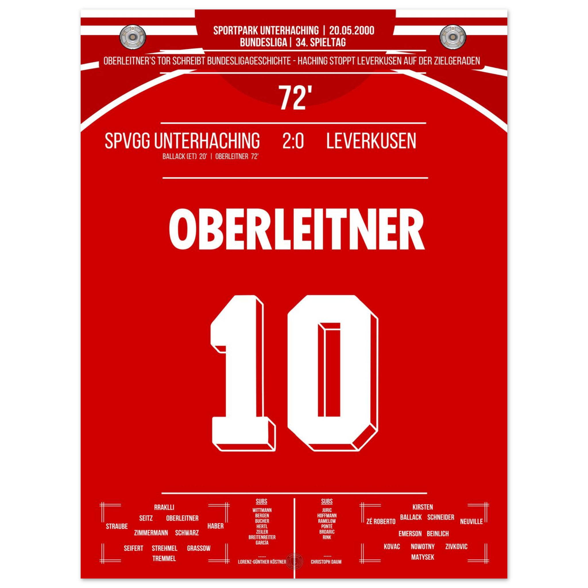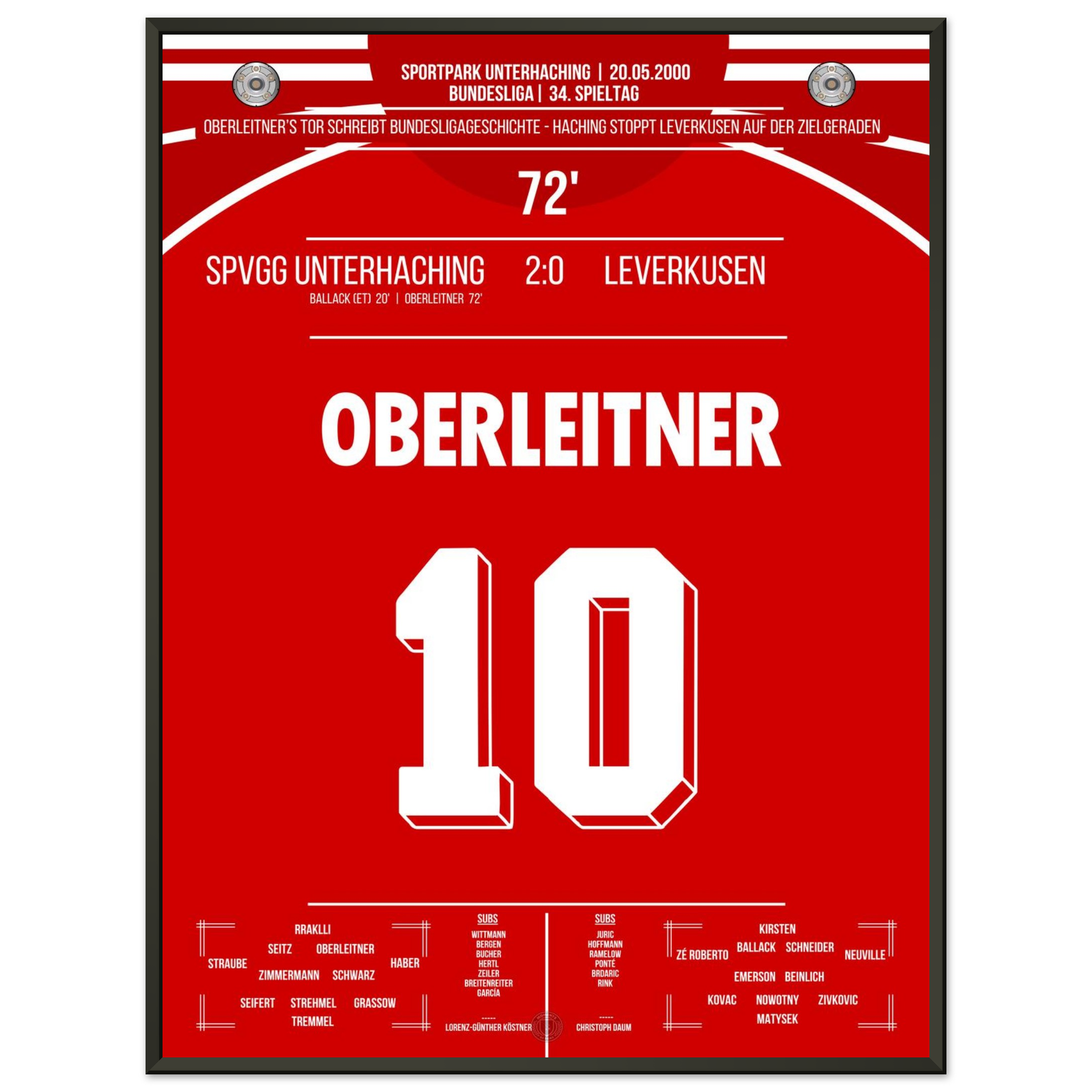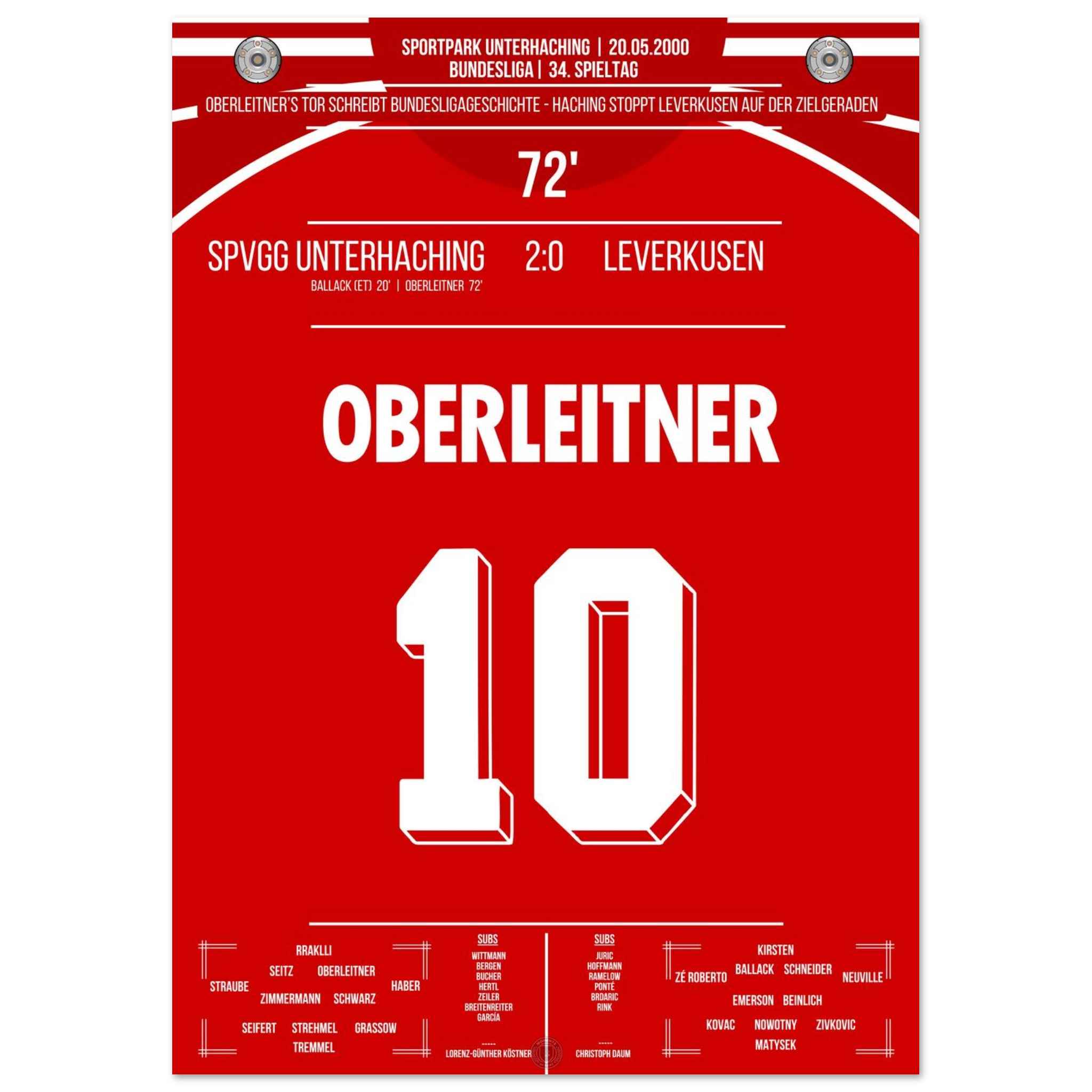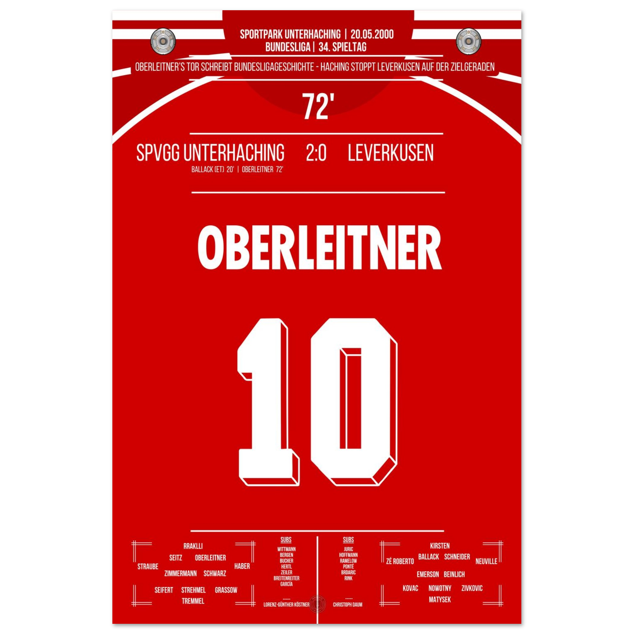 Am letzten Spieltag sorgt Unterhaching für eine der größten Sensationen der Liga-Historie. Markus Oberleitner trifft in der 72. Minute zum 2:0 und stürzt damit Leverkusen im Titelrennen – der Traum vom ersten Meistertitel ist dahin.