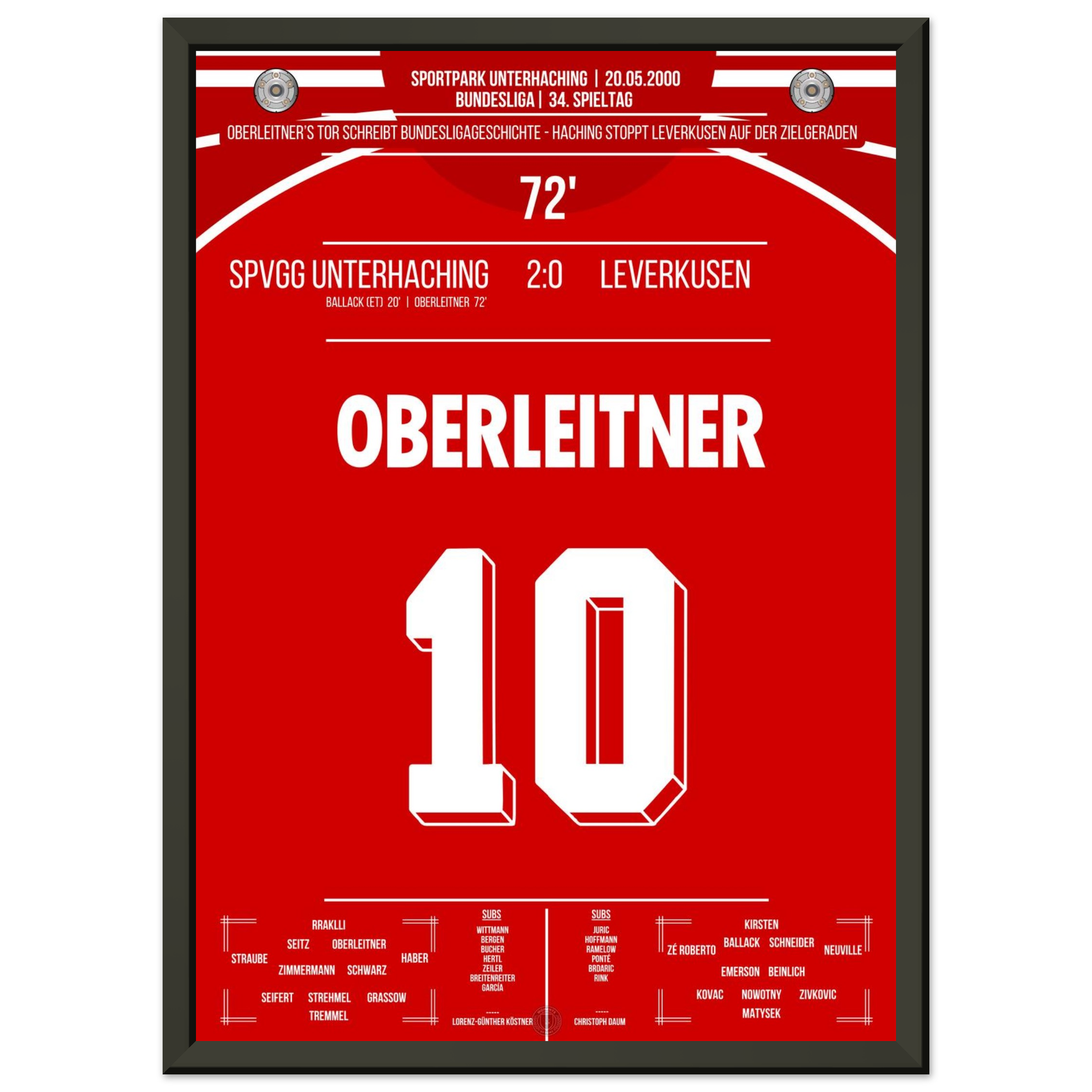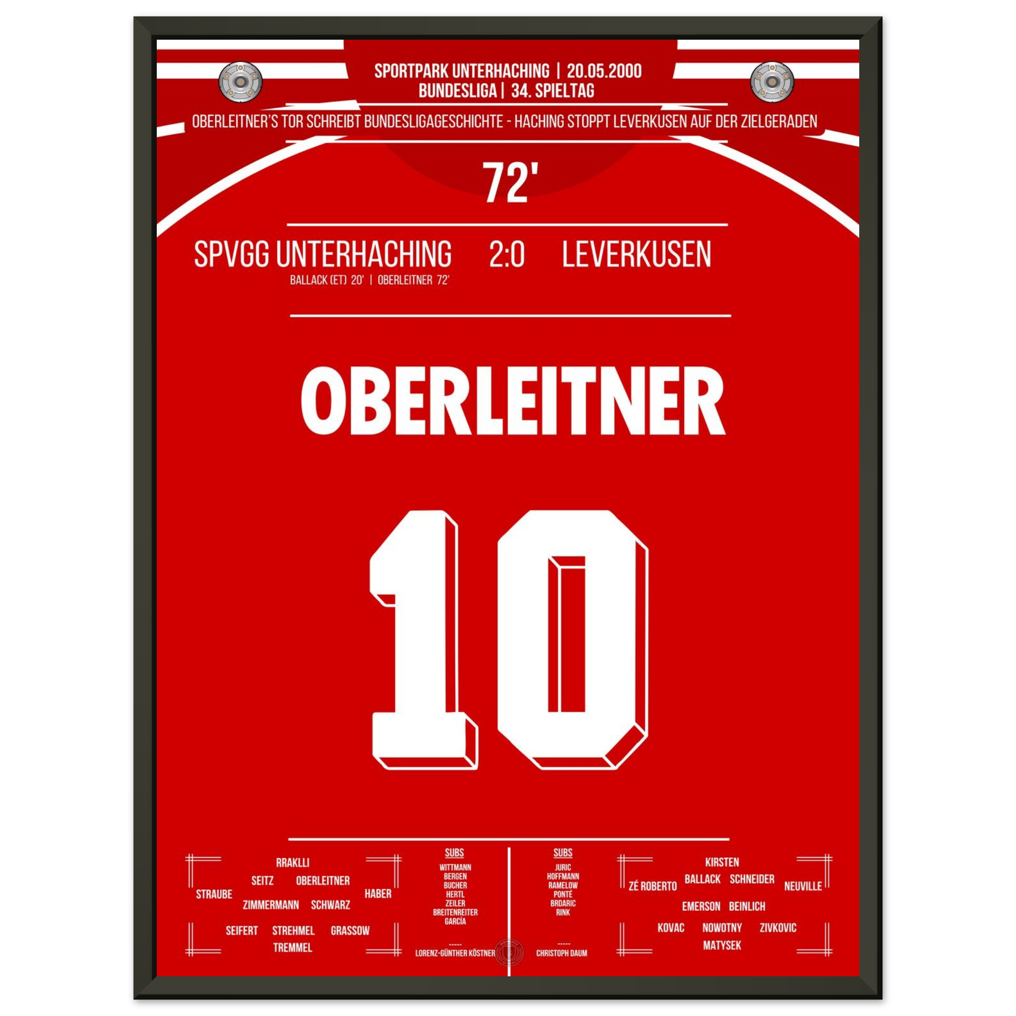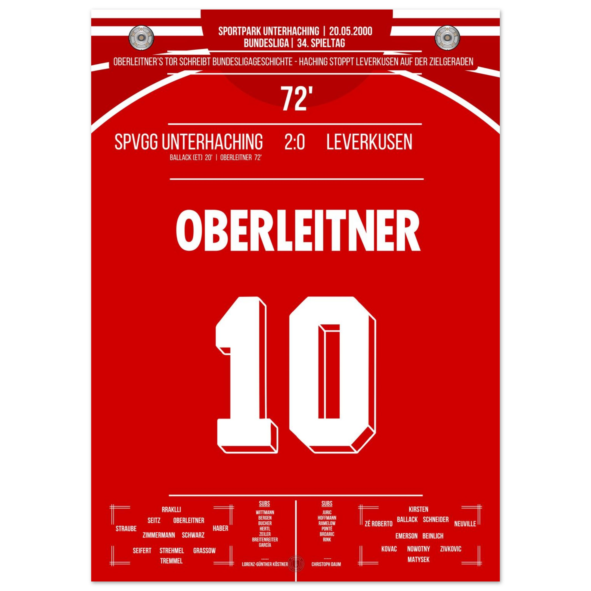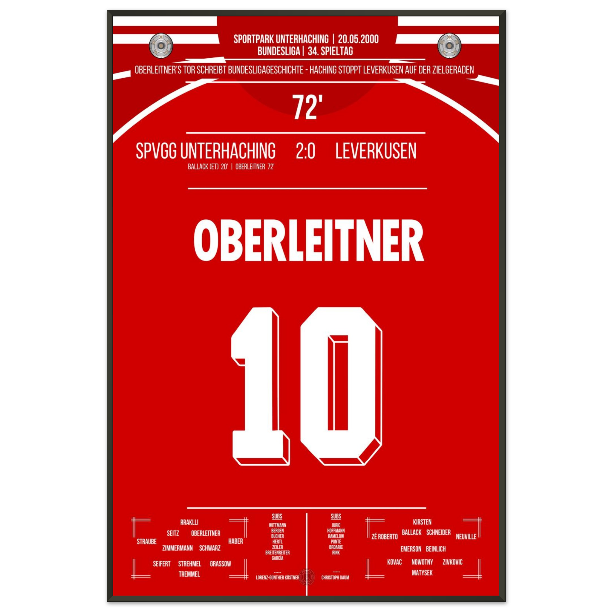 Am letzten Spieltag sorgt Unterhaching für eine der größten Sensationen der Liga-Historie. Markus Oberleitner trifft in der 72. Minute zum 2:0 und stürzt damit Leverkusen im Titelrennen – der Traum vom ersten Meistertitel ist dahin.