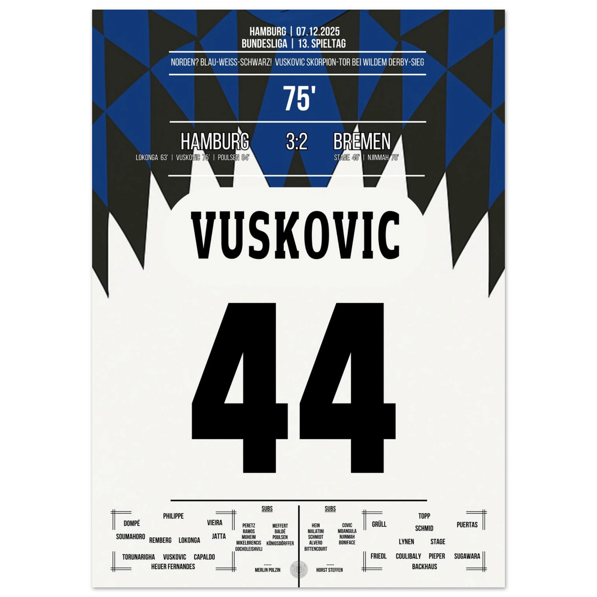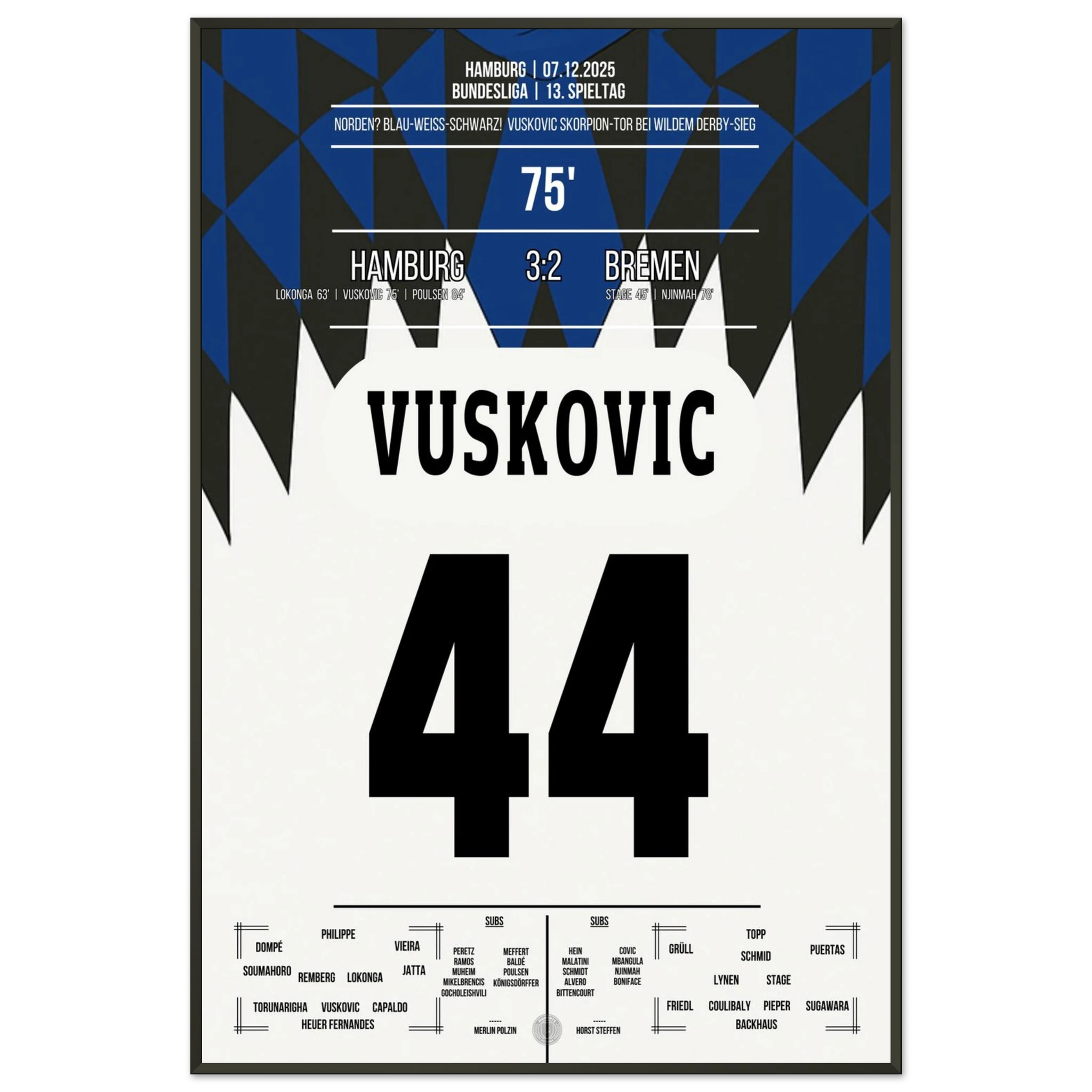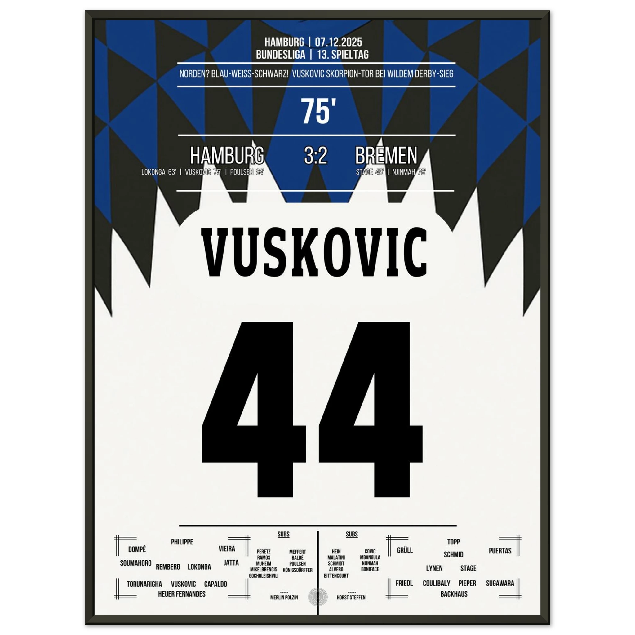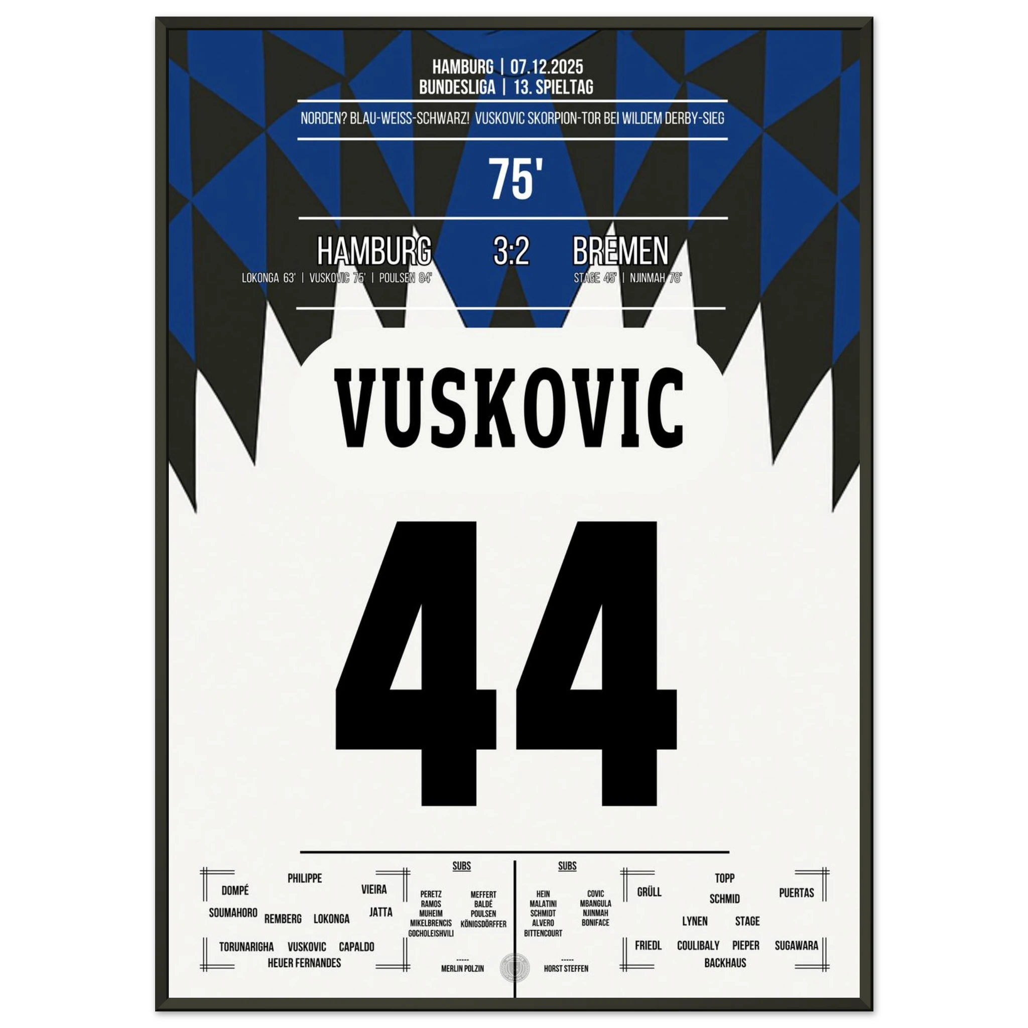 Unser Poster hält diesen magischen Abend fest – ein Nordderby für die Ewigkeit, eingefangen in Blau, Weiß, Schwarz. 💙🤍🖤