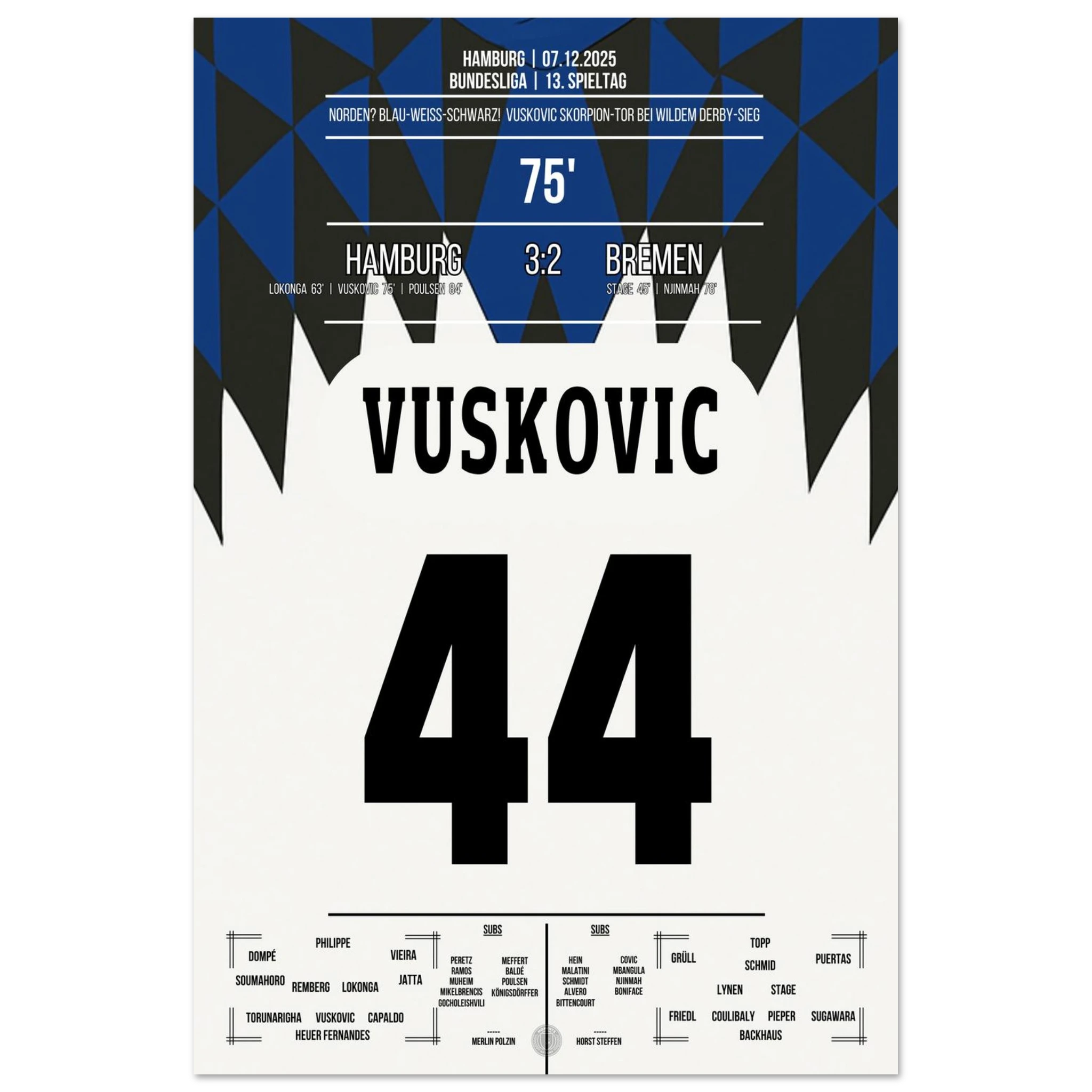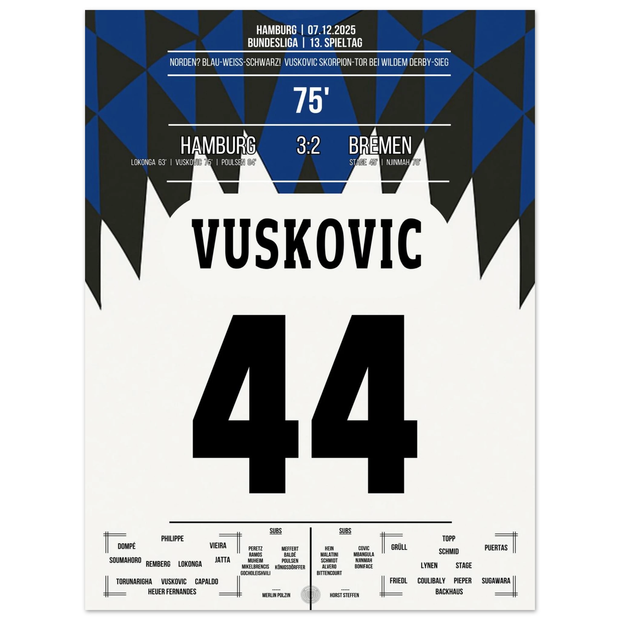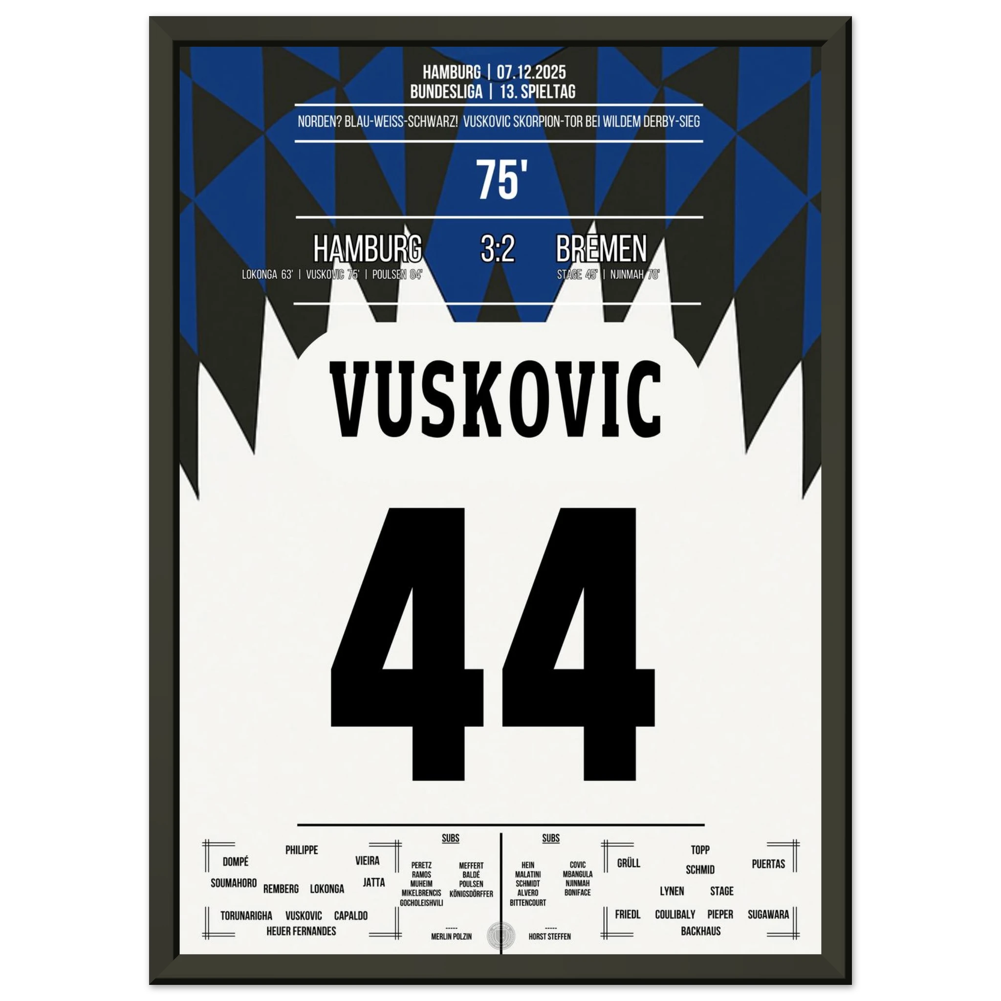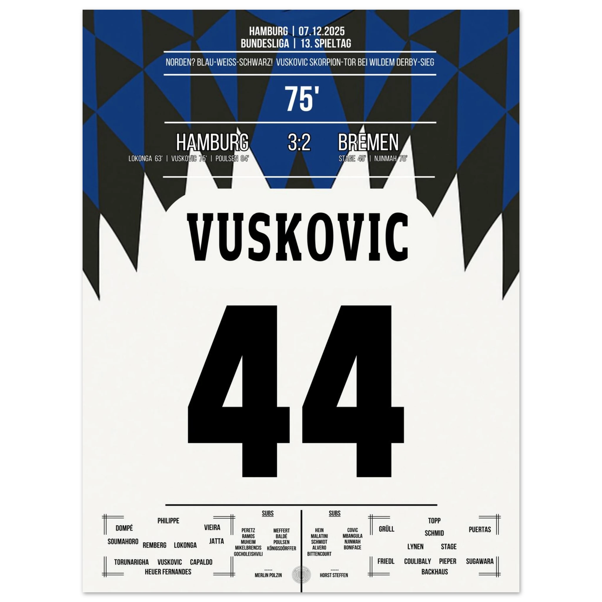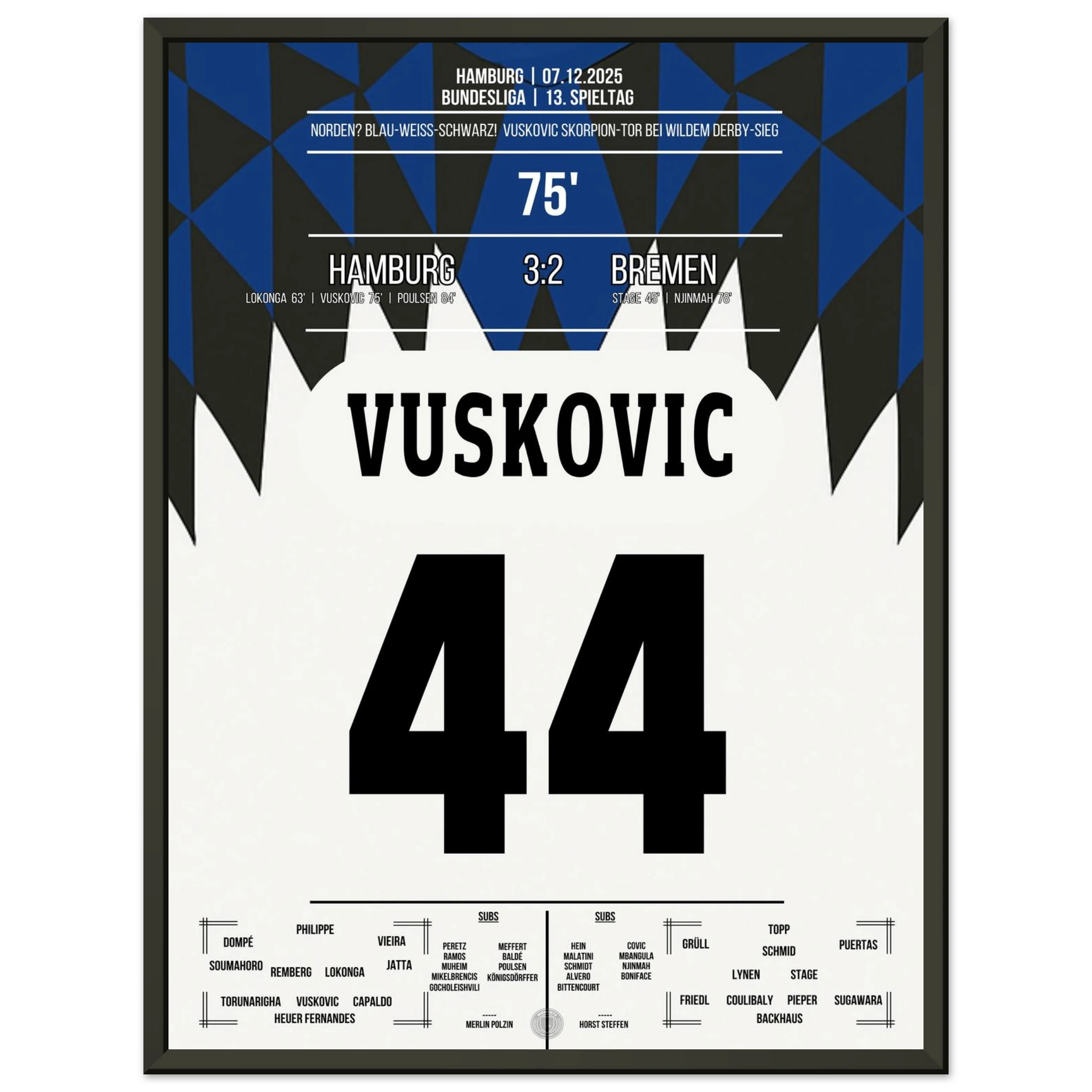 Unser Poster hält diesen magischen Abend fest – ein Nordderby für die Ewigkeit, eingefangen in Blau, Weiß, Schwarz. 💙🤍🖤