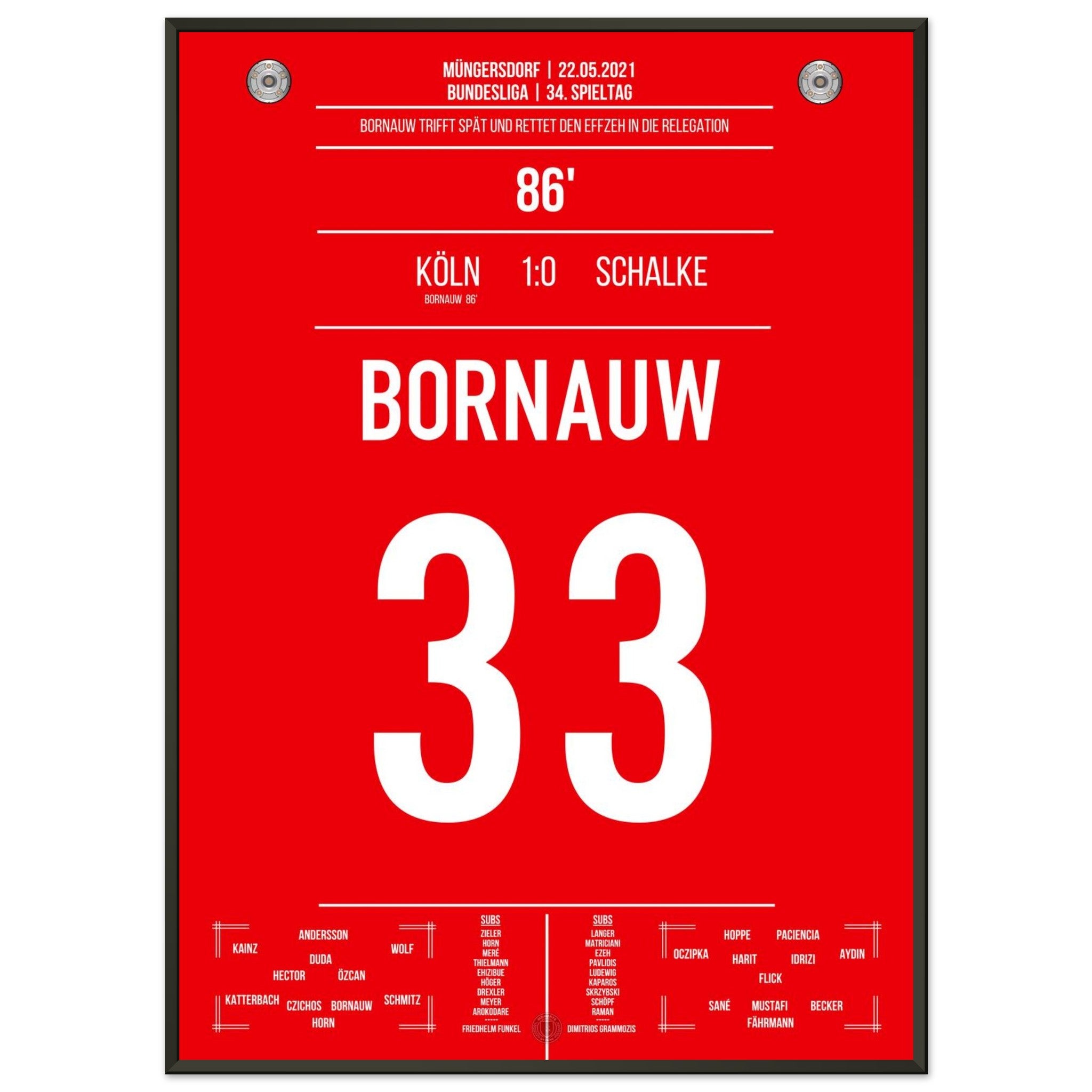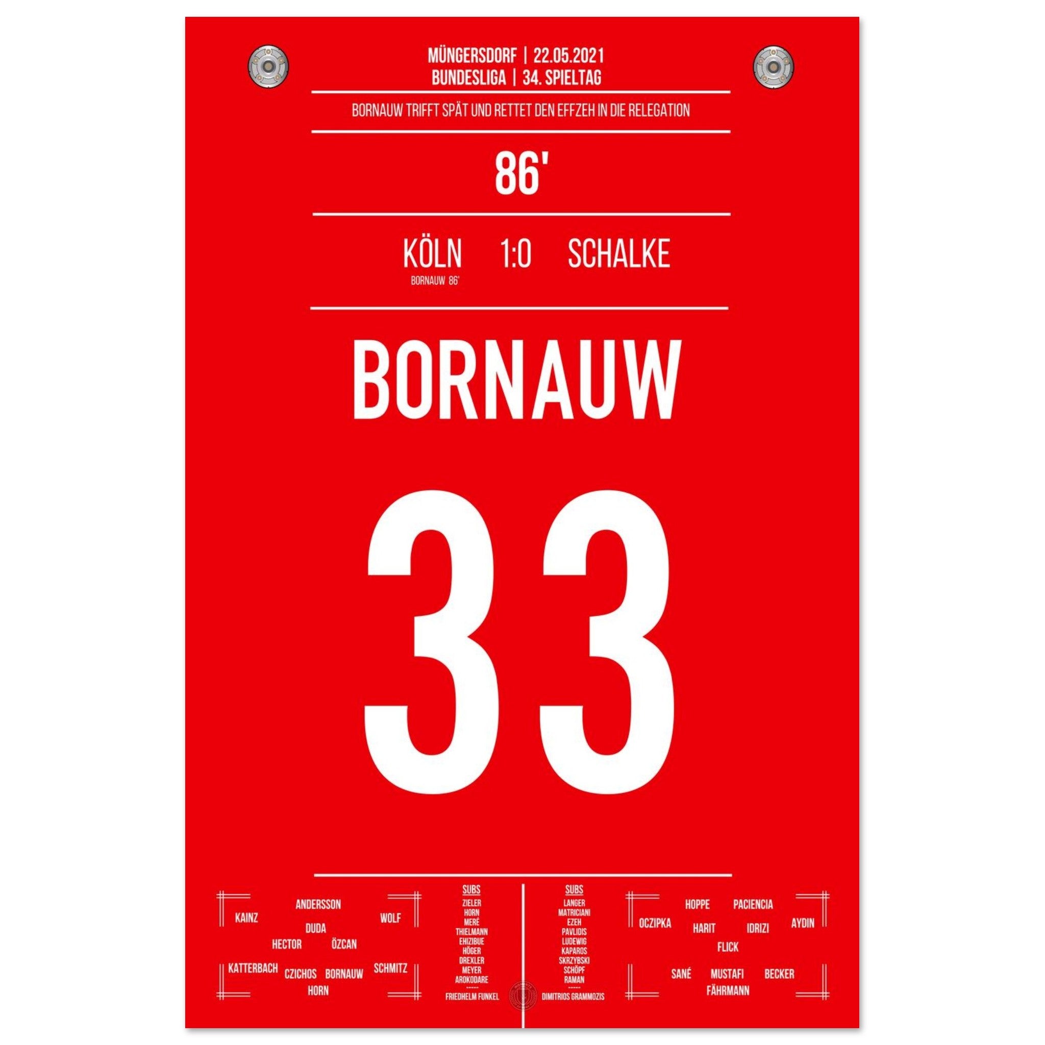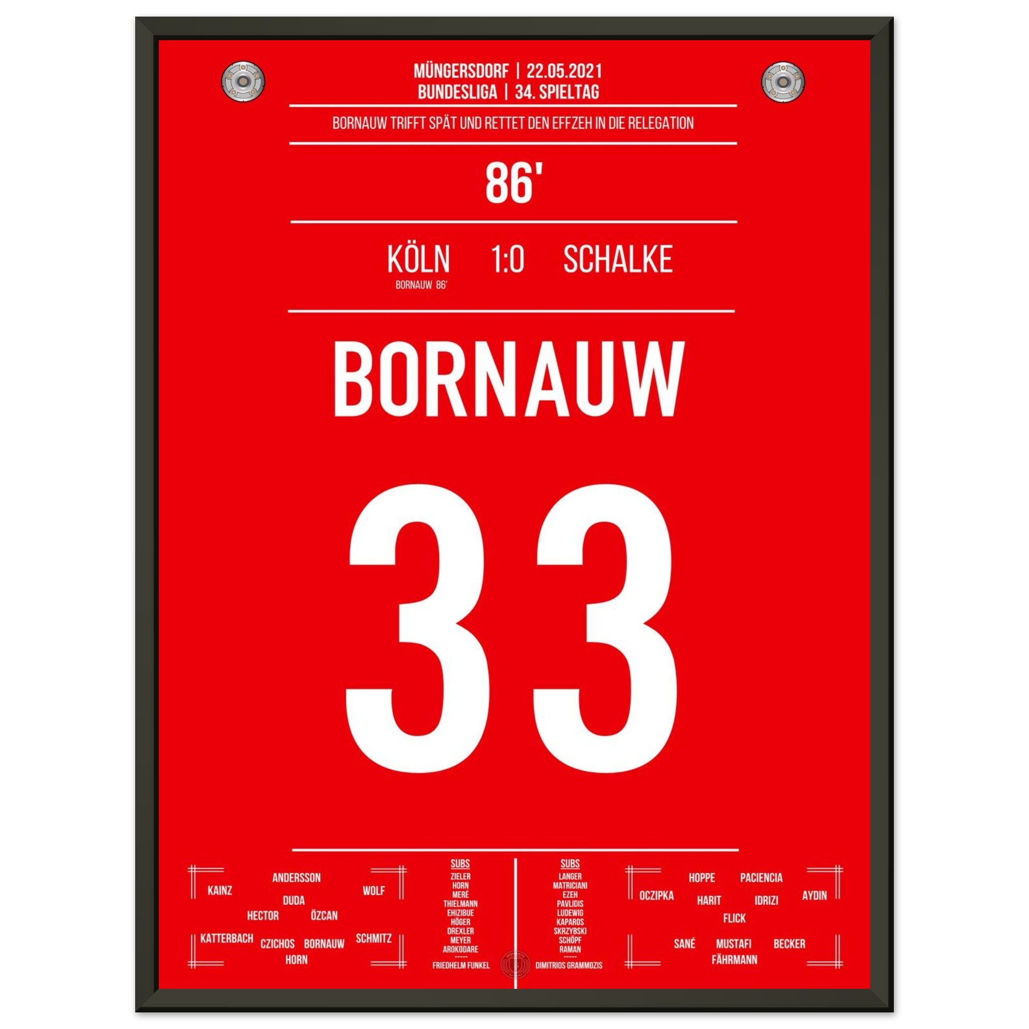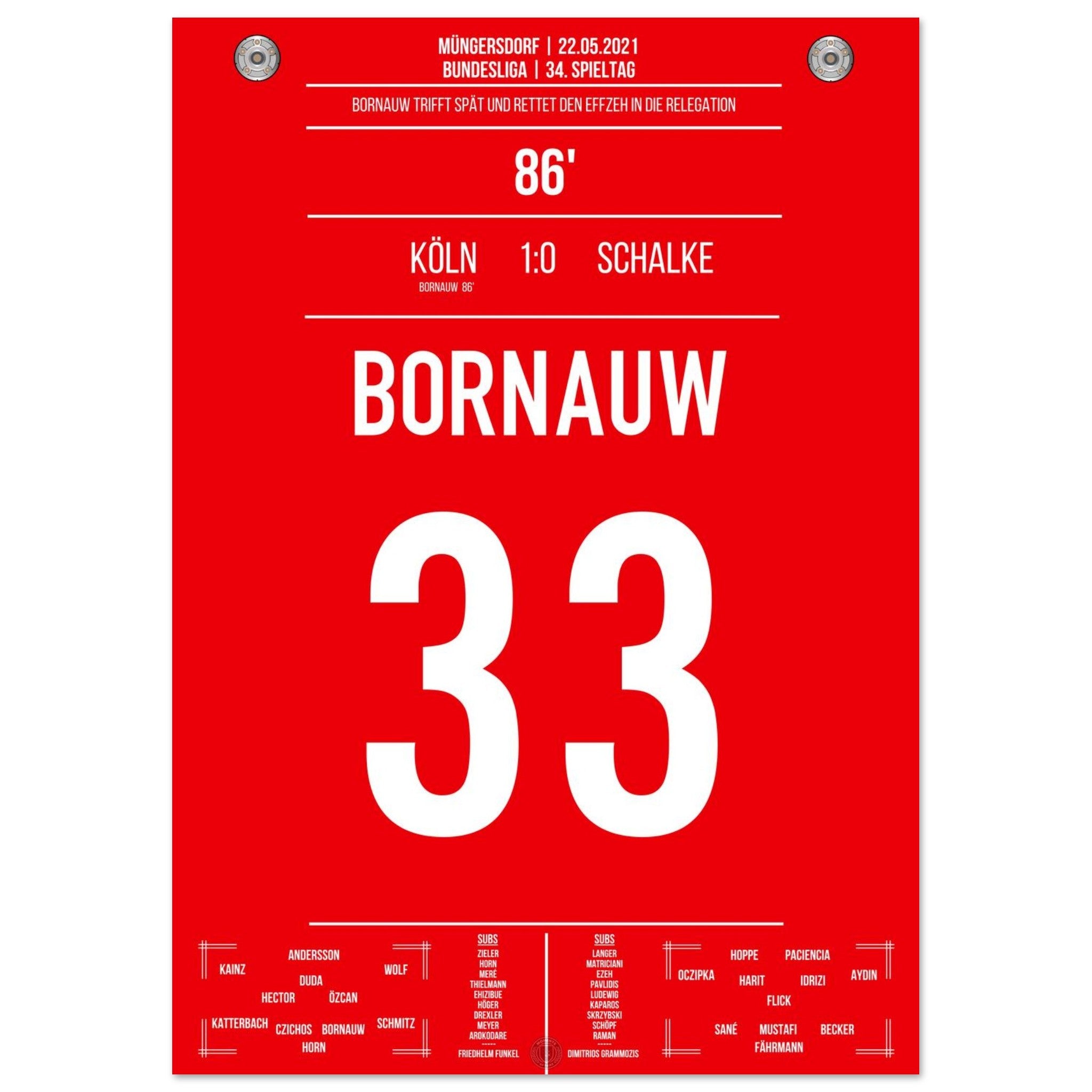 22. Mai 2021 – Köln vs. Schalke 1:0: In der 86. Minute haut Bornauw den Ball ins Netz und rettet den Köln in die Relegation – ein Last-Minute-Tor mit riesiger Bedeutung. Das Stadion in Müngersdorf explodiert vor Erleichterung. Unser Poster verewigt diesen emotionalen Moment im Abstiegskampf.