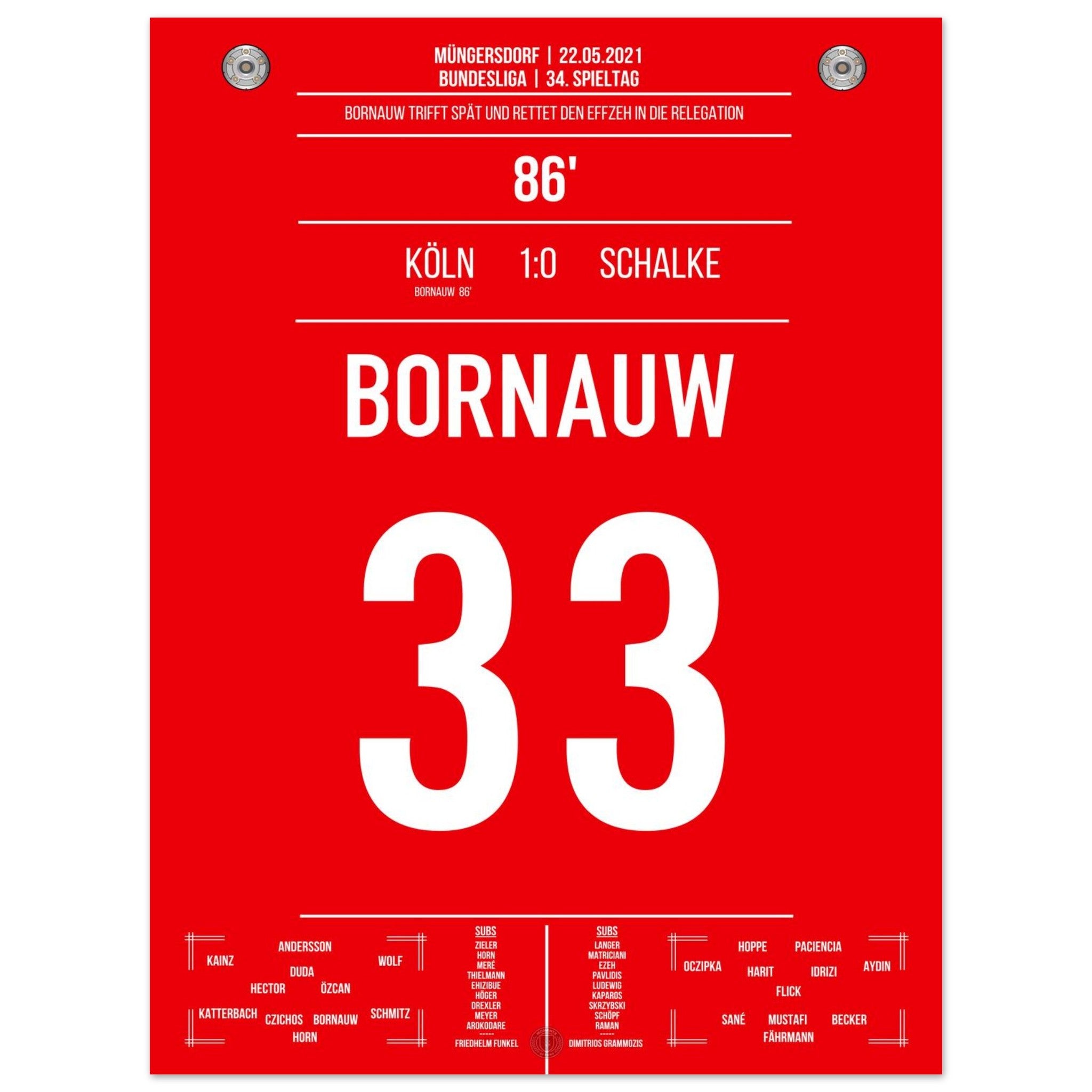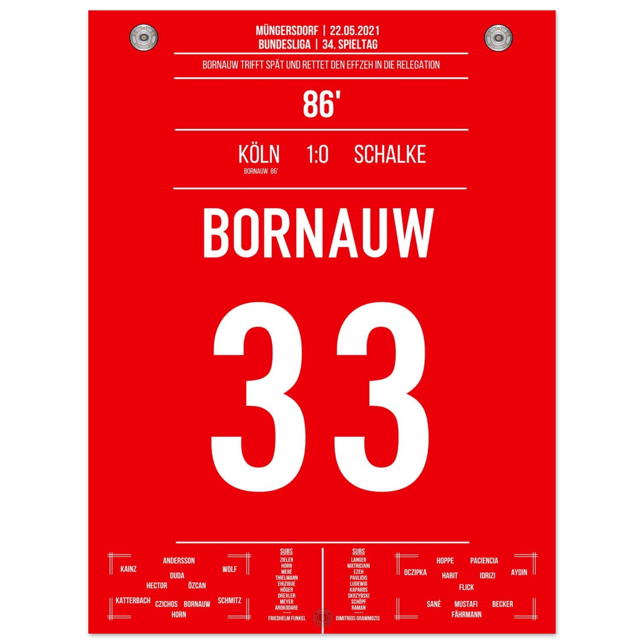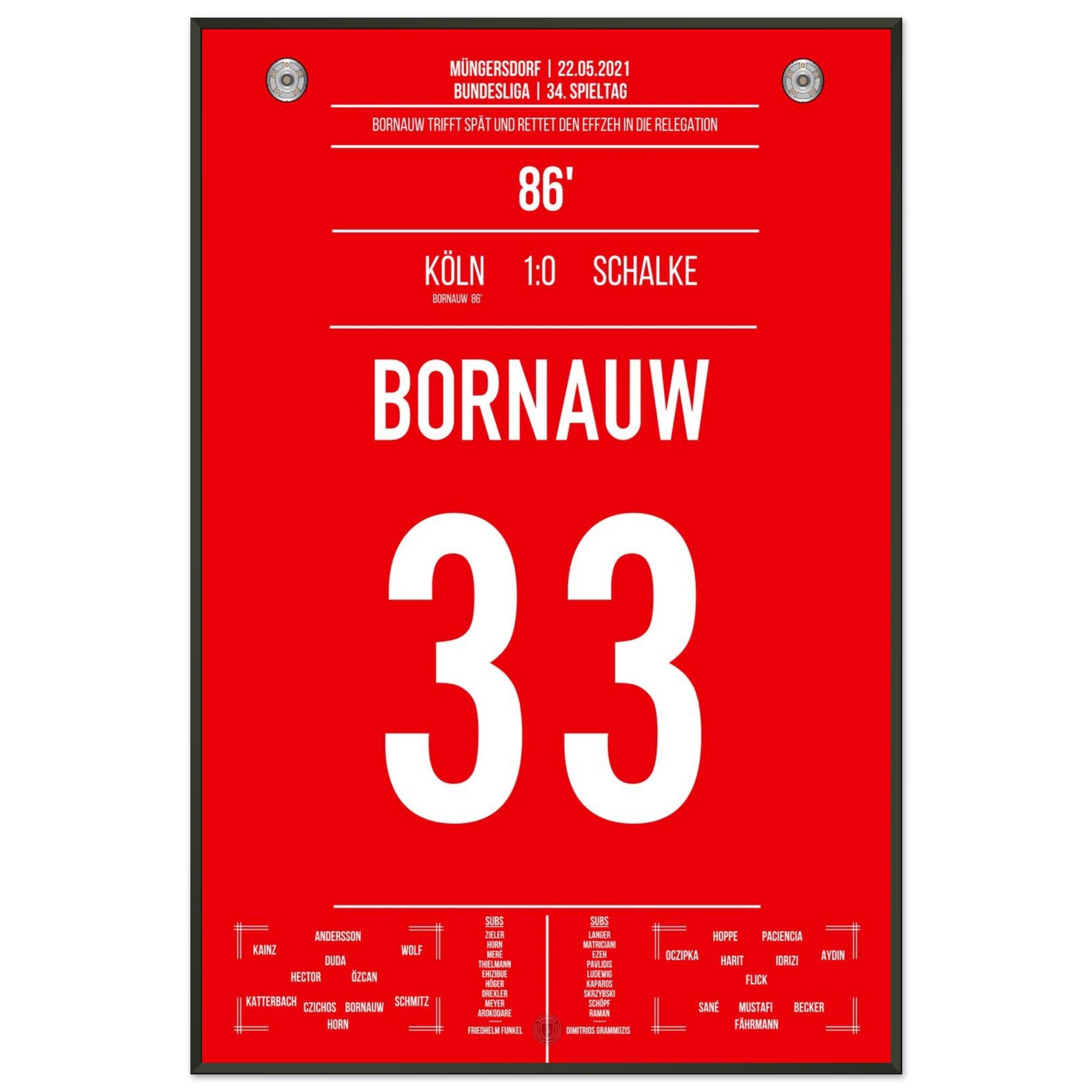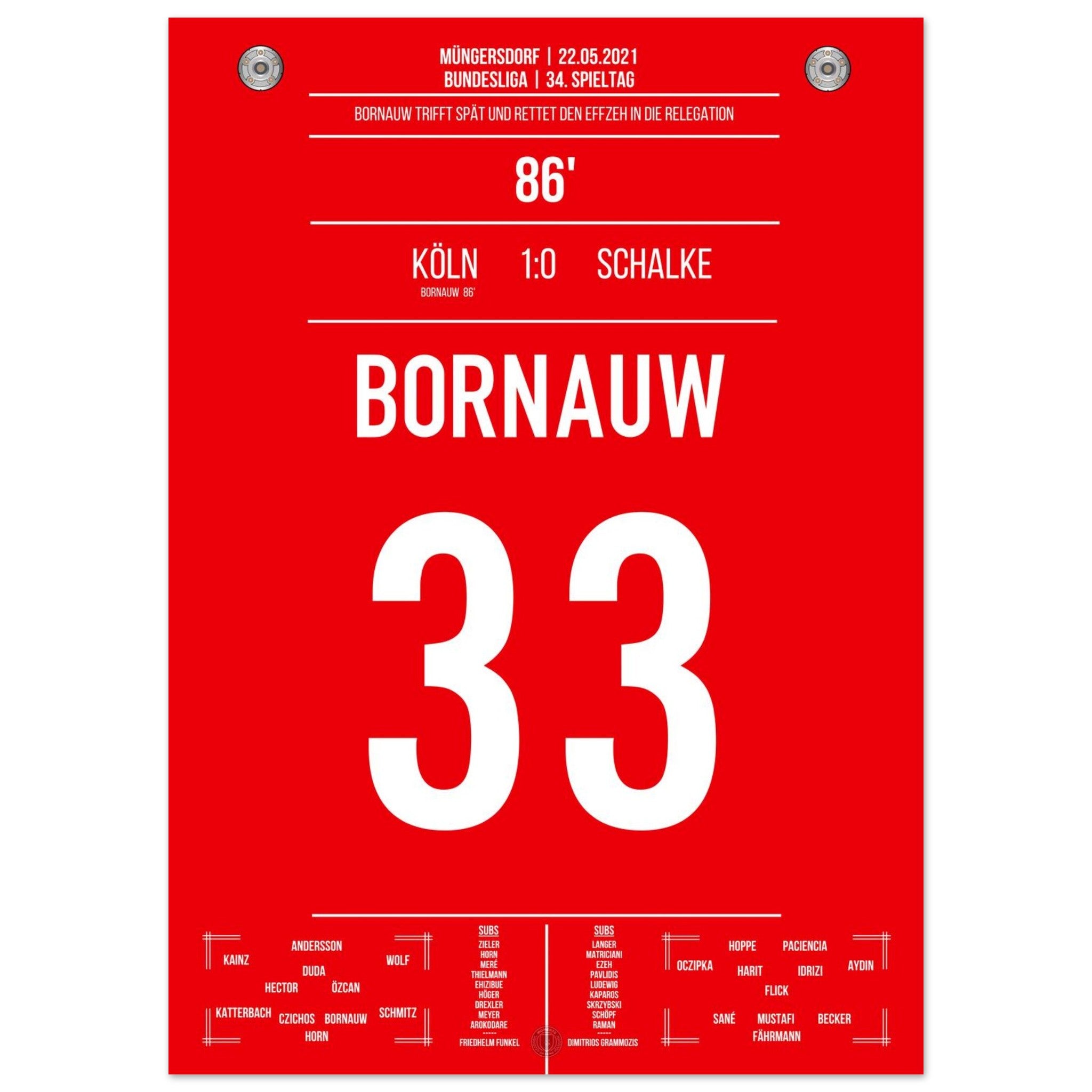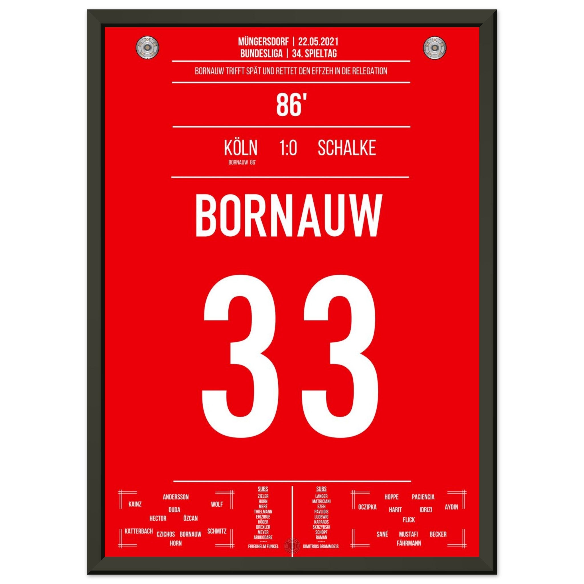 22. Mai 2021 – Köln vs. Schalke 1:0: In der 86. Minute haut Bornauw den Ball ins Netz und rettet den Köln in die Relegation – ein Last-Minute-Tor mit riesiger Bedeutung. Das Stadion in Müngersdorf explodiert vor Erleichterung. Unser Poster verewigt diesen emotionalen Moment im Abstiegskampf.