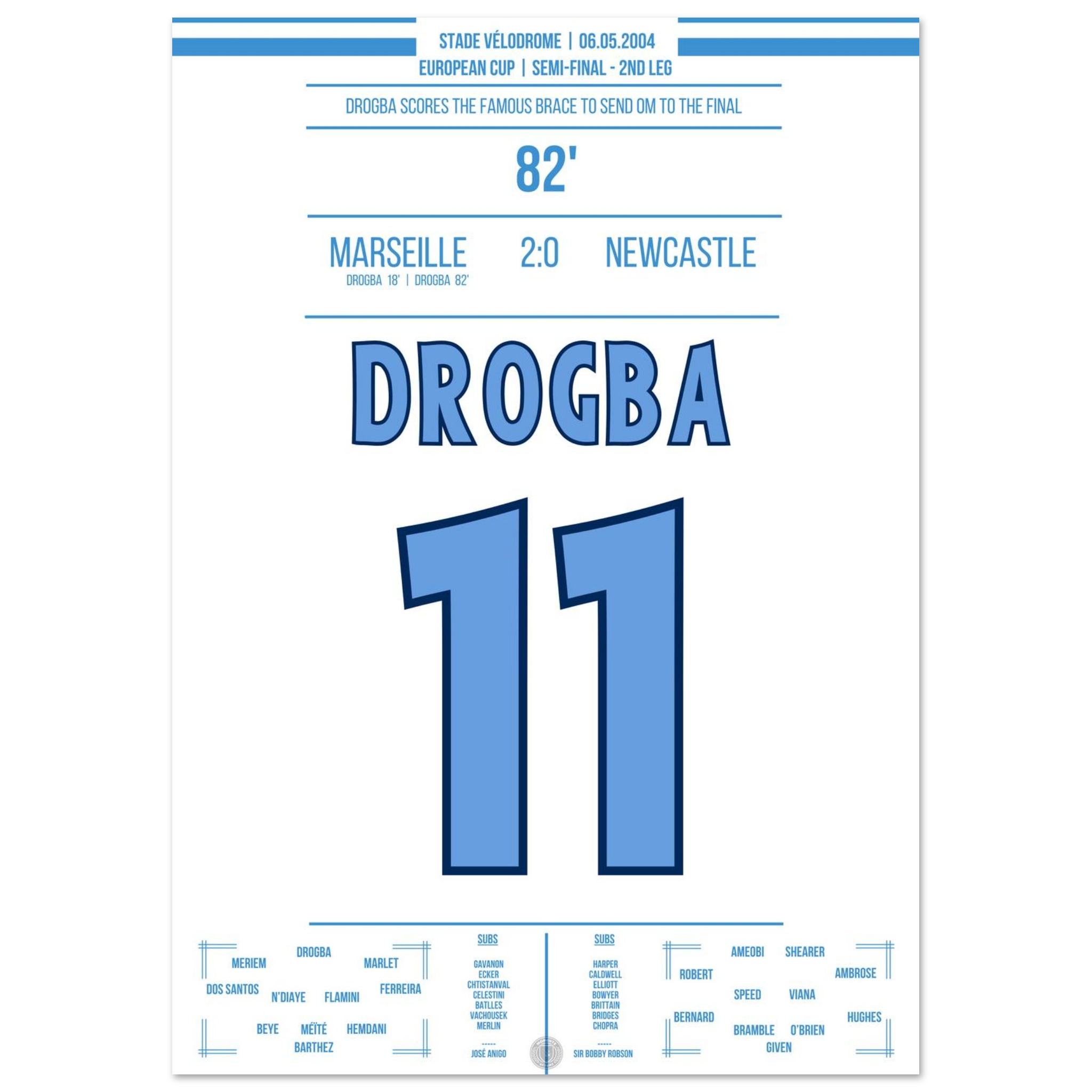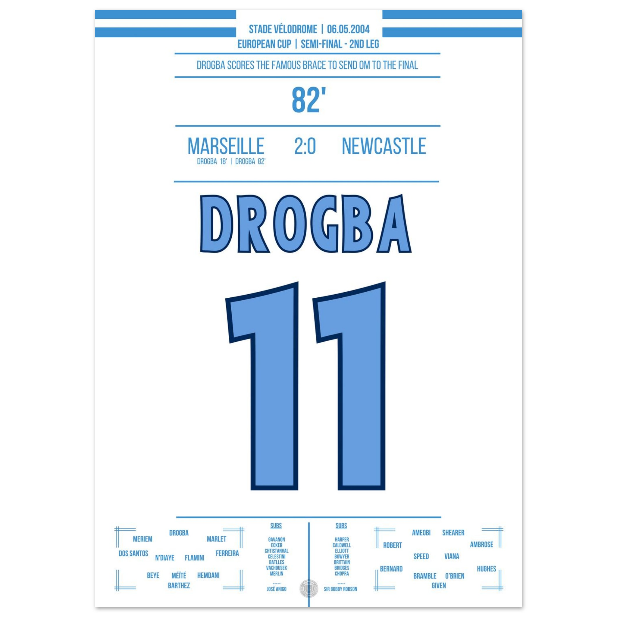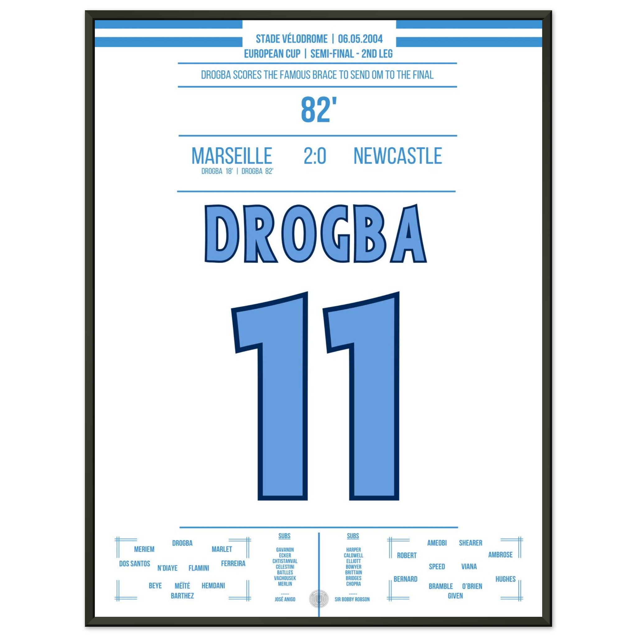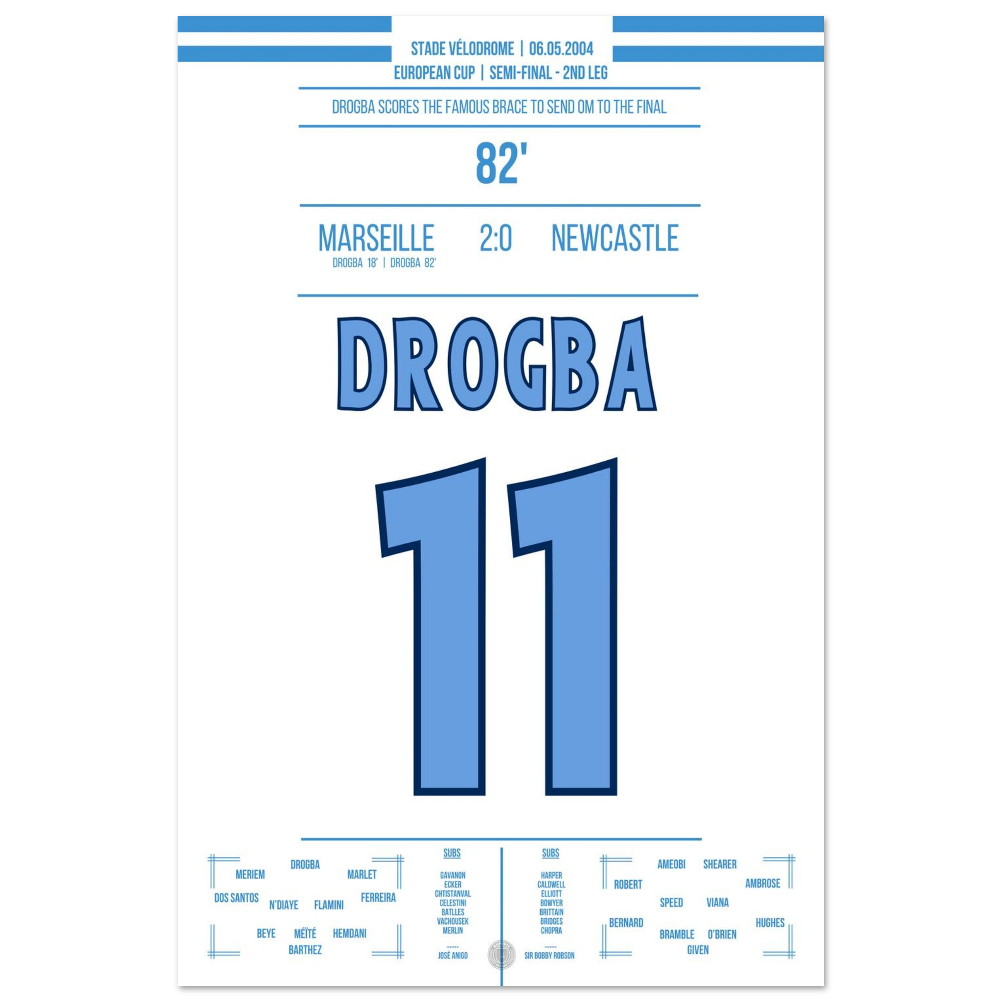 Dieses Poster fängt den Moment ein, in dem Drogba Marseille in Ekstase versetzte – pure Magie an der Mittelmeerküste.