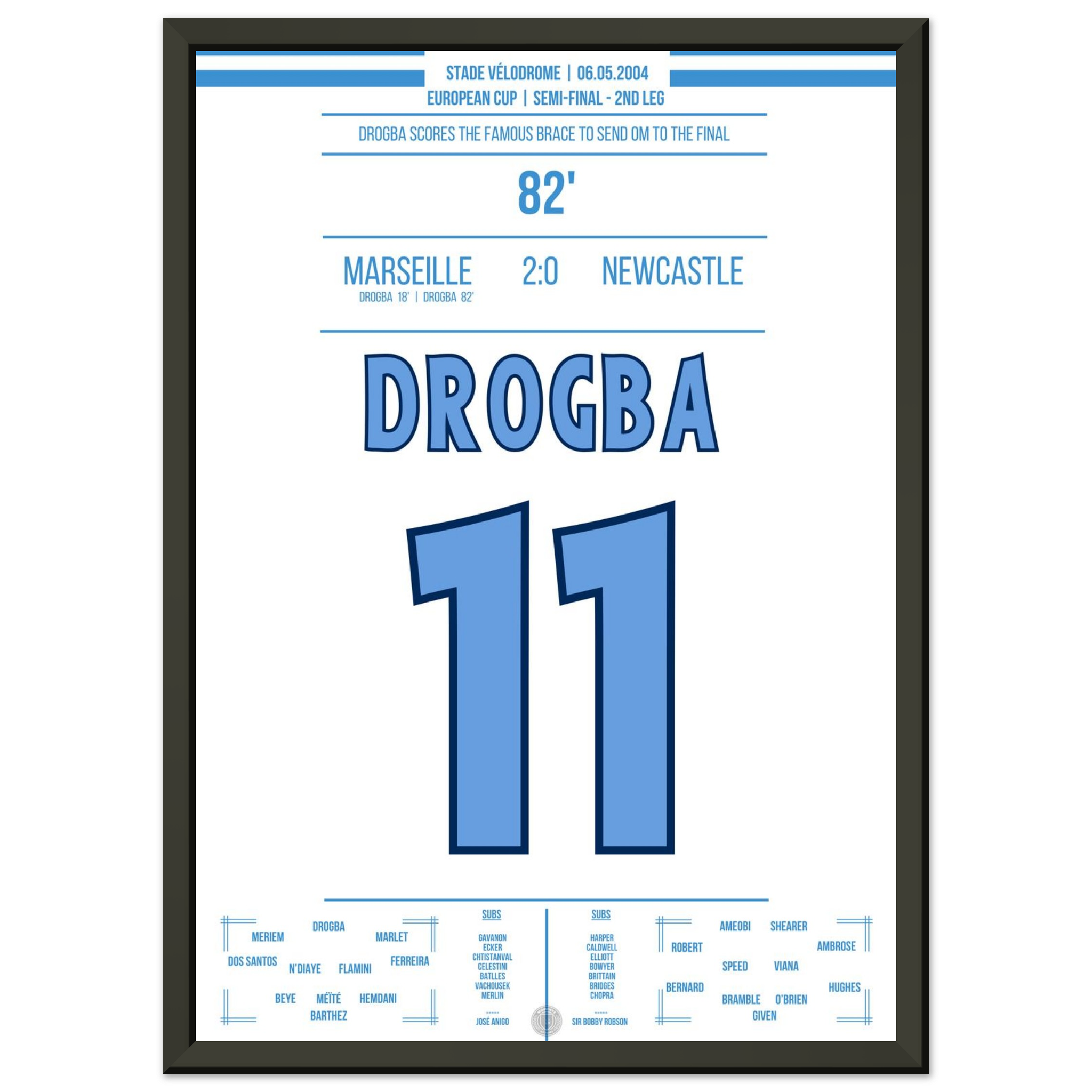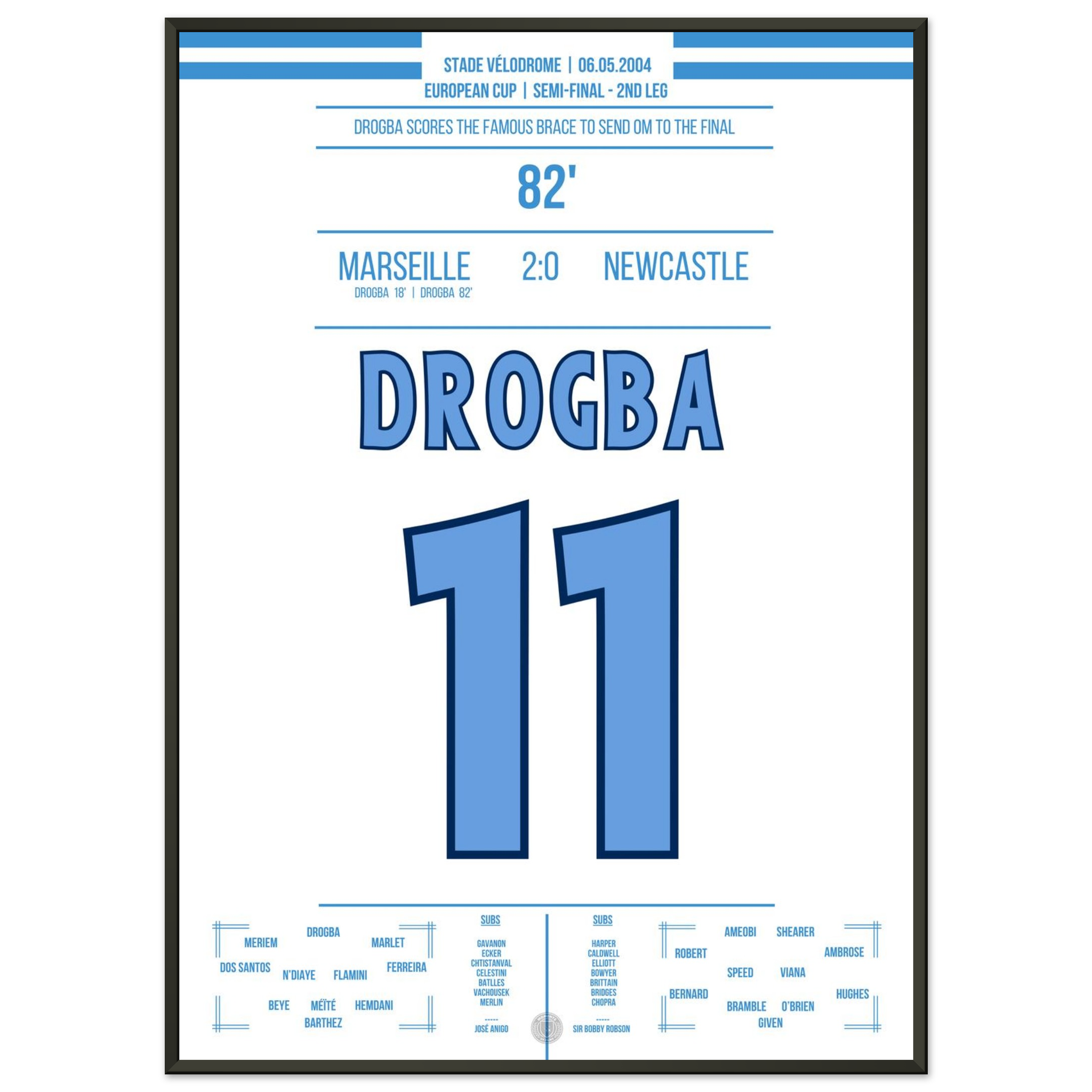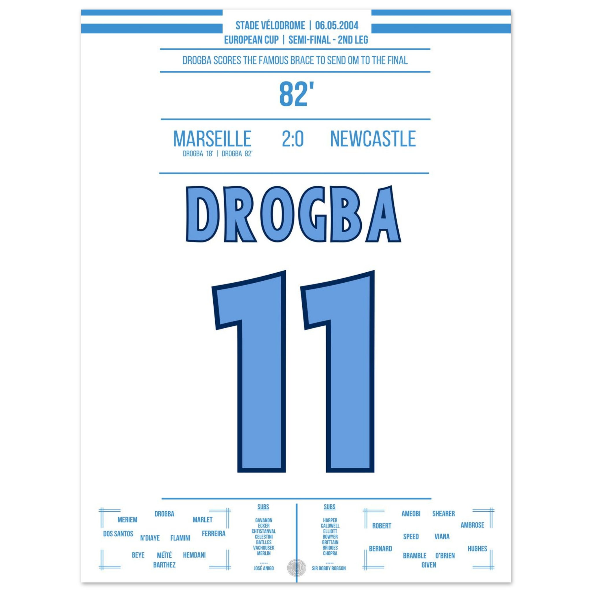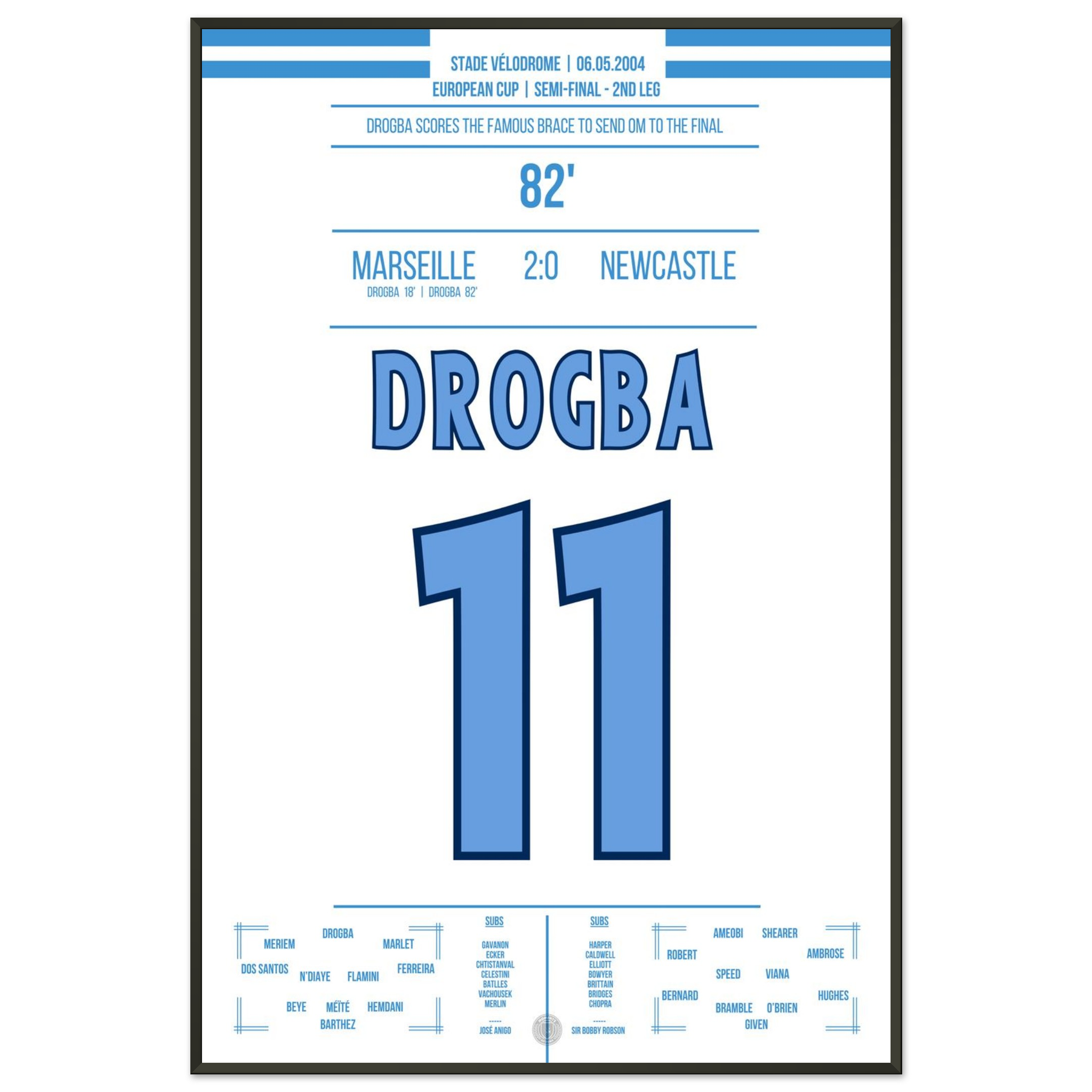 Dieses Poster fängt den Moment ein, in dem Drogba Marseille in Ekstase versetzte – pure Magie an der Mittelmeerküste.