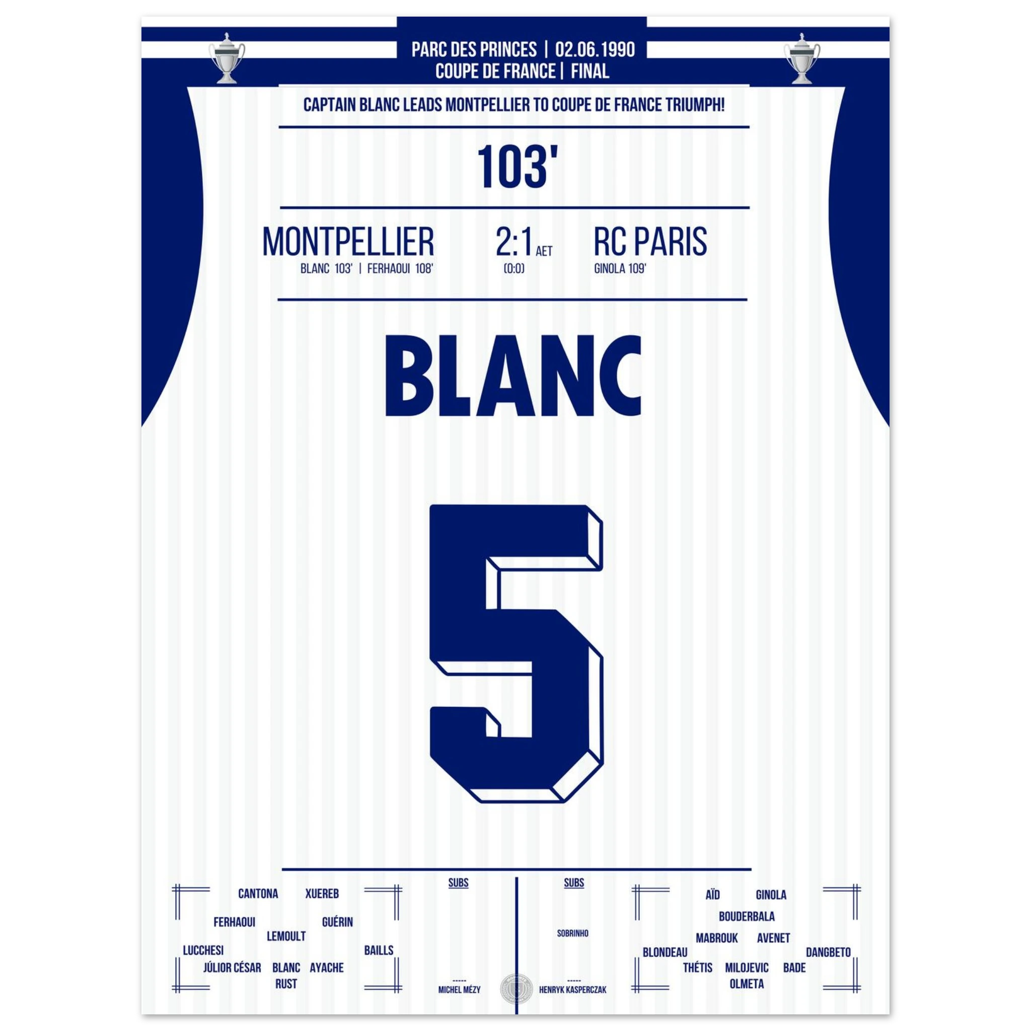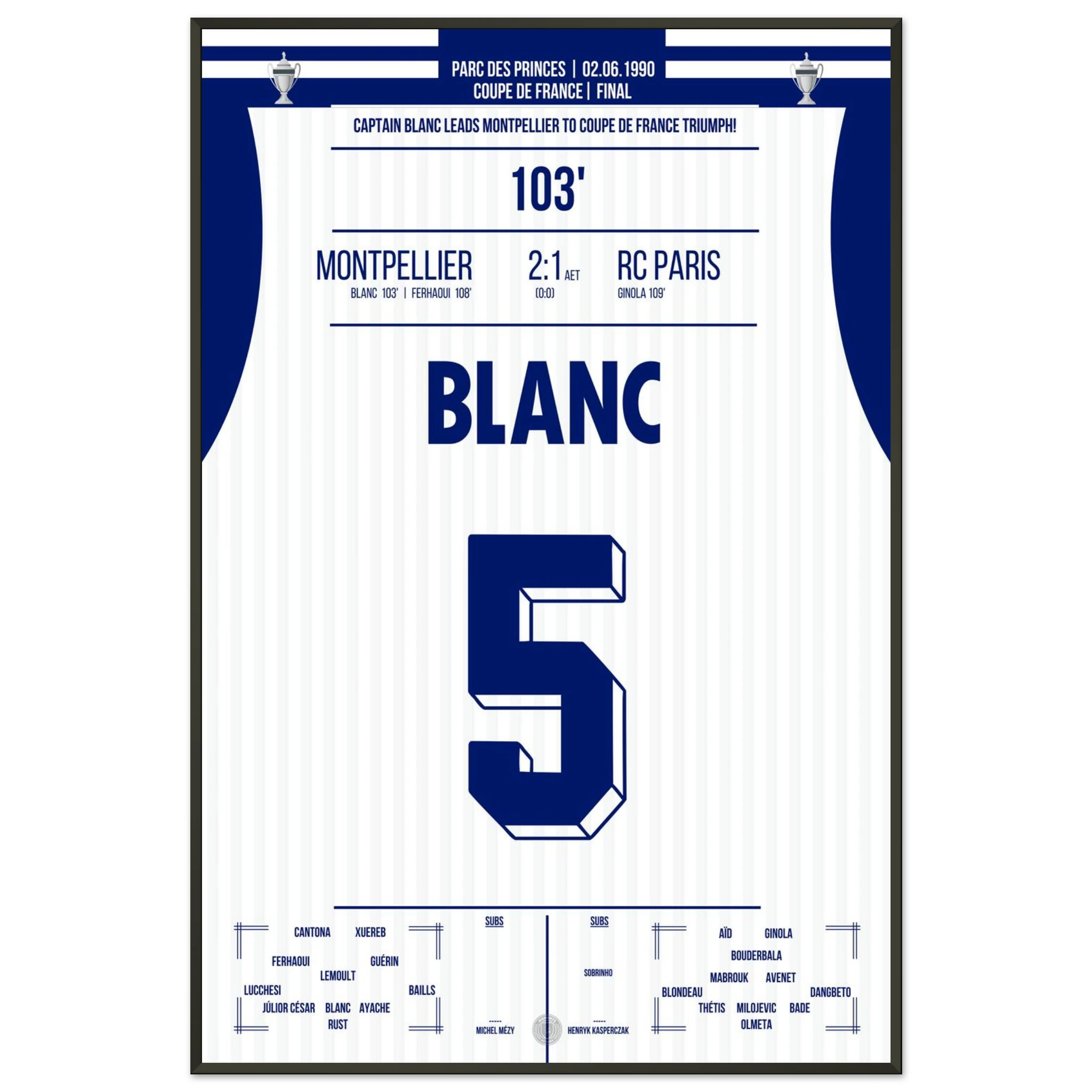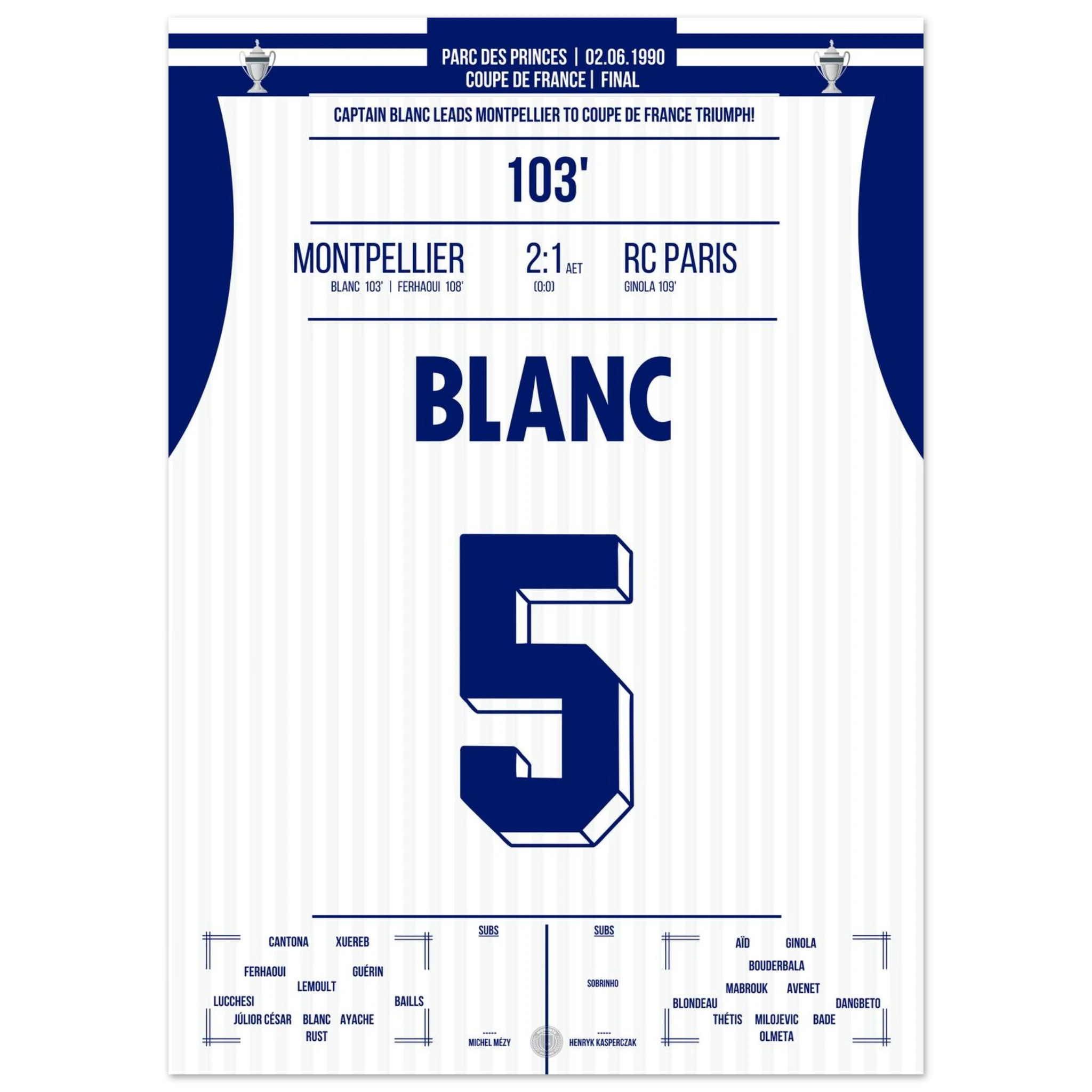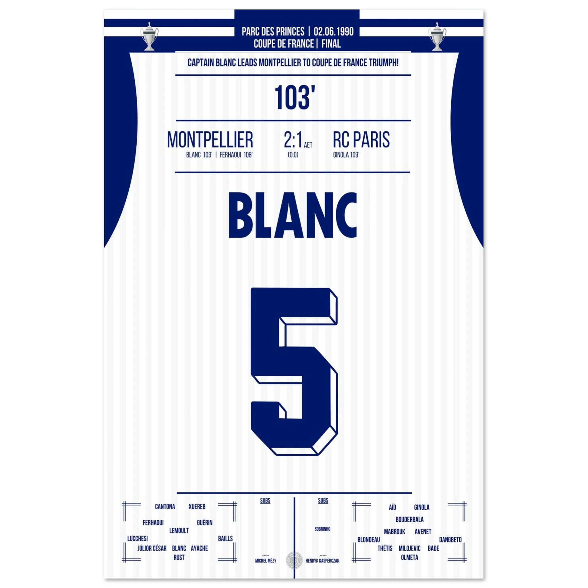 Ein packendes Pokalfinale, das erst in der Verlängerung entschieden wird: Laurent Blanc avanciert zum Helden des Abends, als er den entscheidenden Treffer erzielt und Montpellier den zweiten großen Titel der Vereinsgeschichte schenkt.