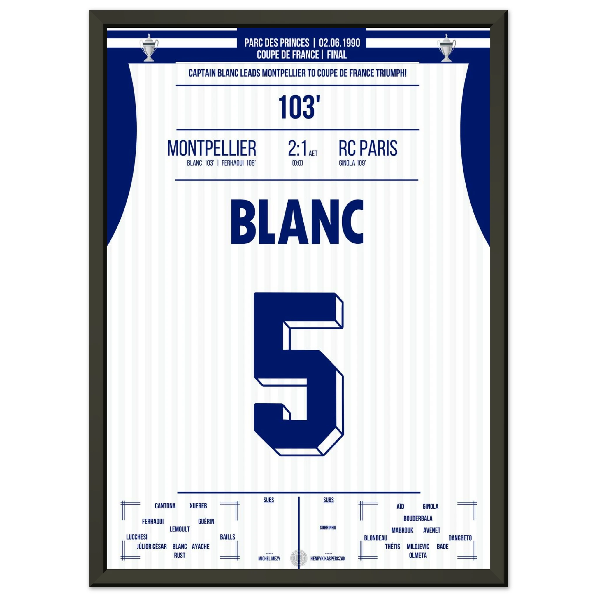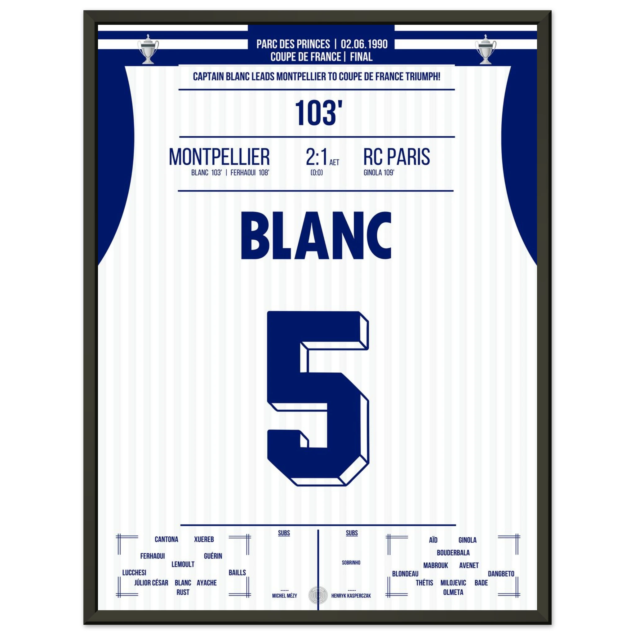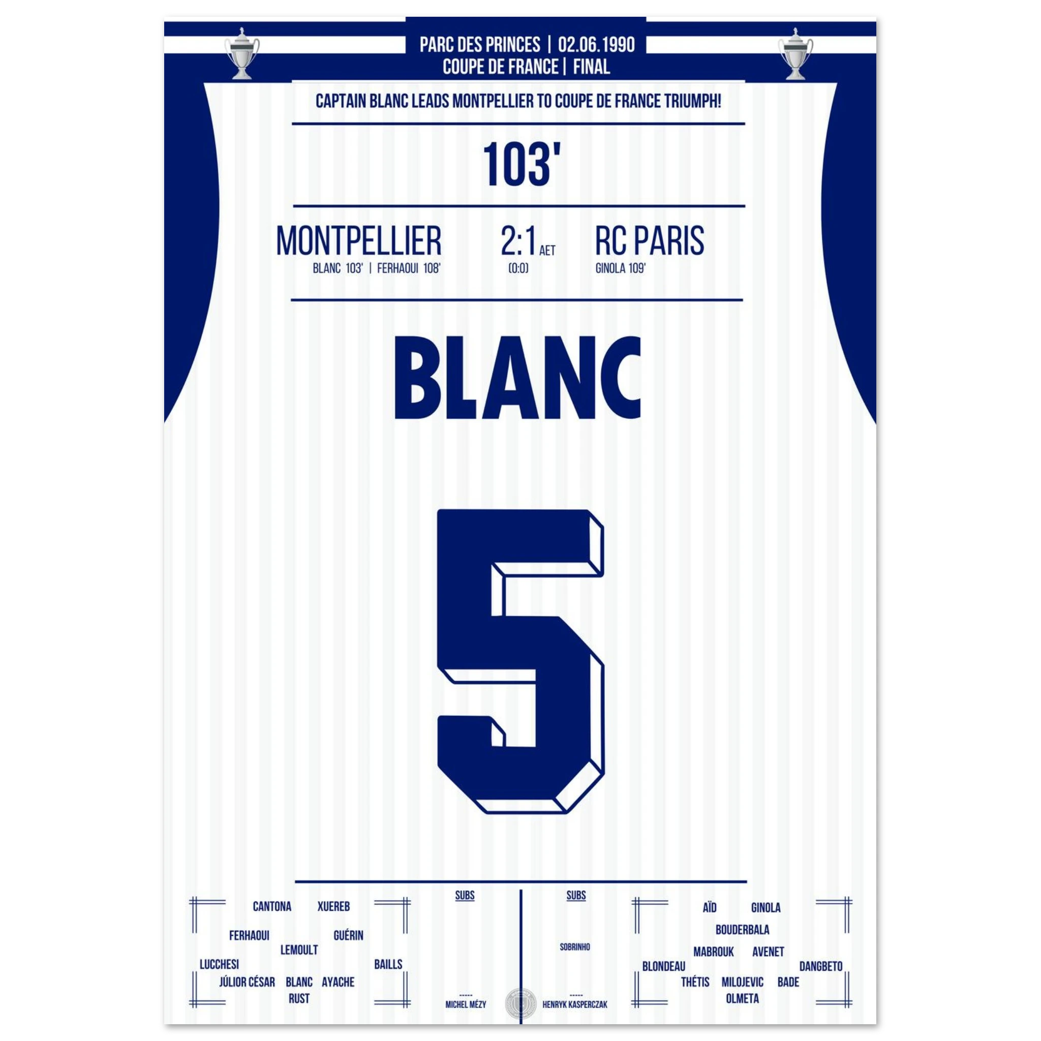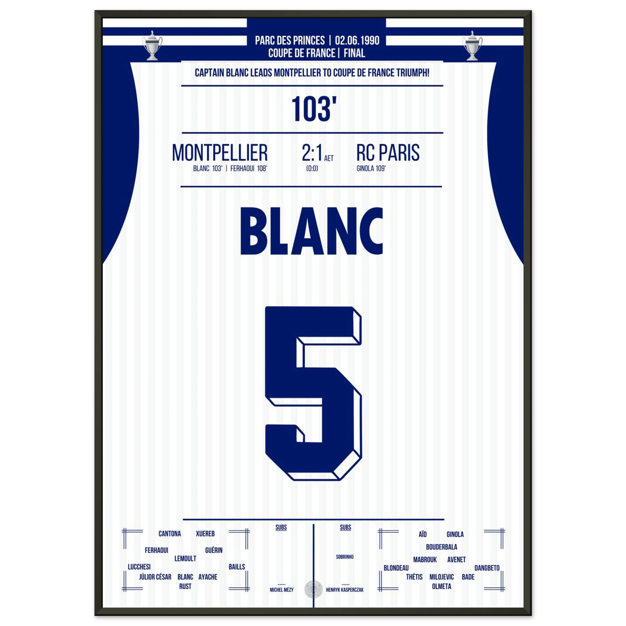 Ein packendes Pokalfinale, das erst in der Verlängerung entschieden wird: Laurent Blanc avanciert zum Helden des Abends, als er den entscheidenden Treffer erzielt und Montpellier den zweiten großen Titel der Vereinsgeschichte schenkt.