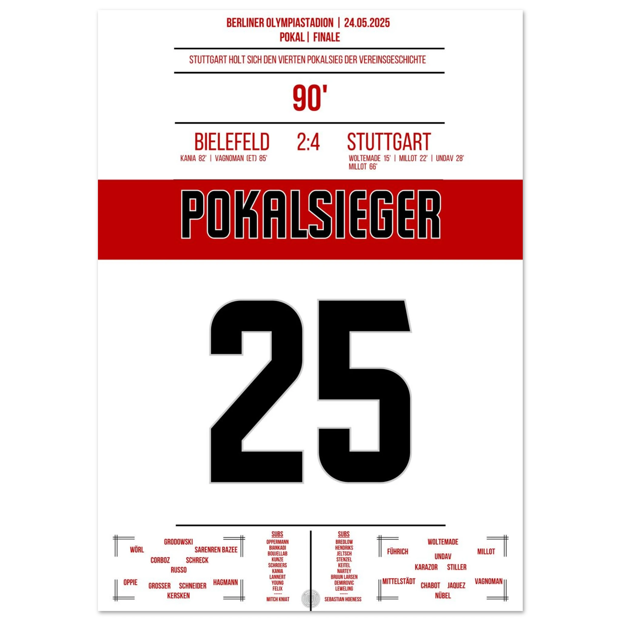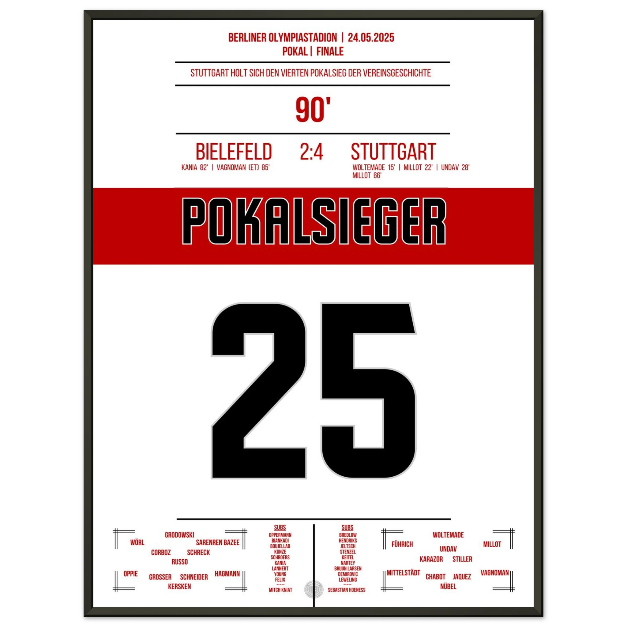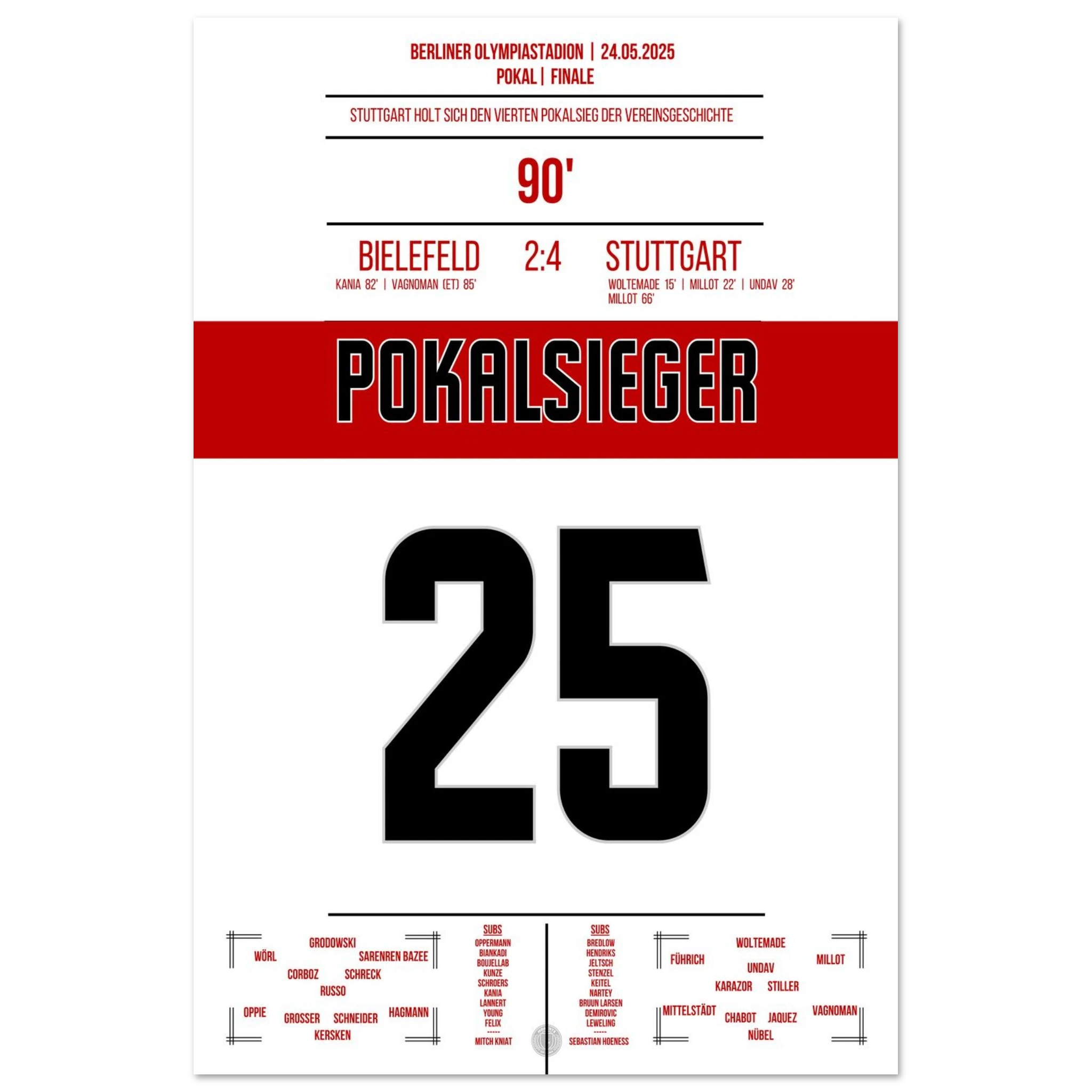 24. Mai 2025 – Bielefeld vs. Stuttgart 2:4: Stuttgart krönt eine überragende Saison mit dem Pokalsieg in Berlin! Mit Leidenschaft, Tempo und klarem Spiel bezwingen die Schwaben Bielefeld und holen den Pokal zurück nach Stuttgart. Unser Poster verewigt diesen rot-weißen Triumphmoment im Olympiastadion.