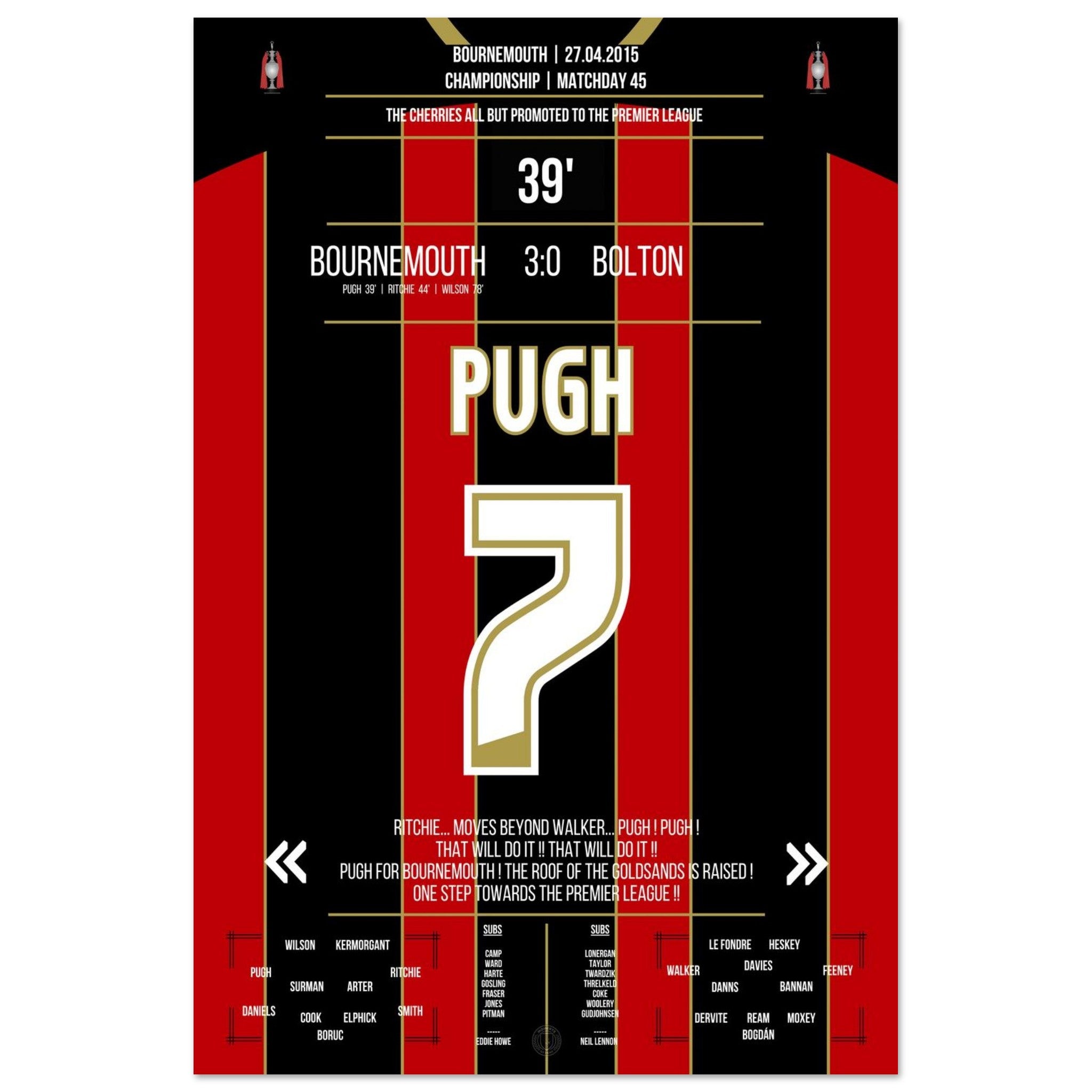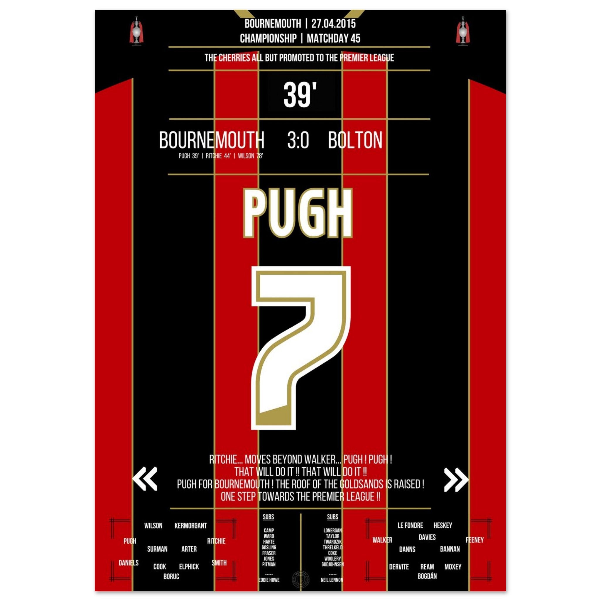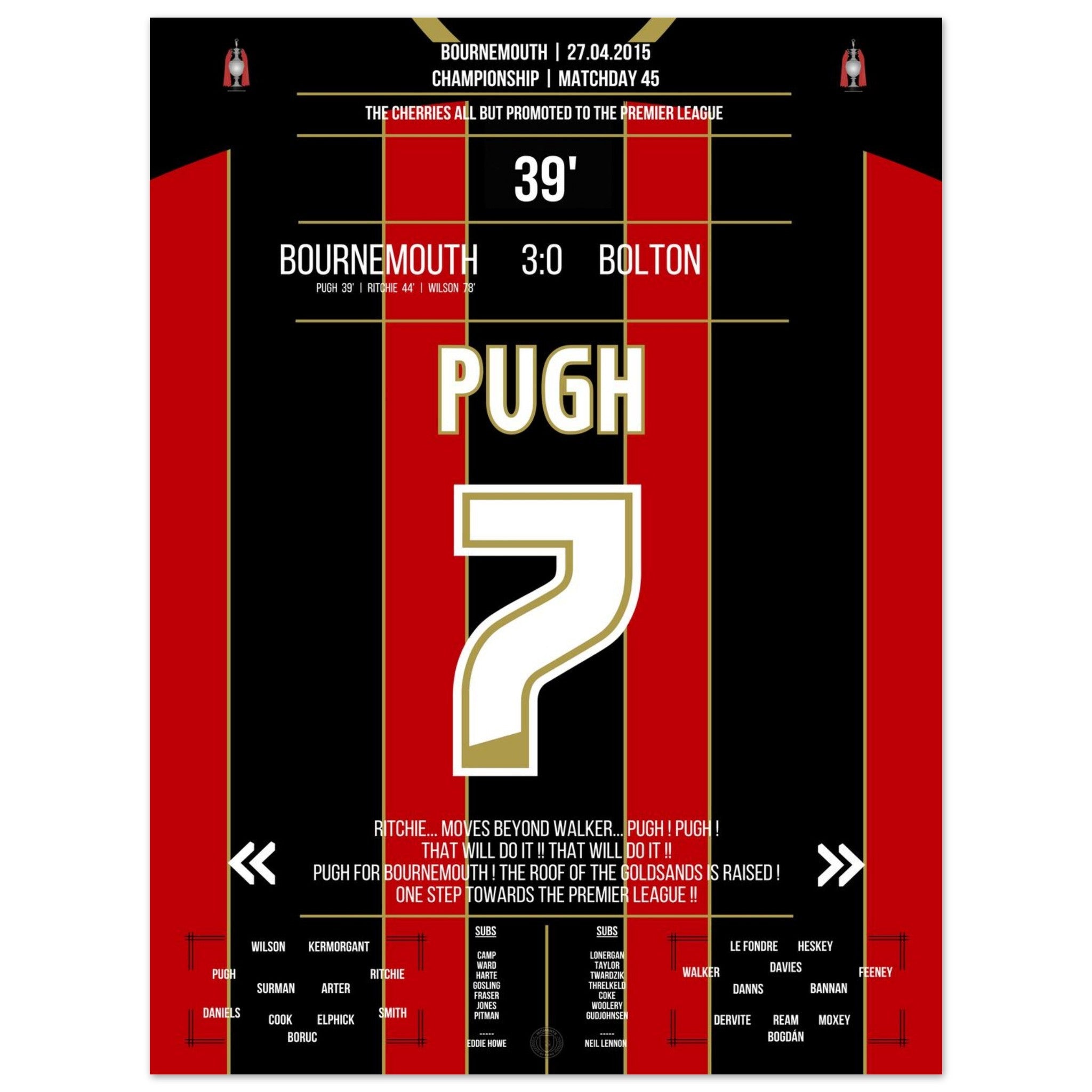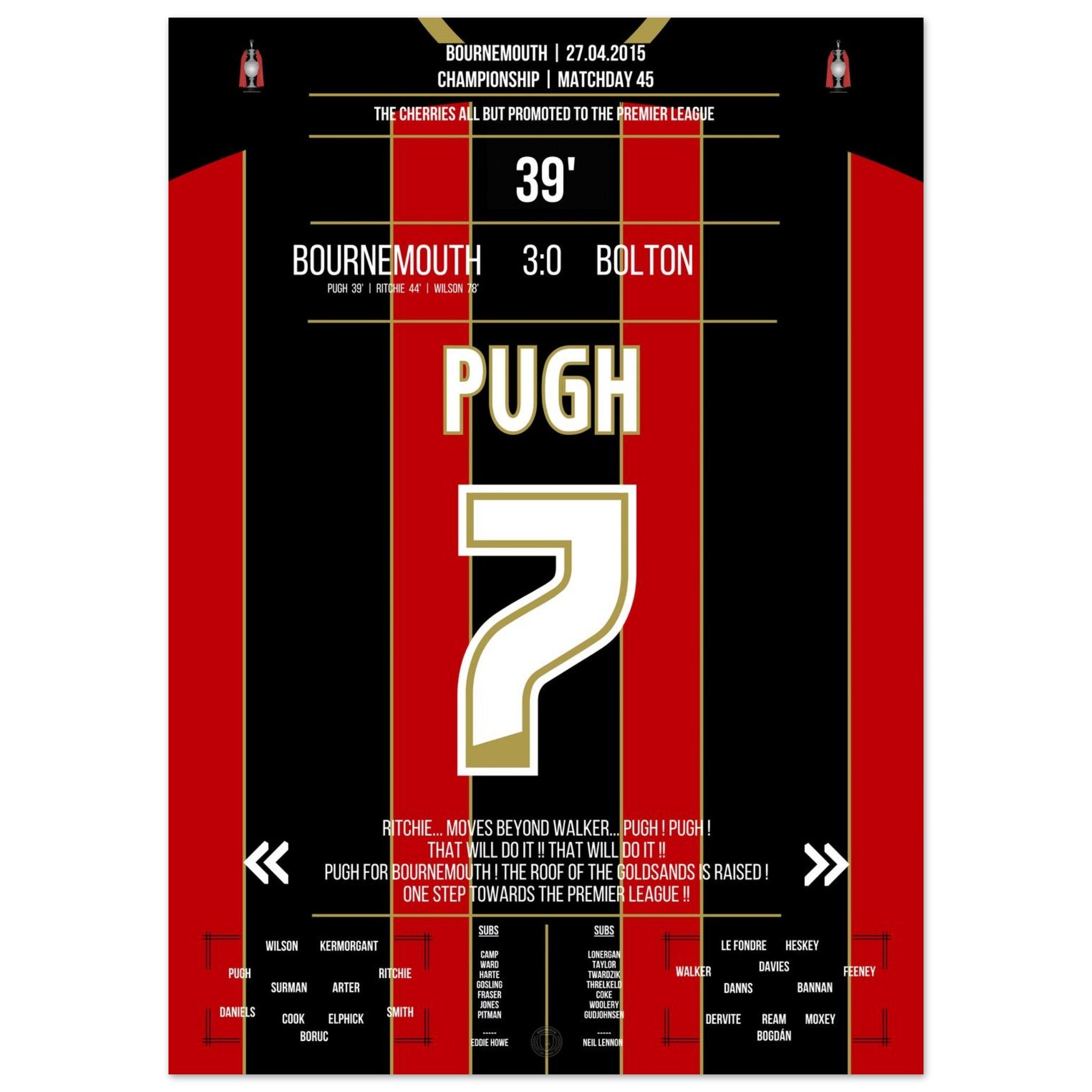 Pugh segna e il Bournemouth conquista quasi definitivamente la promozione in Premier League nel 2015.