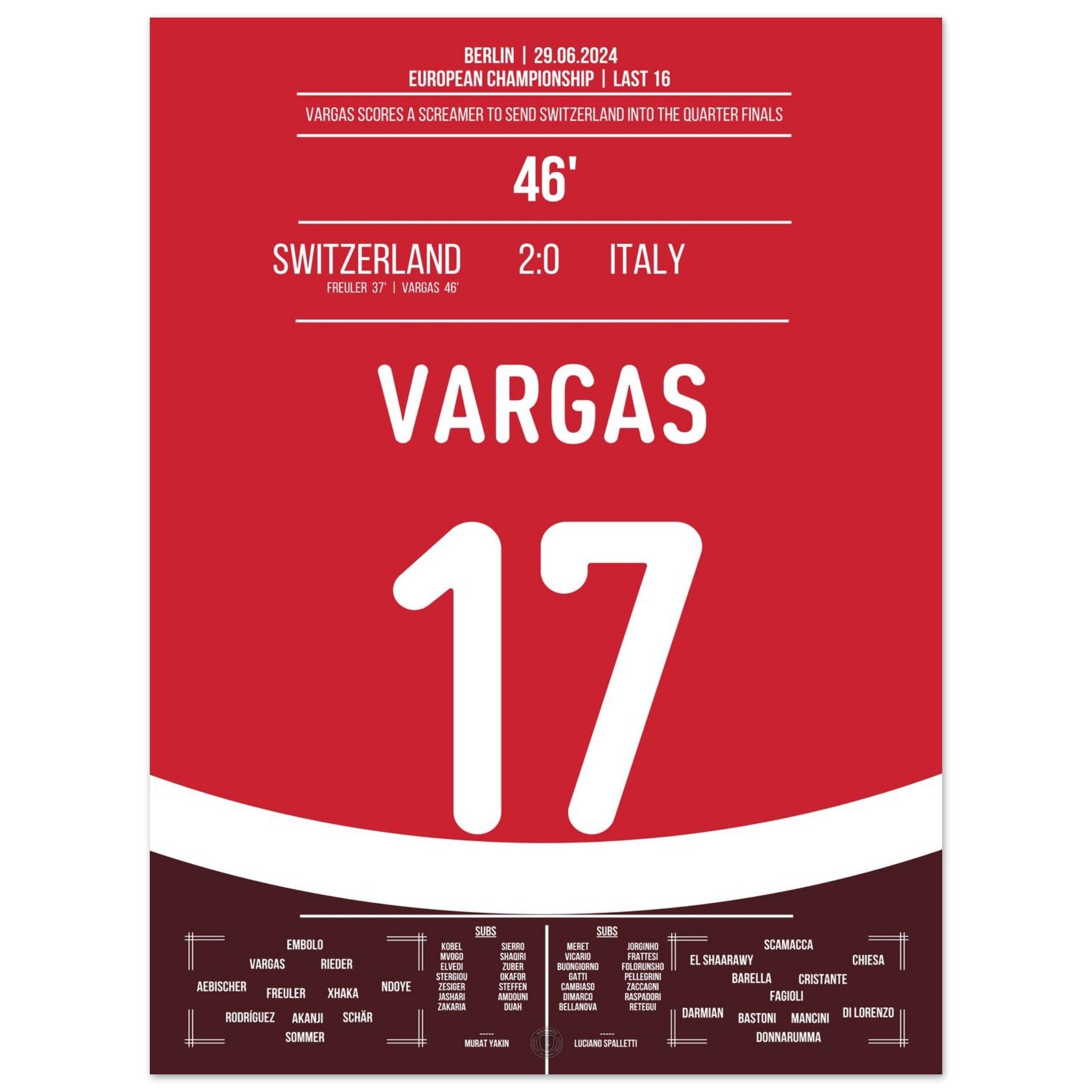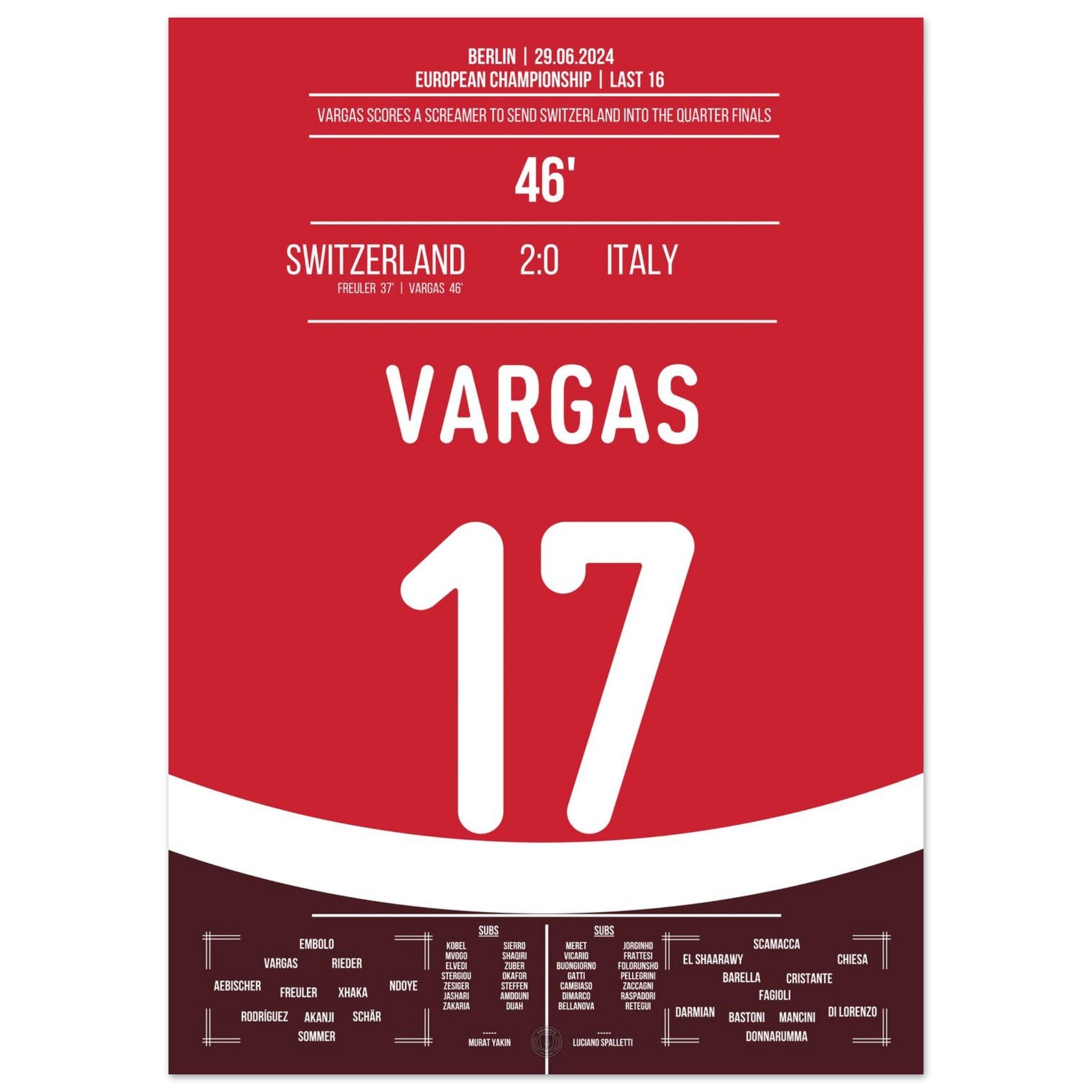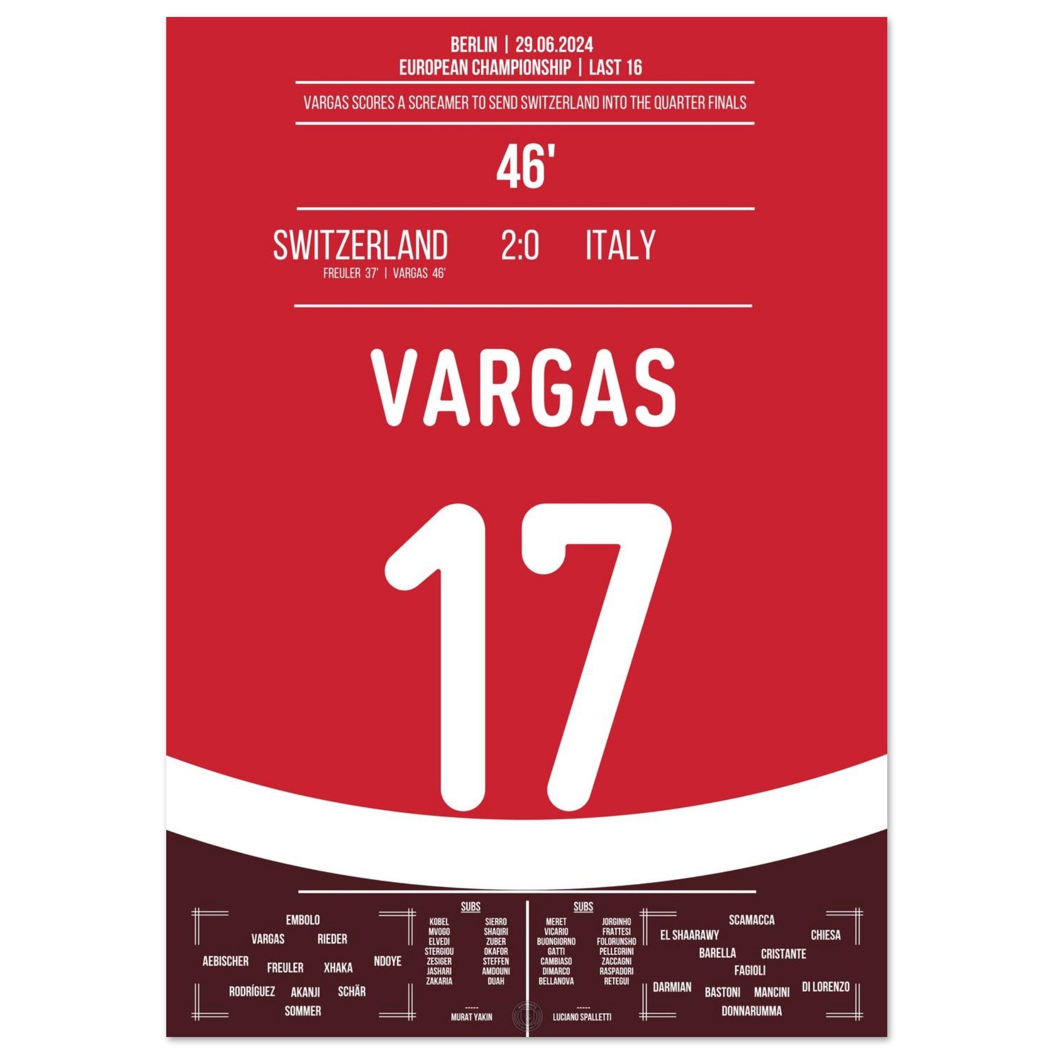 Vargas segna un gol da sogno e porta la Svizzera ai quarti di finale.