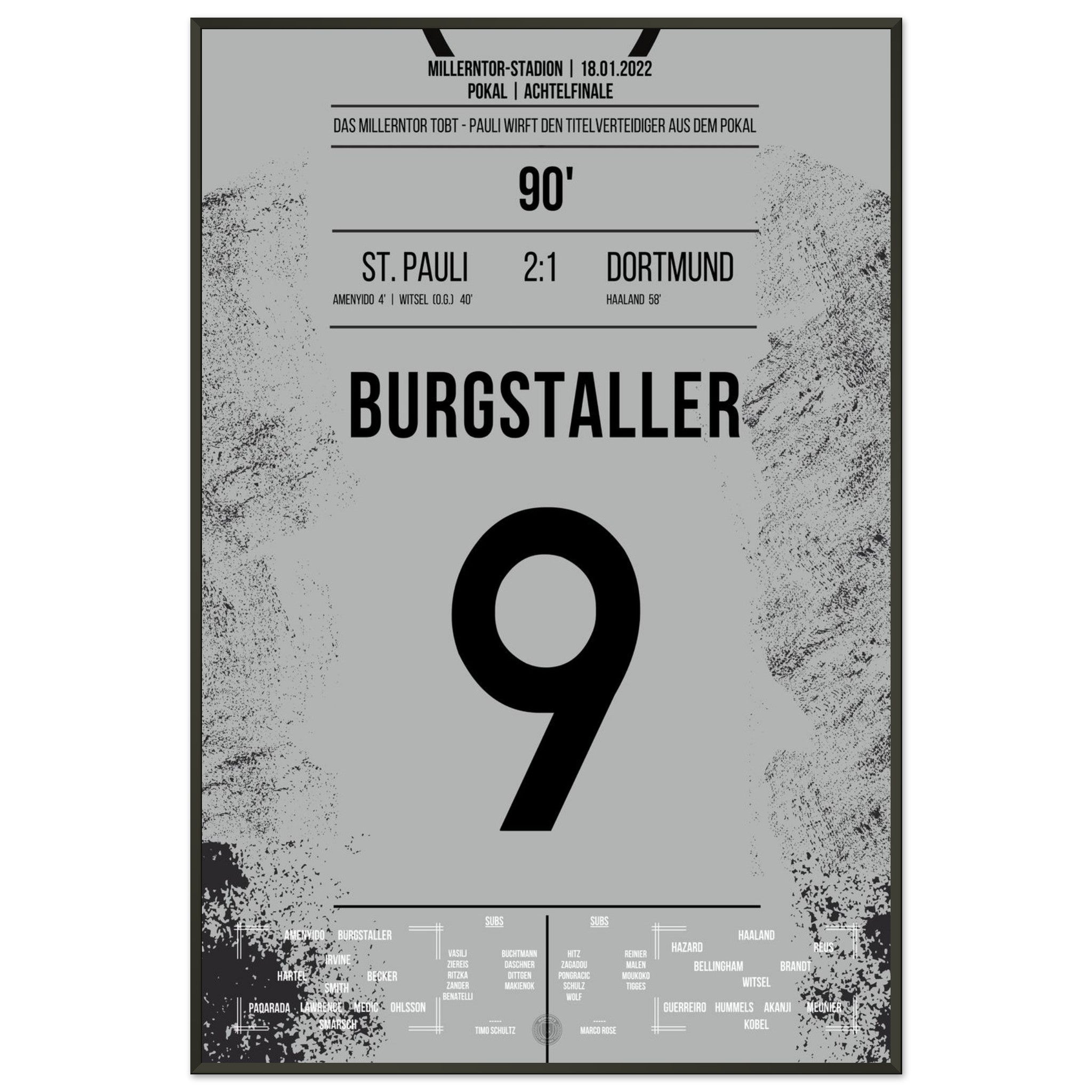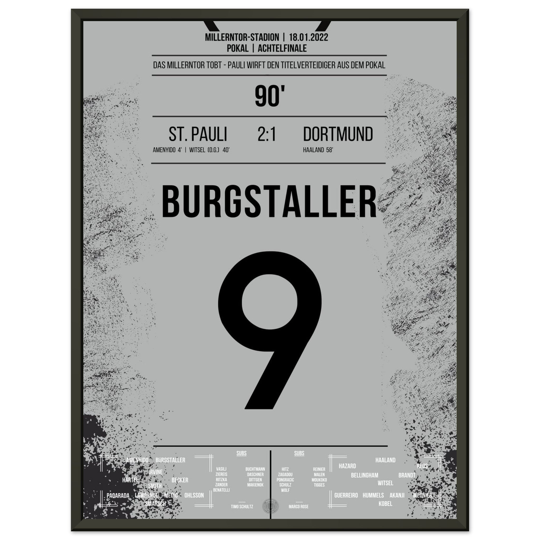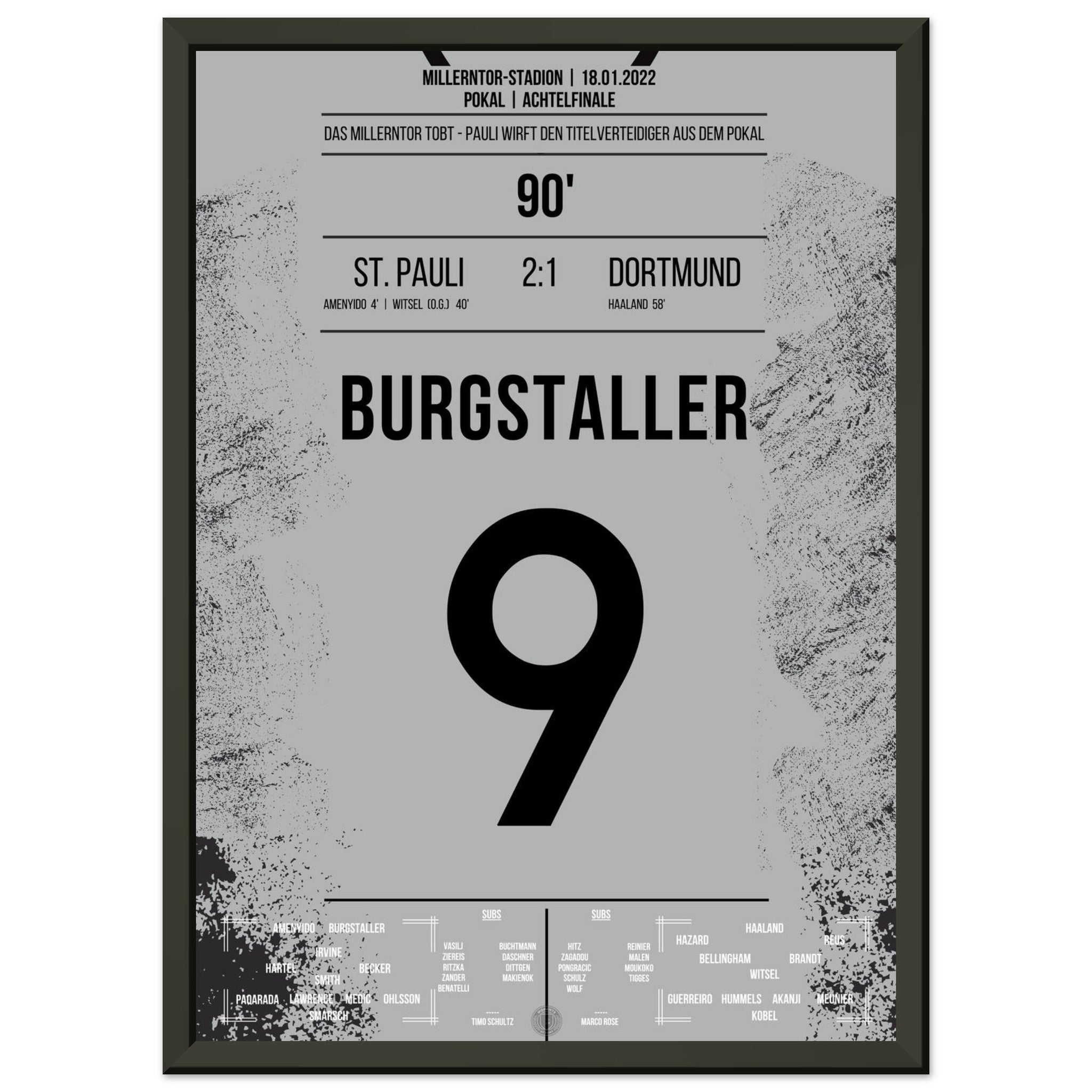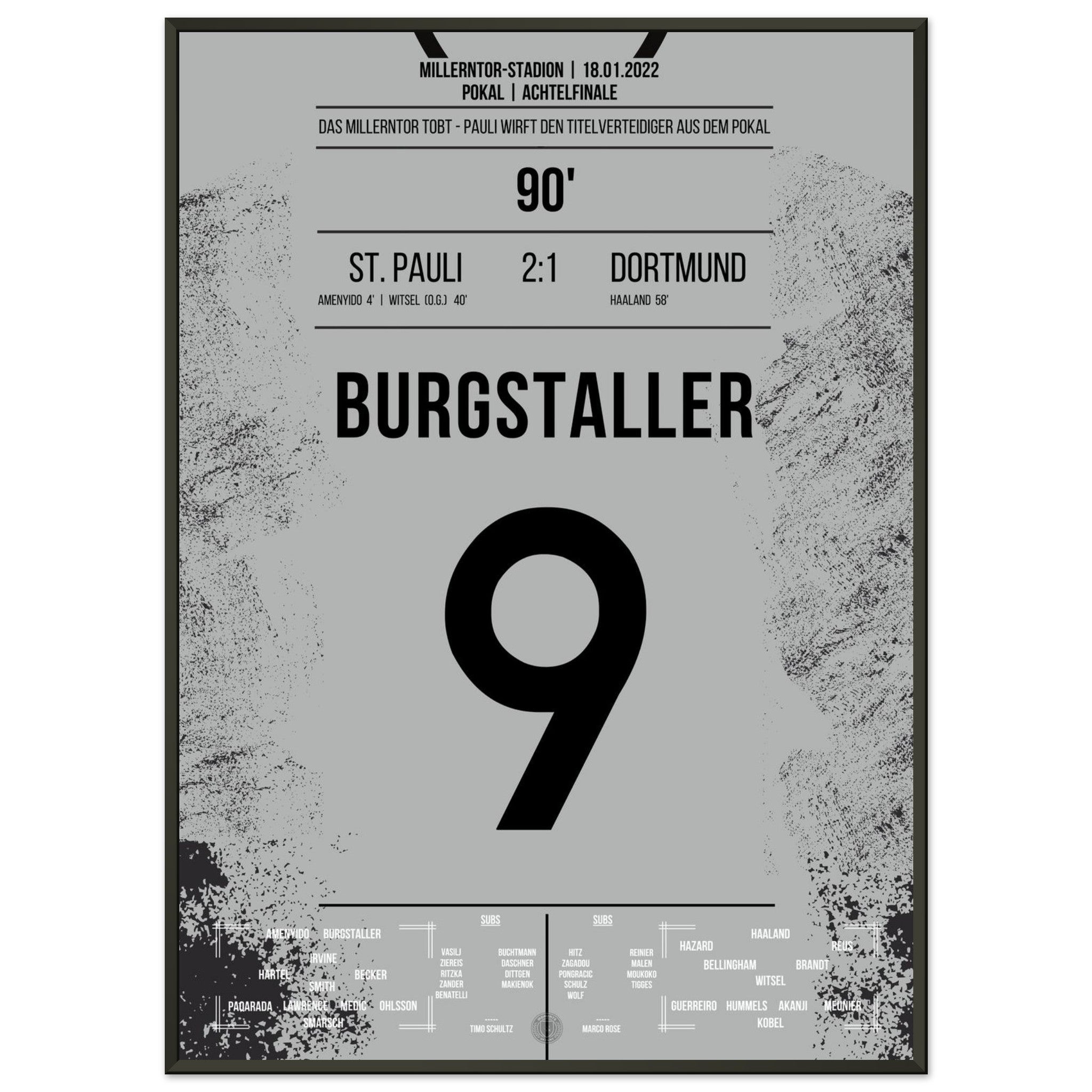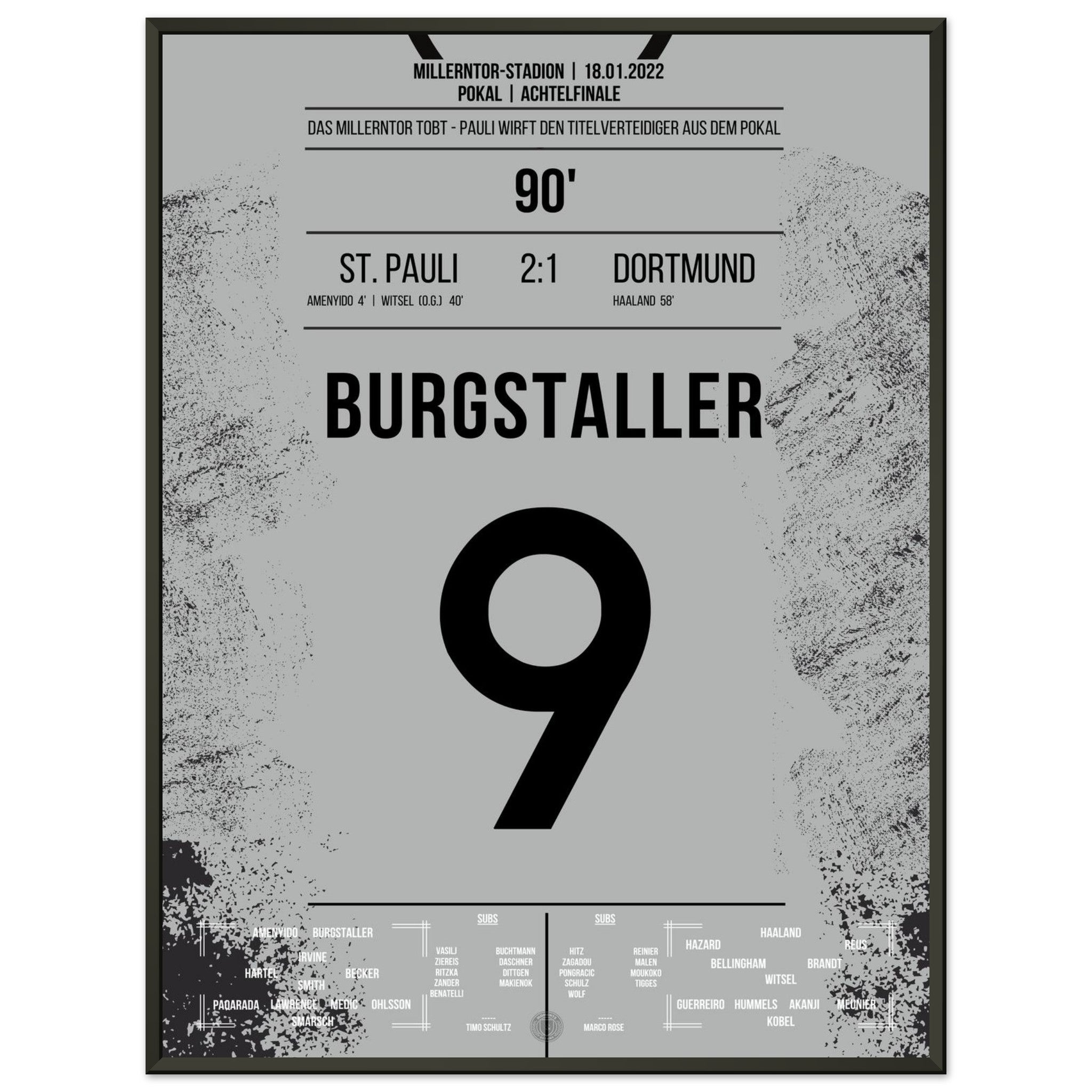 Ecco la nostra stampa premium di questo indimenticabile momento calcistico, per un'esperienza da tifoso indimenticabile. Stampata su carta premium pesante e semilucida, questa opera d'arte risplende con colori intensi e una delicata lucentezza che mette in risalto ogni dettaglio.
