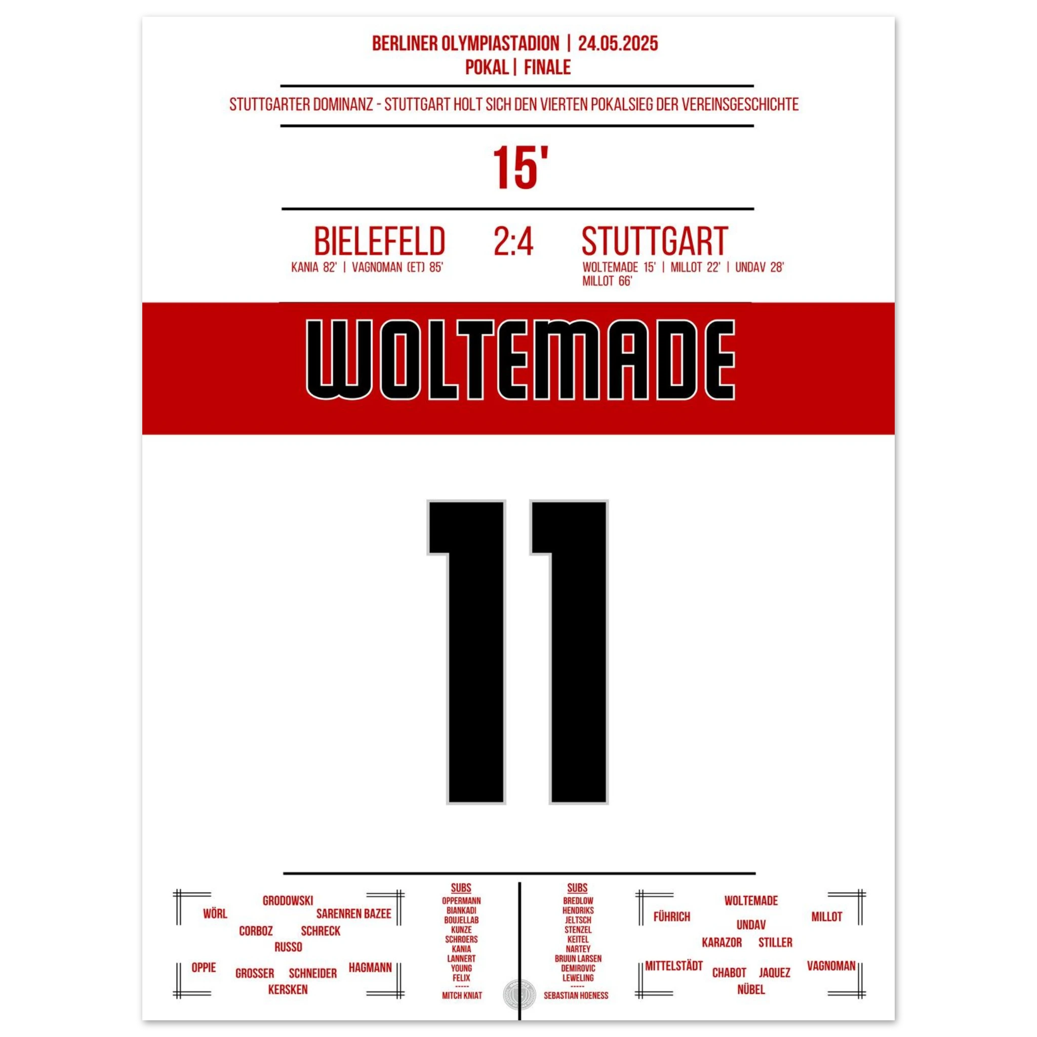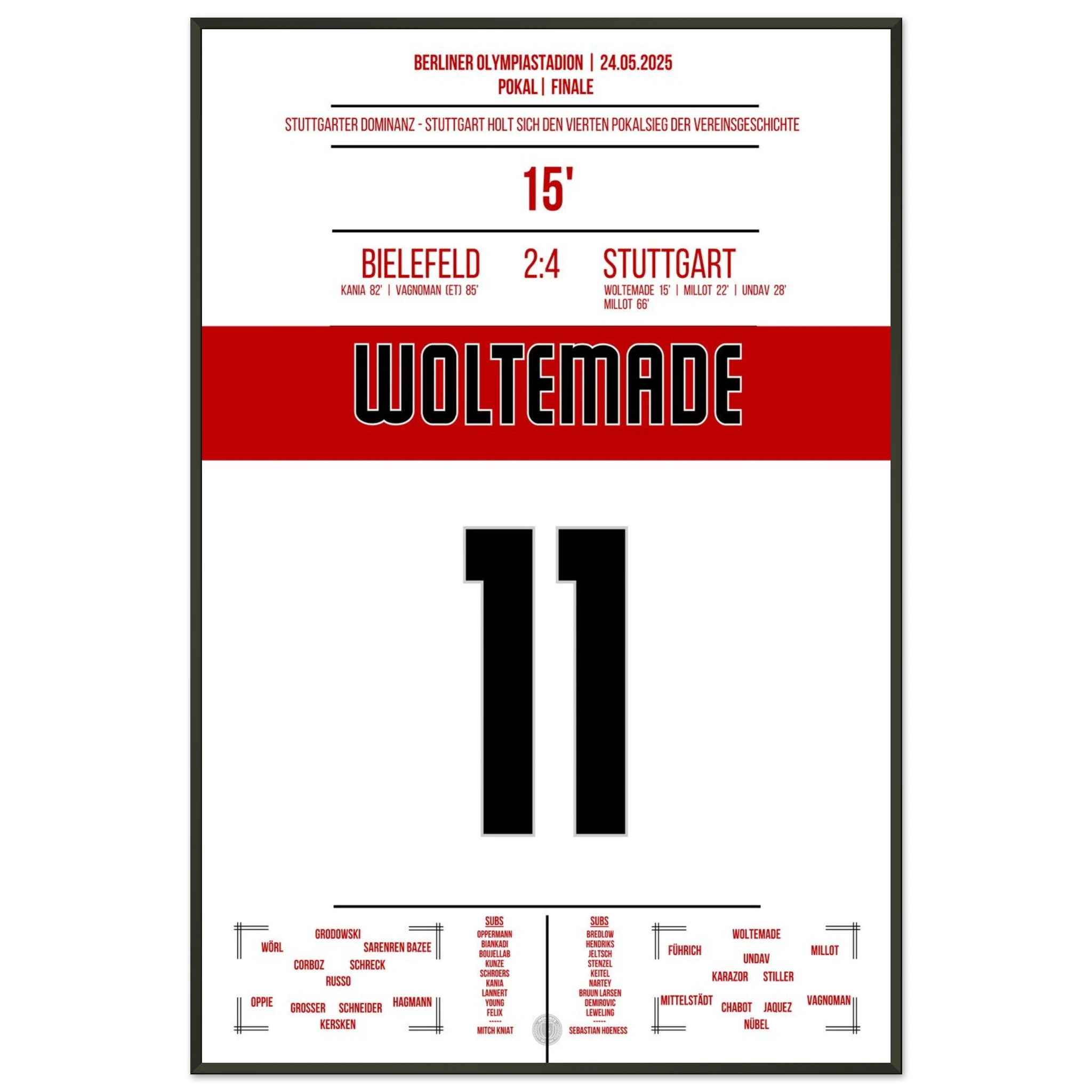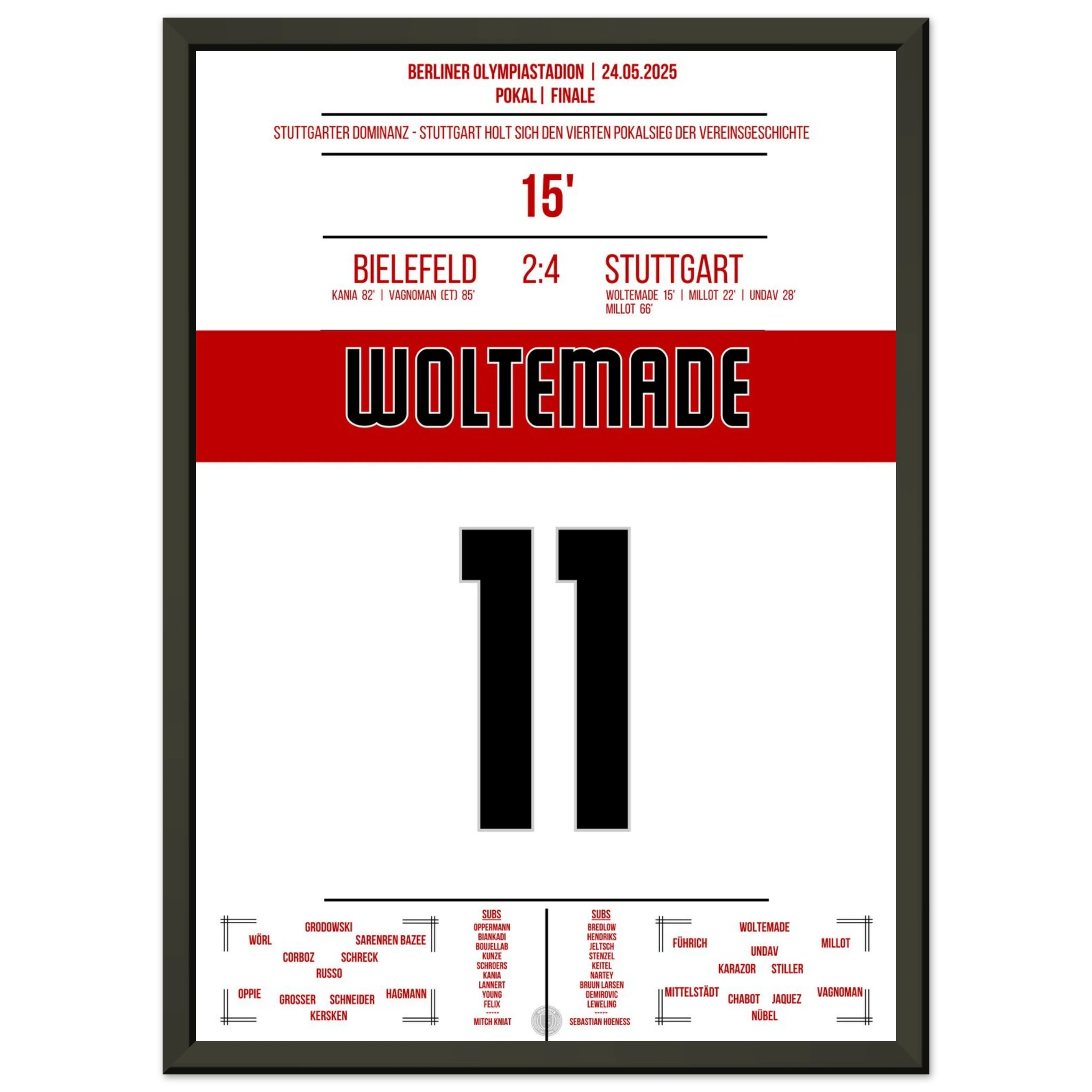 24. Mai 2025 – Bielefeld vs. Stuttgart 2:4: Stuttgart krönt eine überragende Saison mit dem Pokalsieg in Berlin! Mit Leidenschaft, Tempo und klarem Spiel bezwingen die Schwaben Bielefeld und holen den Pokal zurück nach Stuttgart. Unser Poster verewigt diesen rot-weißen Triumphmoment im Olympiastadion.