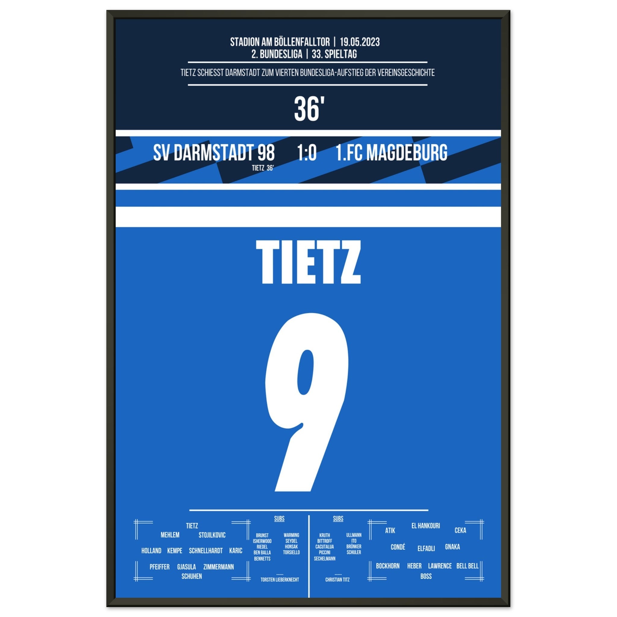 28. Mai 2023 – Darmstadt vs. Magdeburg 1:0: Phillip Tietz trifft am letzten Spieltag der Saison und bringt mit seinem Tor den Aufstieg in die Bundesliga endgültig unter Dach und Fach. Ein perfekter Abschluss einer starken Saison. Unser Poster feiert diesen Aufstiegsmoment in voller Pracht.
