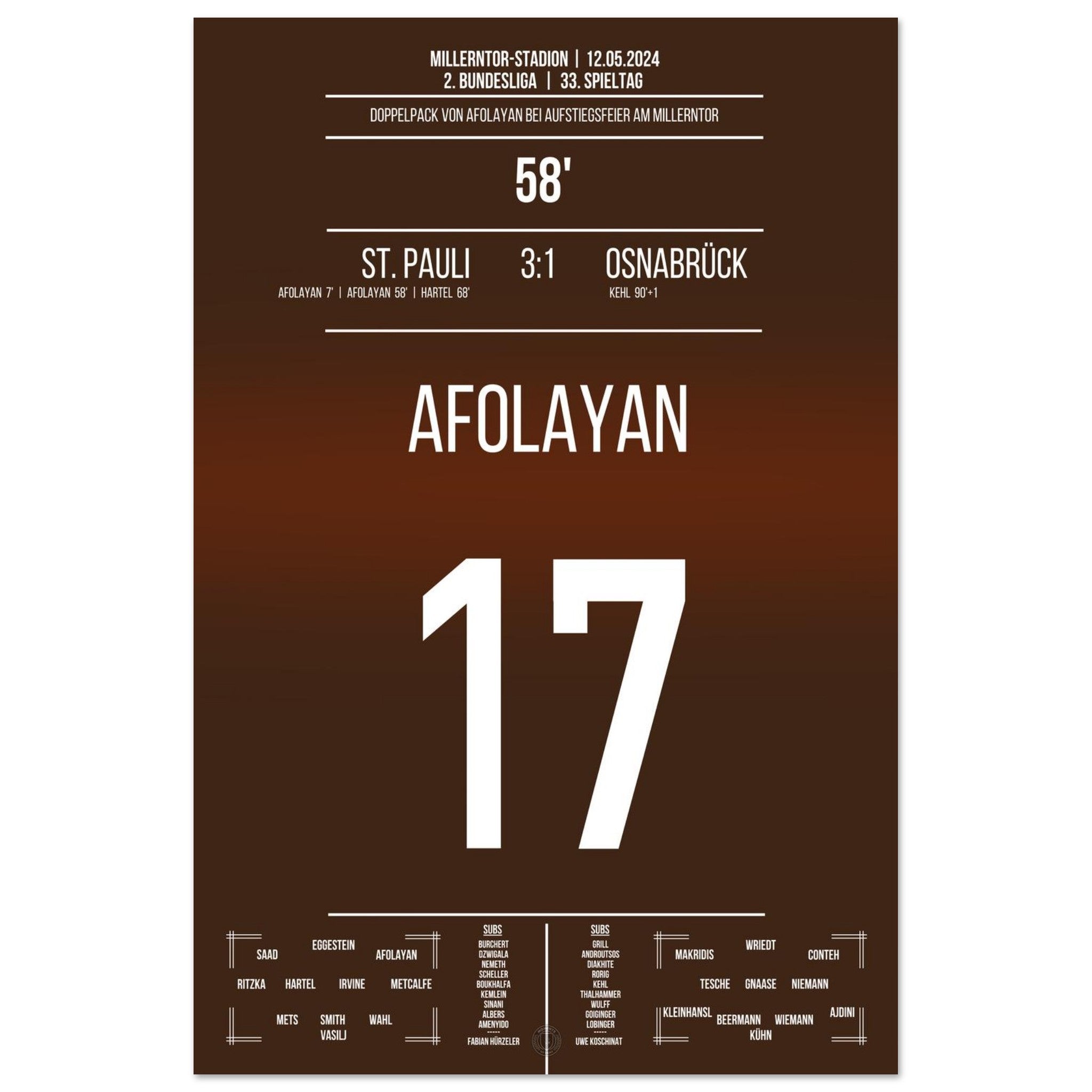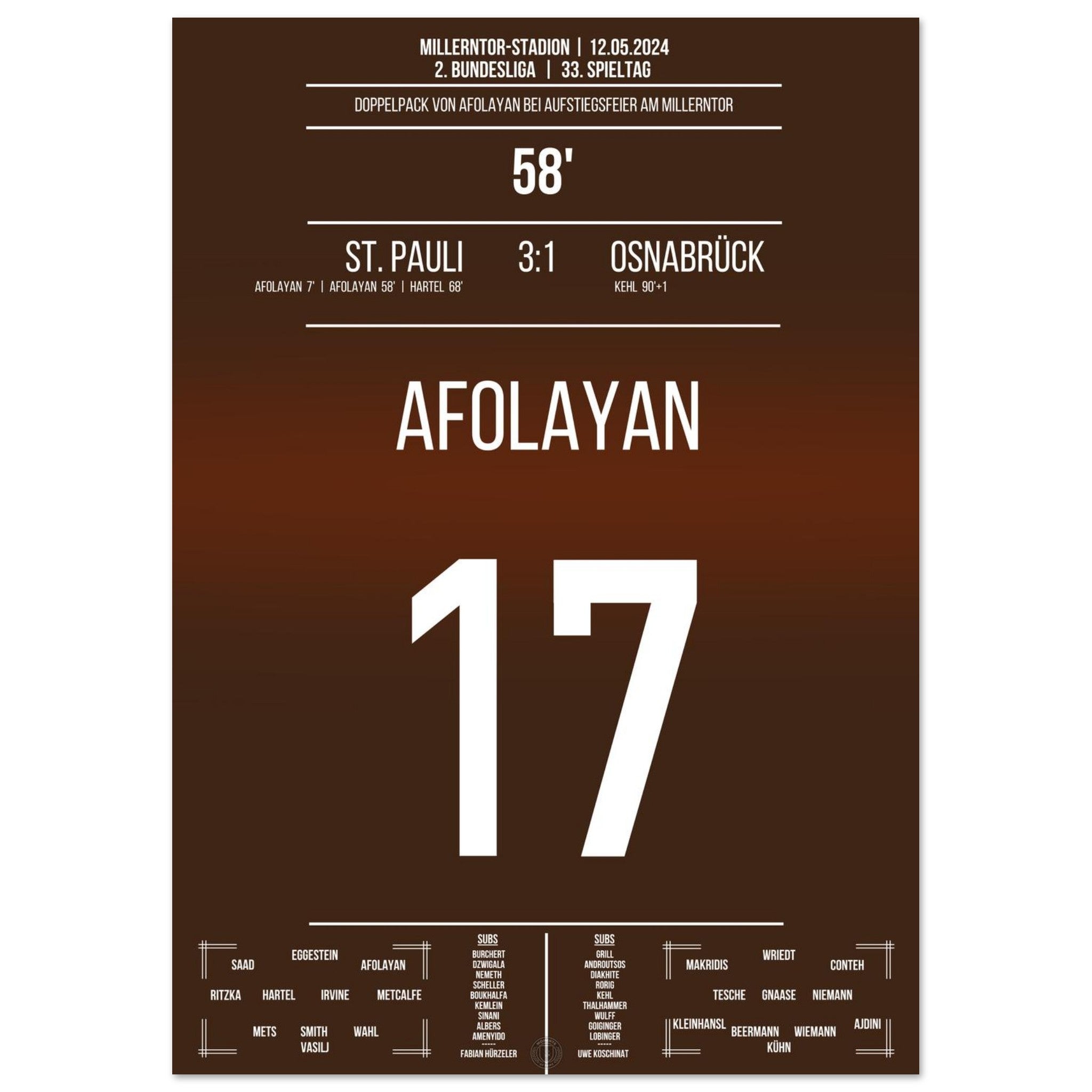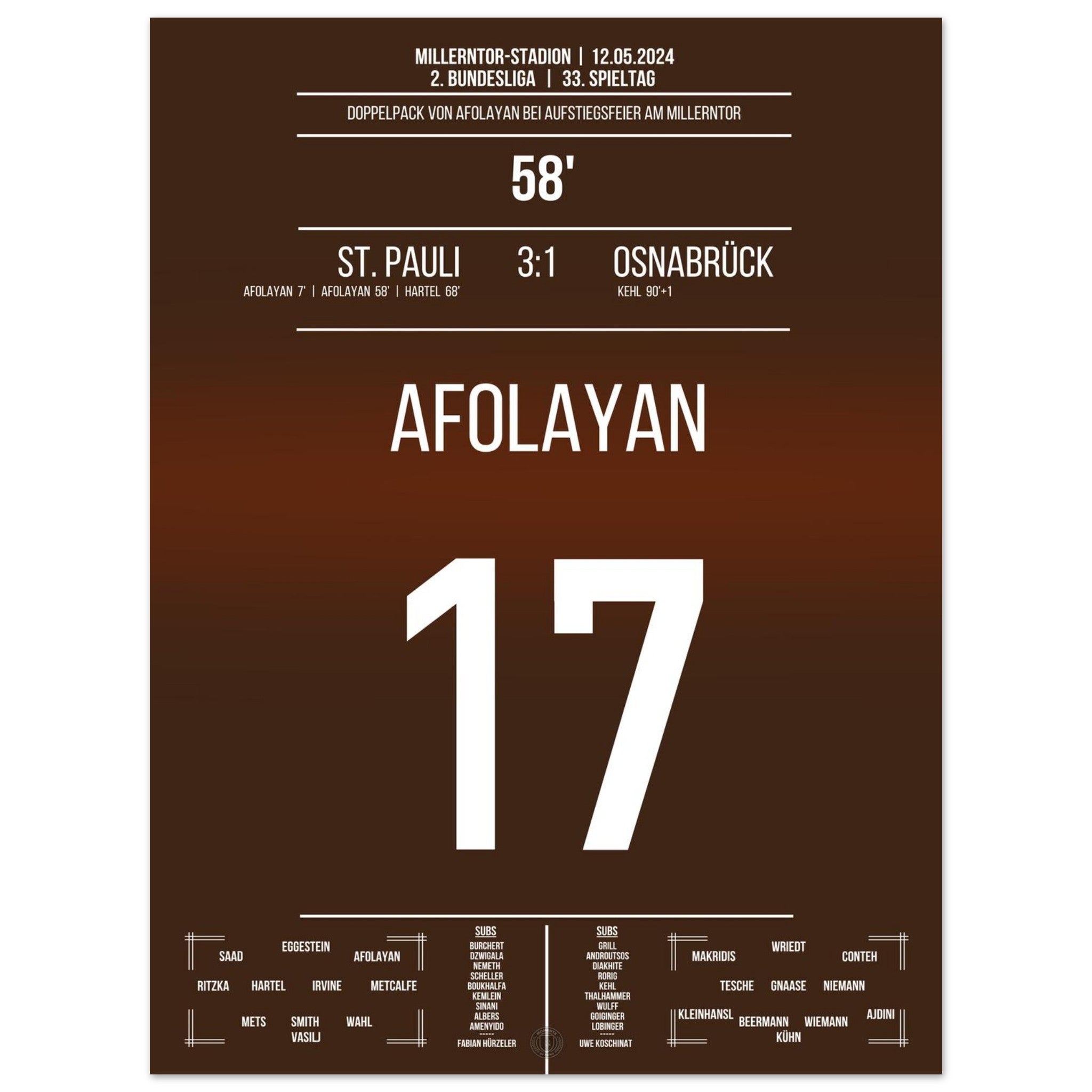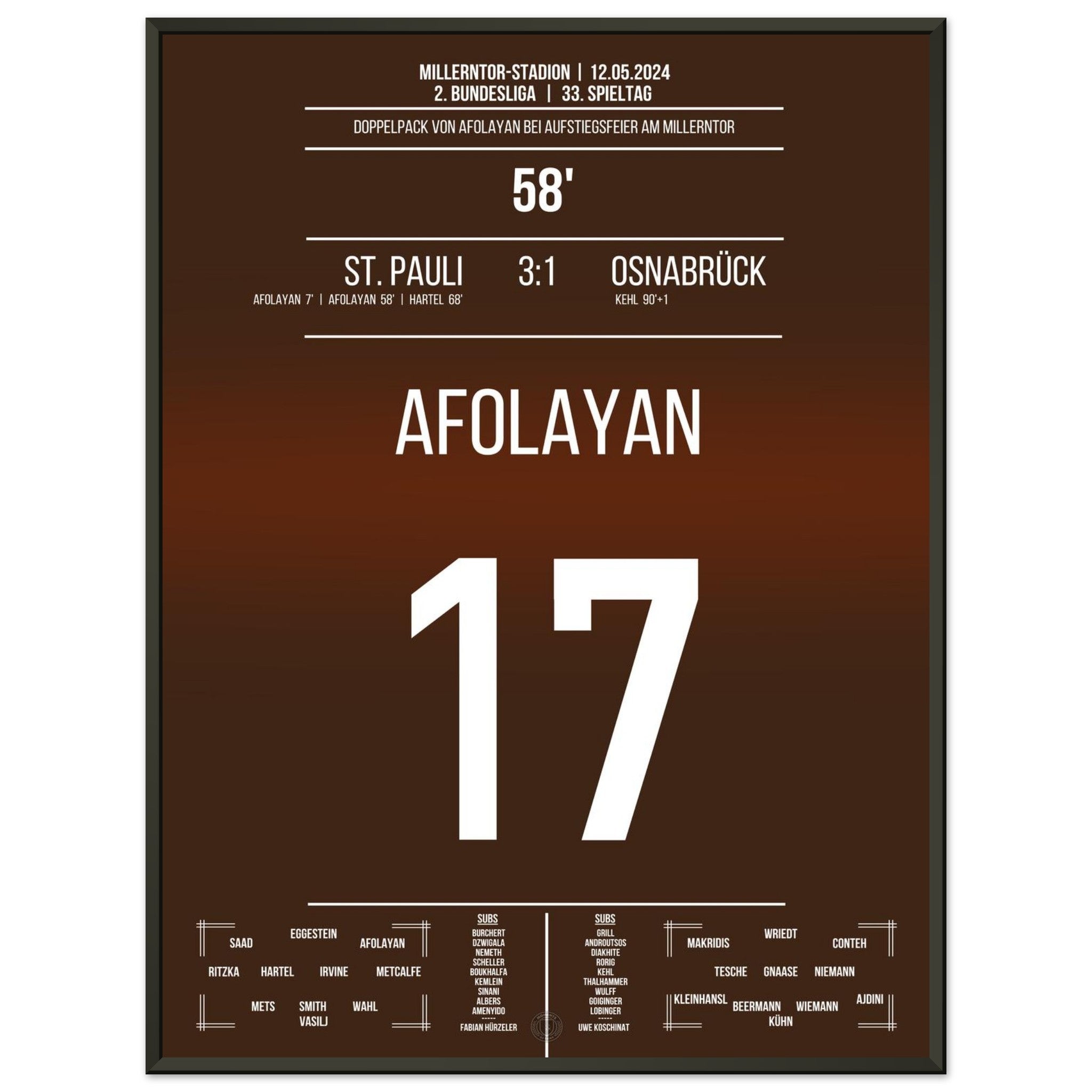 12. Mai 2024 – St. Pauli vs. Osnabrück 3:1: In einem packenden Saisonfinale trifft Oladapo Afolayan für St. Pauli und bringt die Kiezkicker endgültig auf Aufstiegskurs. Ein Tor, das den Millerntor beben lässt. Unser Poster hält diesen entscheidenden Afolayan-Moment in Braun-Weiß fest.