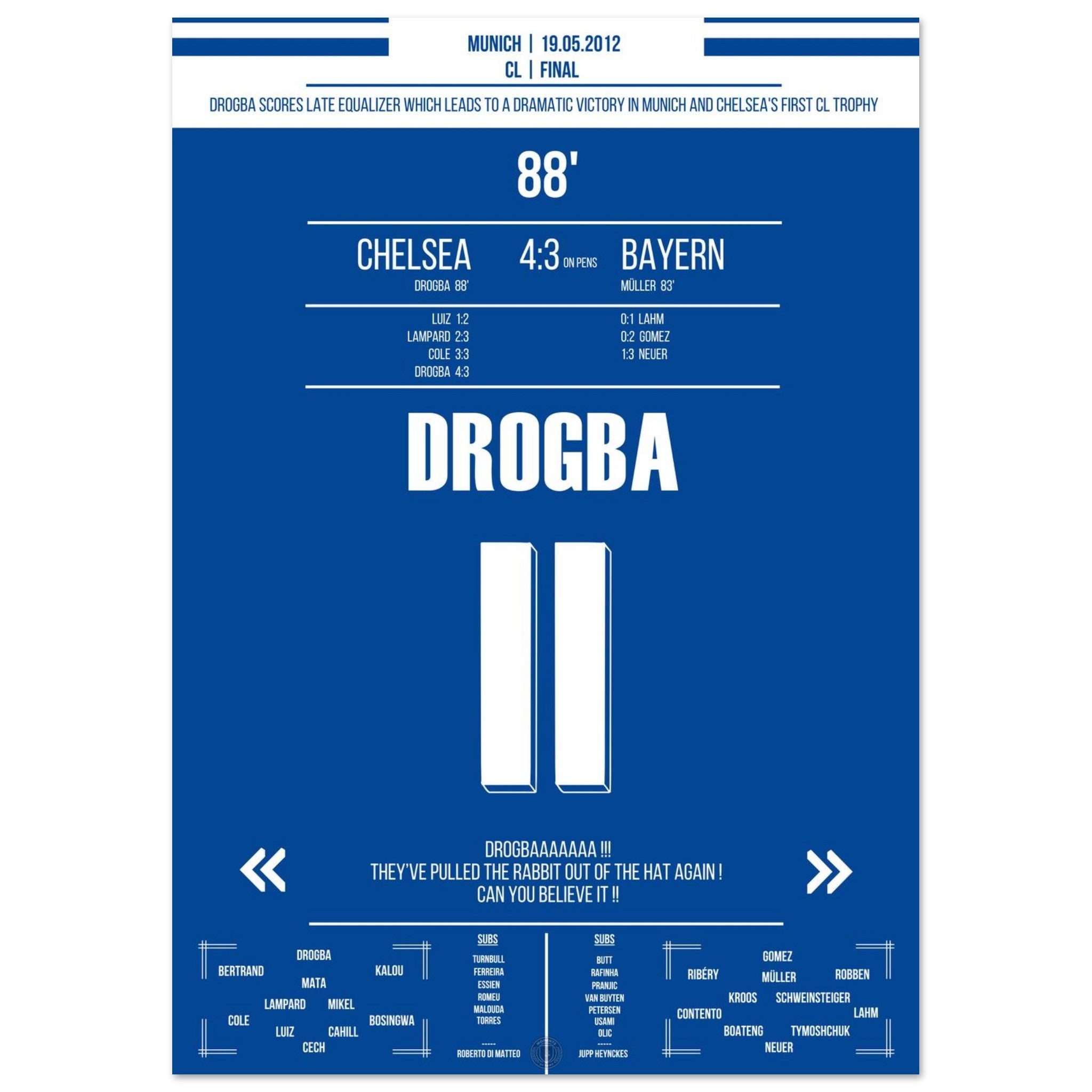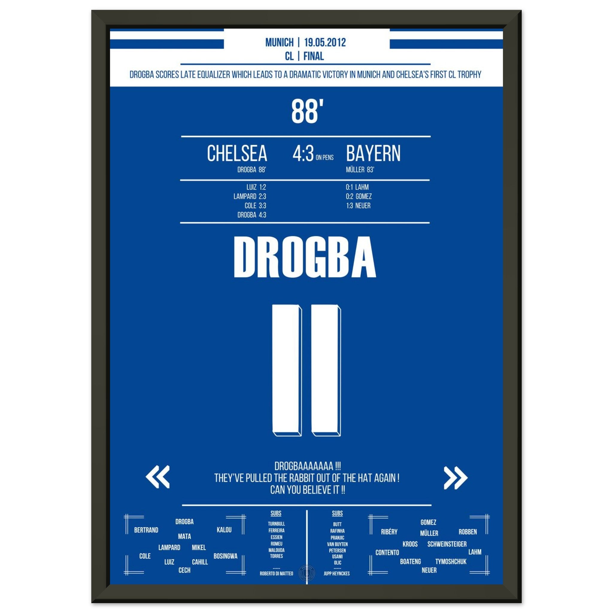 Unser Poster fängt diesen unsterblichen Moment ein – Drogba, pure Willenskraft und die Geburt einer Legende in Blau.