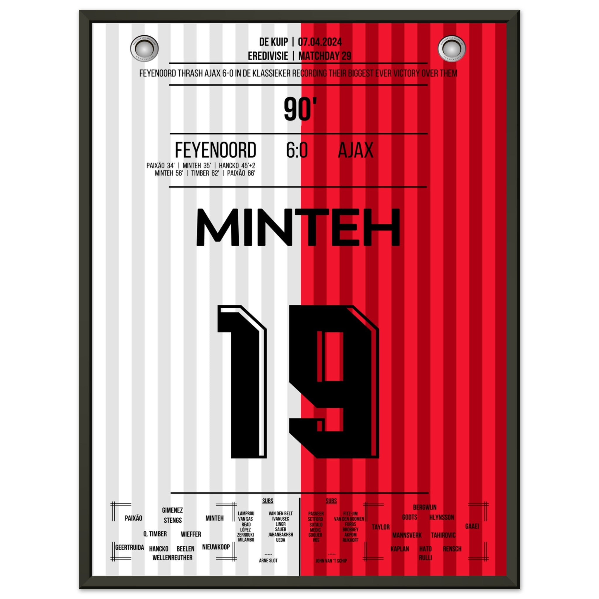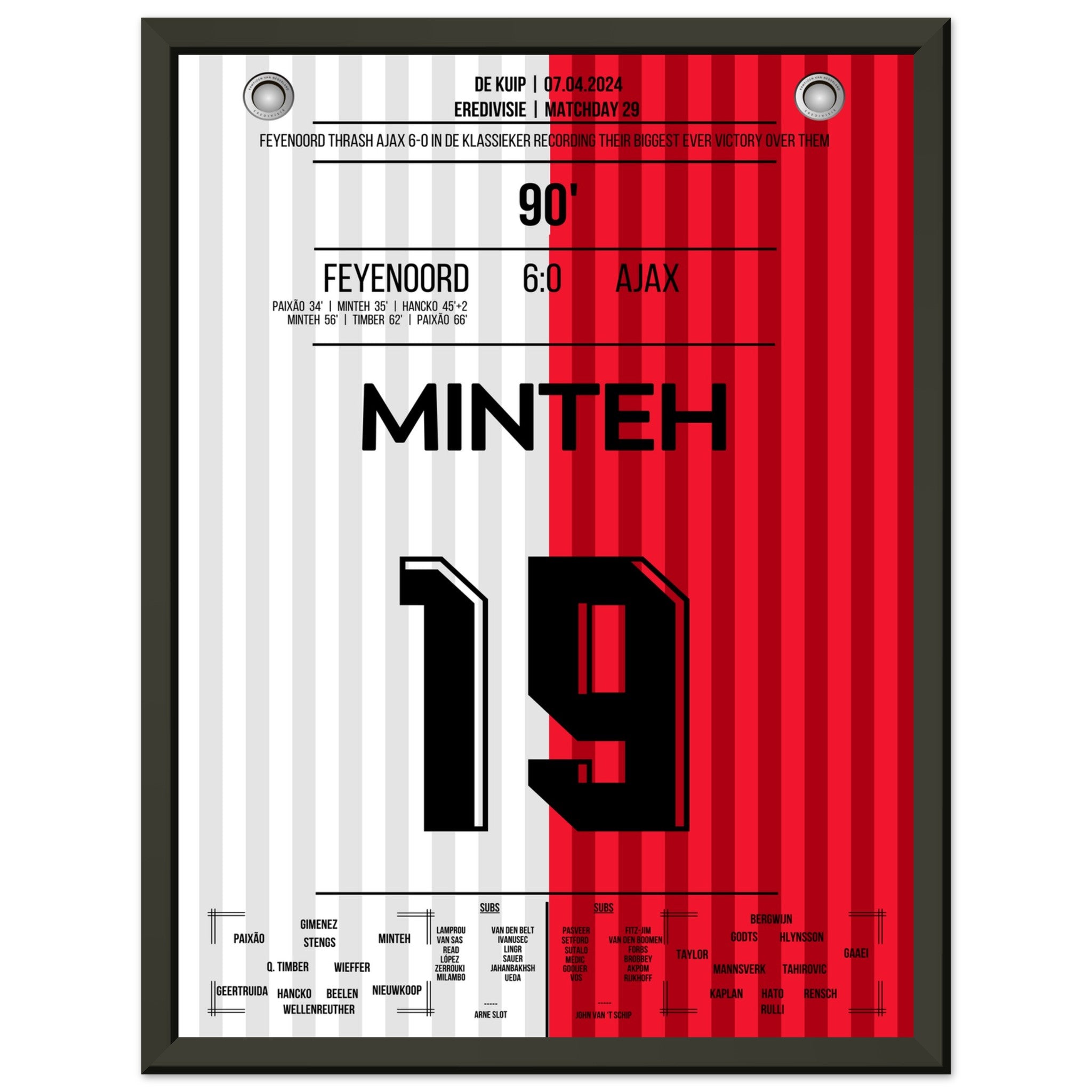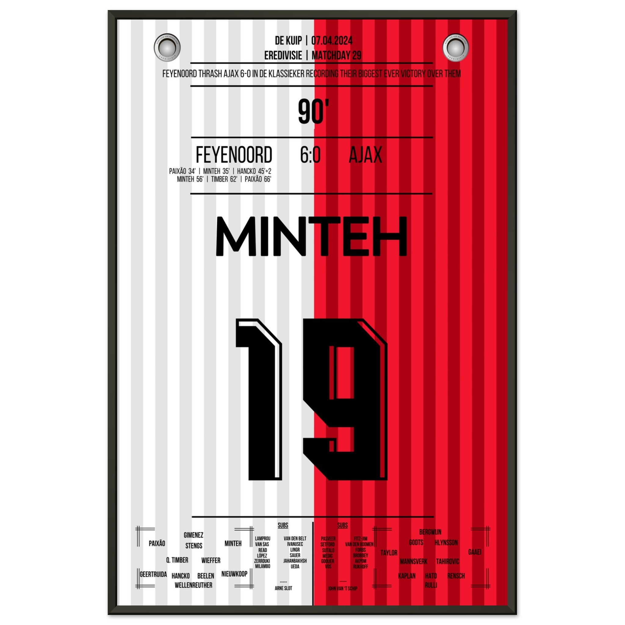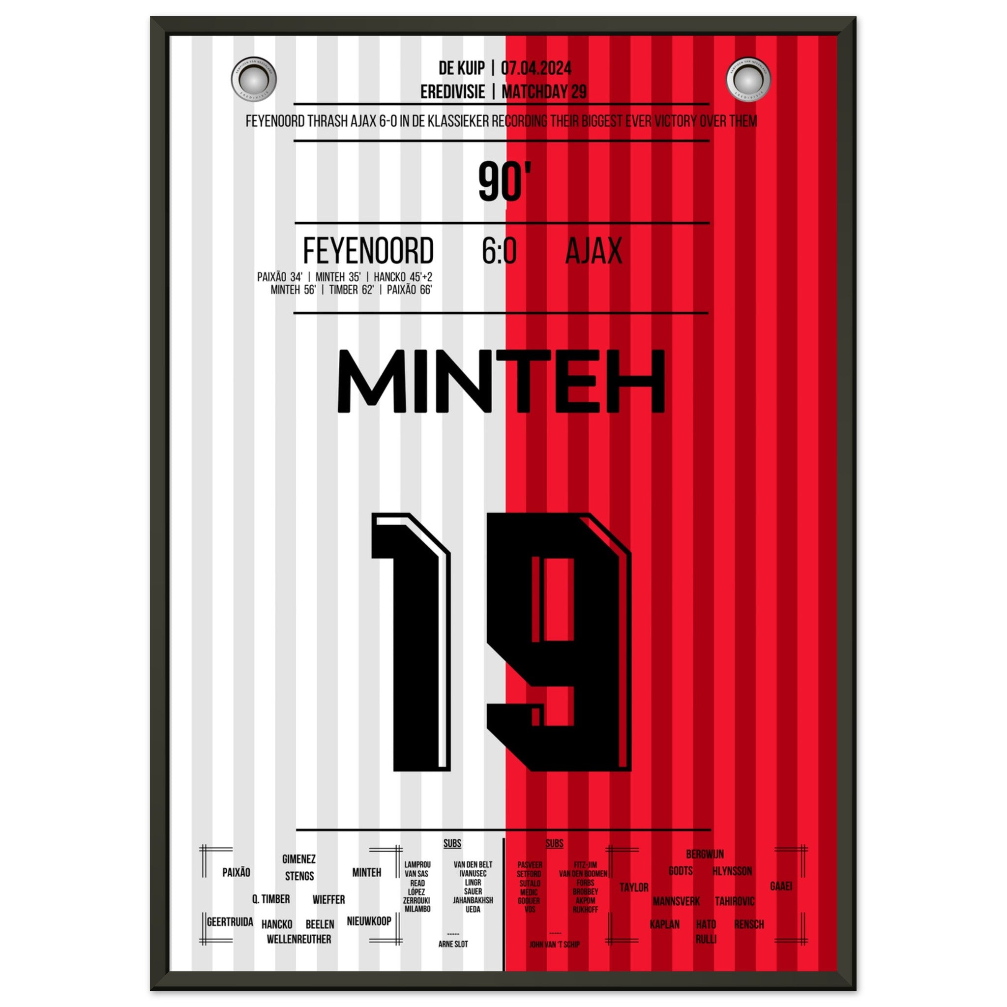 Sie können sicher sein, dass jedes Poster und jeder Rahmen in einer robusten Verpackung versandt wird, damit es in tadellosem Zustand ankommt. Es ist die perfekte Ergänzung für die Sammlung eines jeden Fußballfans oder das perfekte Geschenk für den eingefleischten Fußball-Fan ihres Freundes- oder Familienkreises.