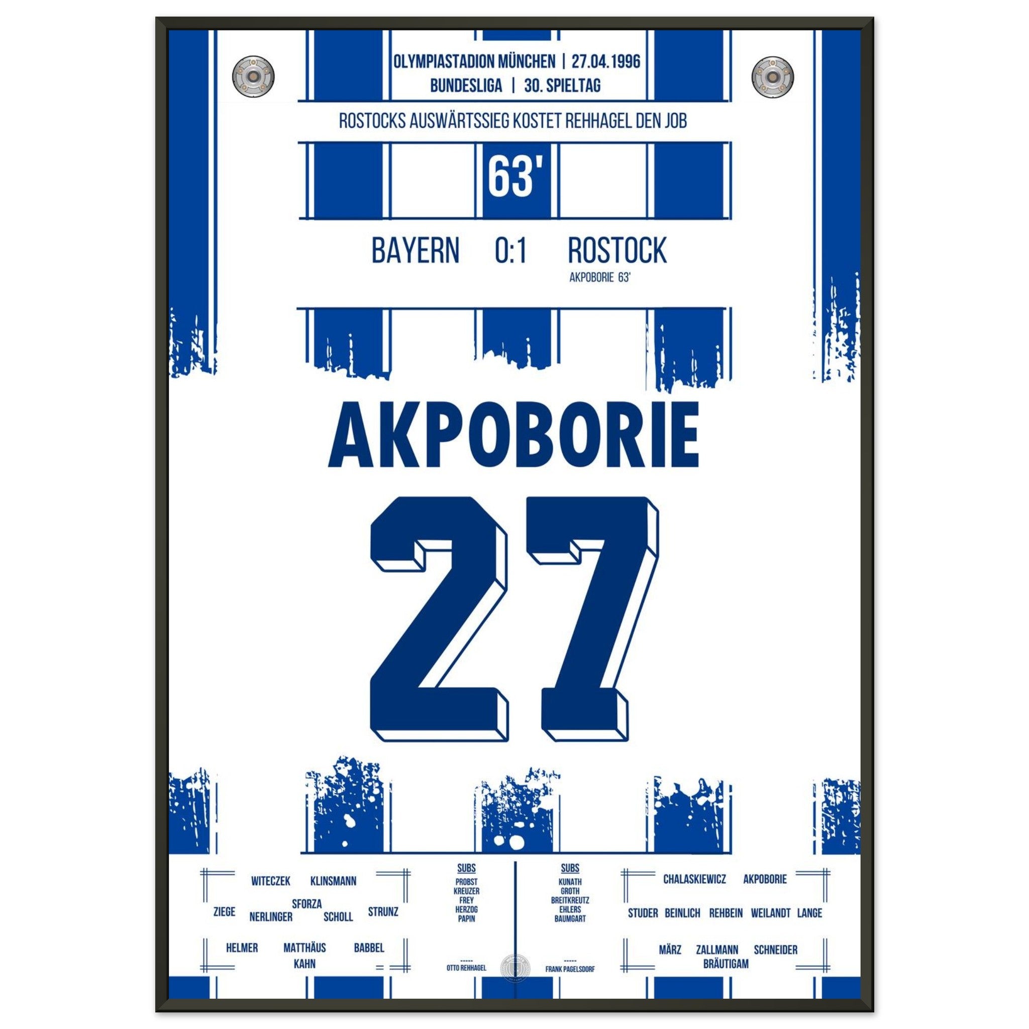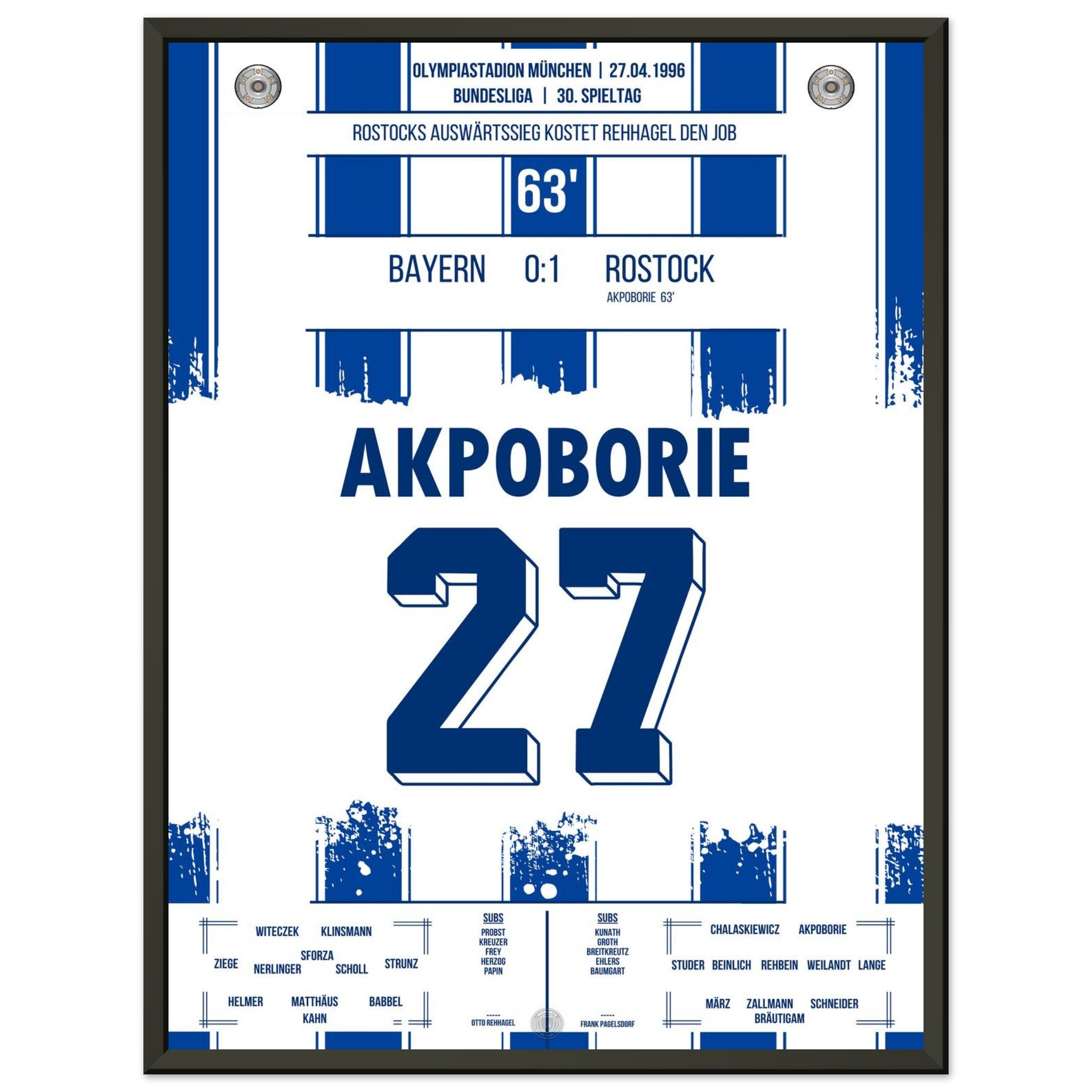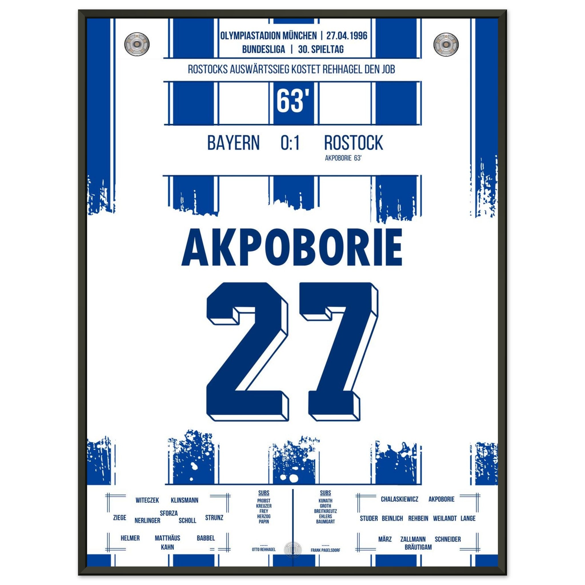 **27. April 1996 – Bayern vs. Rostock 0:1:** In der 63. Minute trifft Winter-Neuzugang Jonathan Akpoborie gegen Oliver Kahn und sorgt damit für einen historischen Auswärtssieg in München. Der Treffer besiegelt das Ende der Amtszeit von Bayern-Trainer Otto Rehhagel. Unser Poster verewigt diesen besonderen Moment der Vereinsgeschichte.