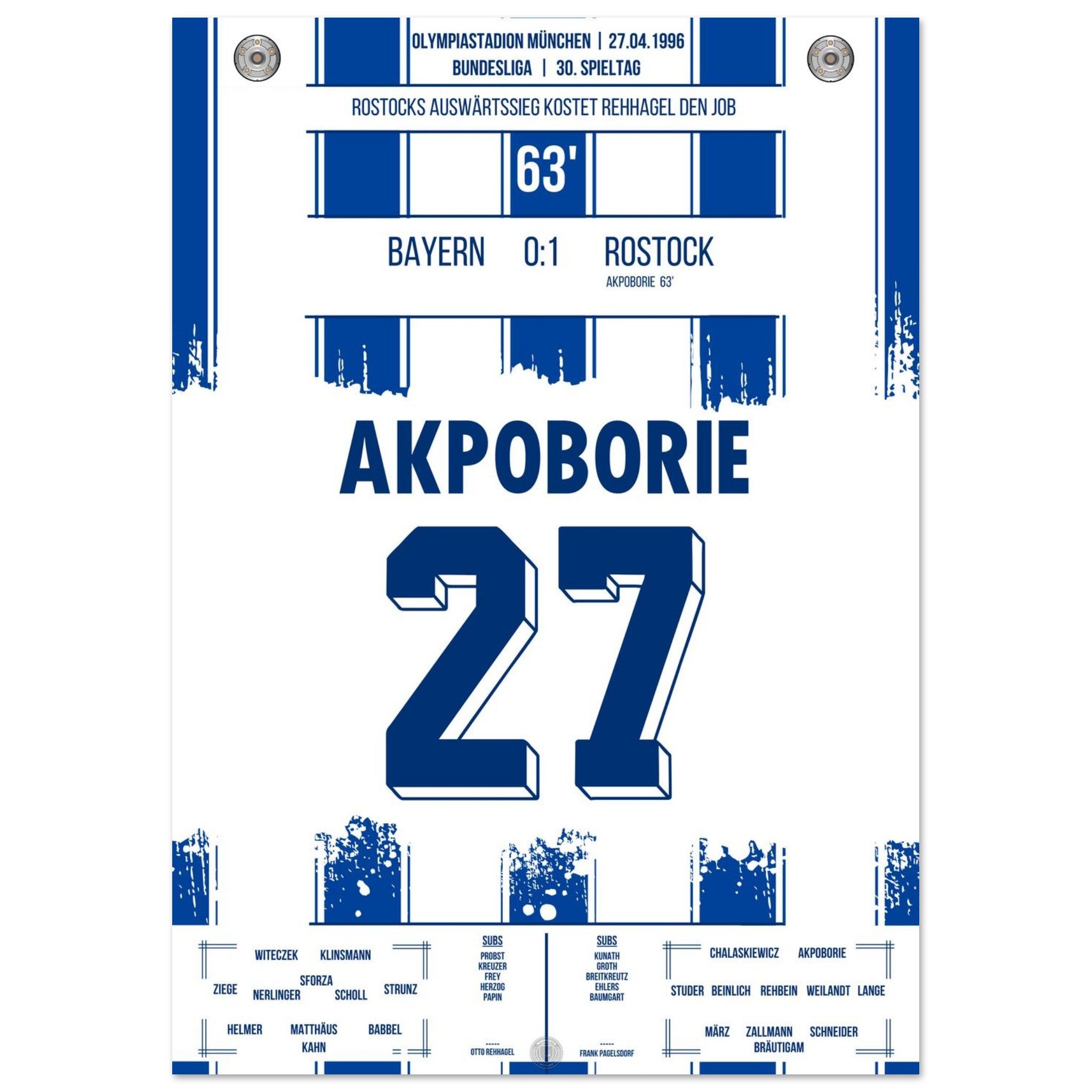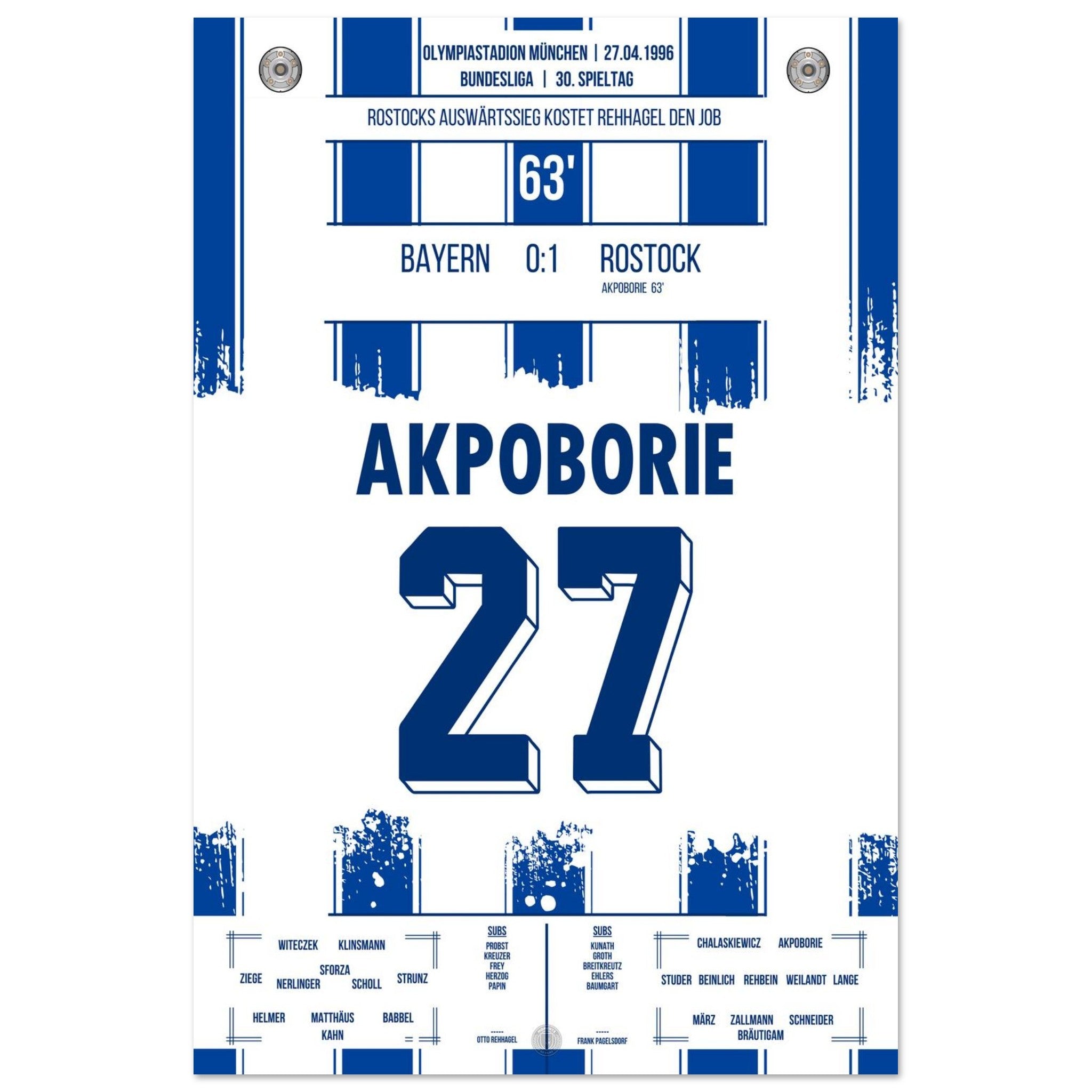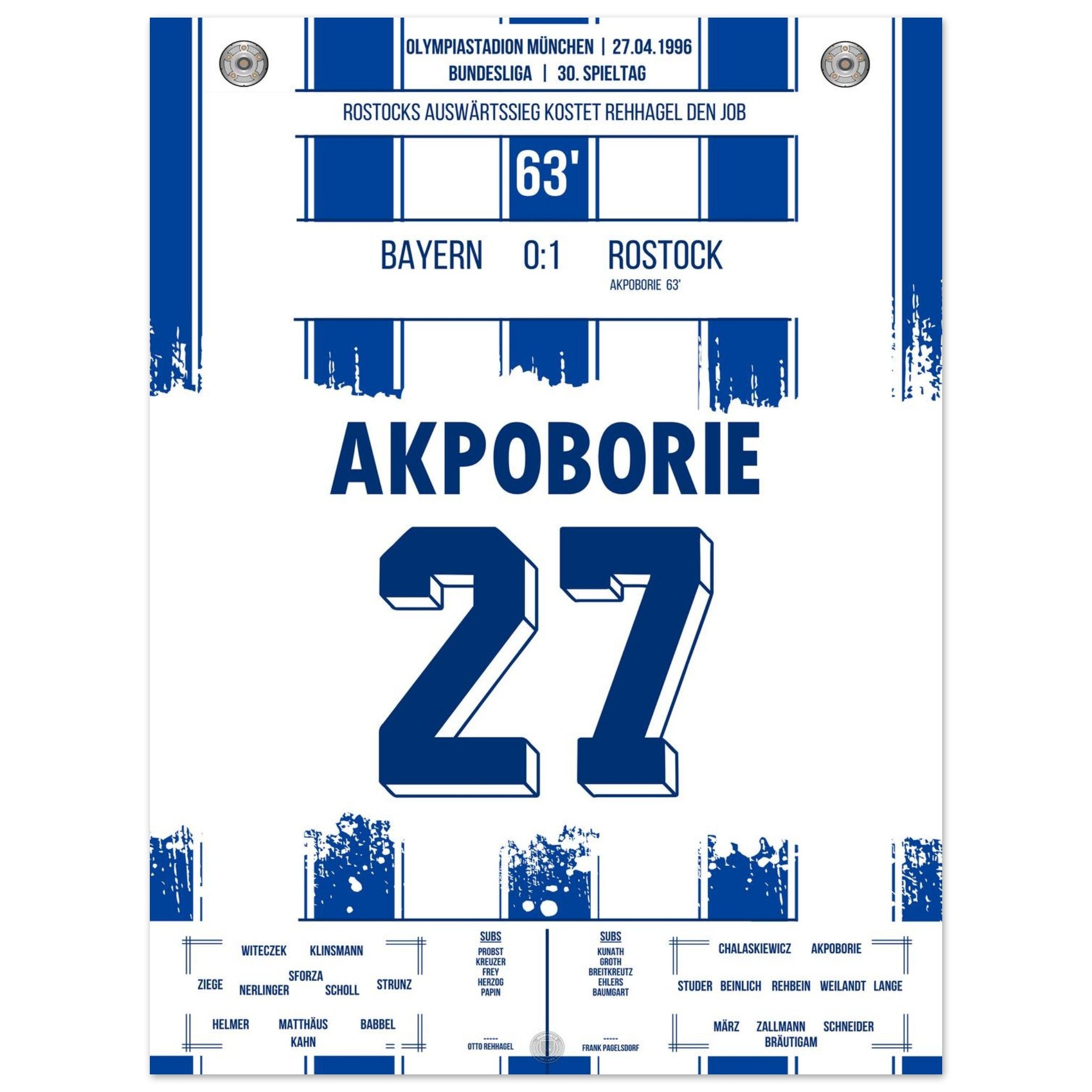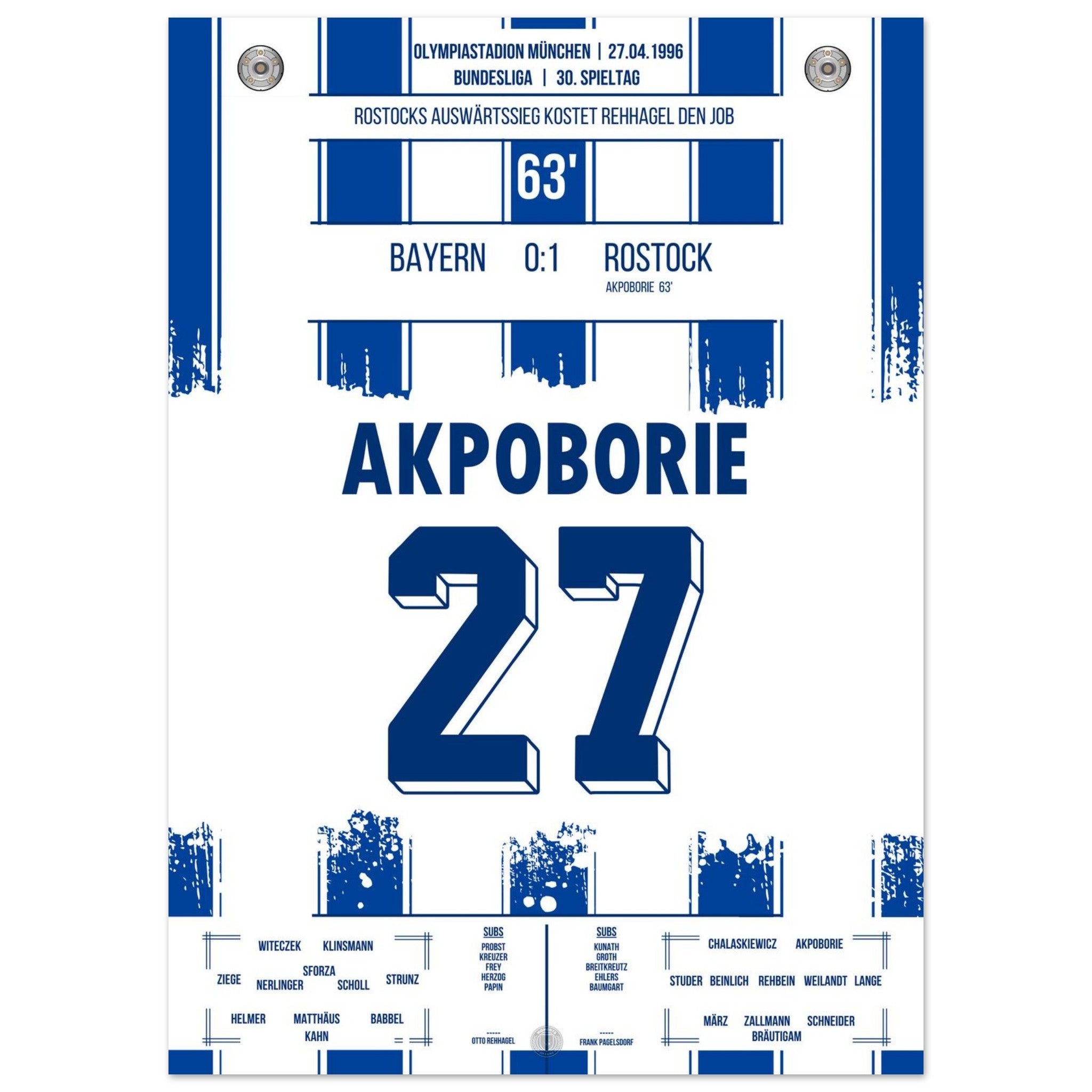 **27. April 1996 – Bayern vs. Rostock 0:1:** In der 63. Minute trifft Winter-Neuzugang Jonathan Akpoborie gegen Oliver Kahn und sorgt damit für einen historischen Auswärtssieg in München. Der Treffer besiegelt das Ende der Amtszeit von Bayern-Trainer Otto Rehhagel. Unser Poster verewigt diesen besonderen Moment der Vereinsgeschichte.