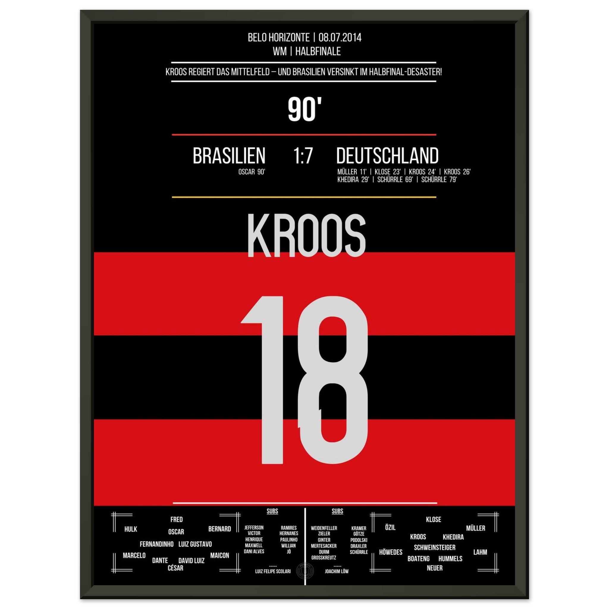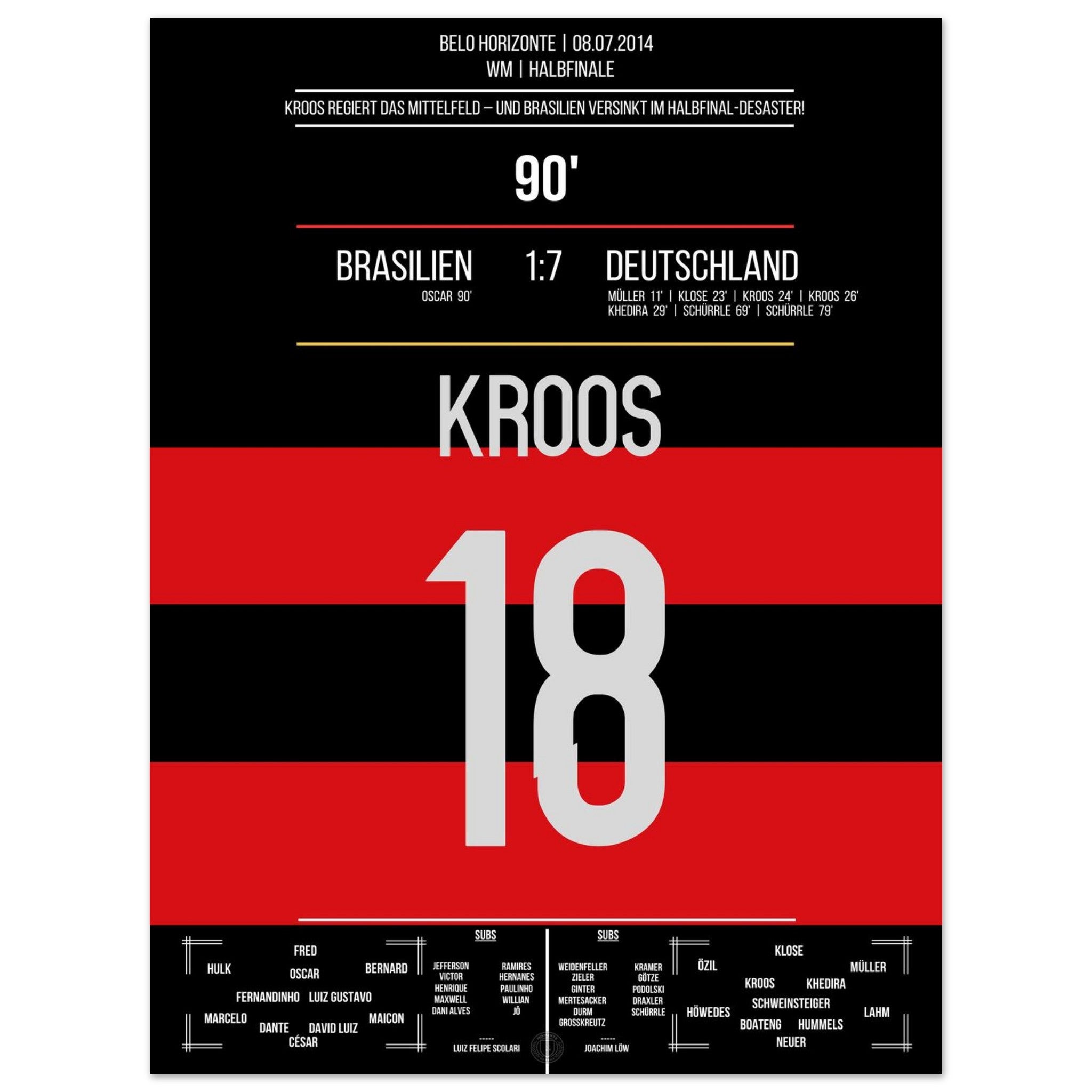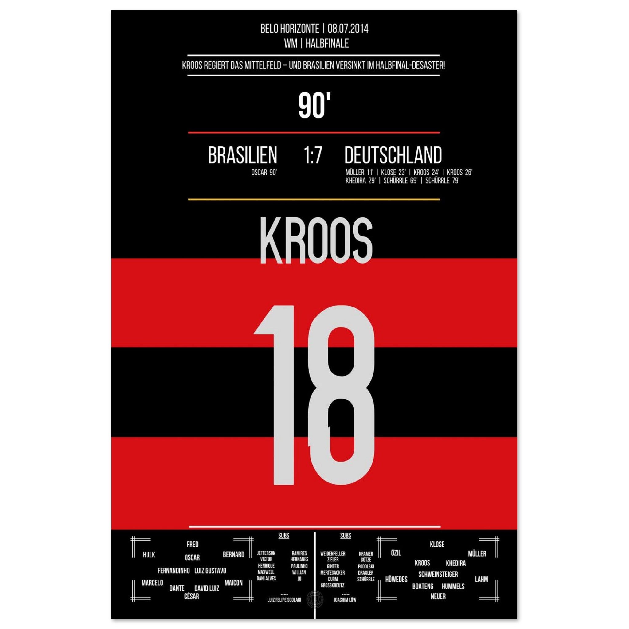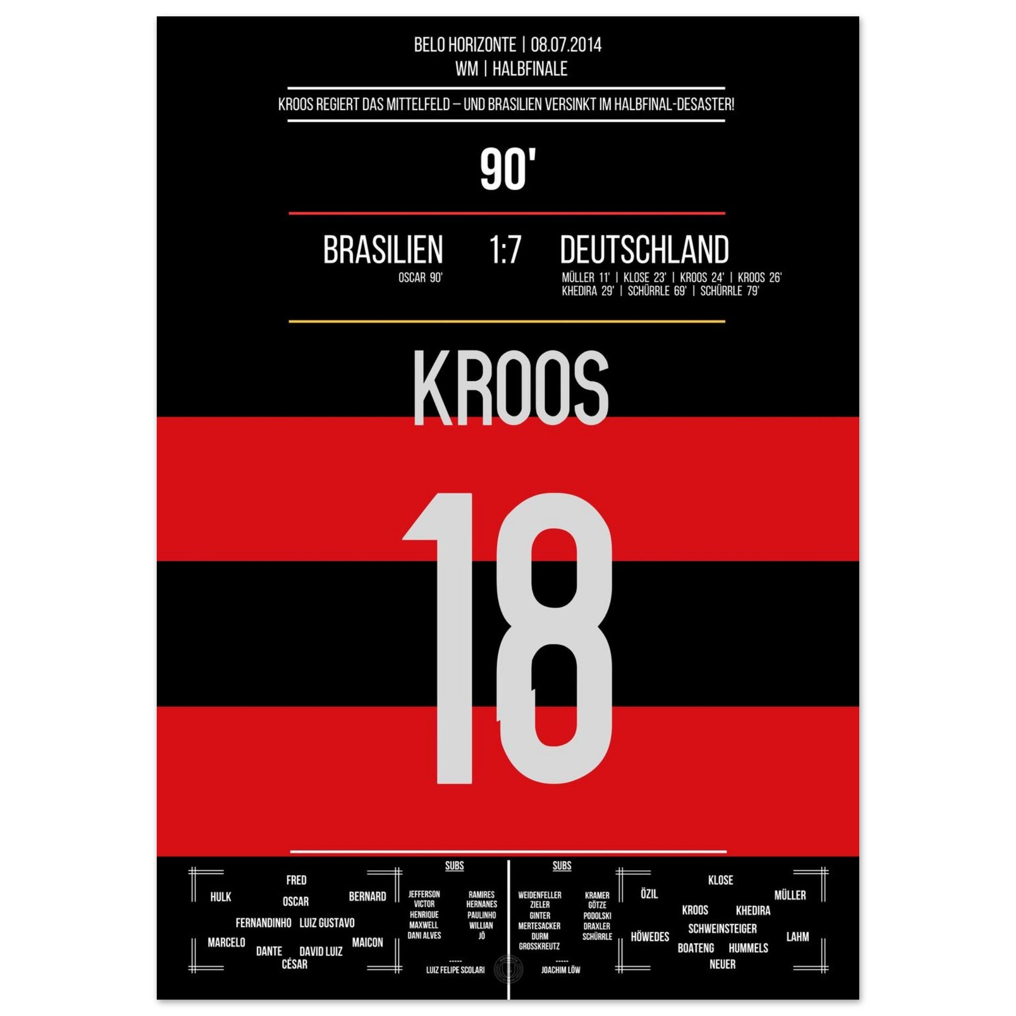 8. Juli 2014 – Brasilien vs. Deutschland 1:7: Toni Kroos schnürt innerhalb von 69 Sekunden einen Doppelpack und führt das DFB-Team zur legendären Halbfinal-Demontage des Gastgebers. Zwei Tore, ein Moment kollektiven Staunens – unser Poster verewigt Kroos' Meisterwerk beim 7:1 von Belo Horizonte.