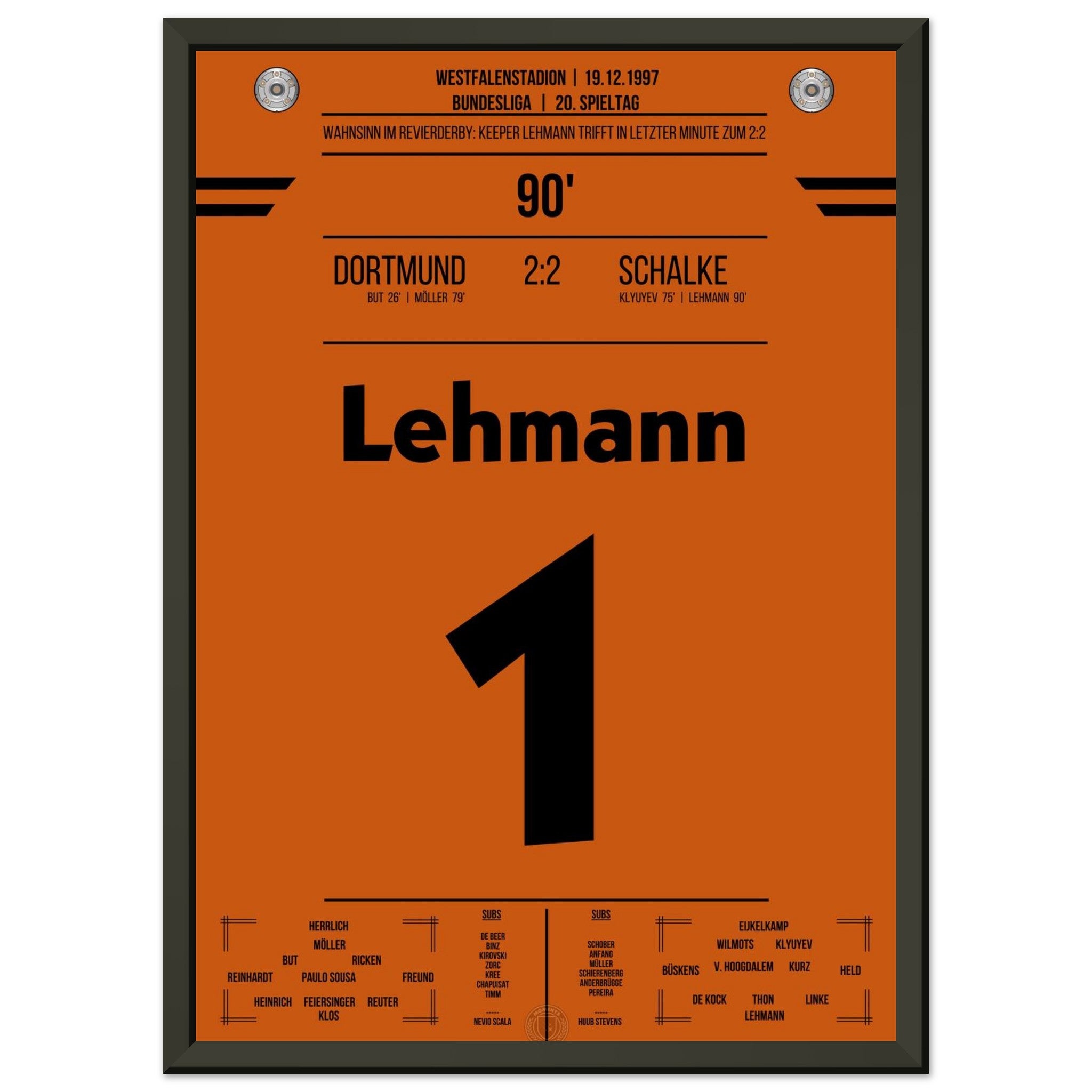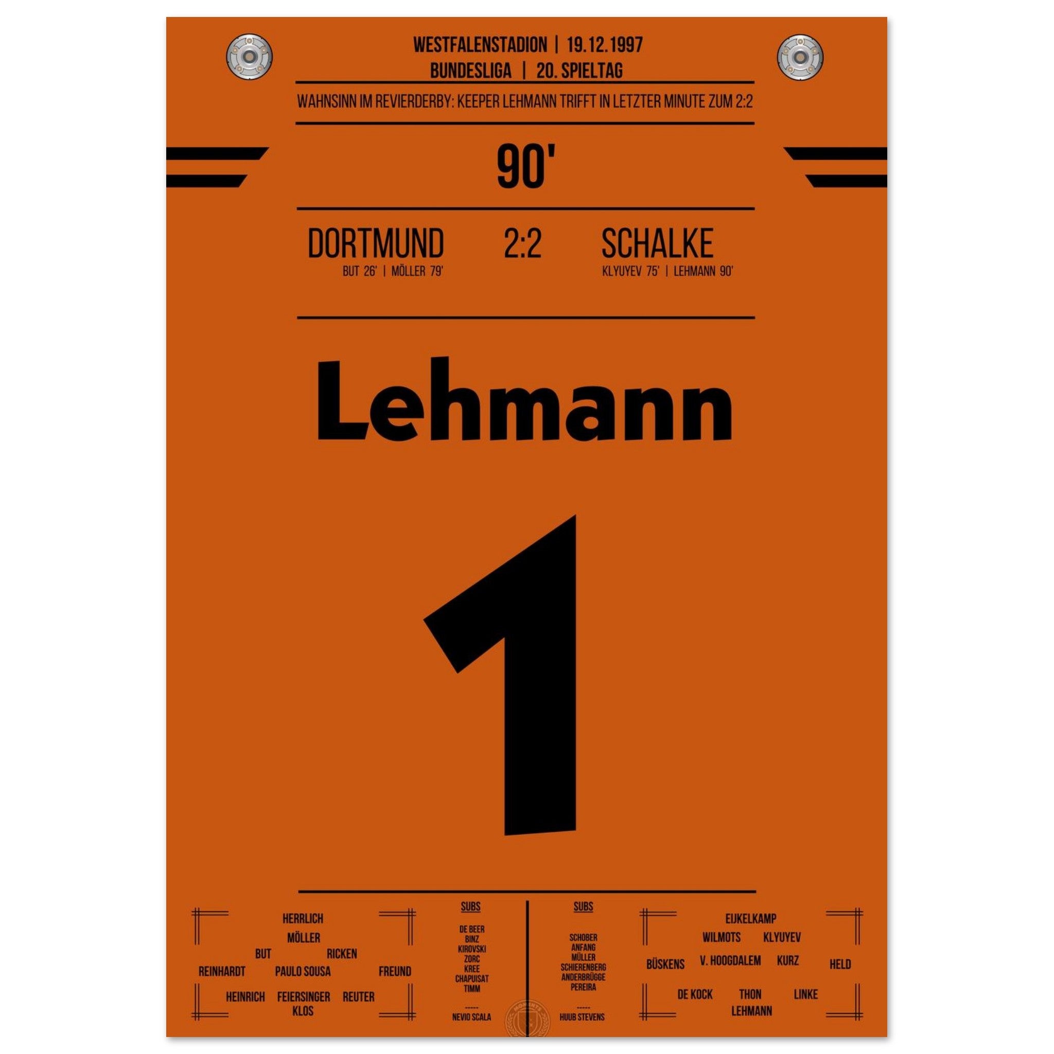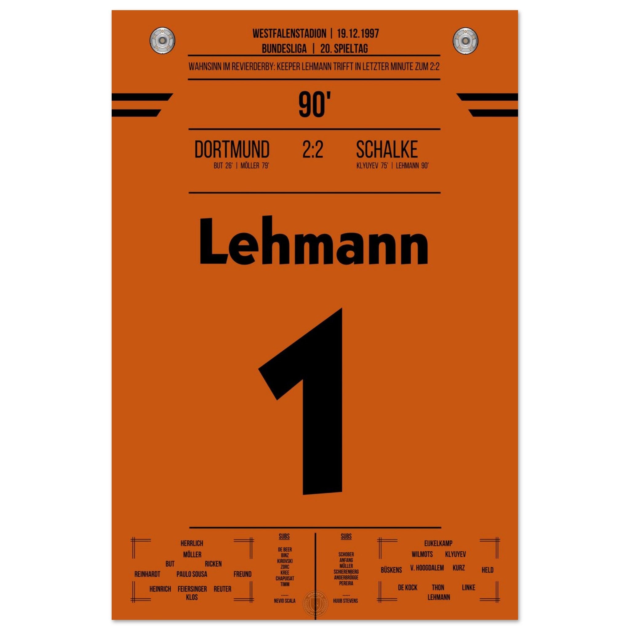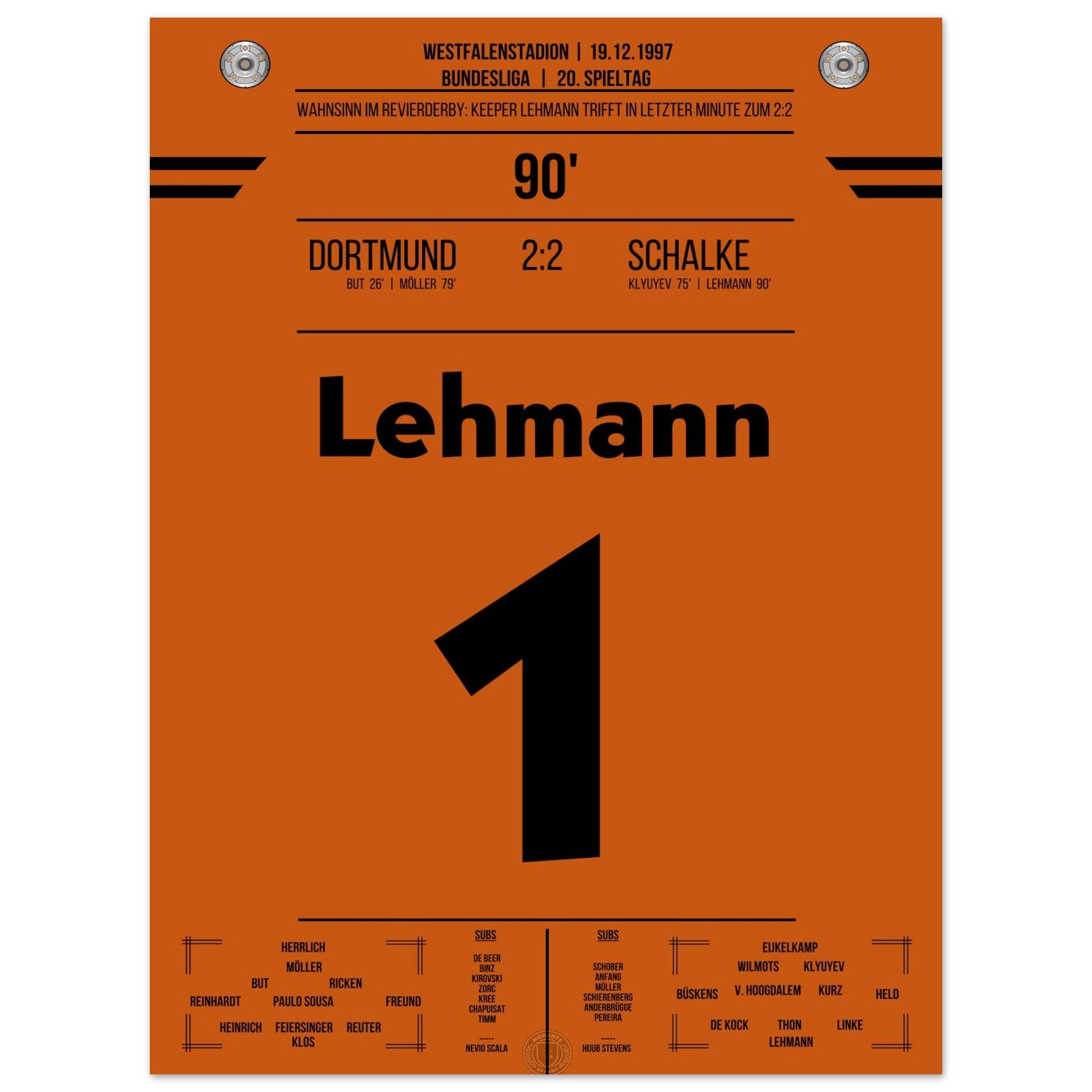 19. Dezember 1997 – Dortmund vs. Schalke 2:2: In der 90. Minute wird Jens Lehmann zur Legende – als erster Torwart der Bundesliga-Geschichte trifft er aus dem Spiel heraus und rettet Schalke im Derby ein Remis. Ein spektakulärer Schlusspunkt im Revierduell. Unser Poster verewigt diesen historischen Lehmann-Moment in Königsblau.