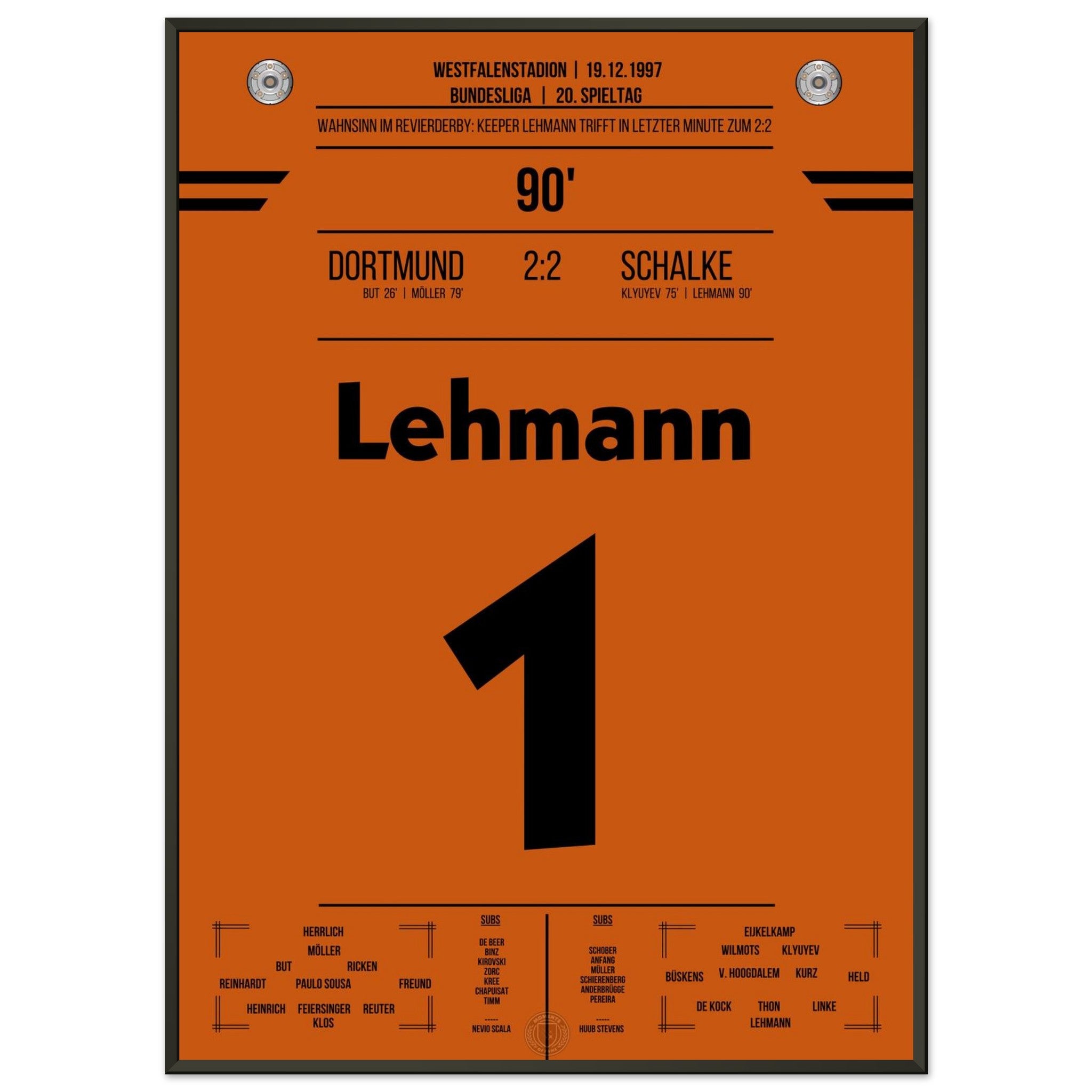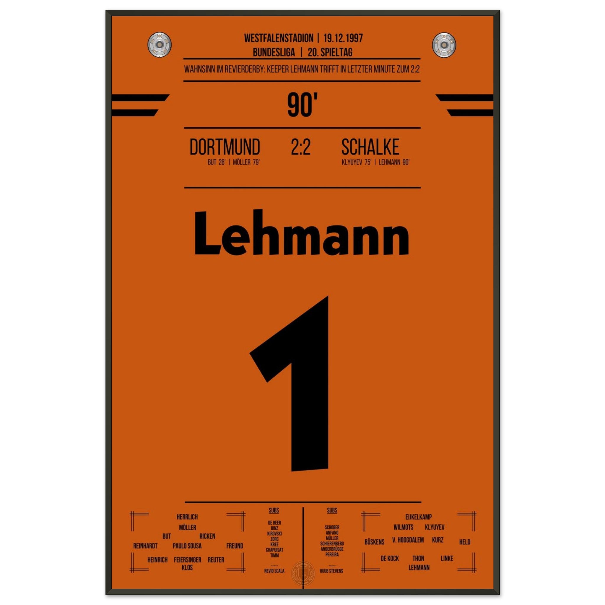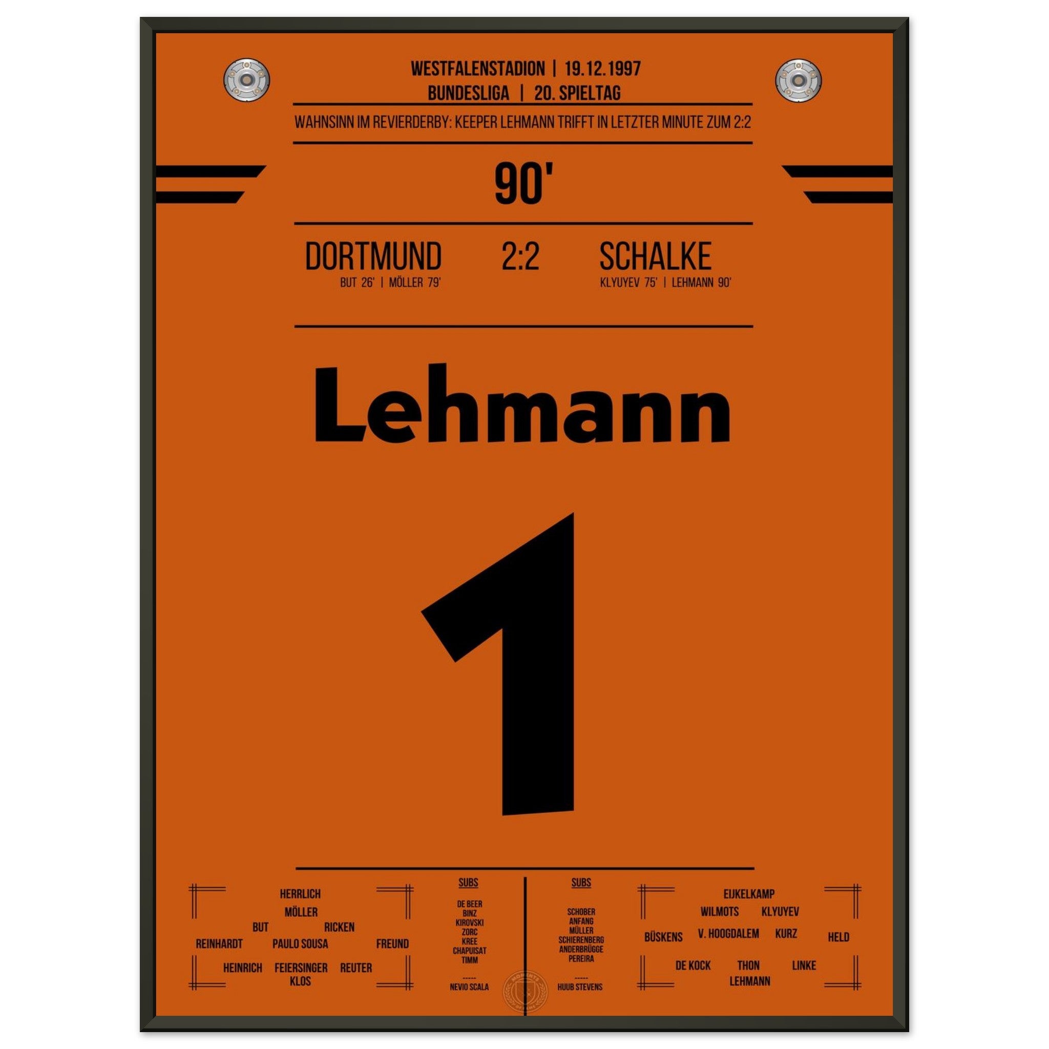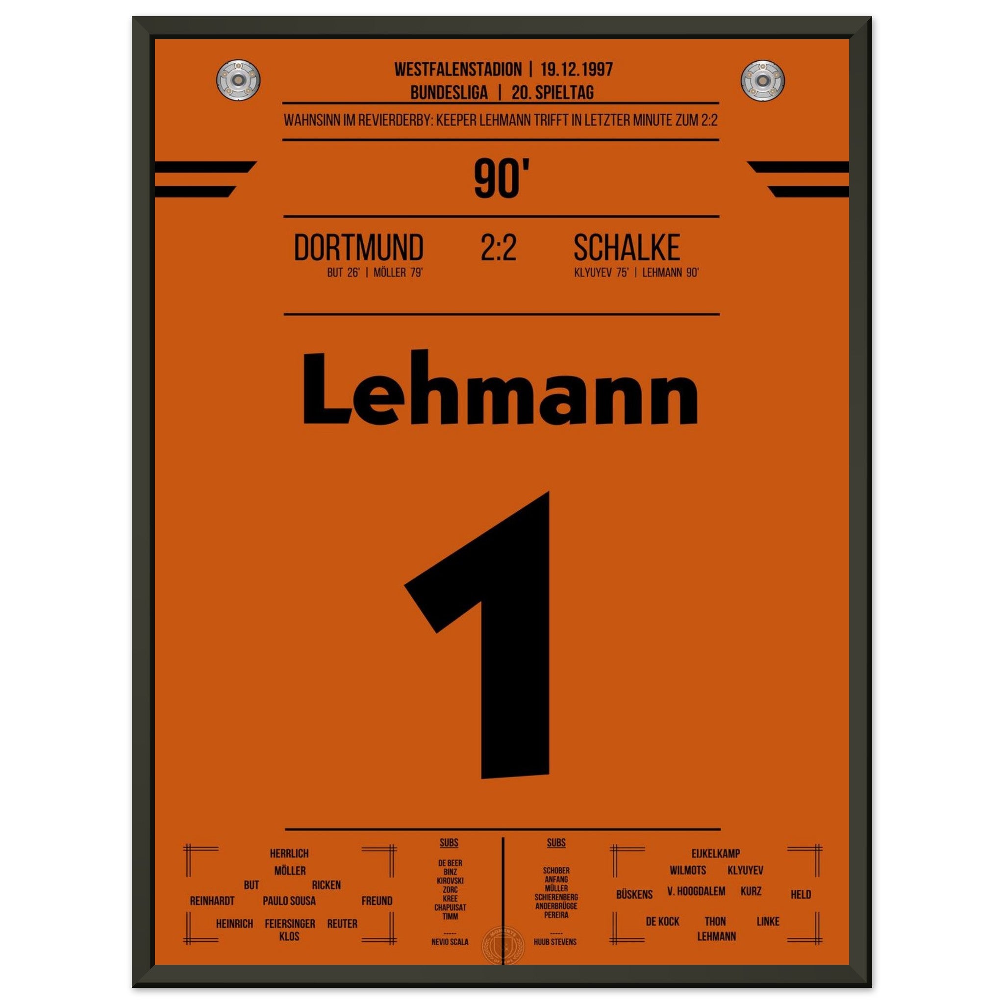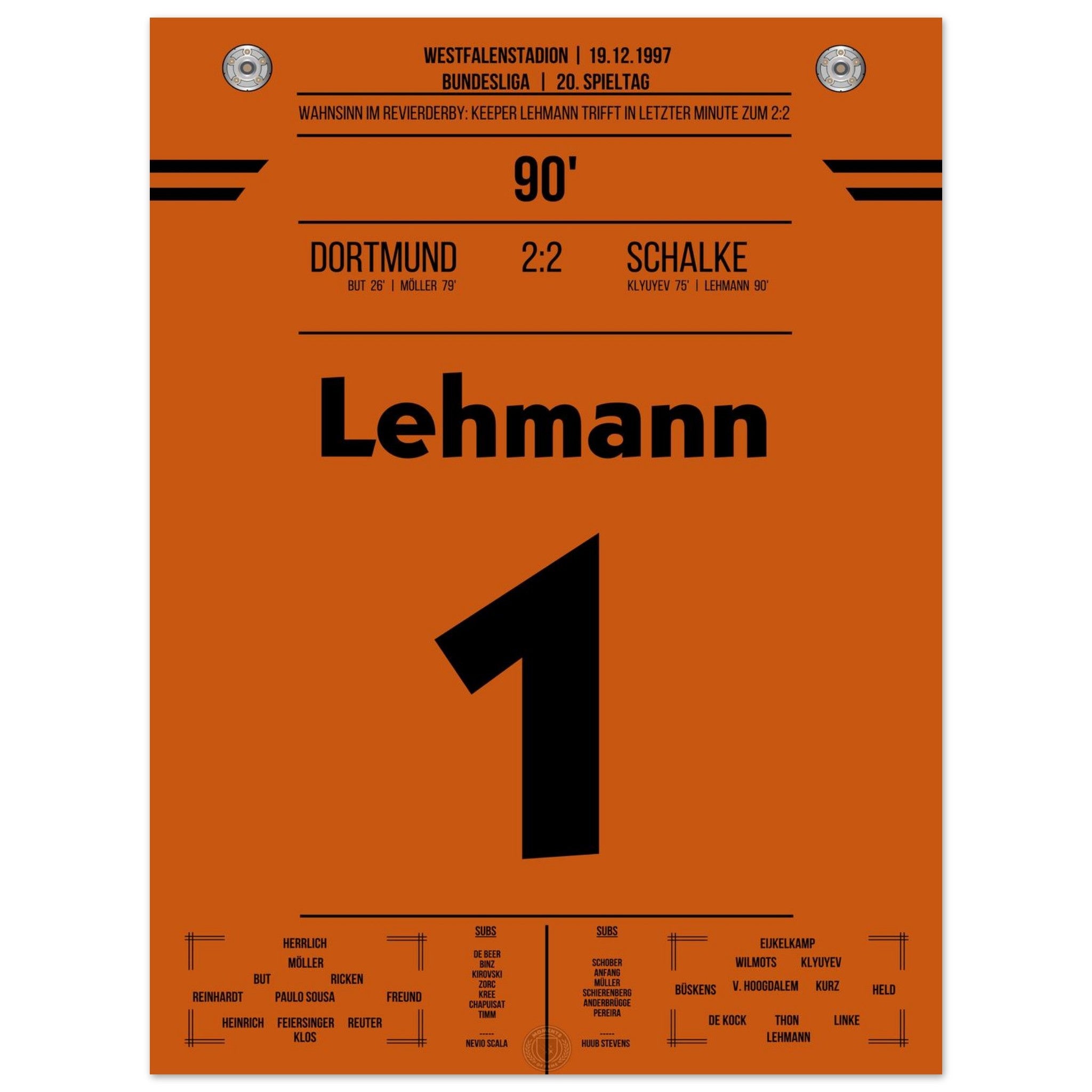 19. Dezember 1997 – Dortmund vs. Schalke 2:2: In der 90. Minute wird Jens Lehmann zur Legende – als erster Torwart der Bundesliga-Geschichte trifft er aus dem Spiel heraus und rettet Schalke im Derby ein Remis. Ein spektakulärer Schlusspunkt im Revierduell. Unser Poster verewigt diesen historischen Lehmann-Moment in Königsblau.