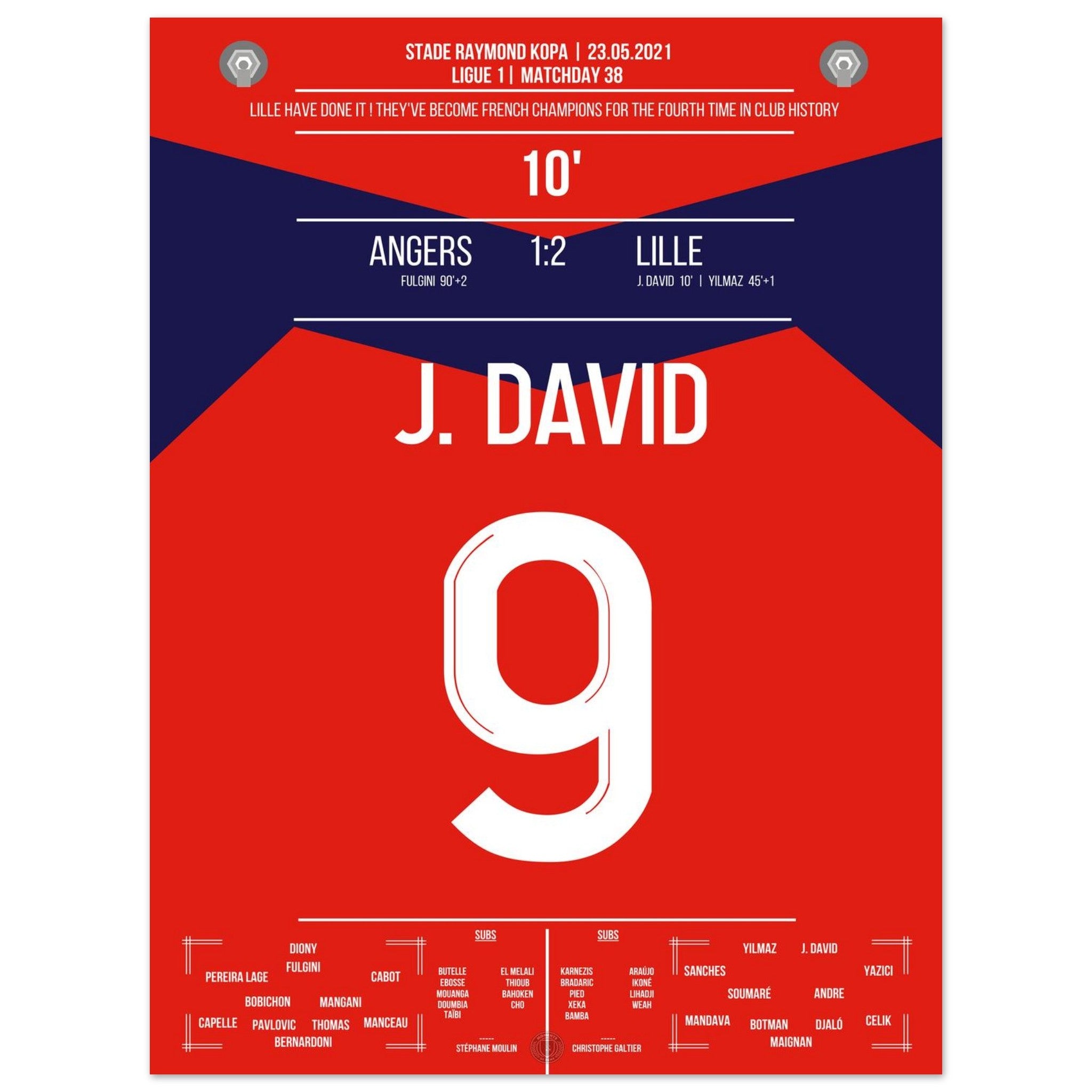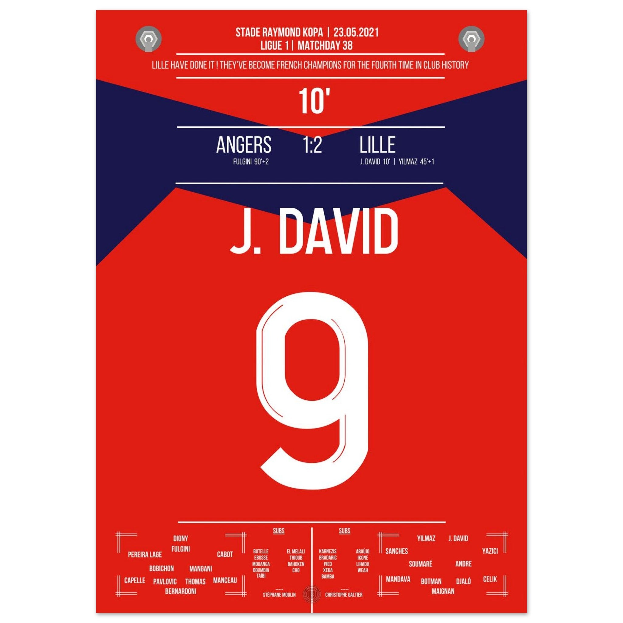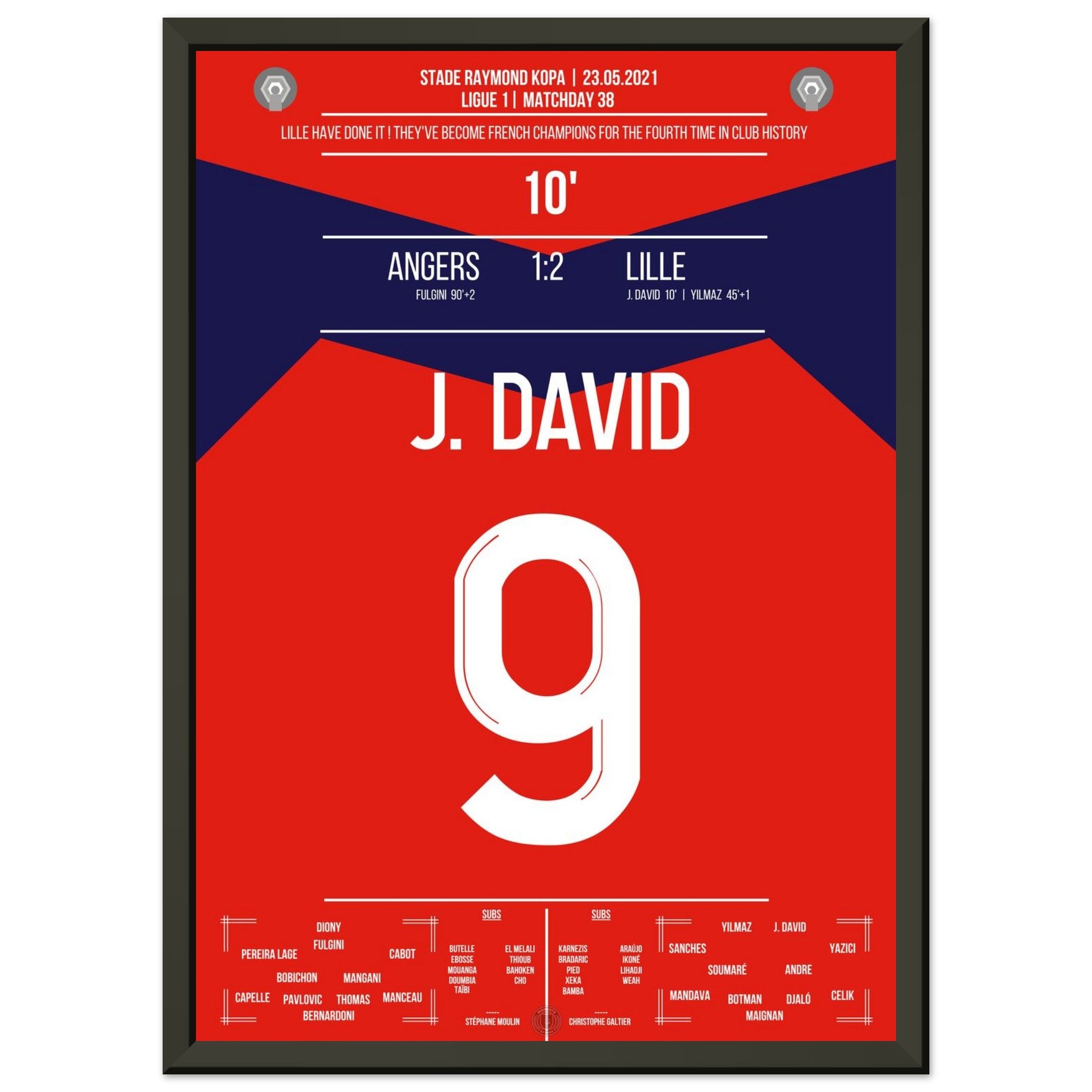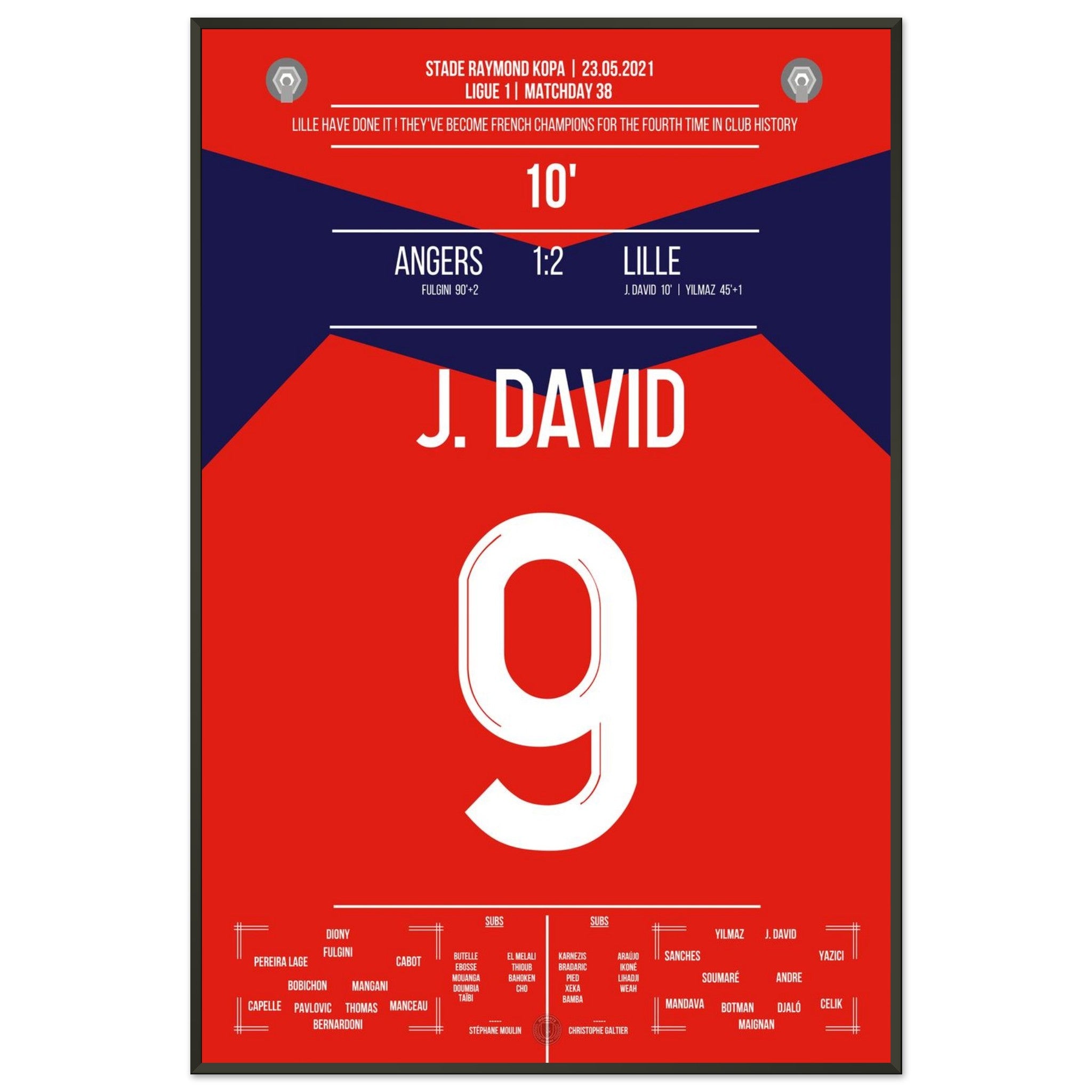 23. Mai 2021 – Angers vs. Lille 1:2: Lille schreibt Geschichte! Am letzten Spieltag macht das Team mit einem 2:1-Sieg den sensationellen Meistertitel perfekt – der erste seit 2011. Jonathan David bringt die Nordfranzosen früh auf Kurs und wird mit seinem Treffer zum Wegbereiter des großen Triumphs. Ein Moment für die Ewigkeit – jetzt als Poster verewigt.