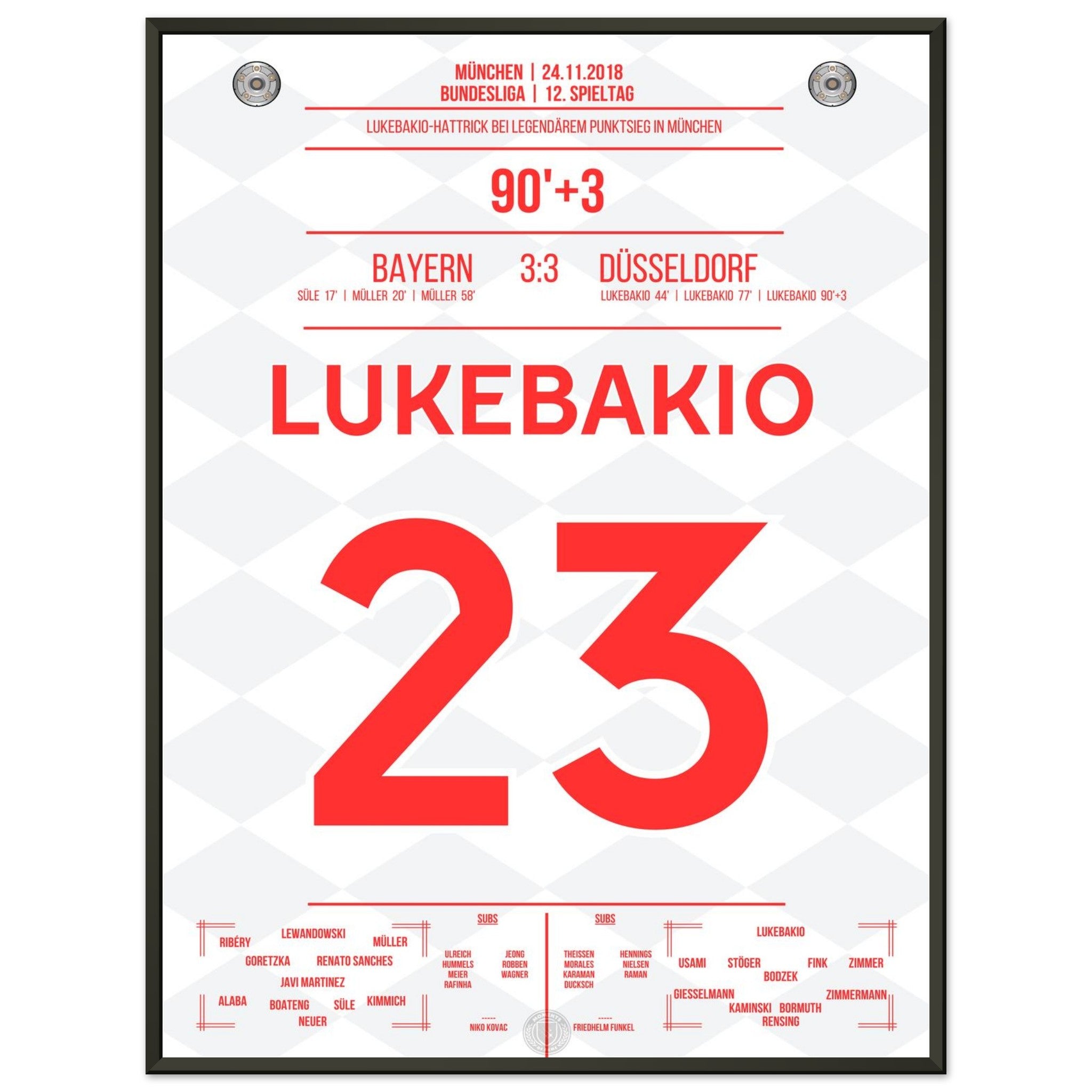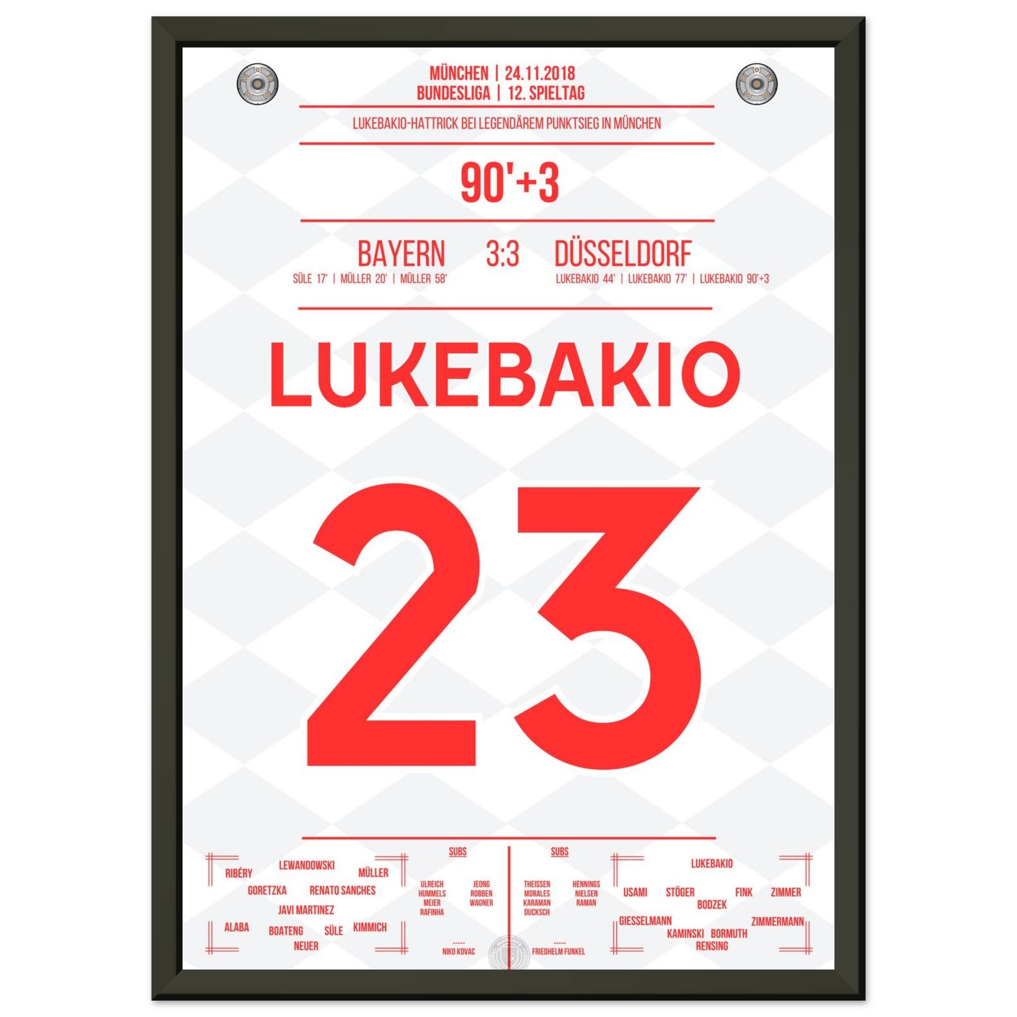 24. November 2018 – Bayern vs. Düsseldorf 3:3: Dodi Lukebakio schockt die Bayern mit einem historischen Hattrick in München und rettet Düsseldorf sensationell einen Punkt. Als erster Spieler überhaupt trifft er dreimal gegen Manuel Neuer in einem Bundesliga-Spiel. Unser Poster feiert diesen unvergesslichen Auftritt des Bayern-Schrecks.
