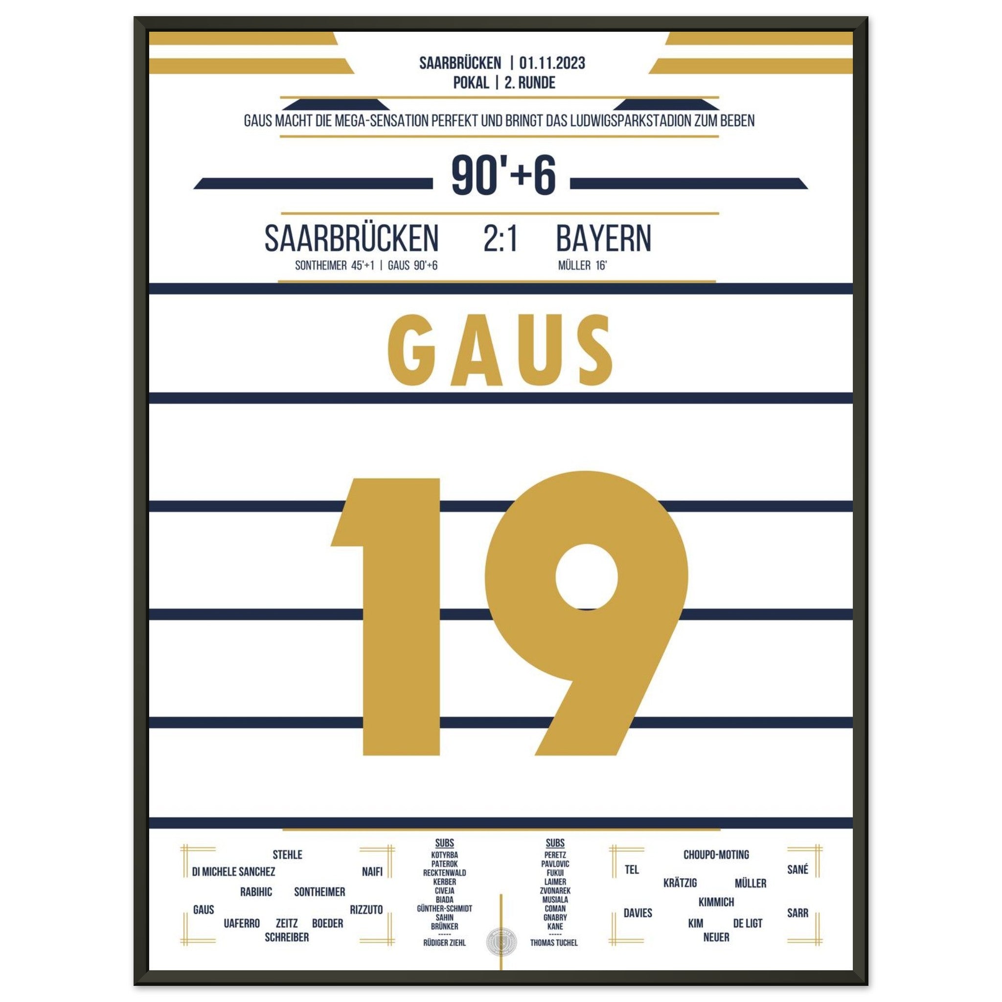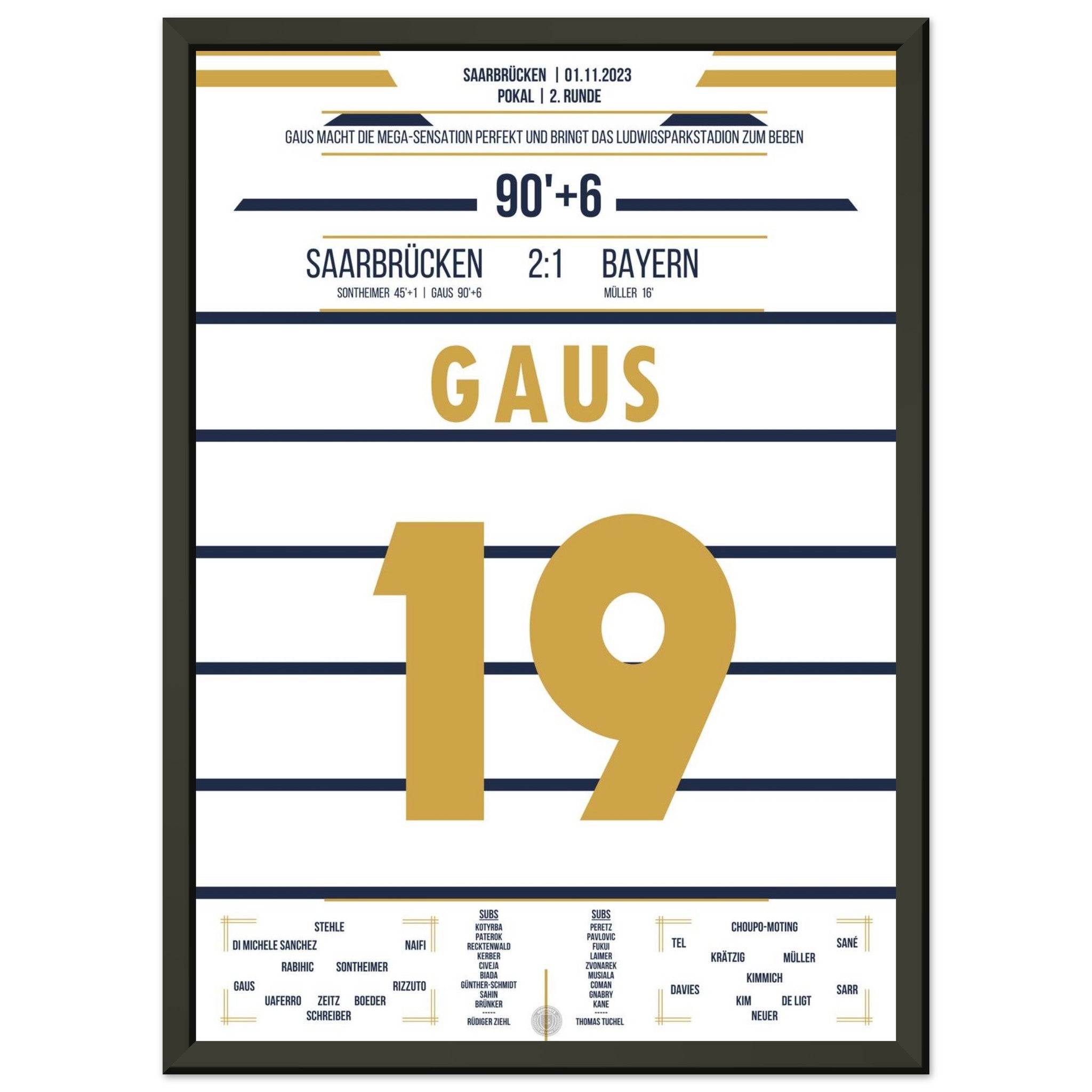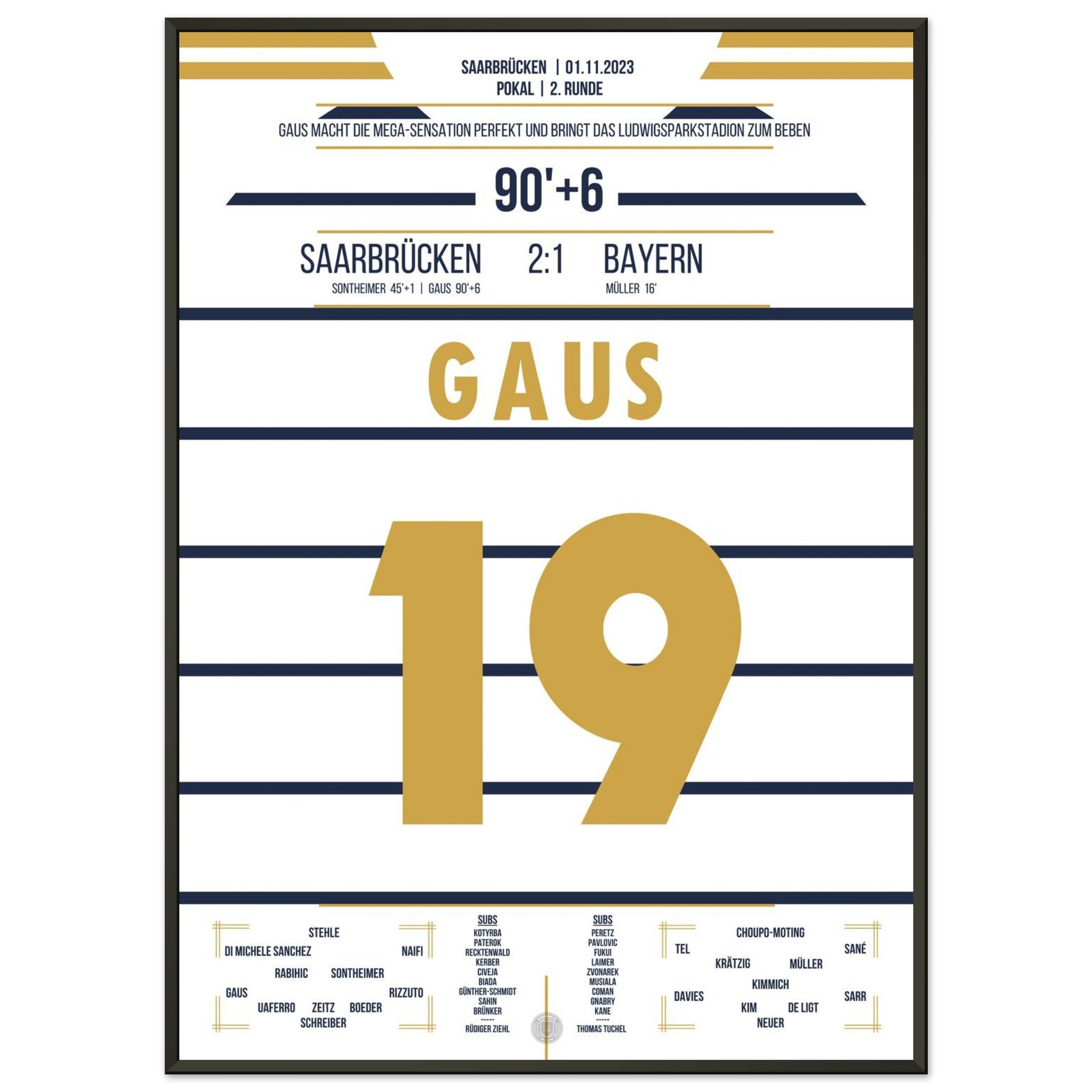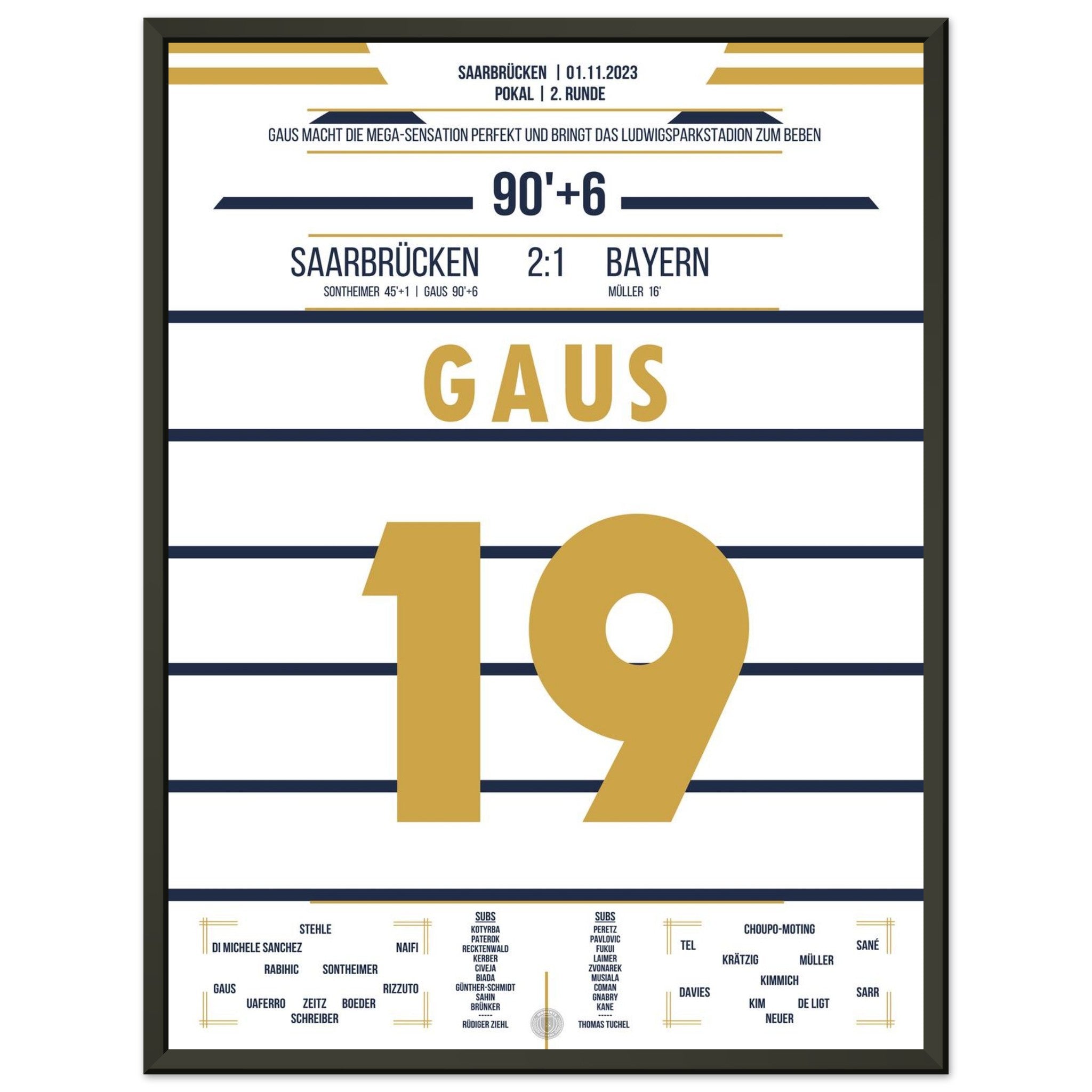 1. November 2023 – Saarbrücken vs. München 2:1: In der 90.+6 Minute trifft Marcel Gaus ins Glück und schießt den Saarbrücken sensationell ins Achtelfinale des Pokals. Der Ludwigspark tobt – ein unvergesslicher Abend für die Fußballgeschichte. Unser Poster hält diesen magischen Pokalmoment für immer fest.