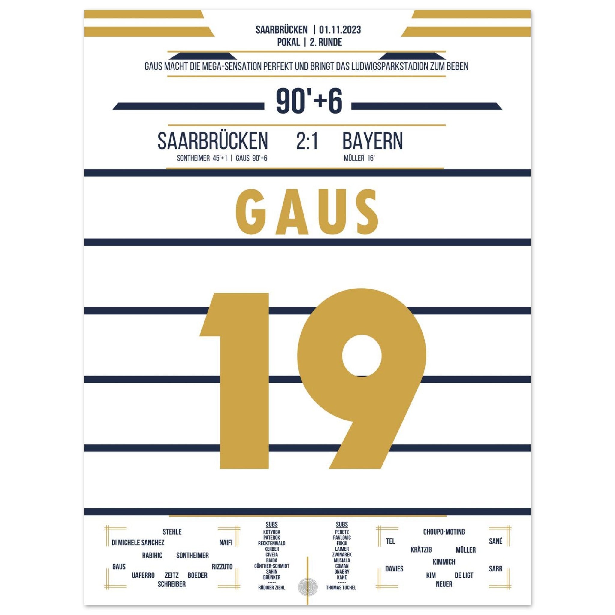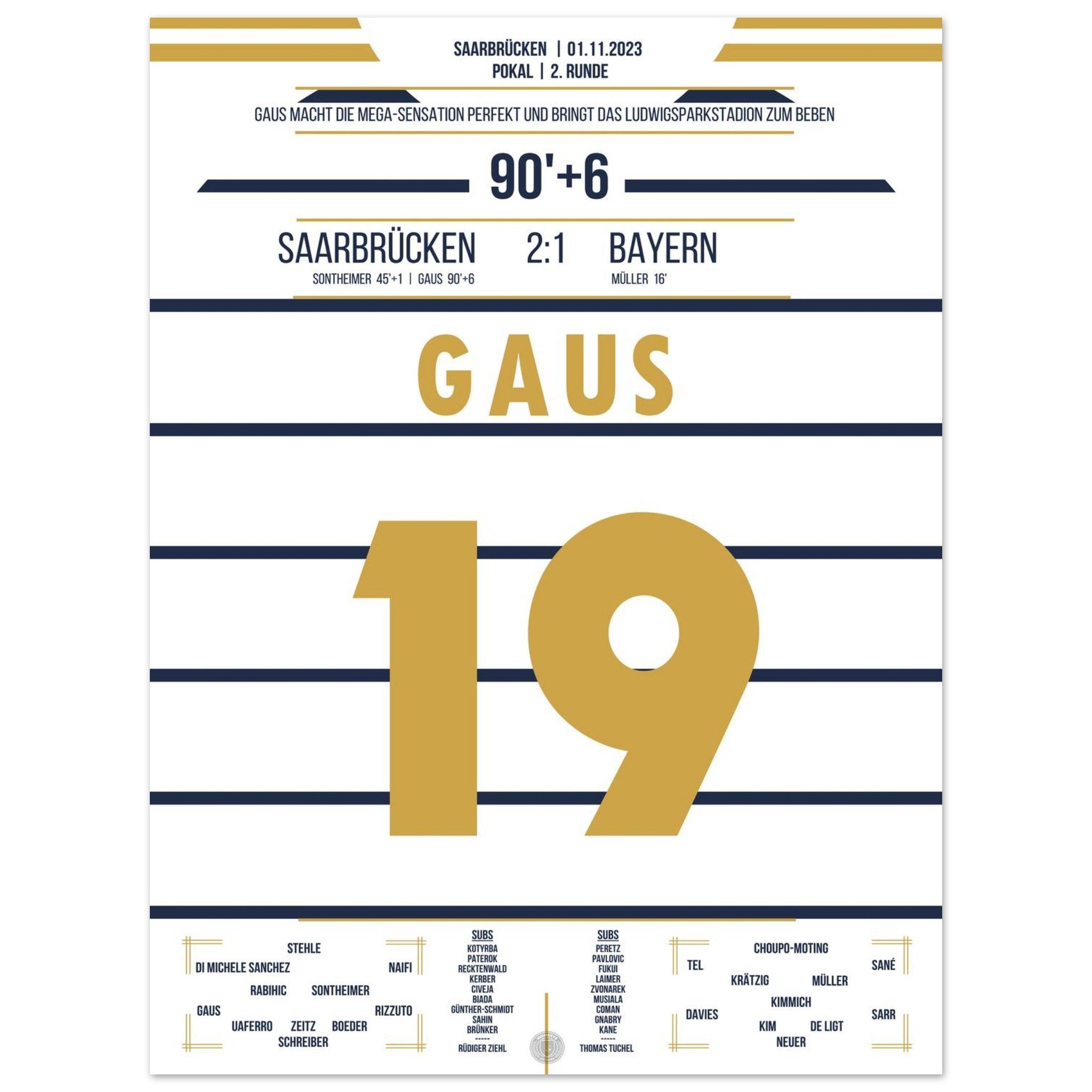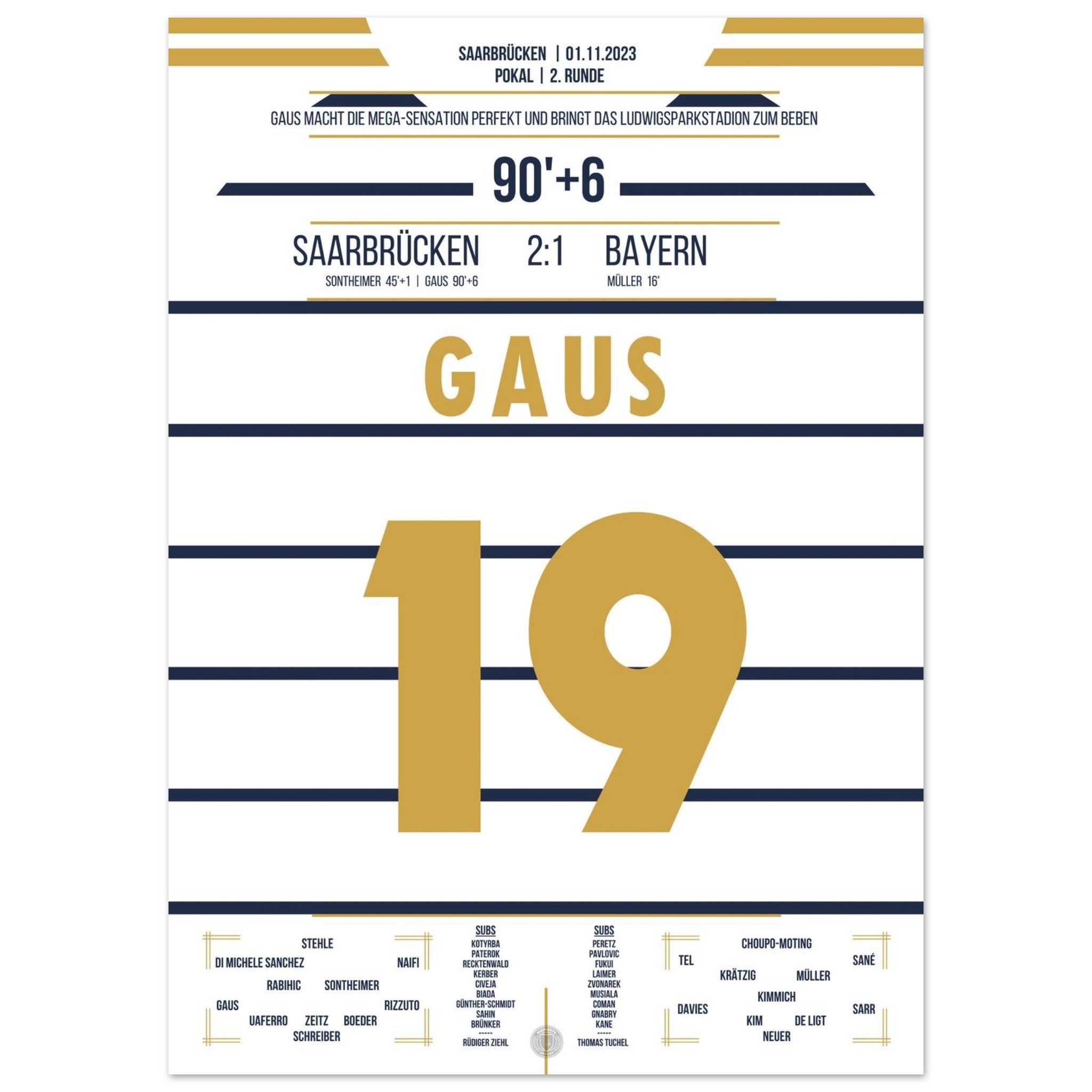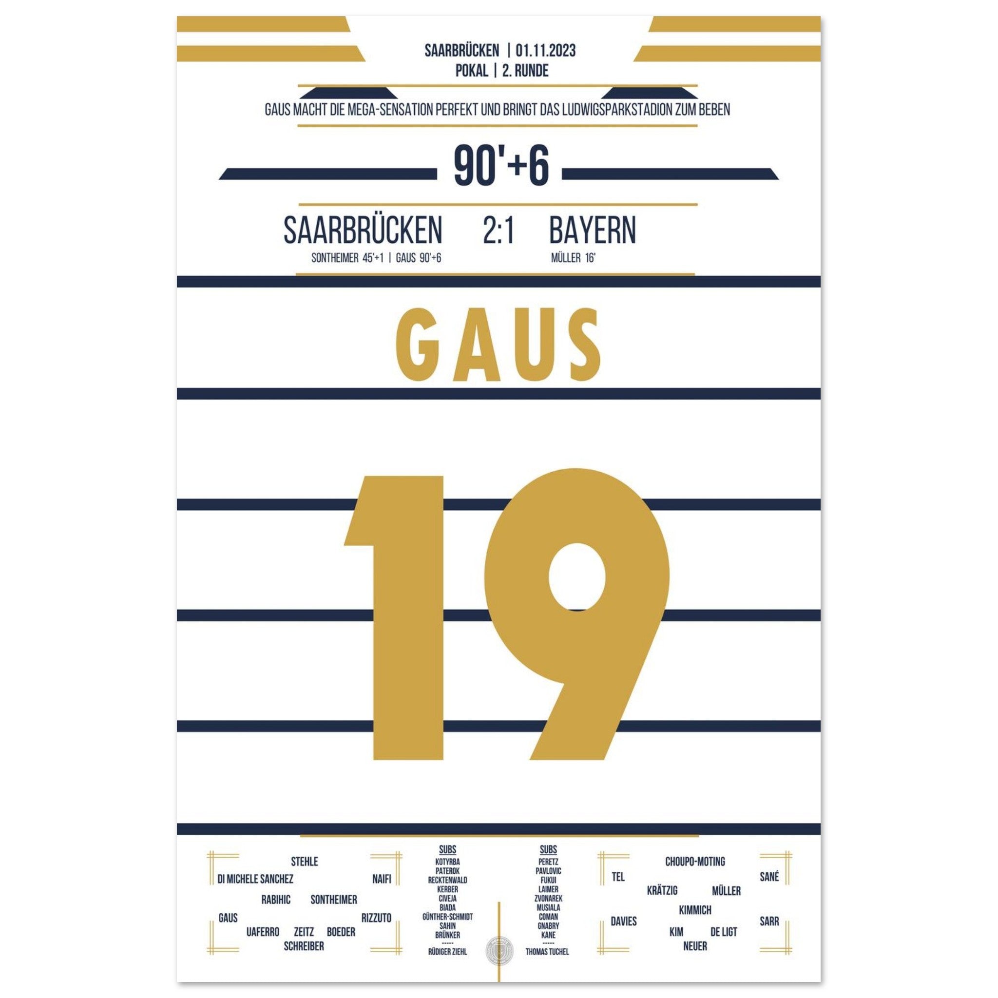 1. November 2023 – Saarbrücken vs. München 2:1: In der 90.+6 Minute trifft Marcel Gaus ins Glück und schießt den Saarbrücken sensationell ins Achtelfinale des Pokals. Der Ludwigspark tobt – ein unvergesslicher Abend für die Fußballgeschichte. Unser Poster hält diesen magischen Pokalmoment für immer fest.