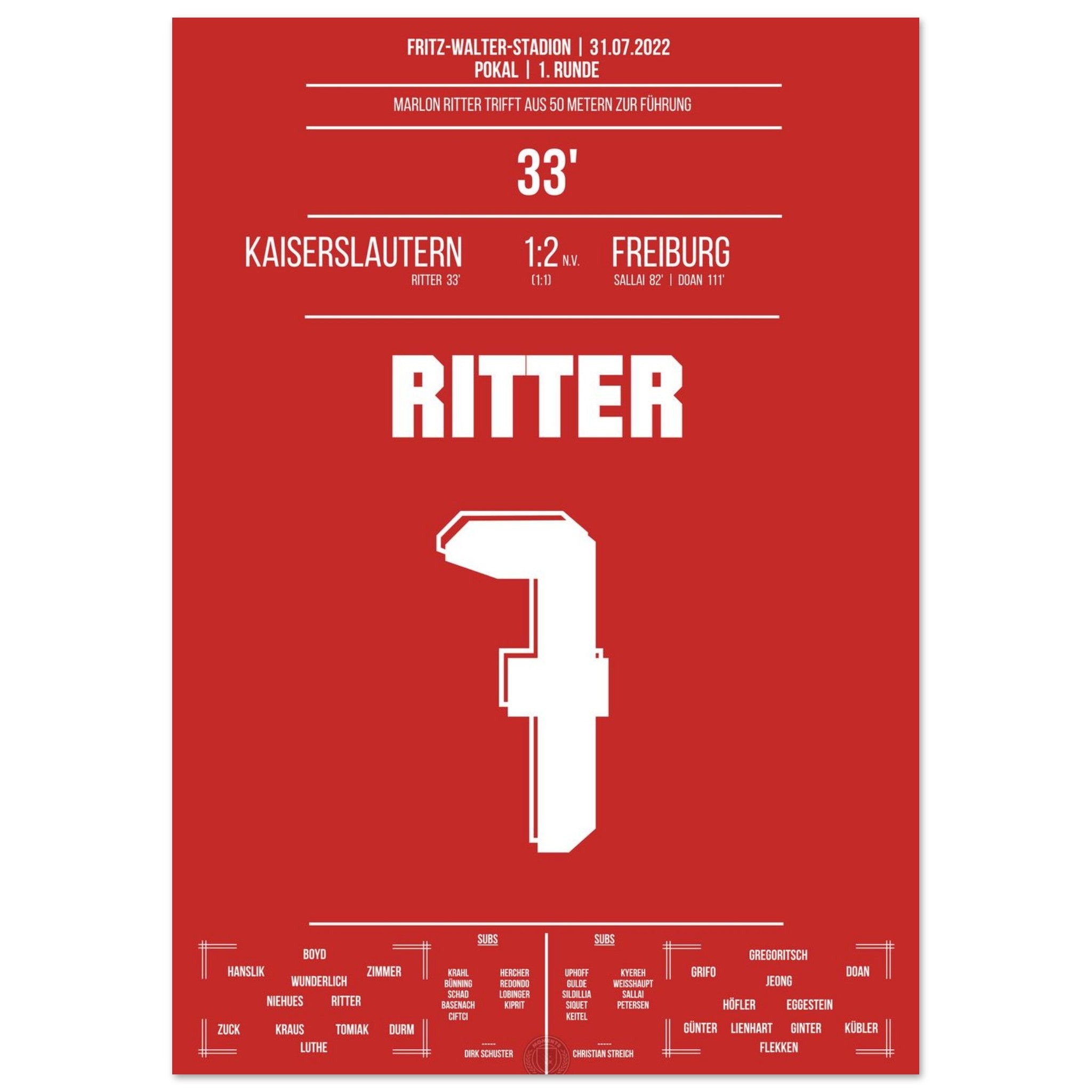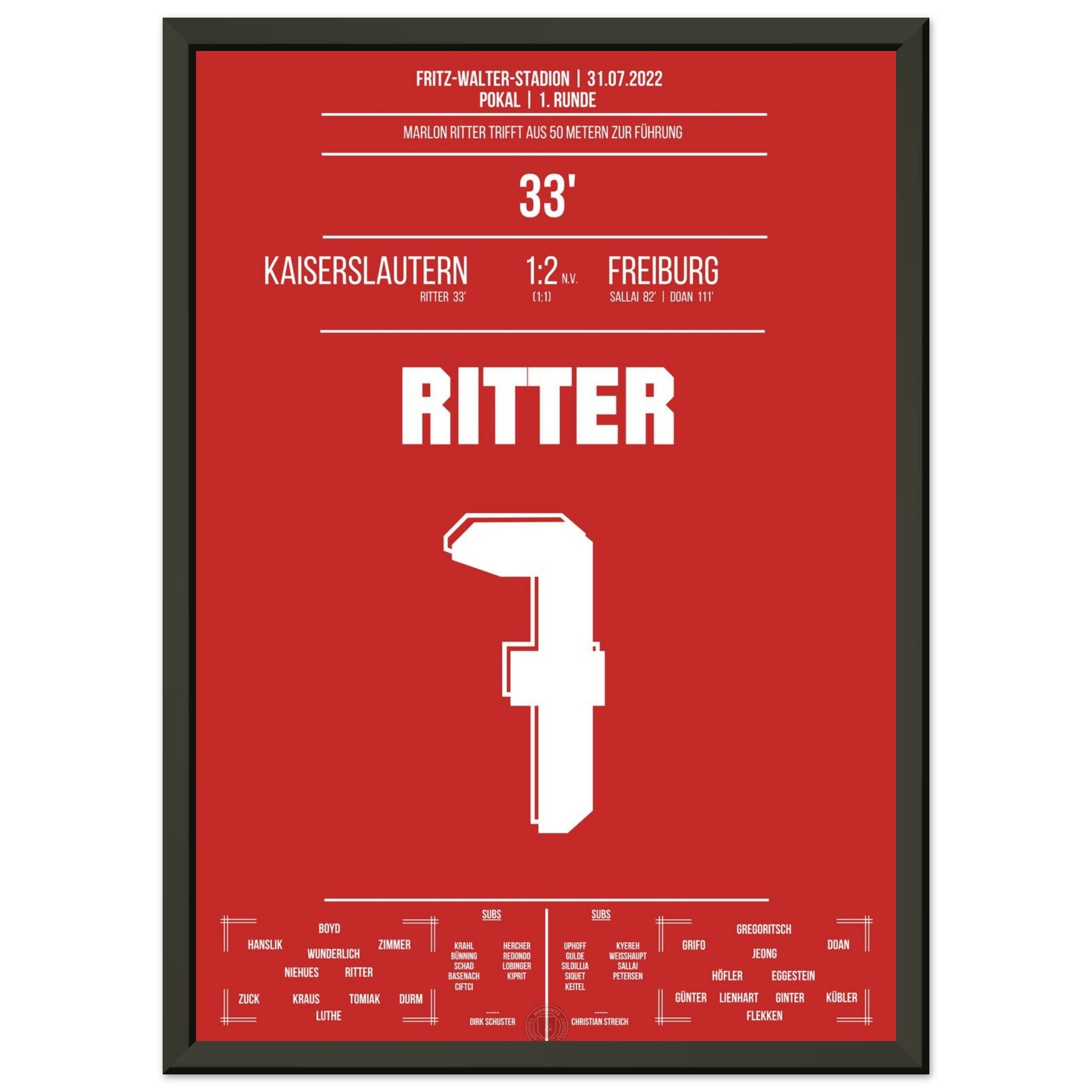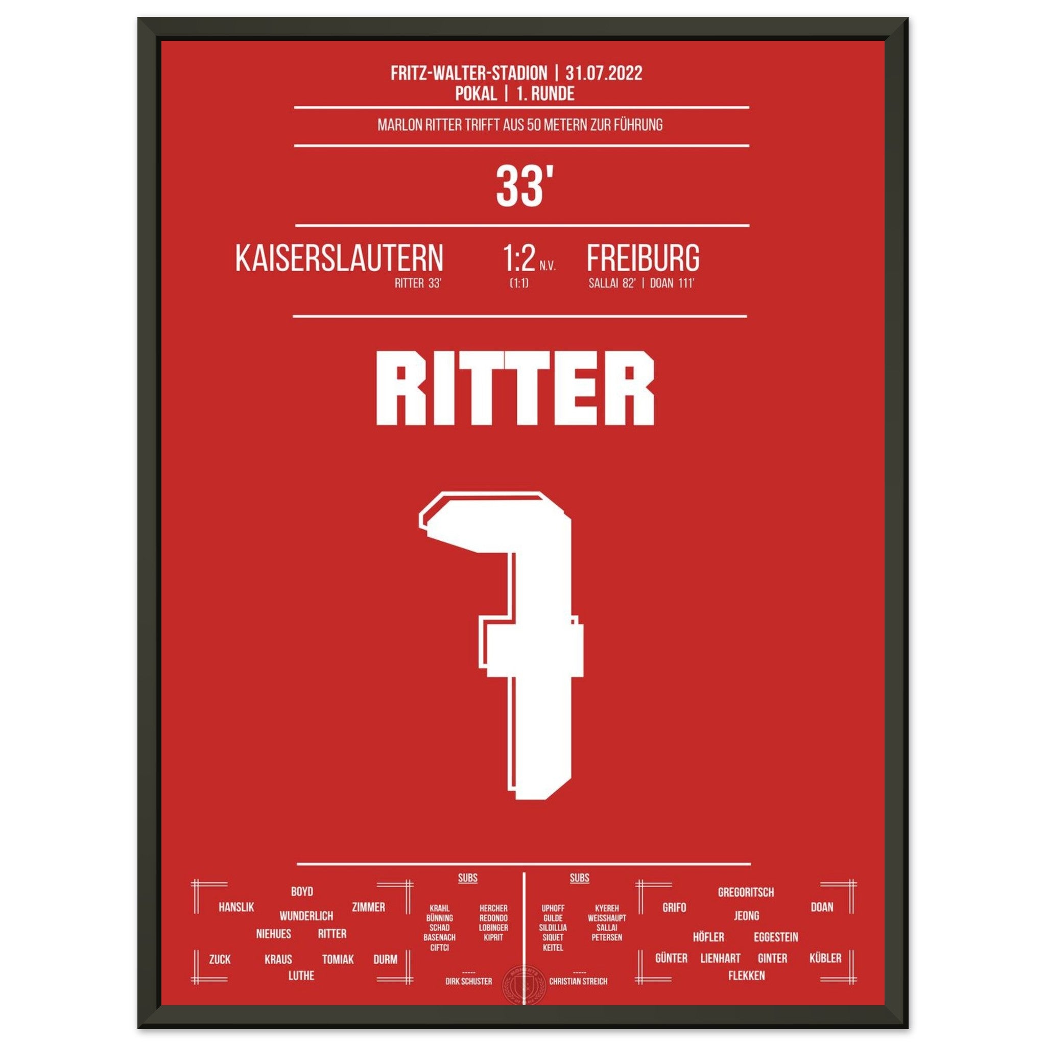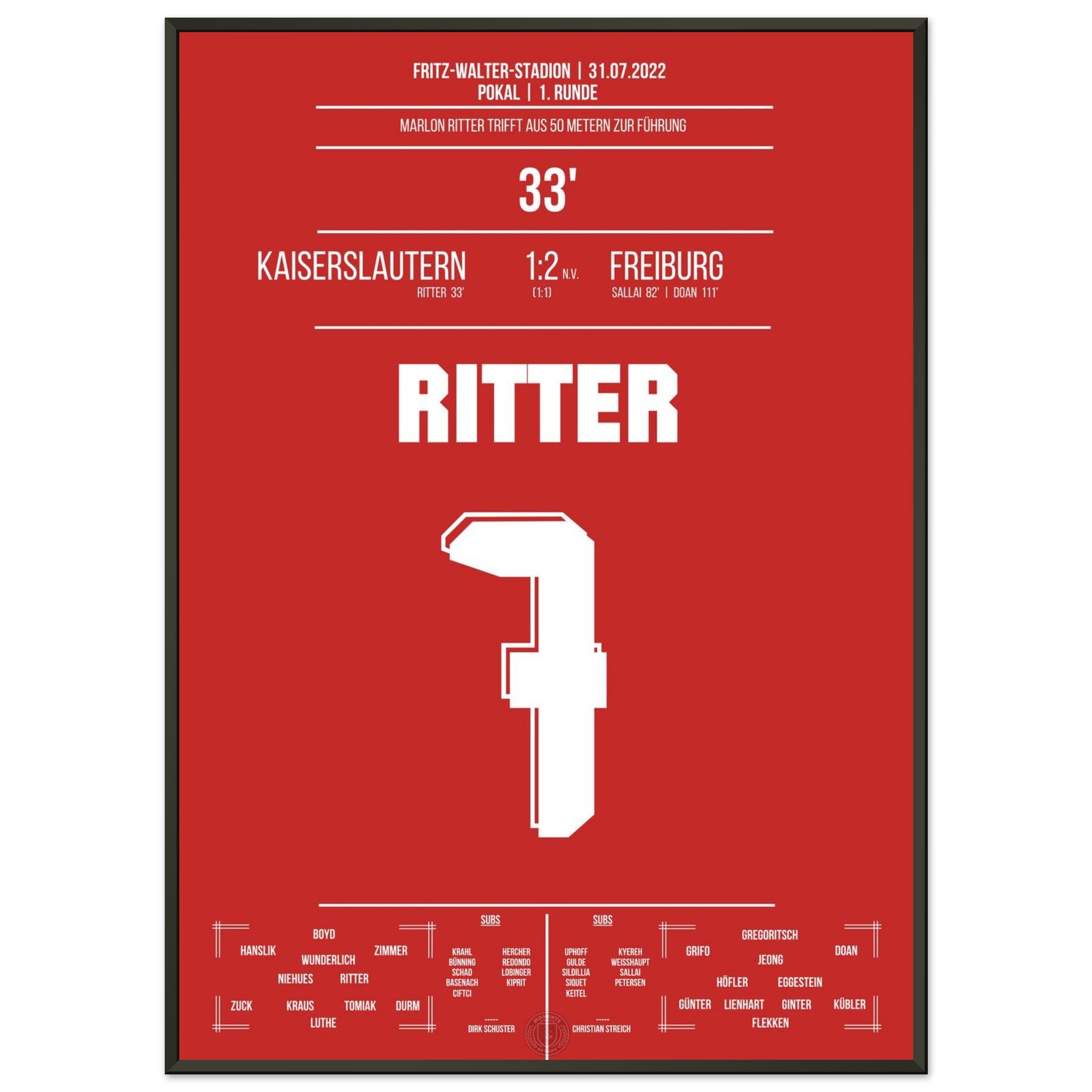 31. Juli 2022 – Kaiserslautern vs. Freiburg 1:2: In der 33. Minute trifft Marlon Ritter mit einem satten Schuss zur Führung im Pokal gegen den Bundesligisten – der Betzenberg bebt. Auch wenn es am Ende nicht zum Weiterkommen reicht, bleibt dieser Moment unvergessen. Unser Poster hält diesen Pokalmoment in Rot-Weiß fest.