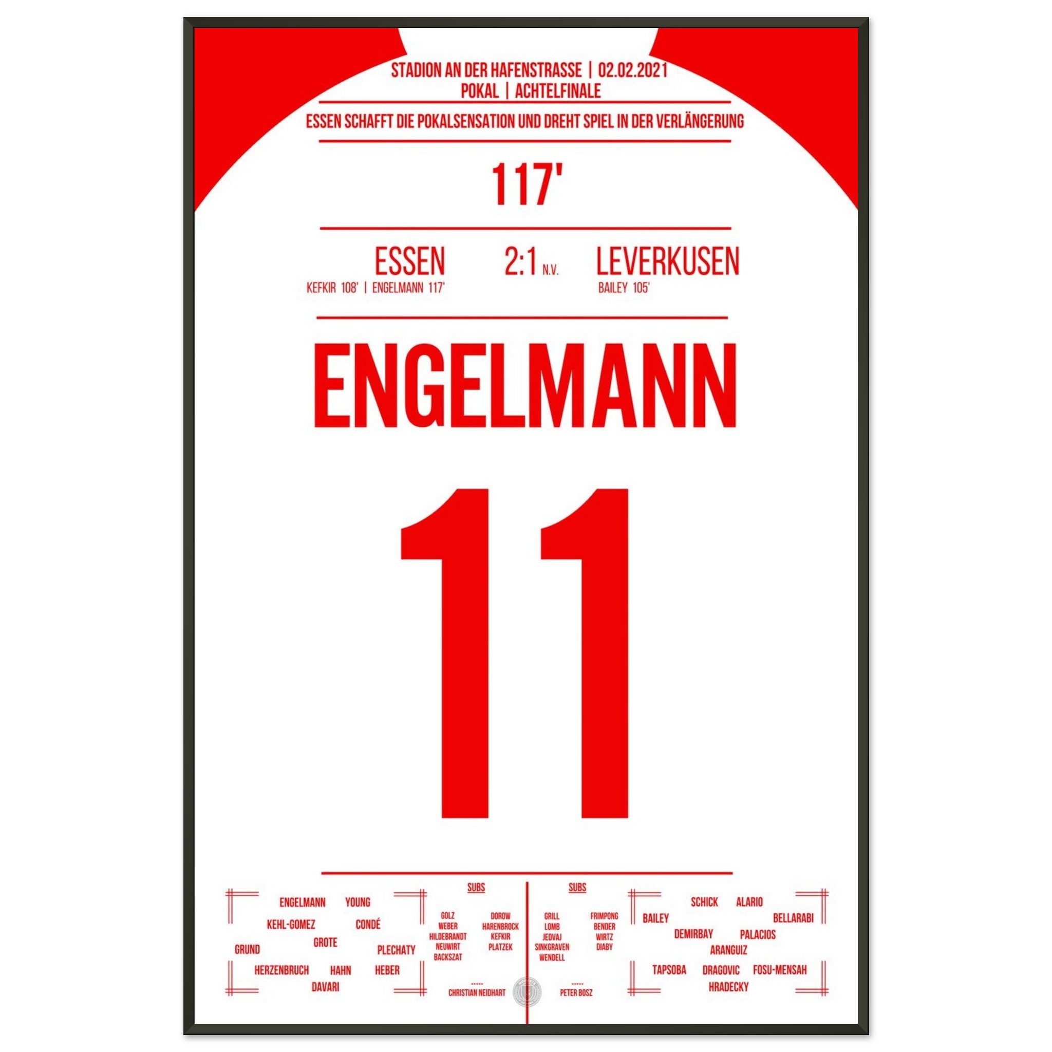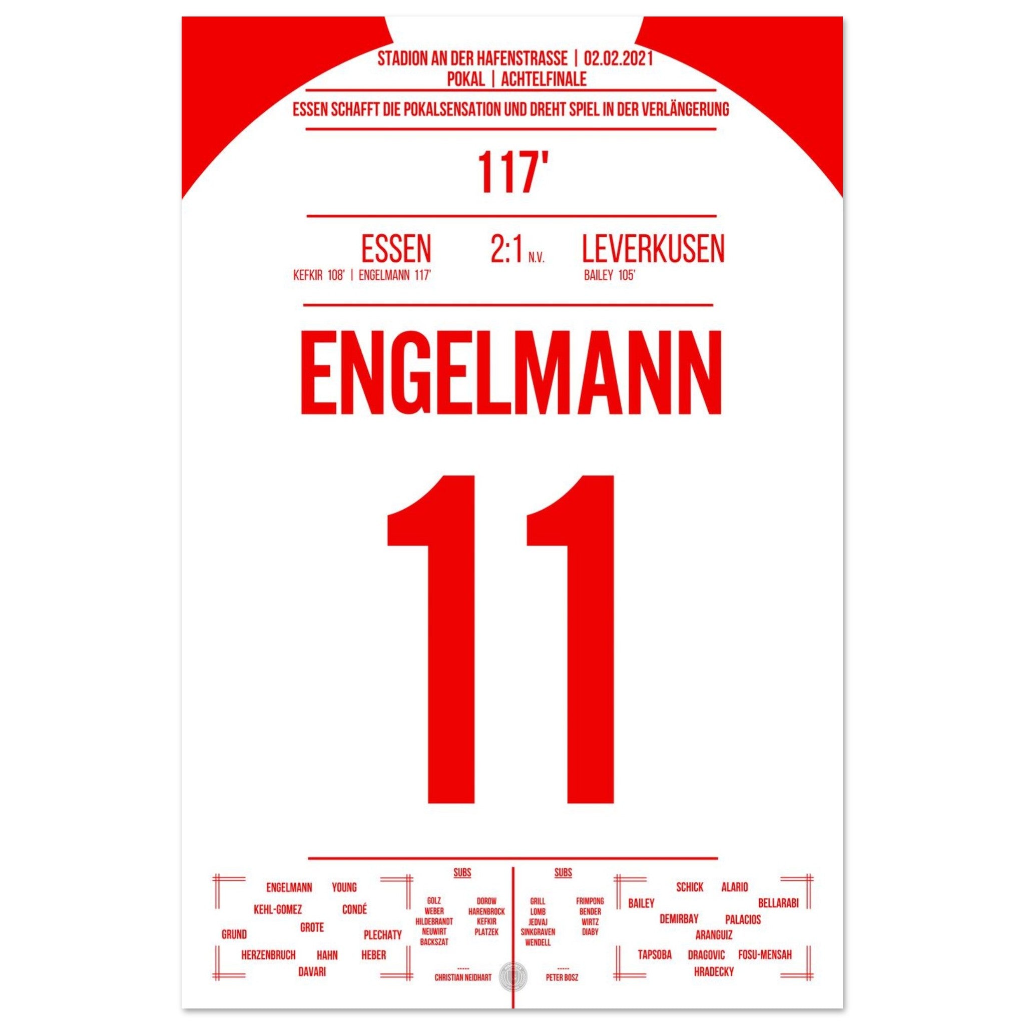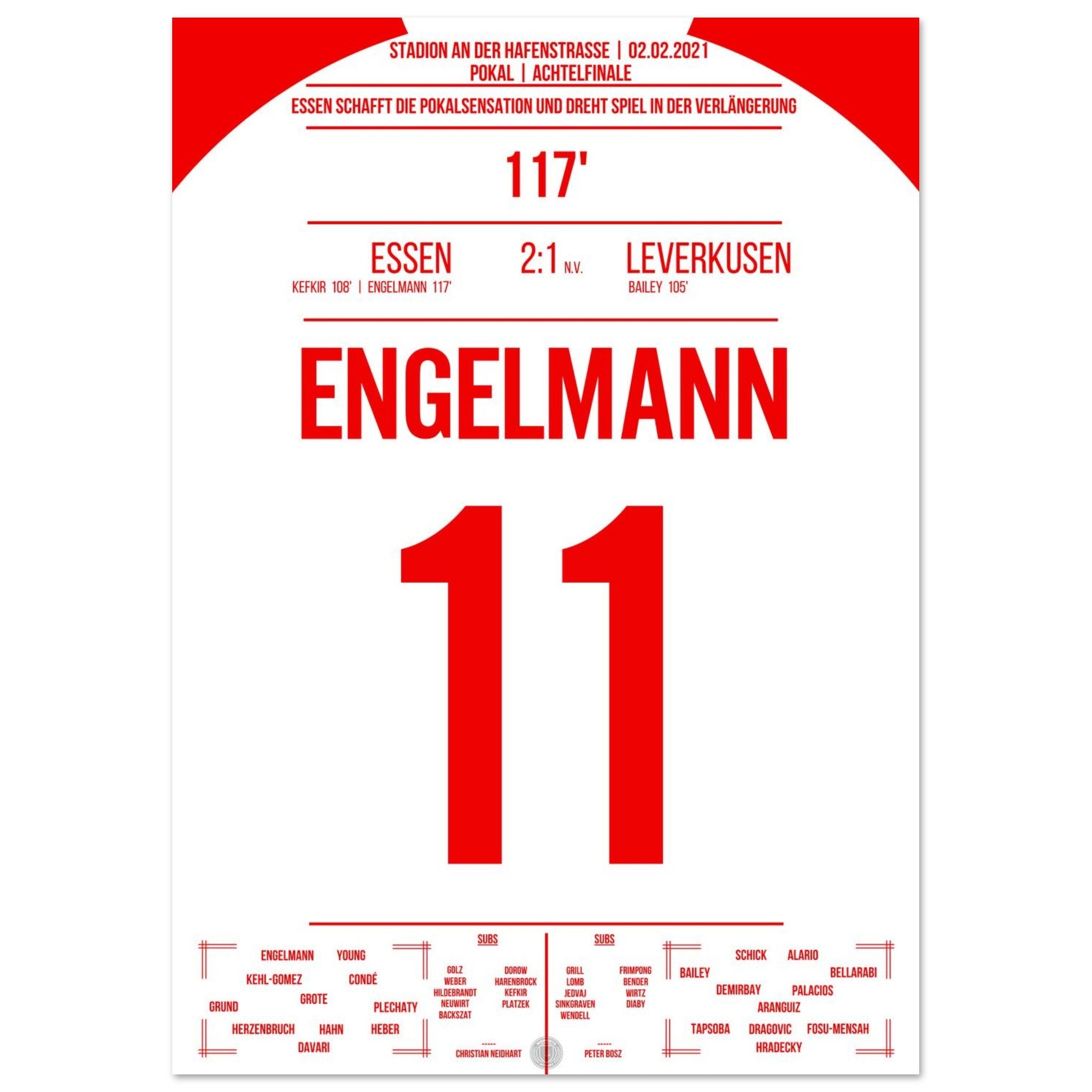 2. Februar 2021 – Essen vs. Leverkusen 2:1 n. V.: In der 117. Minute trifft Simon Engelmann im Pokal-Viertelfinale eiskalt zum 2:1 gegen den Bundesligisten und schießt Essen ins Halbfinale. Ein Pokalmärchenabend an der Hafenstraße, der ganz Fußball-Deutschland begeisterte. Unser Poster verewigt diesen magischen Moment in Rot-Weiß.