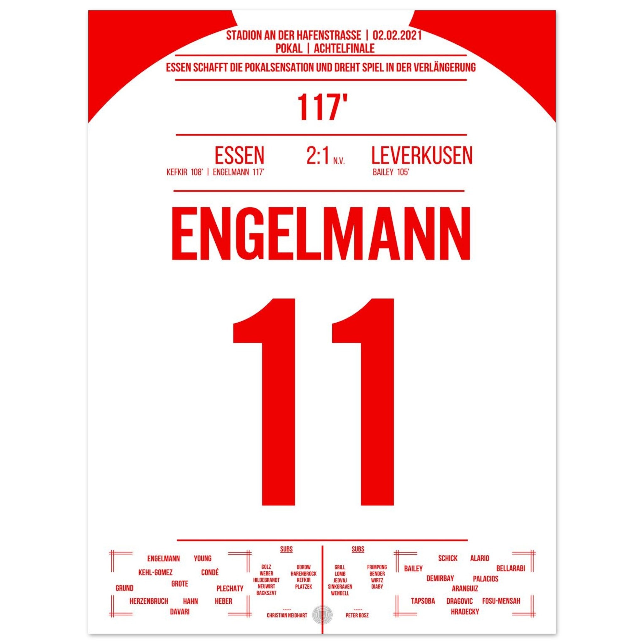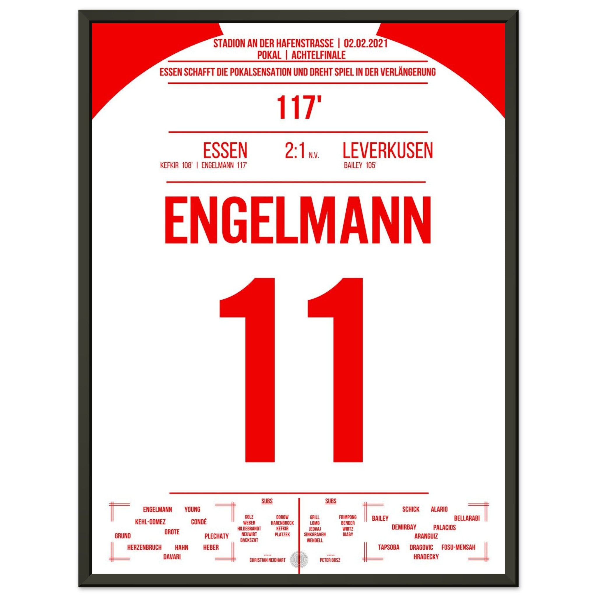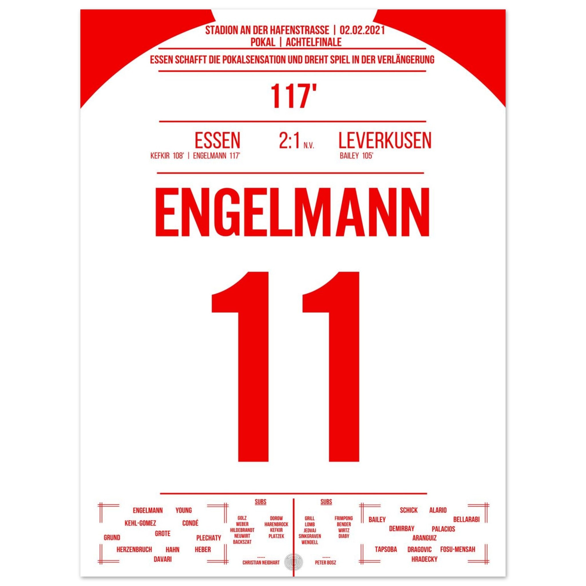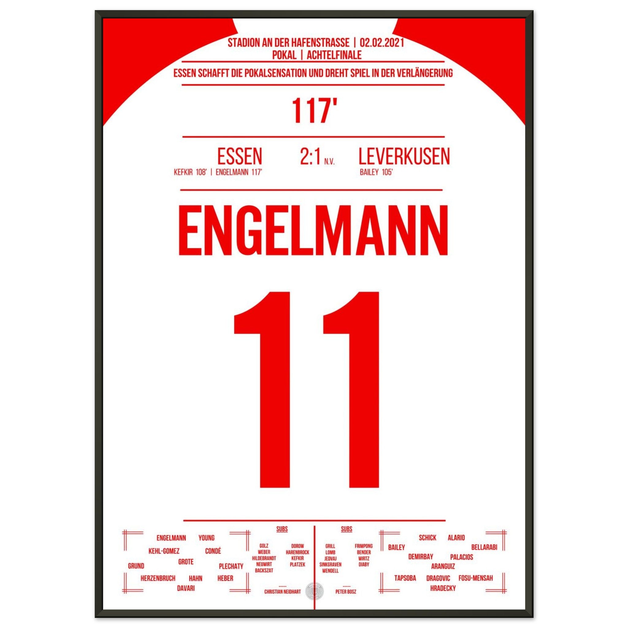 2. Februar 2021 – Essen vs. Leverkusen 2:1 n. V.: In der 117. Minute trifft Simon Engelmann im Pokal-Viertelfinale eiskalt zum 2:1 gegen den Bundesligisten und schießt Essen ins Halbfinale. Ein Pokalmärchenabend an der Hafenstraße, der ganz Fußball-Deutschland begeisterte. Unser Poster verewigt diesen magischen Moment in Rot-Weiß.