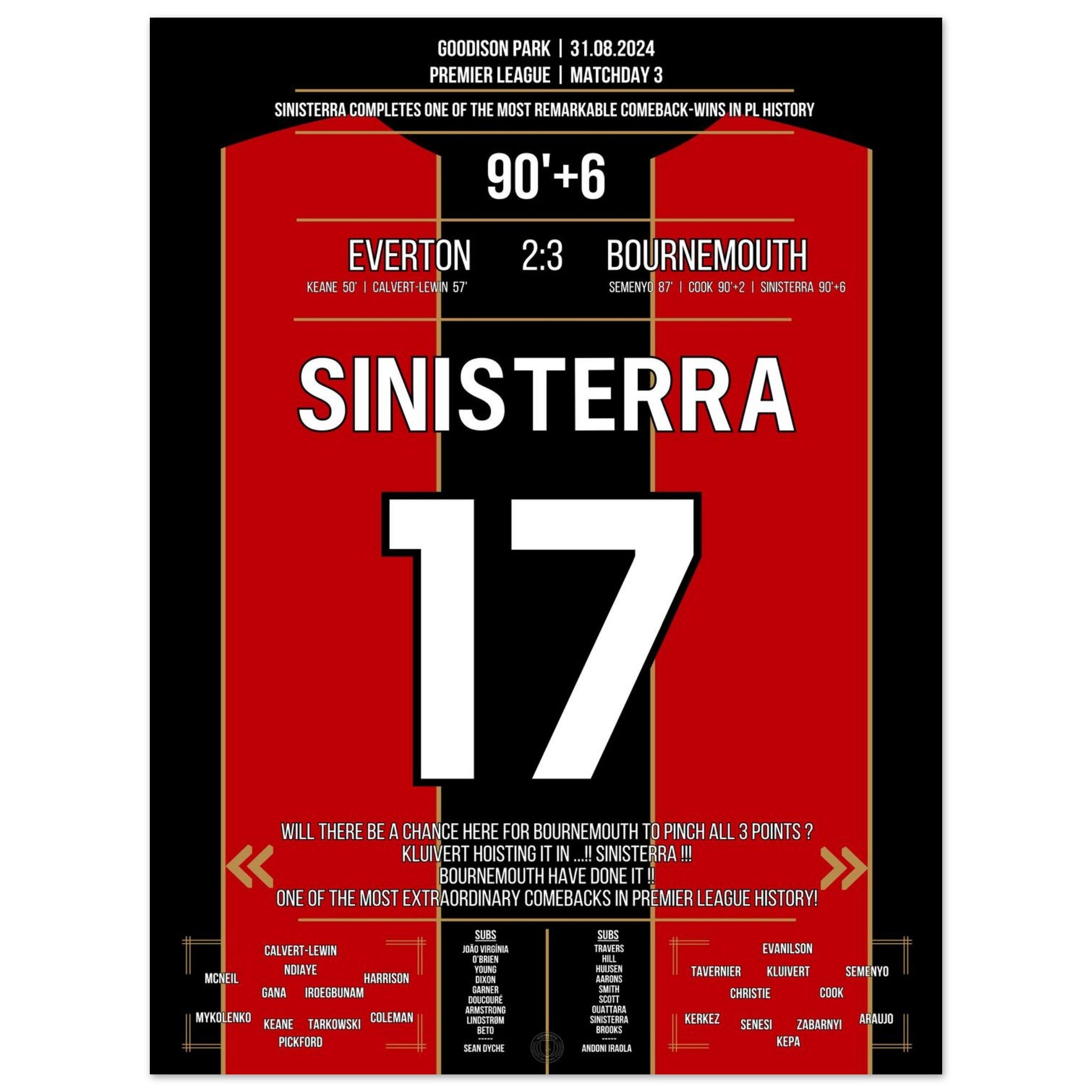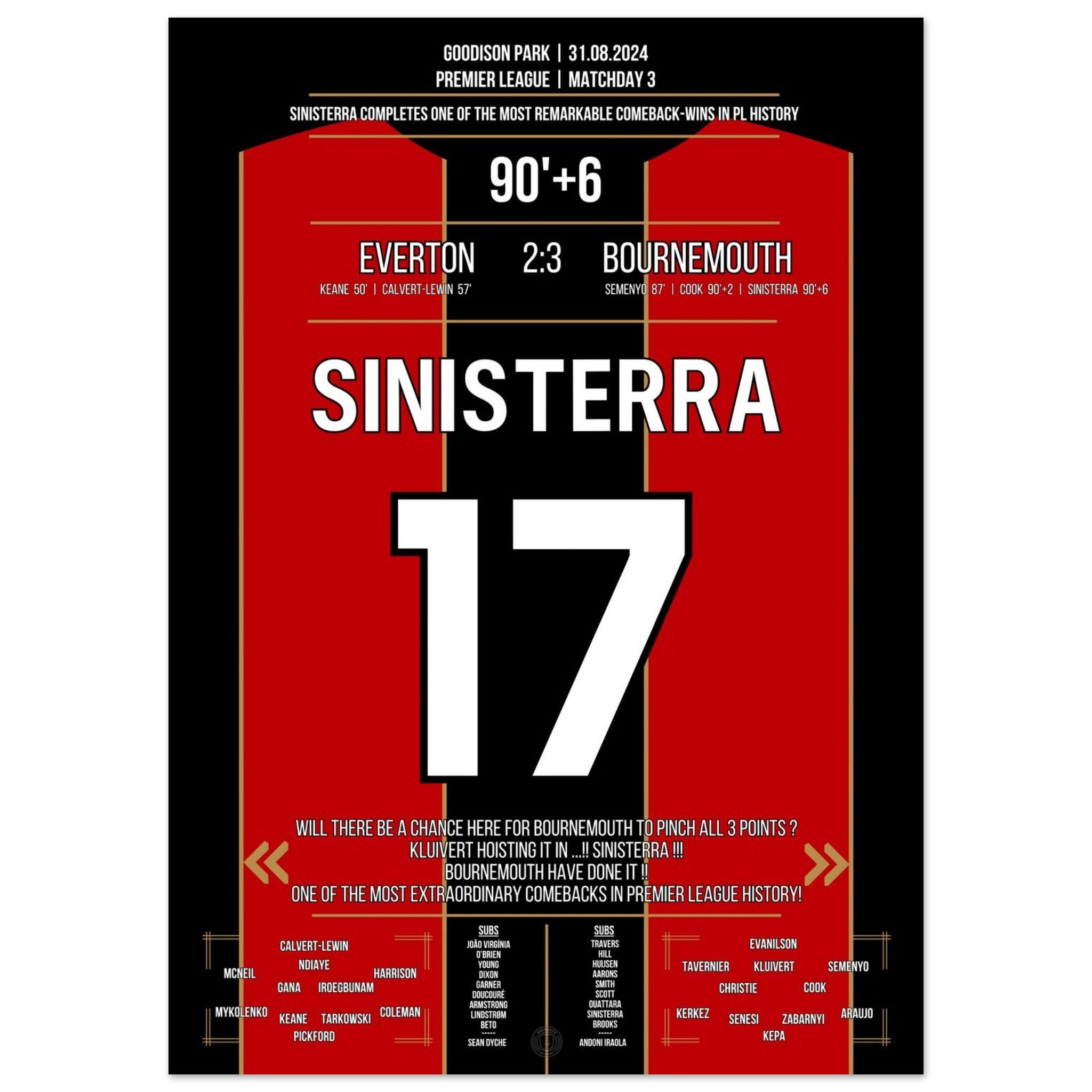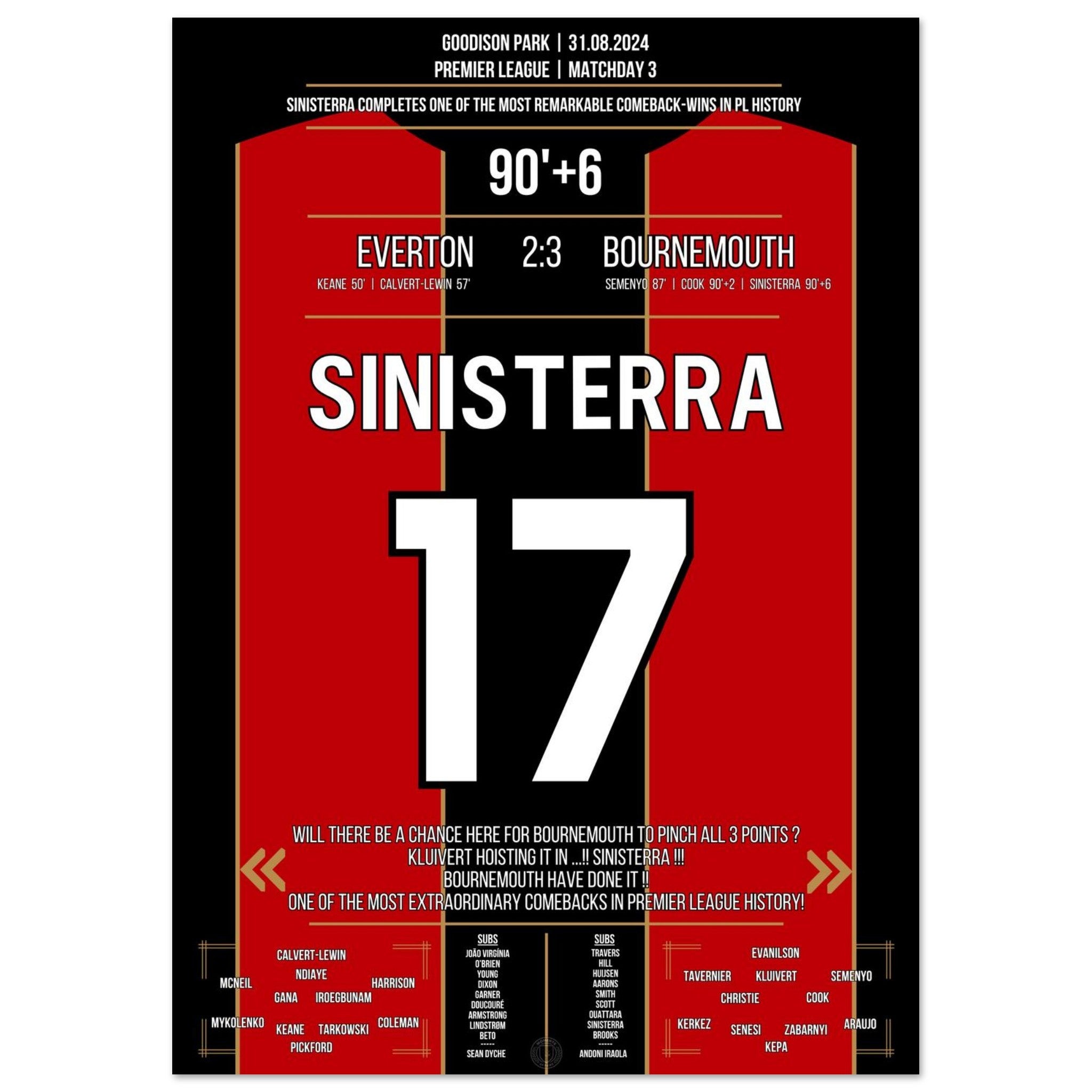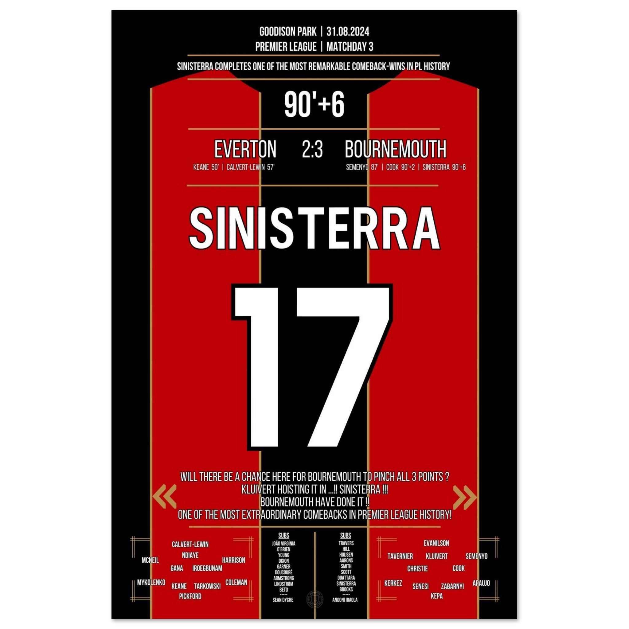 Was für ein Drama im Goodison Park! Bournemouth dreht ein packendes Spiel gegen Everton und entführt dank eines späten Treffers alle drei Punkte. Eines der größten Comebacks der Premier League Geschichte. Endstand: 3:2 – ein Auswärtssieg mit Statement-Charakter.