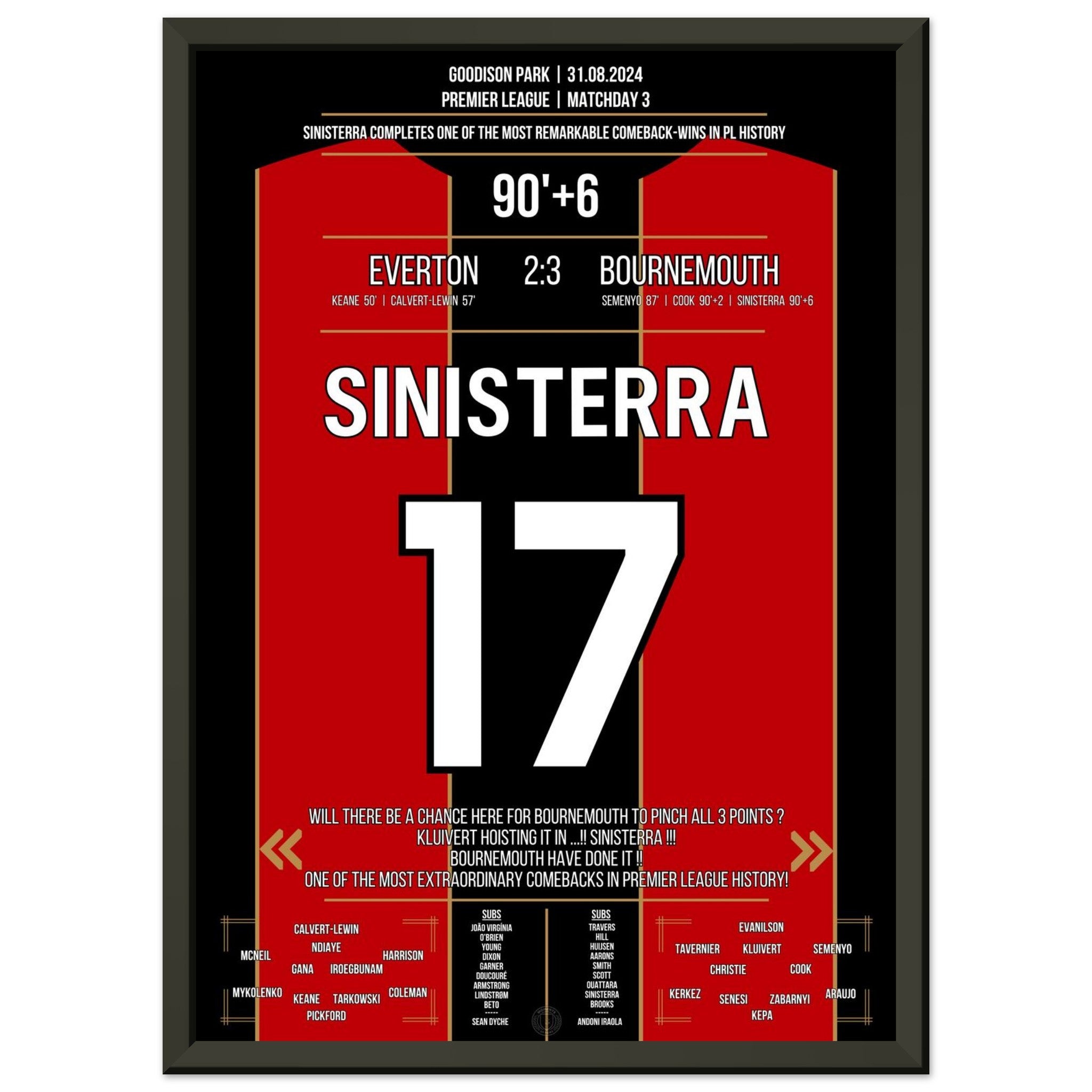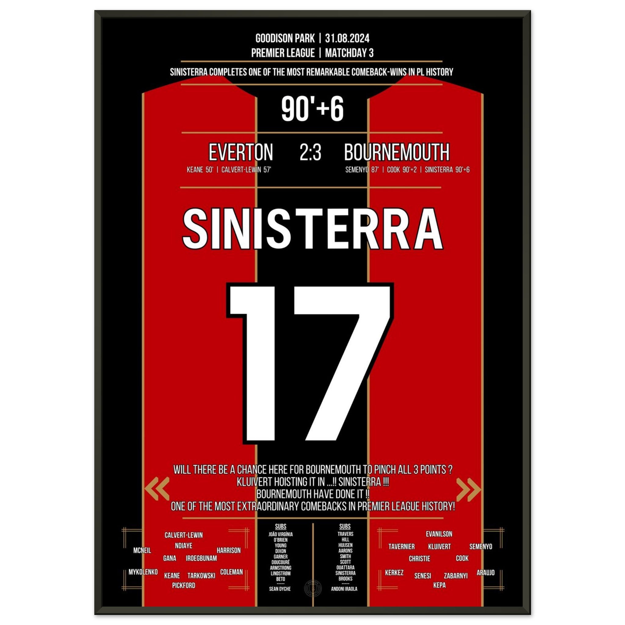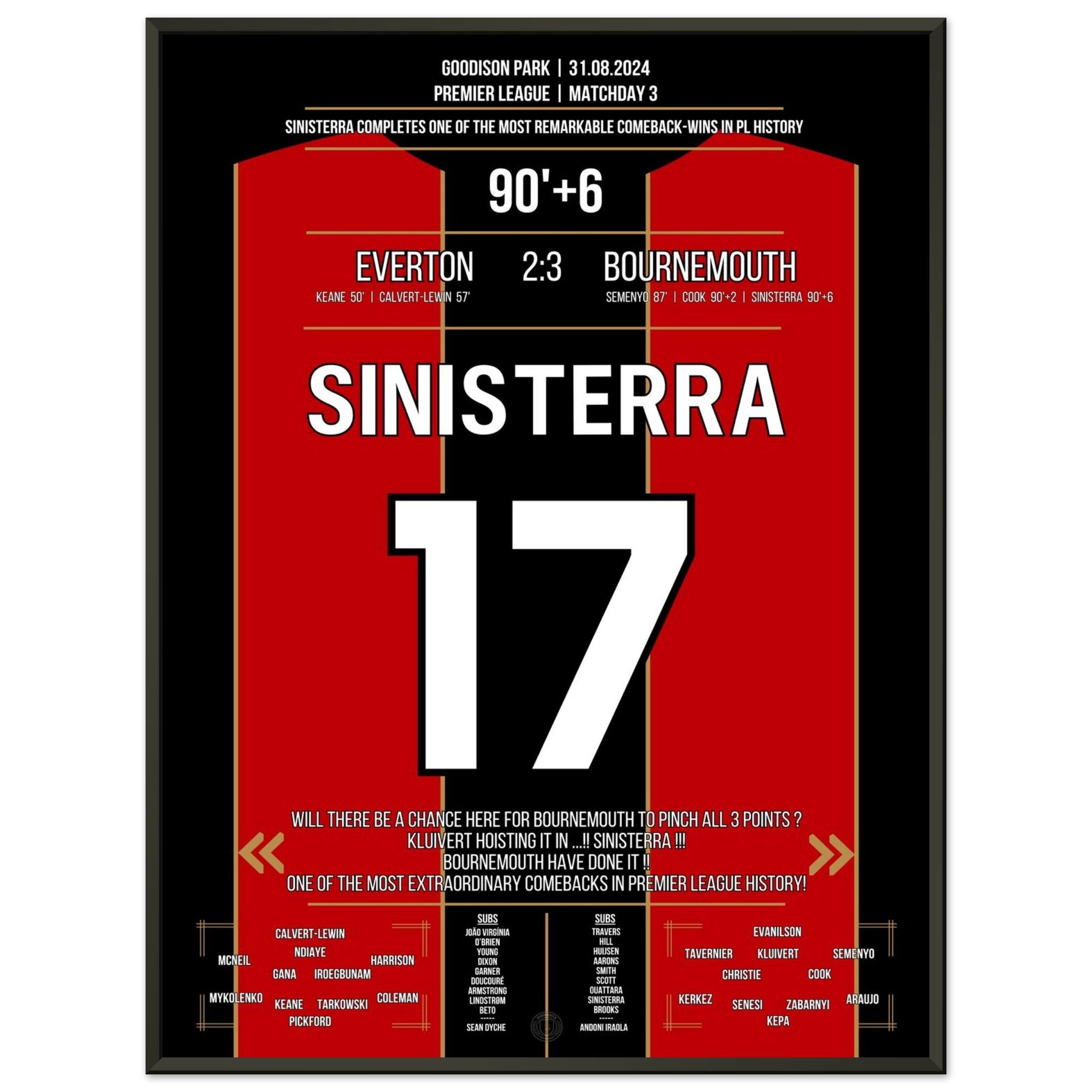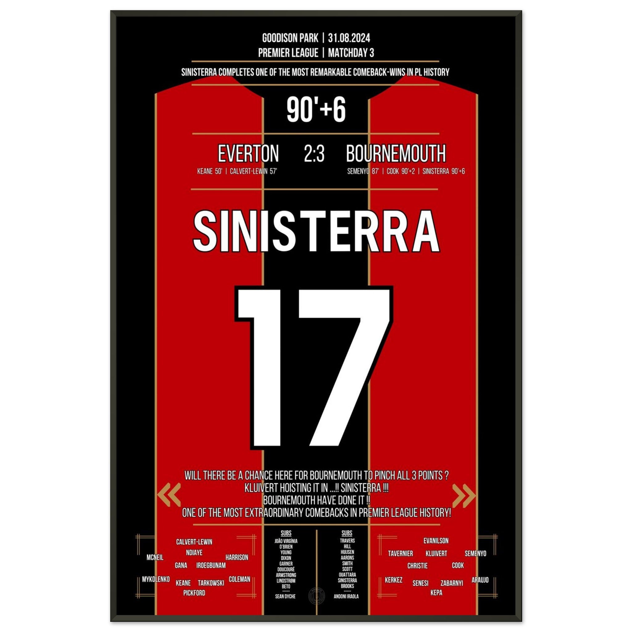 Was für ein Drama im Goodison Park! Bournemouth dreht ein packendes Spiel gegen Everton und entführt dank eines späten Treffers alle drei Punkte. Eines der größten Comebacks der Premier League Geschichte. Endstand: 3:2 – ein Auswärtssieg mit Statement-Charakter.