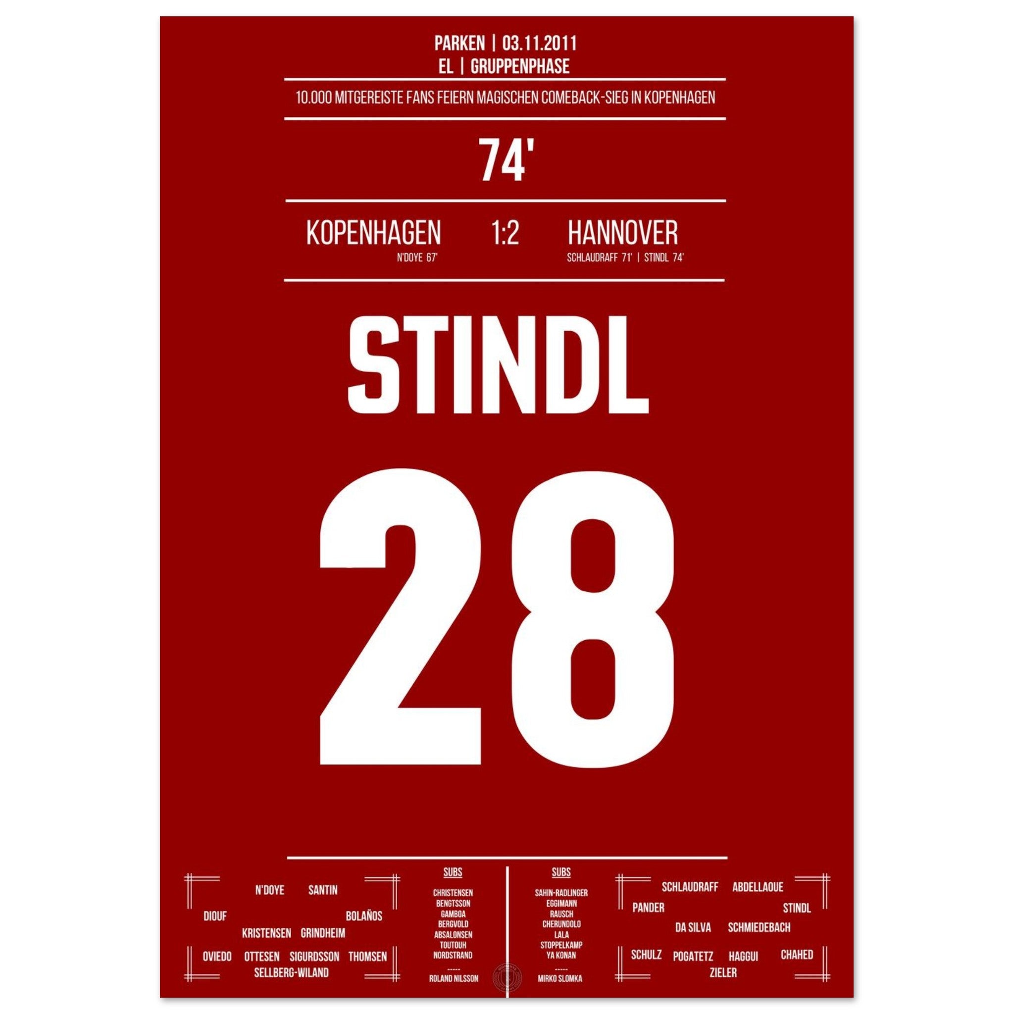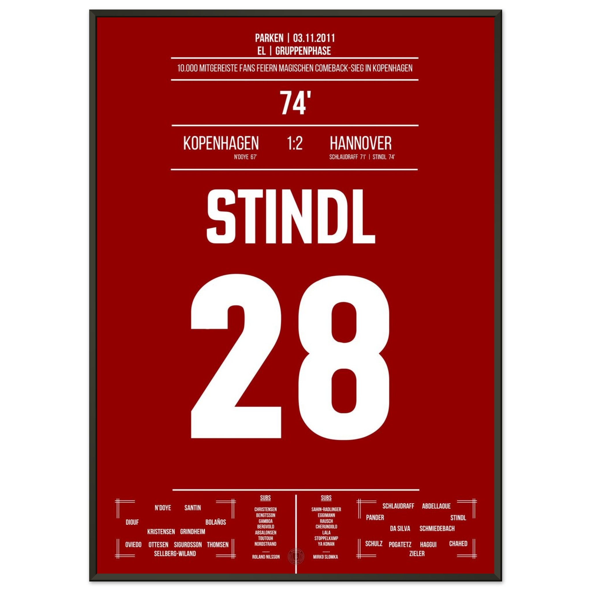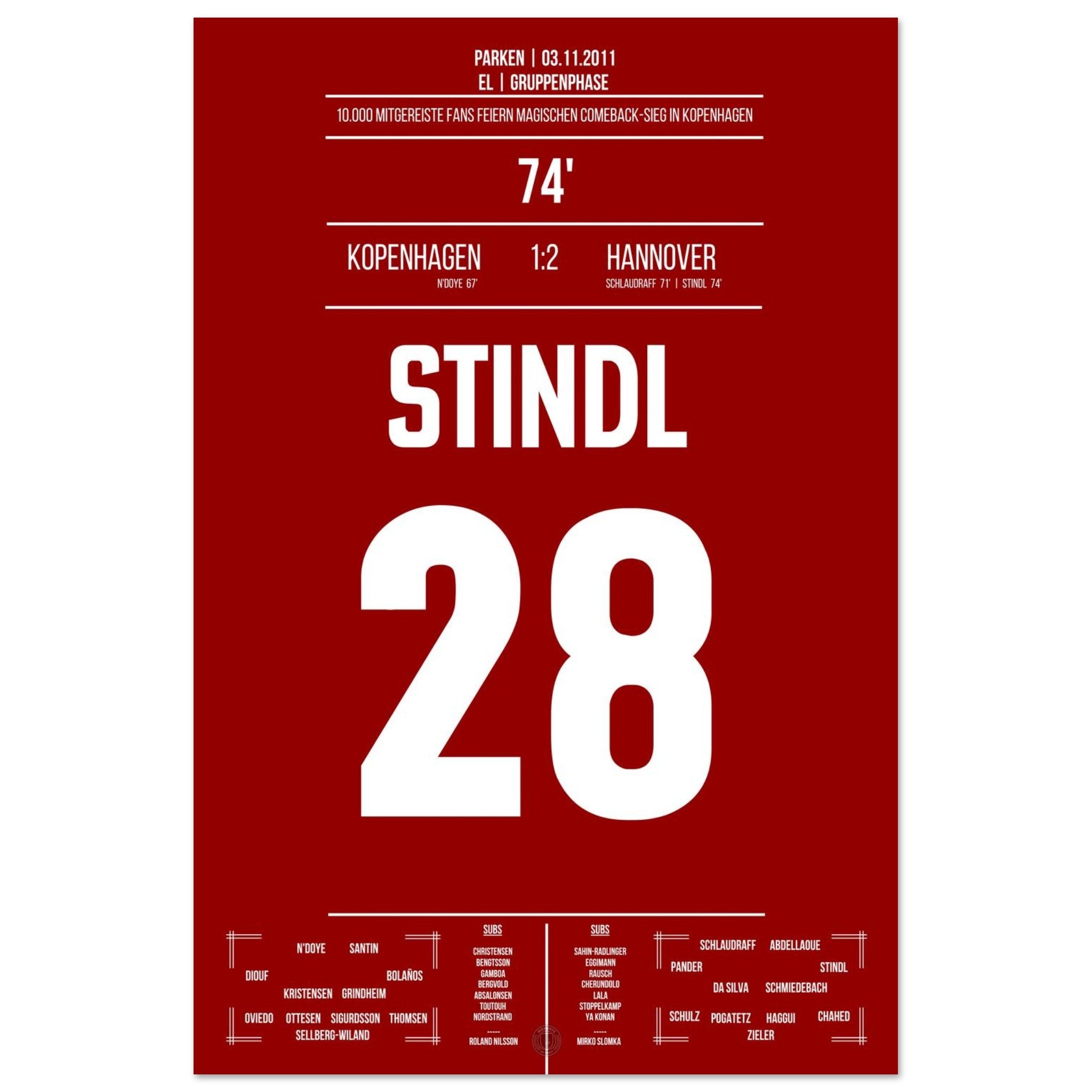 03. November 2011 – Kopenhagen vs. Hannover 1:2: In der 74. Minute schießt Lars Stindl Hannover ein großes Stück in Richtung K.-o.-Runde. Unser Poster hält diesen internationalen Gänsehautmoment für immer fest.