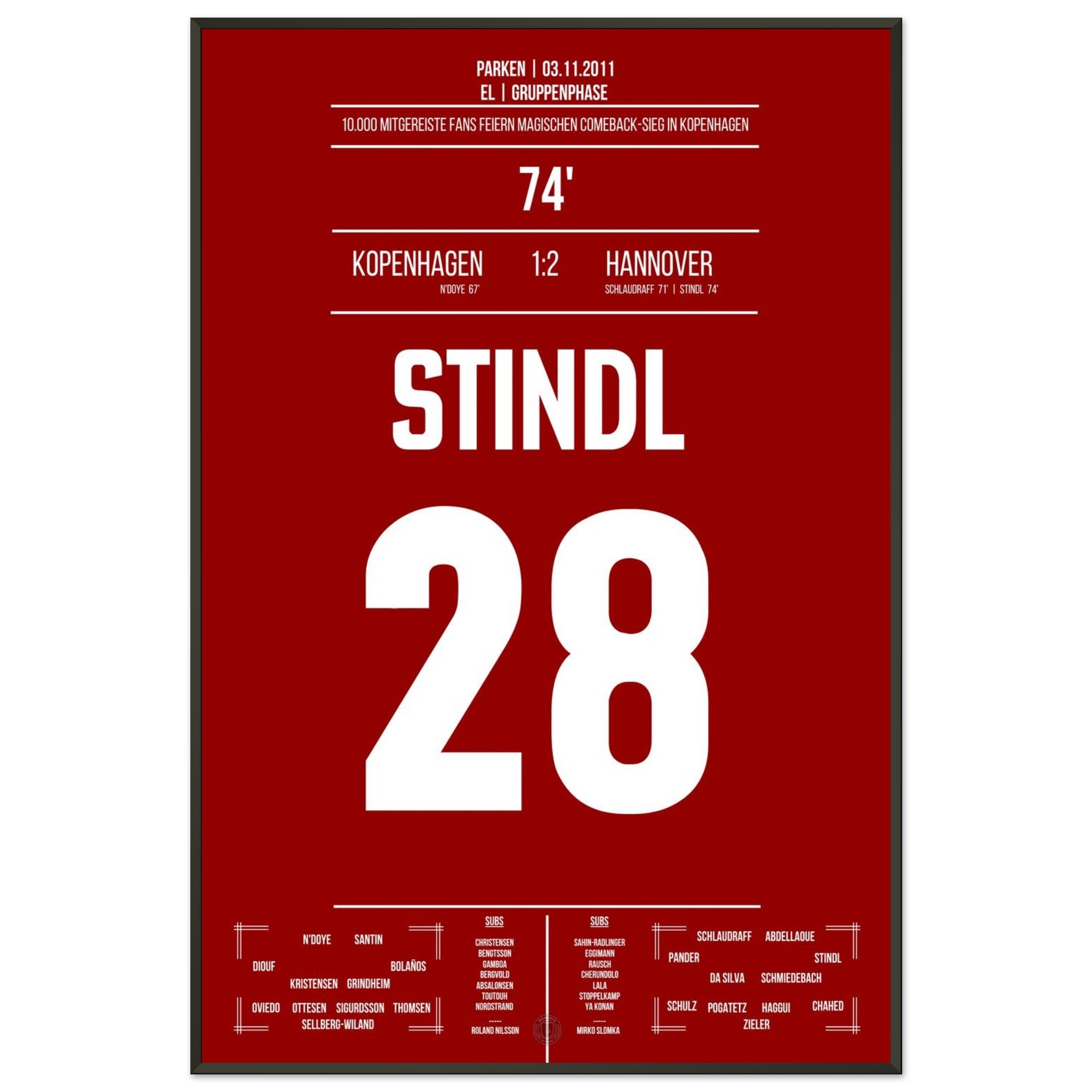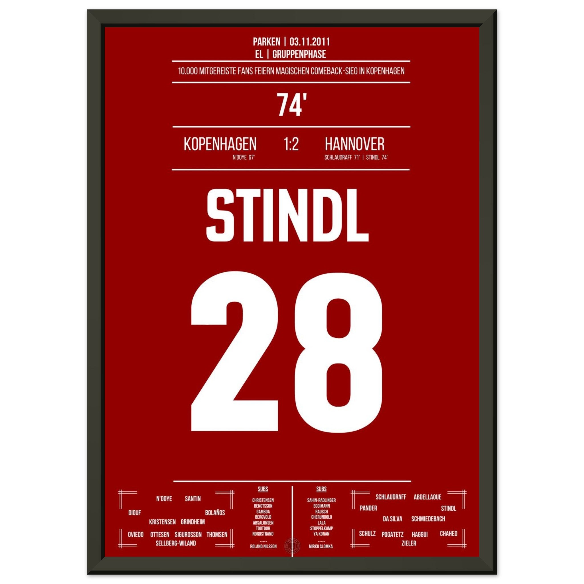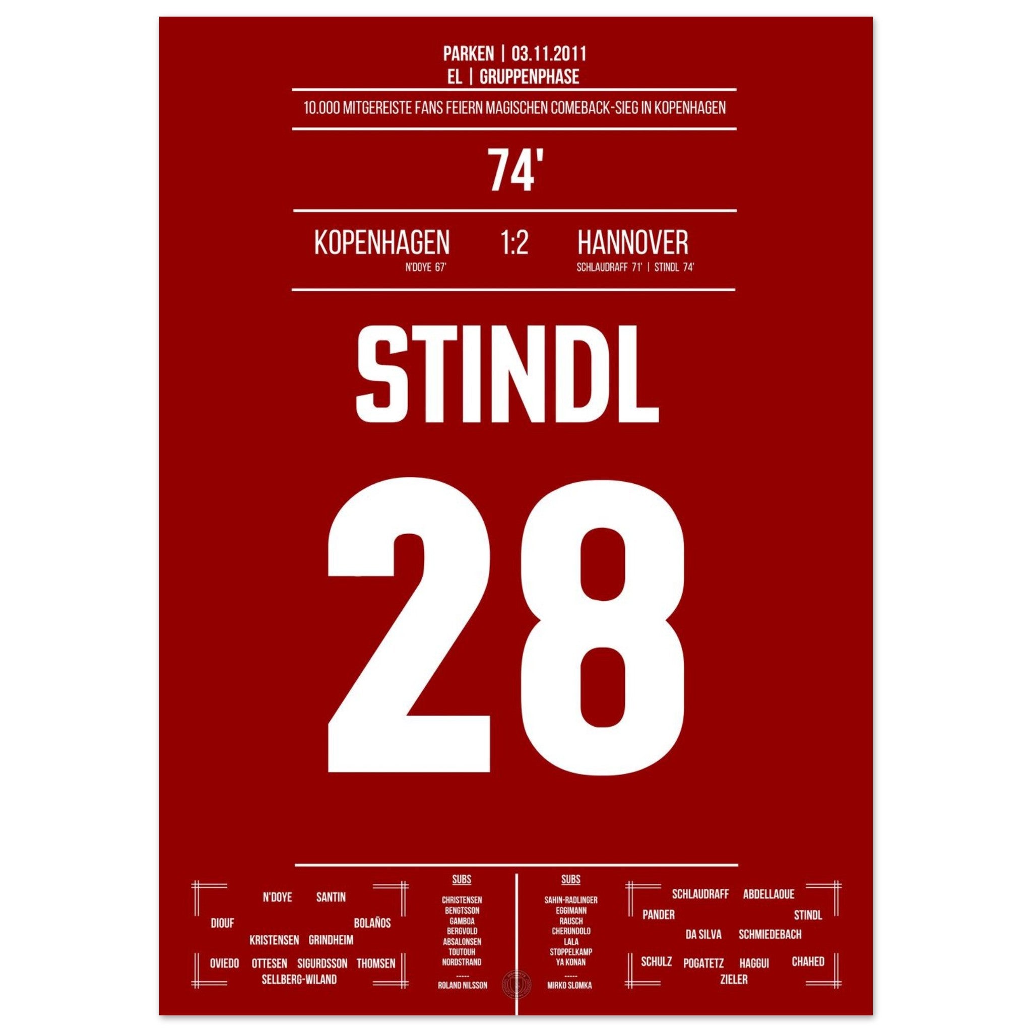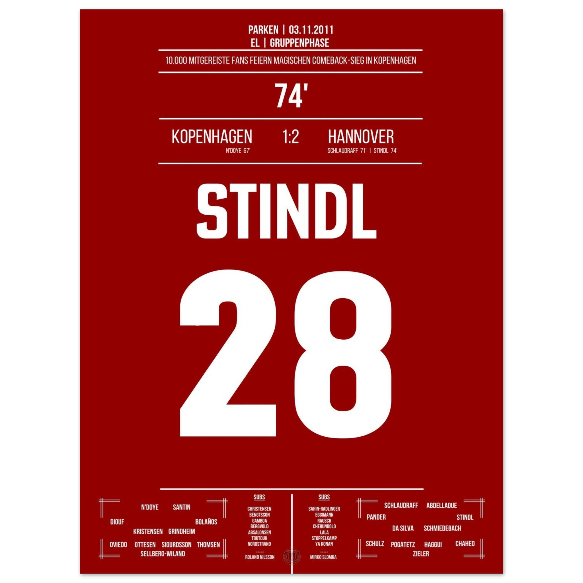 03. November 2011 – Kopenhagen vs. Hannover 1:2: In der 74. Minute schießt Lars Stindl Hannover ein großes Stück in Richtung K.-o.-Runde. Unser Poster hält diesen internationalen Gänsehautmoment für immer fest.