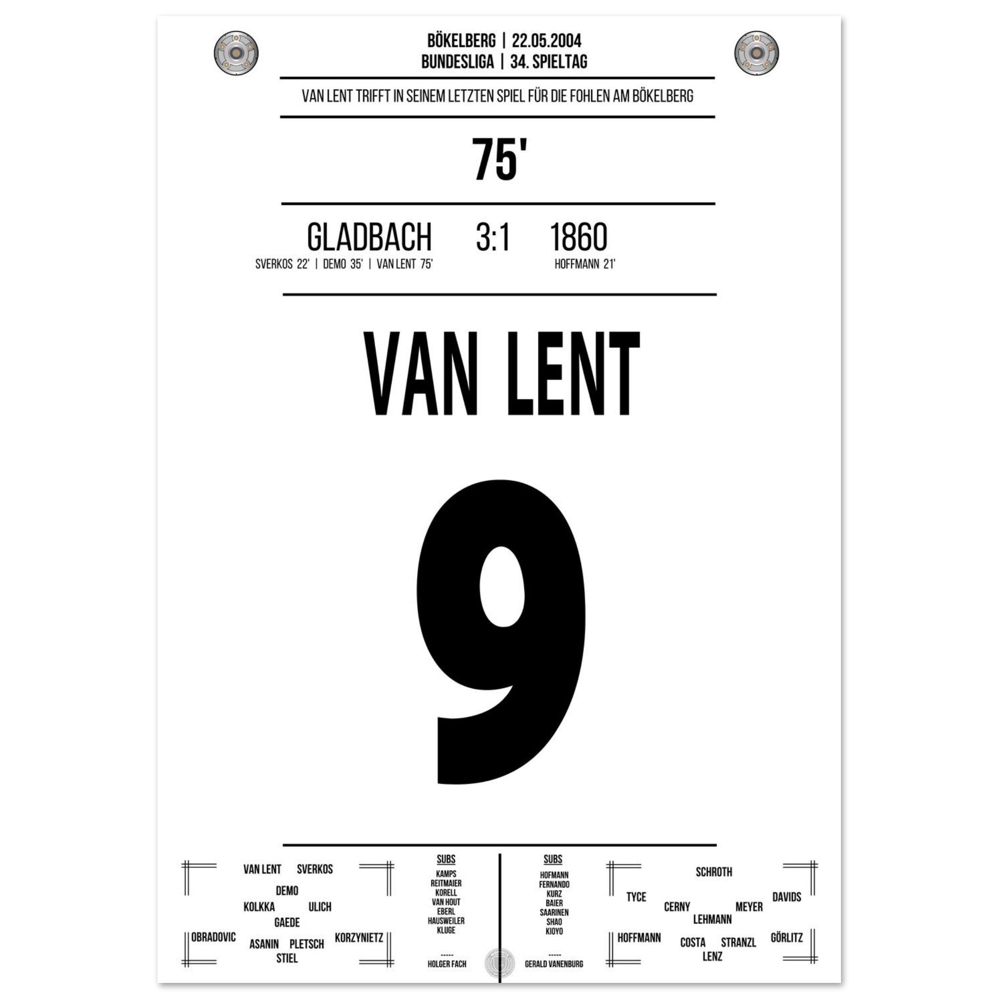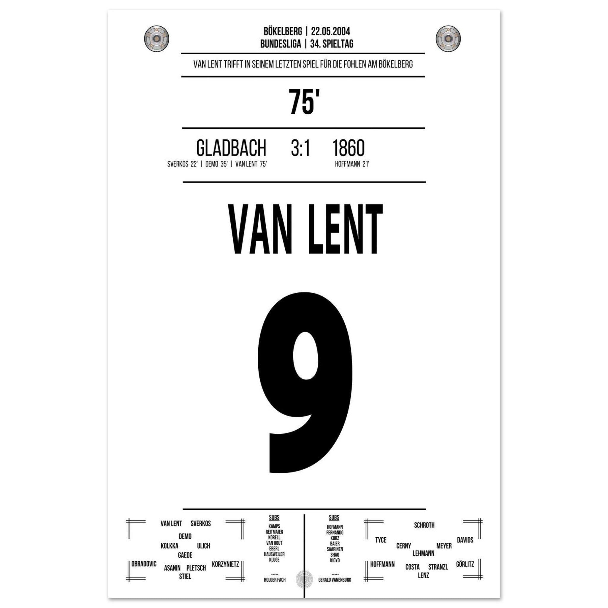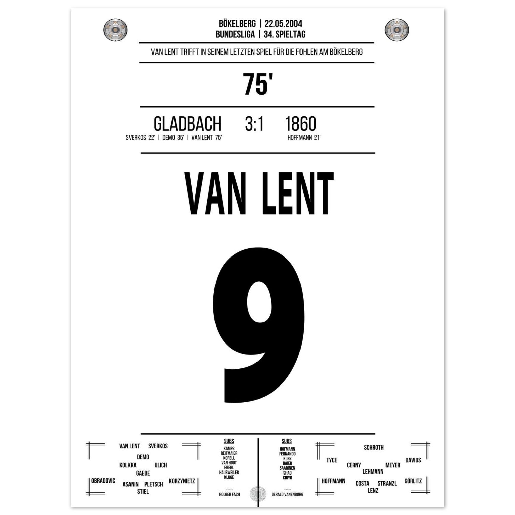 Am letzten Spieltag der Saison trifft Arie van Lent beim 3:1-Sieg von Gladbach doppelt – darunter der entscheidende Treffer zum 2:1. Mit seinem Tor stößt er 1860 in die Zweitklassigkeit. Ein bitterer Tag für die Löwen – und ein denkwürdiger für die Borussia.