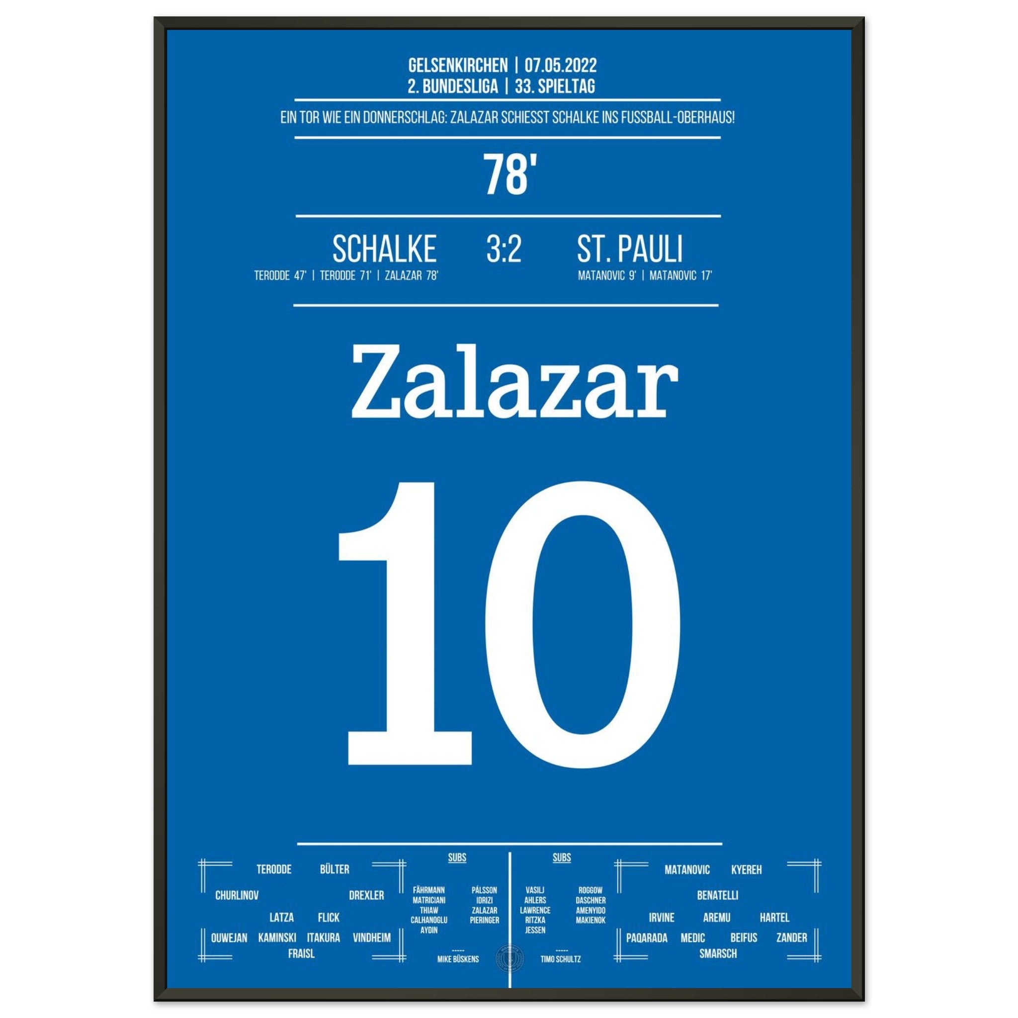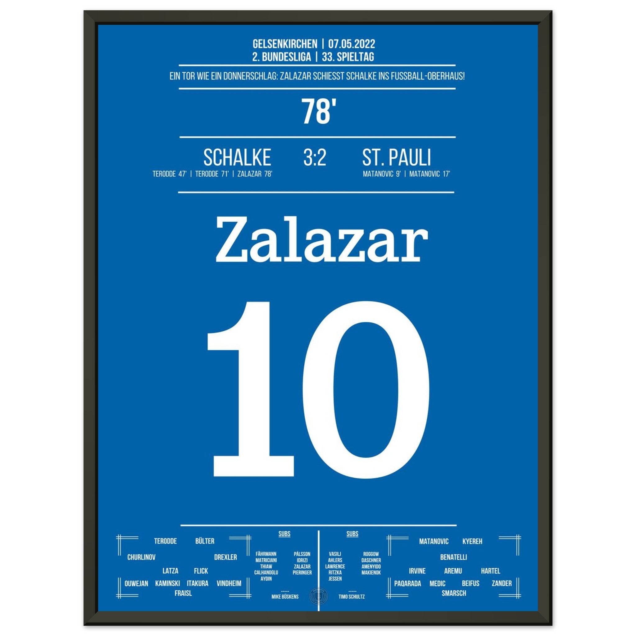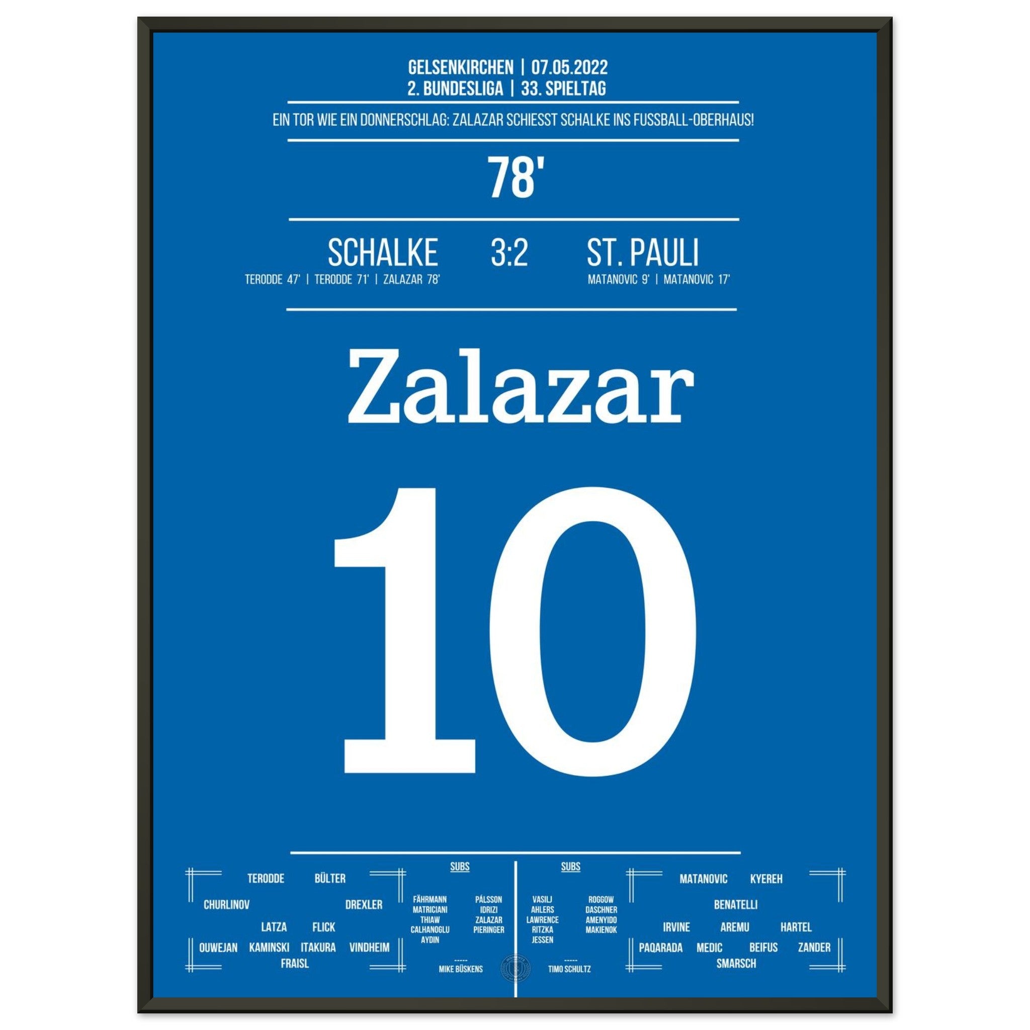 7. Mai 2022 – Schalke vs. St. Pauli 3:2: Rodrigo Zalazar krönt Schalkes Aufstieg mit einem Traumtor zum 3:2 – das Stadion explodiert, der direkte Wiederaufstieg ist perfekt. Emotionen pur auf dem Rasen und den Rängen. Unser Poster hält diesen magischen Moment in Königsblau für die Ewigkeit fest.