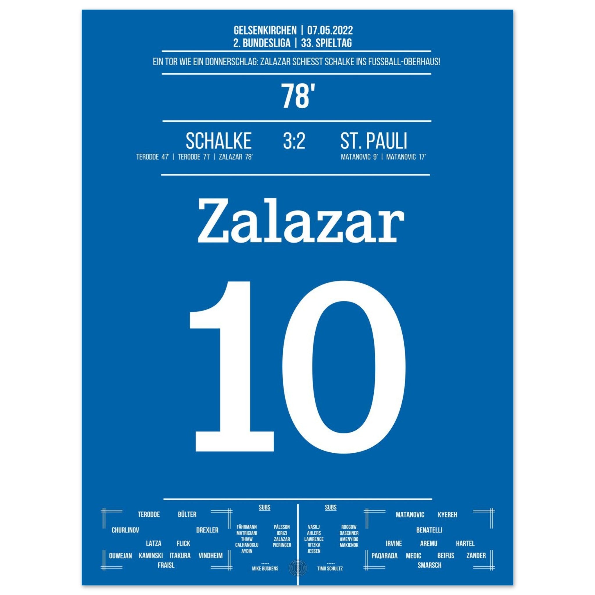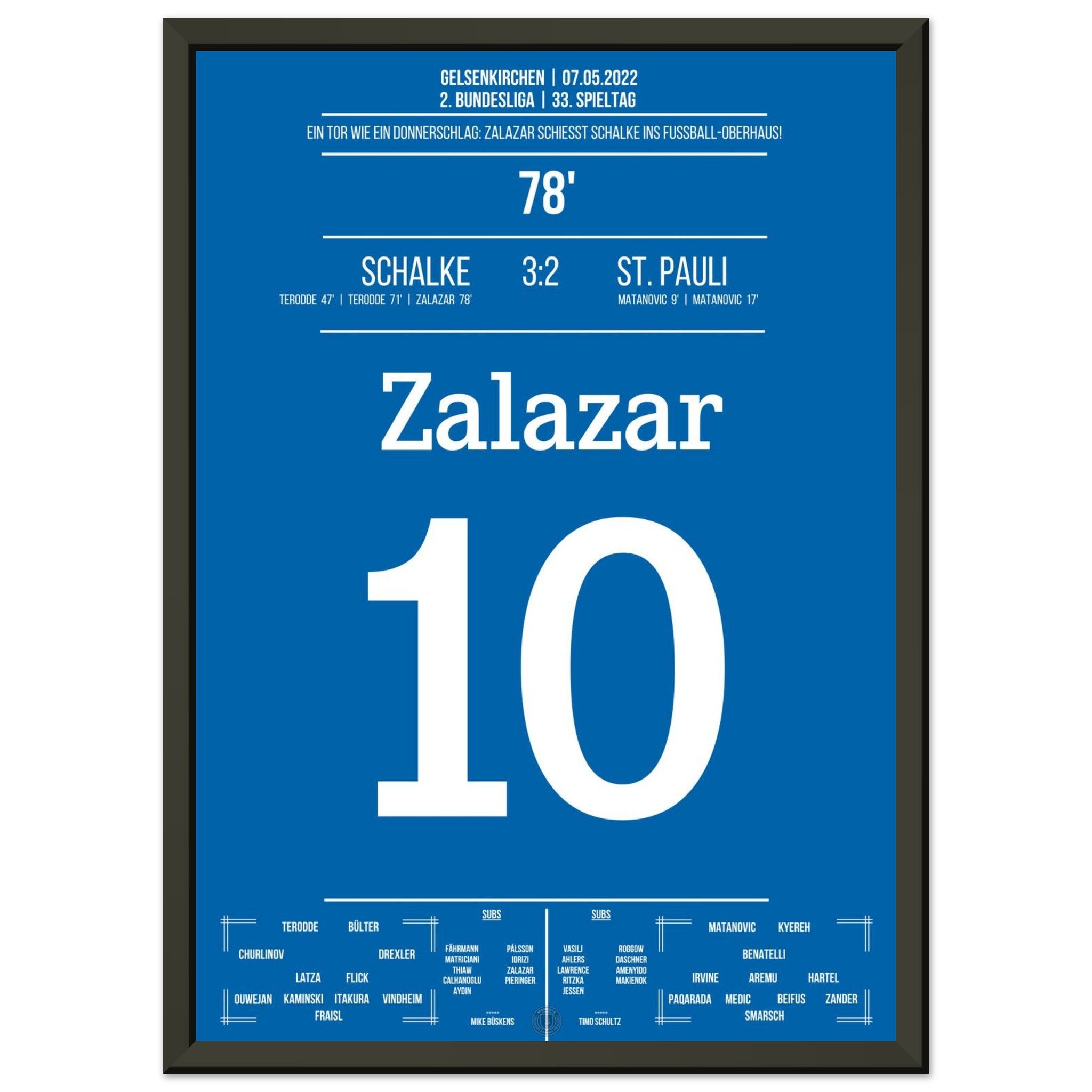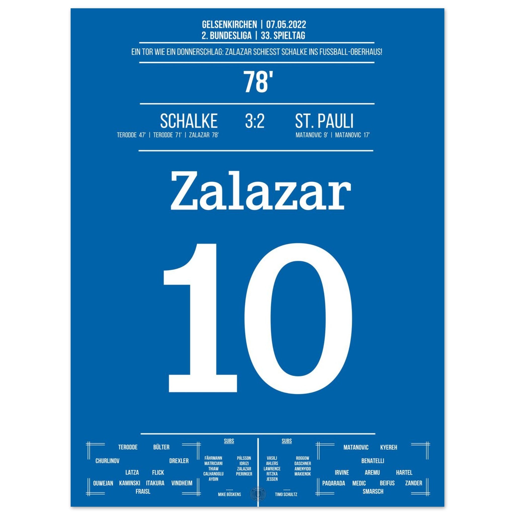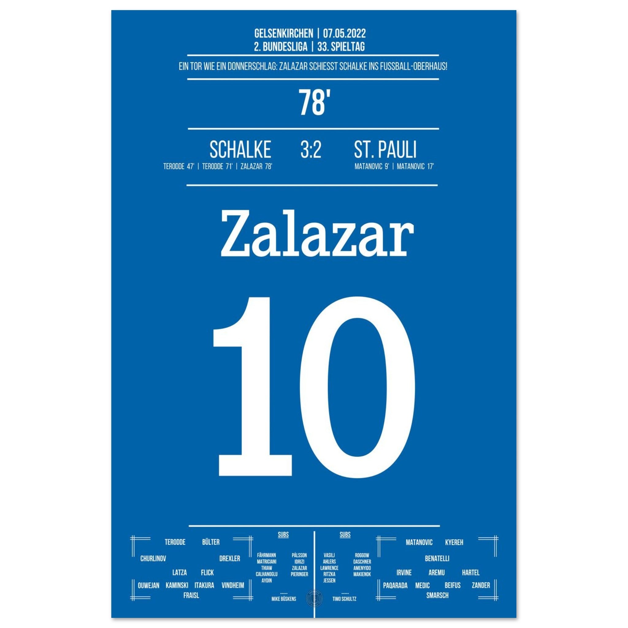 7. Mai 2022 – Schalke vs. St. Pauli 3:2: Rodrigo Zalazar krönt Schalkes Aufstieg mit einem Traumtor zum 3:2 – das Stadion explodiert, der direkte Wiederaufstieg ist perfekt. Emotionen pur auf dem Rasen und den Rängen. Unser Poster hält diesen magischen Moment in Königsblau für die Ewigkeit fest.