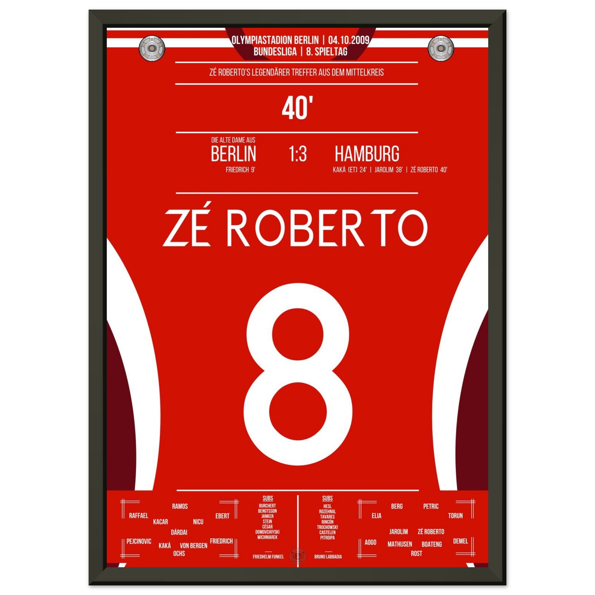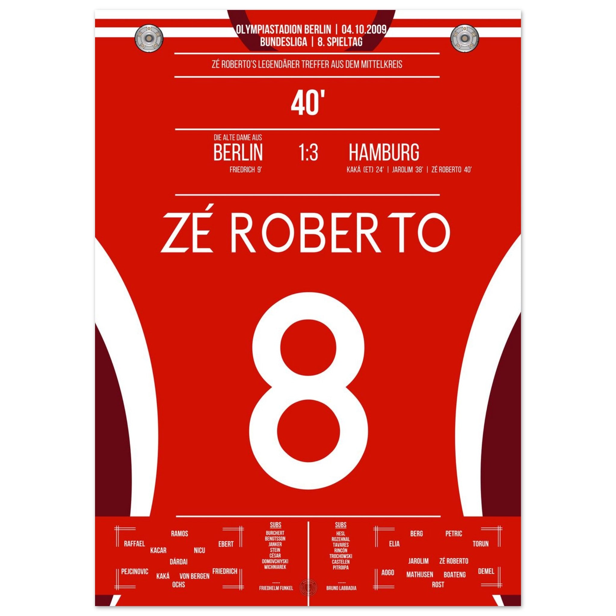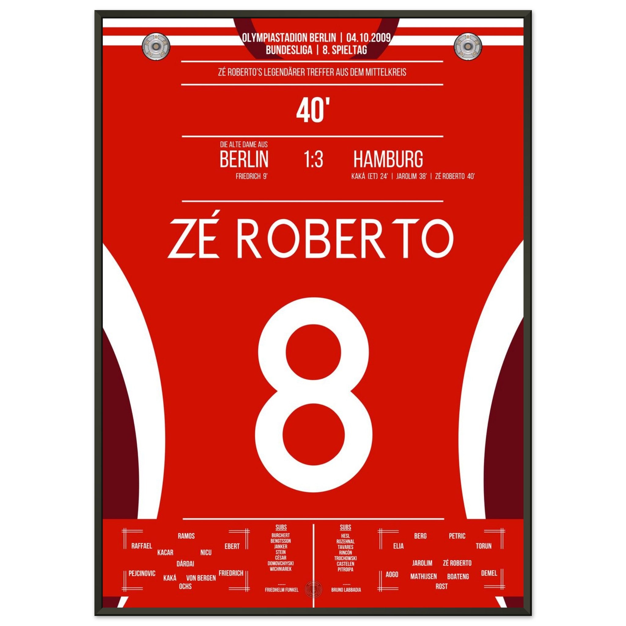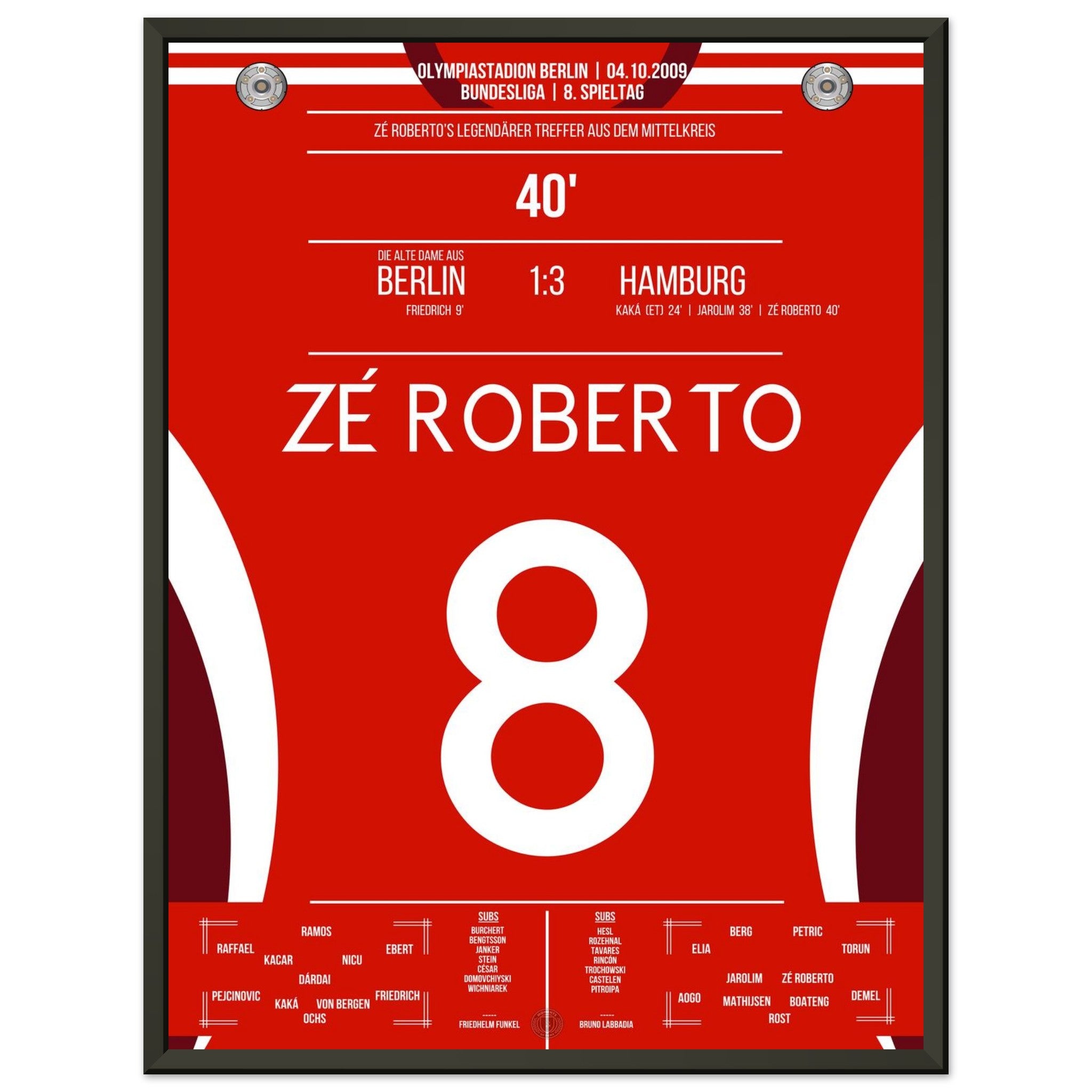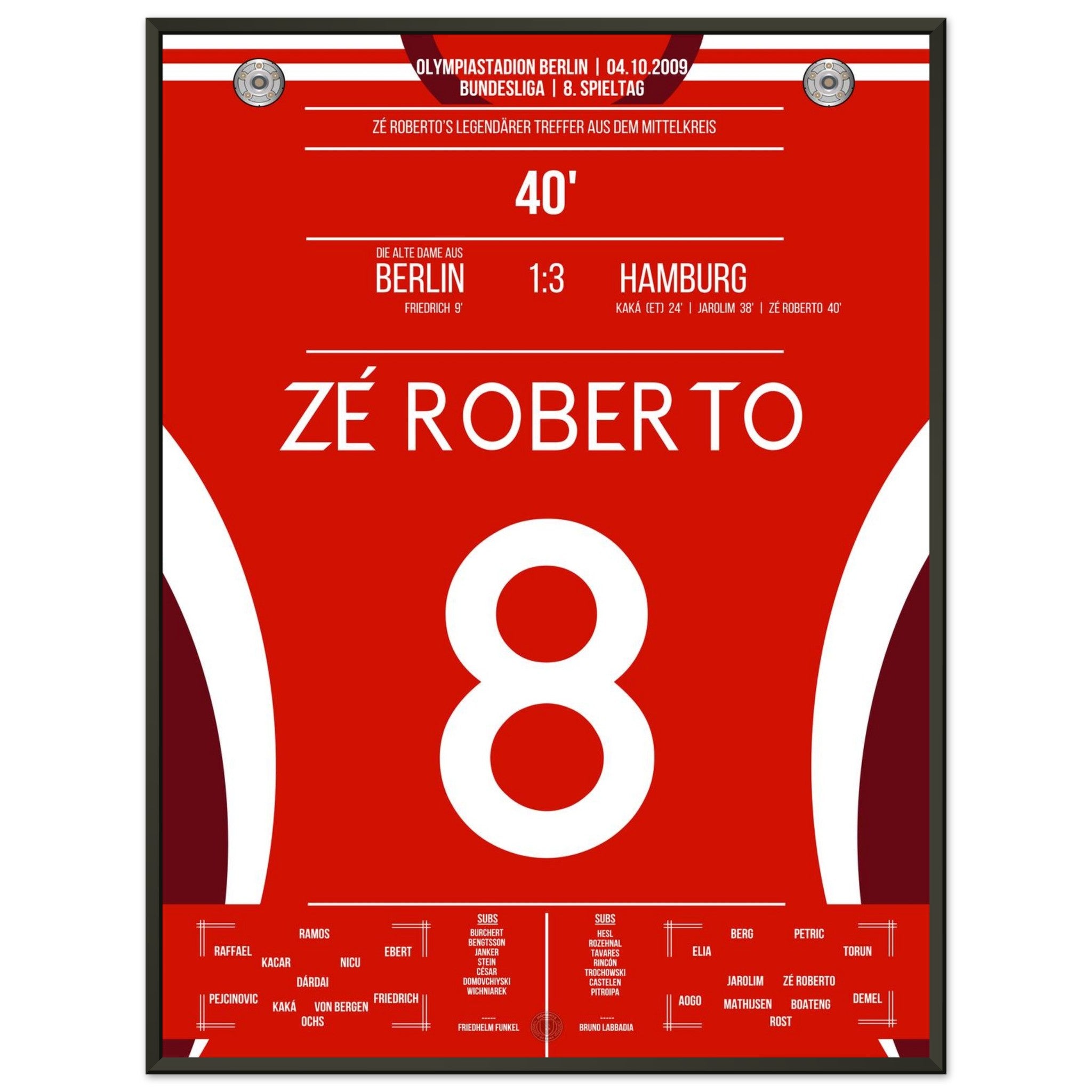 4. Oktober 2009 – Berlin vs. Hamburg 1:3: Zé Roberto krönt eine bärenstarke hamburger Leistung im Olympiastadion mit einem Traumtor aus der Distanz. Der Brasilianer verleiht dem Auswärtssieg Stil – unser Poster bringt diesen Moment zurück in dein Wohnzimmer.